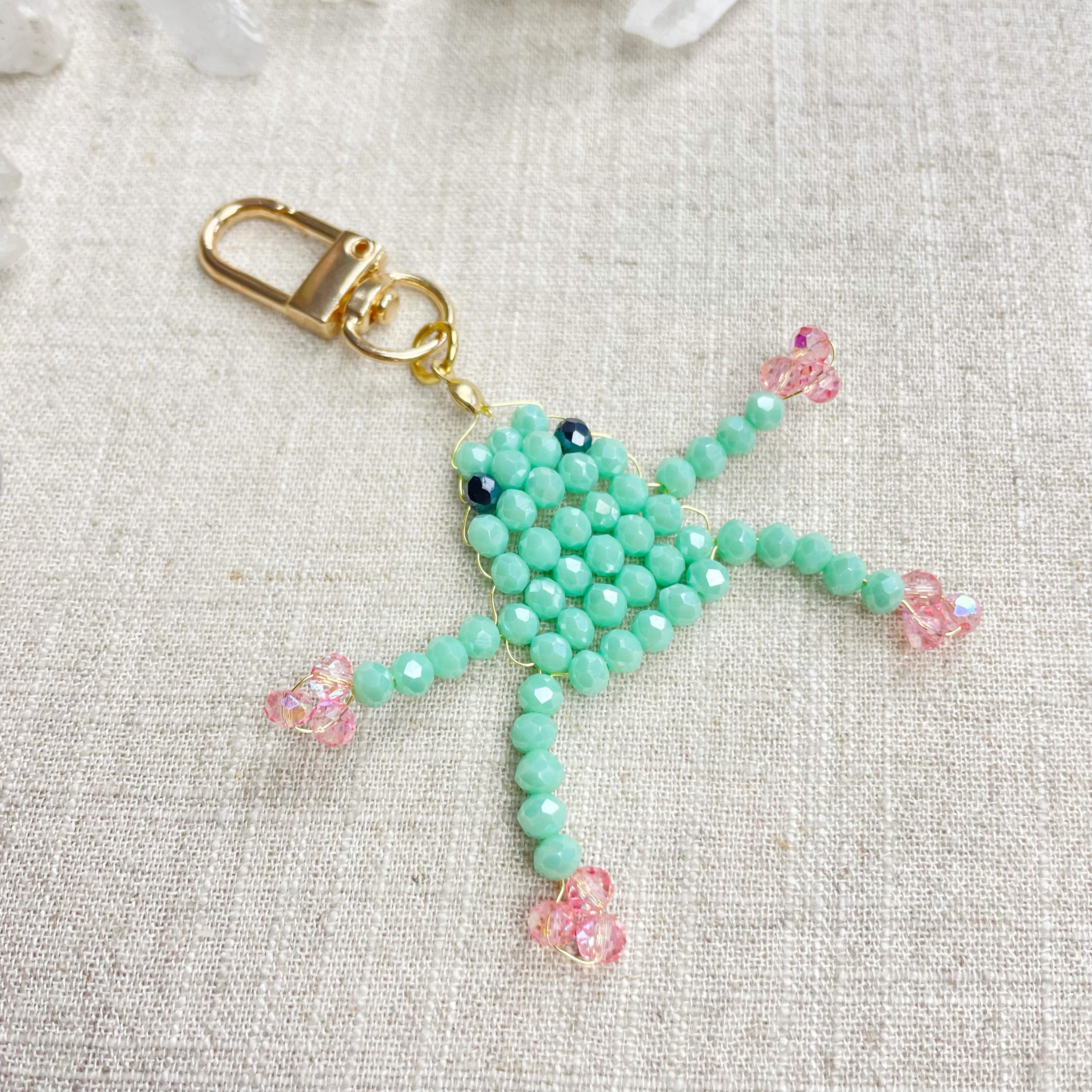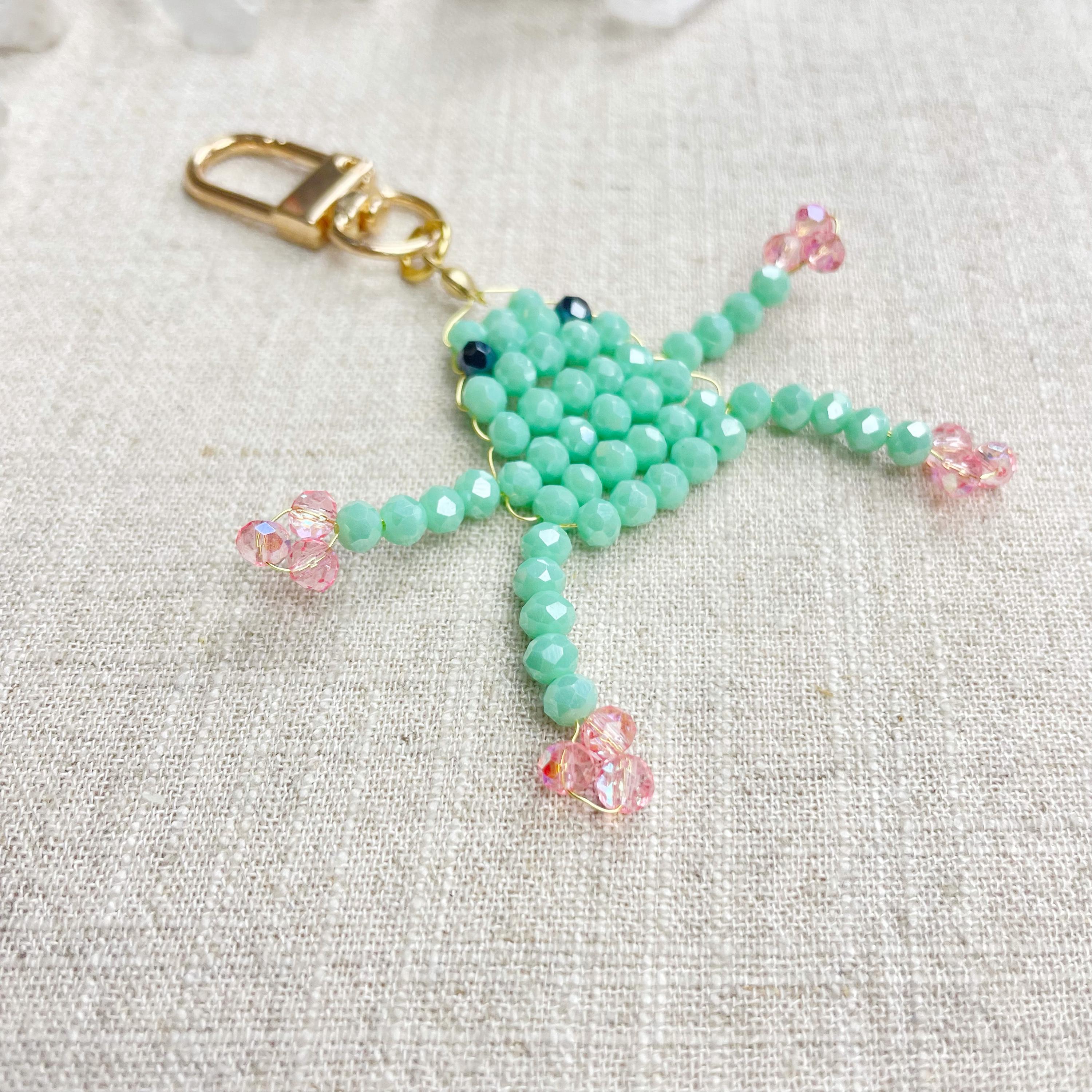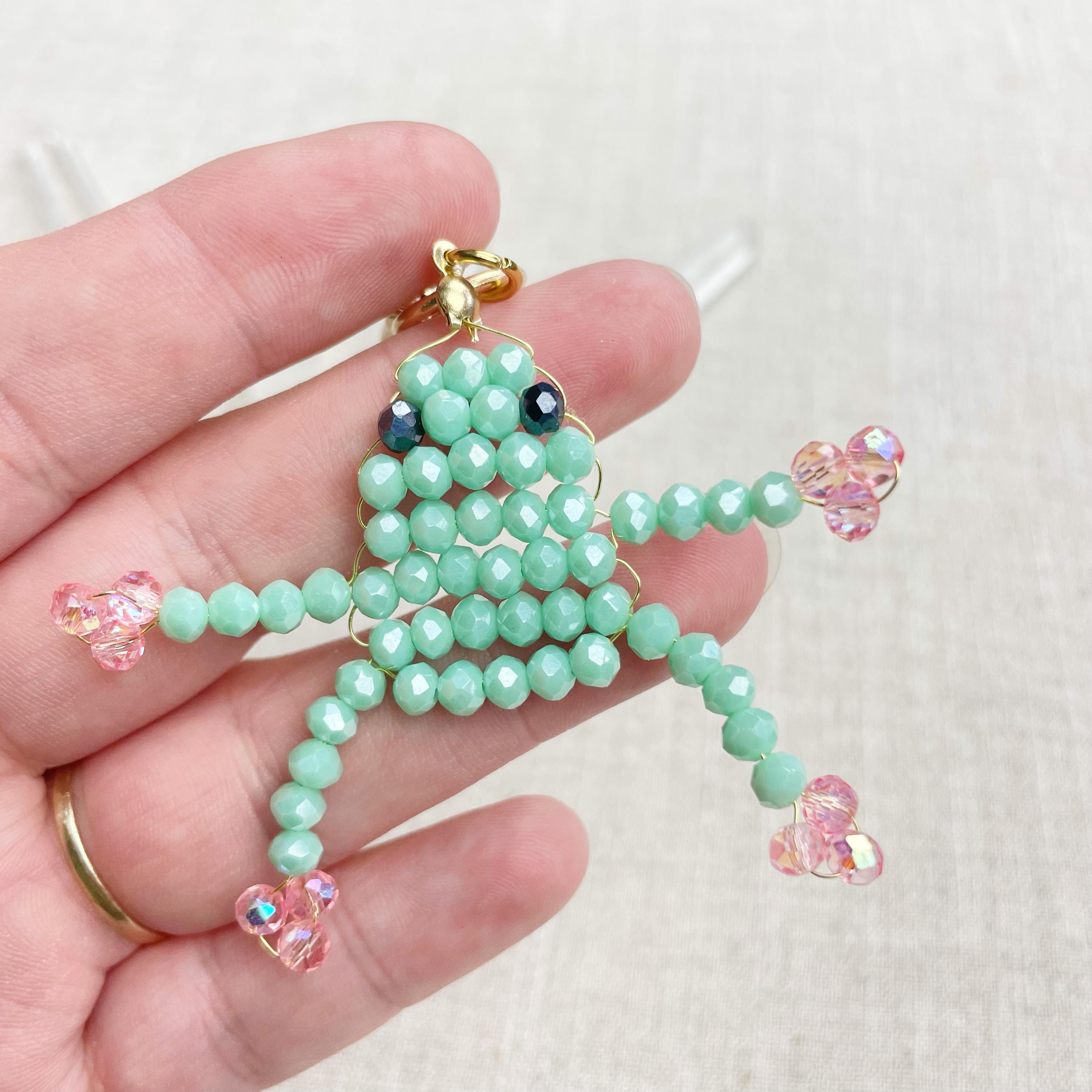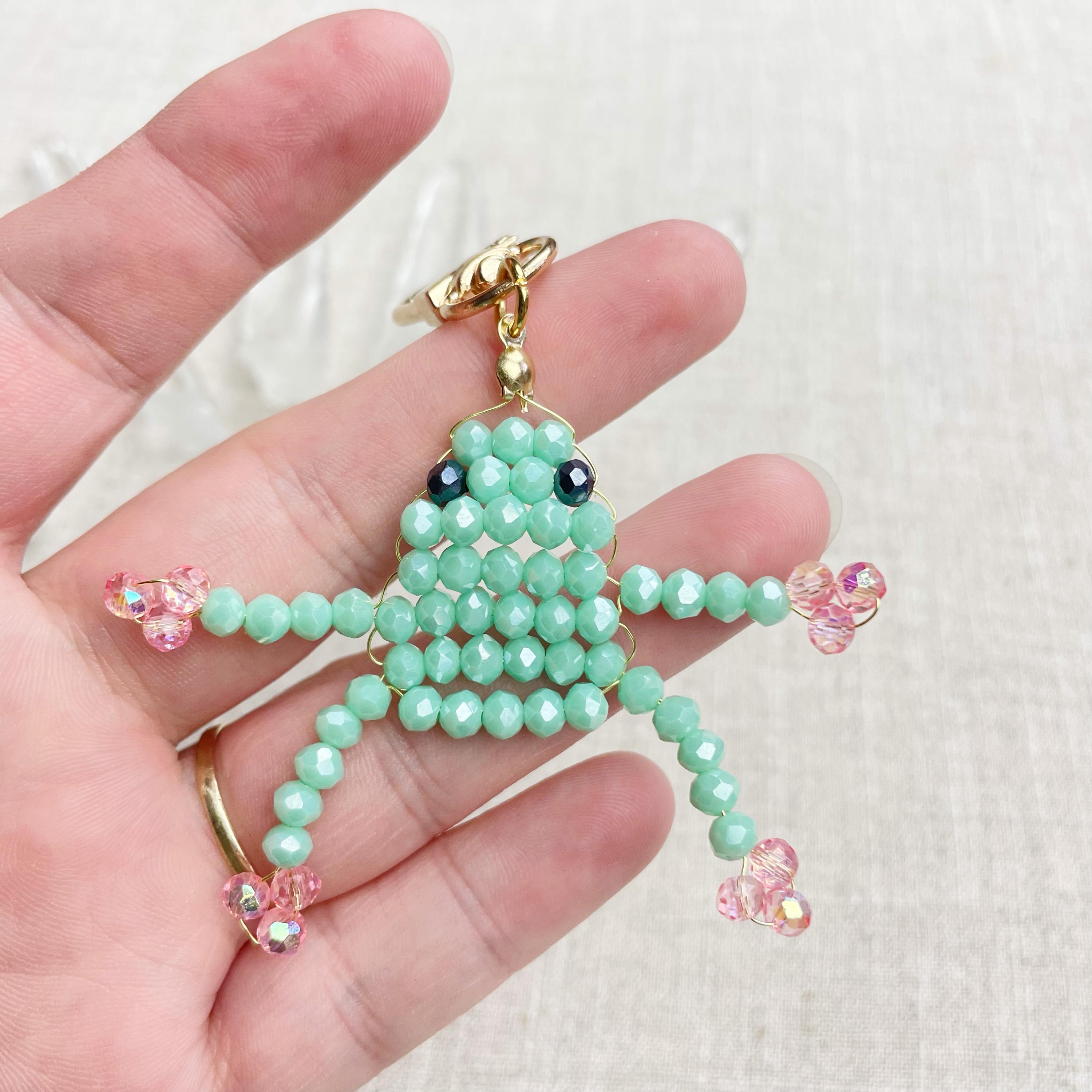 This charm is made from 4mm glass faceted rondelle beads. The beads are woven together with a gold toned wire to create the frog charm. The frog features iridescent green and iridescent pink bead colors.