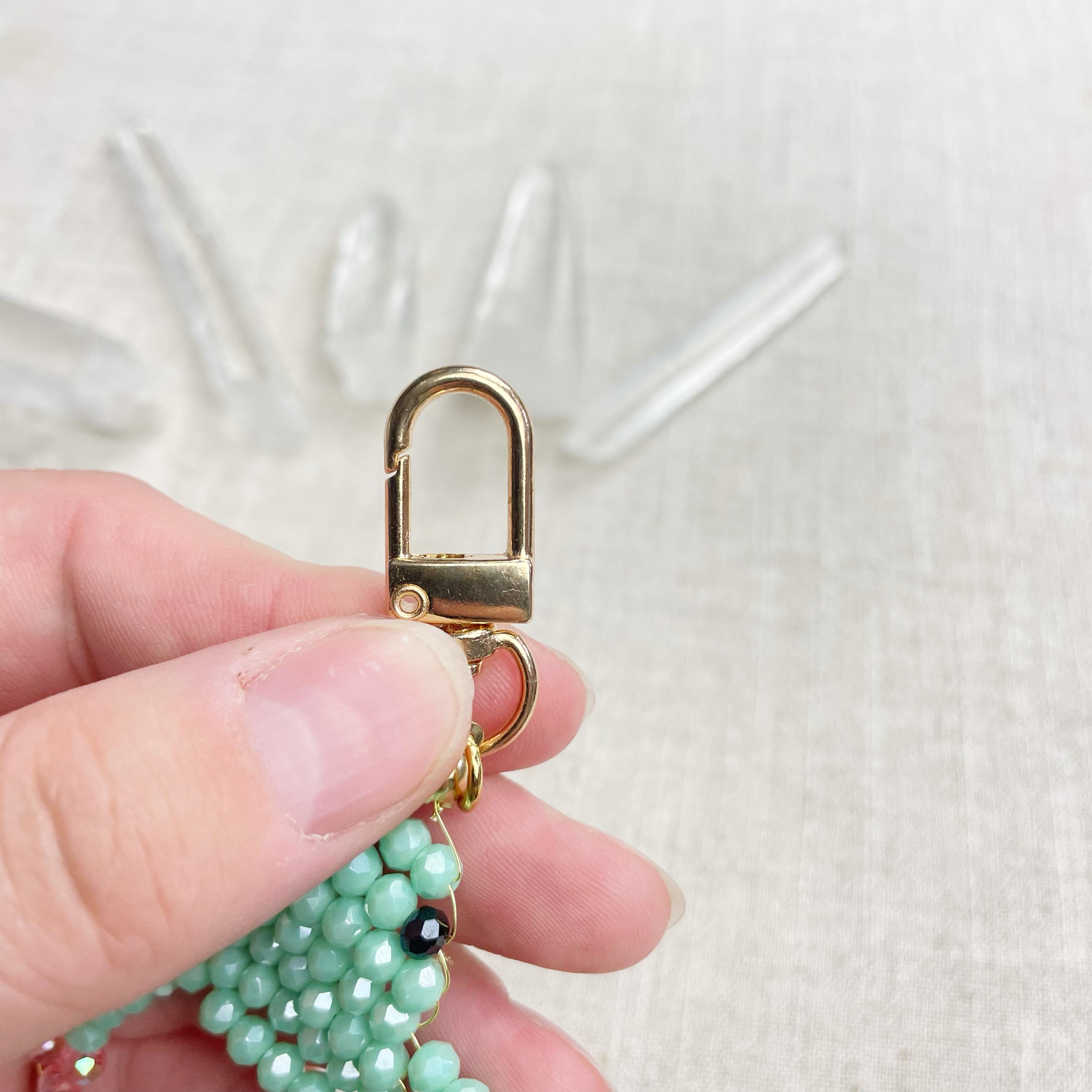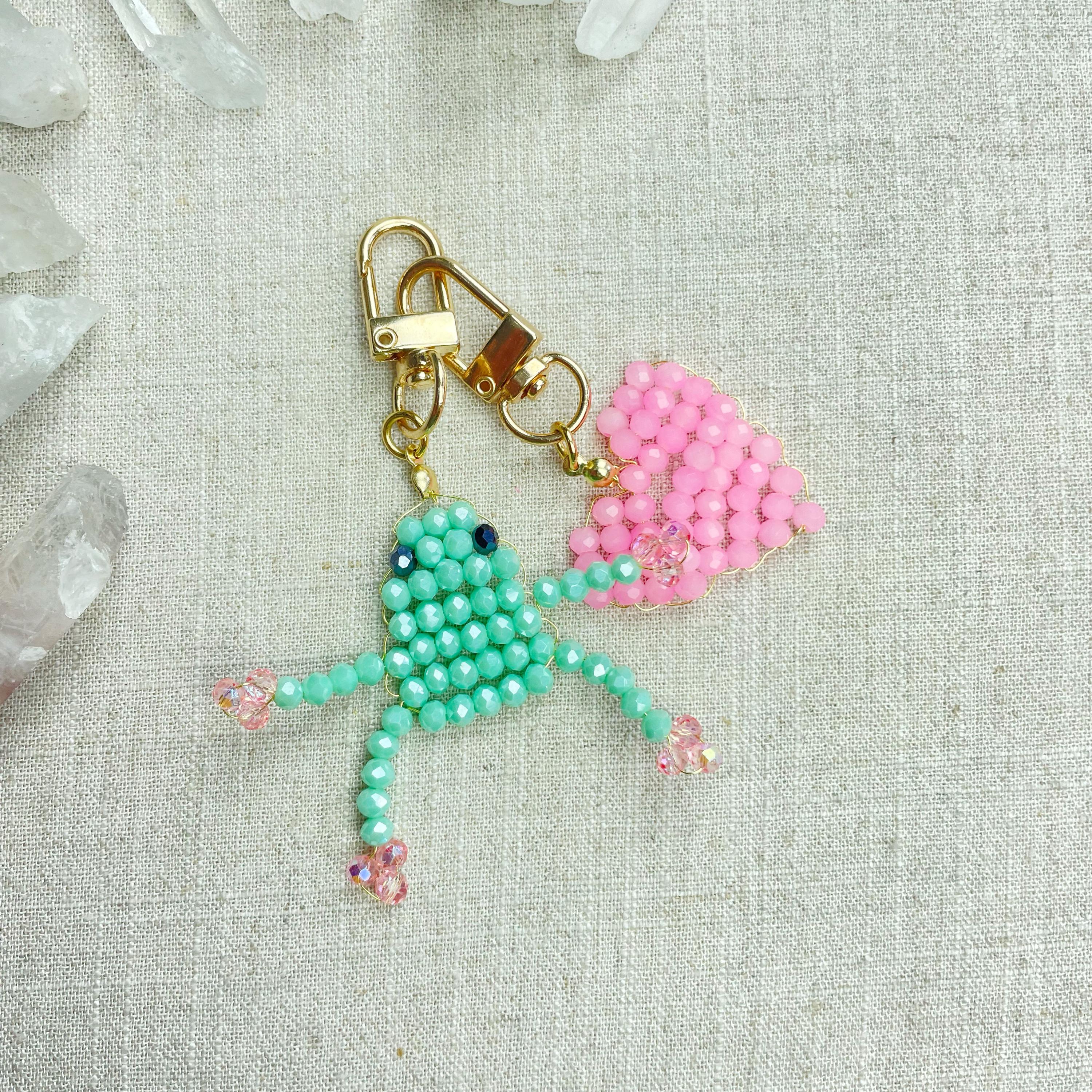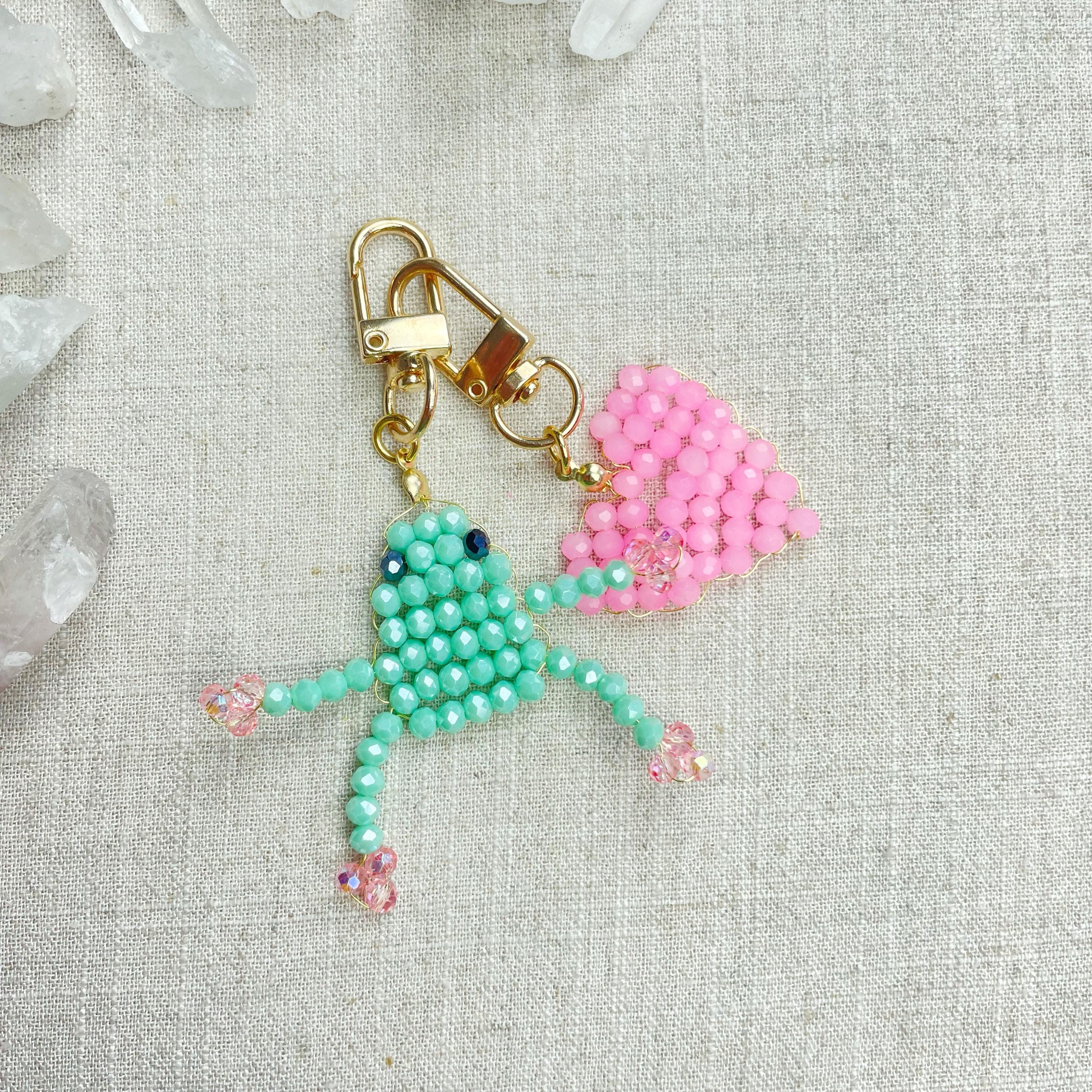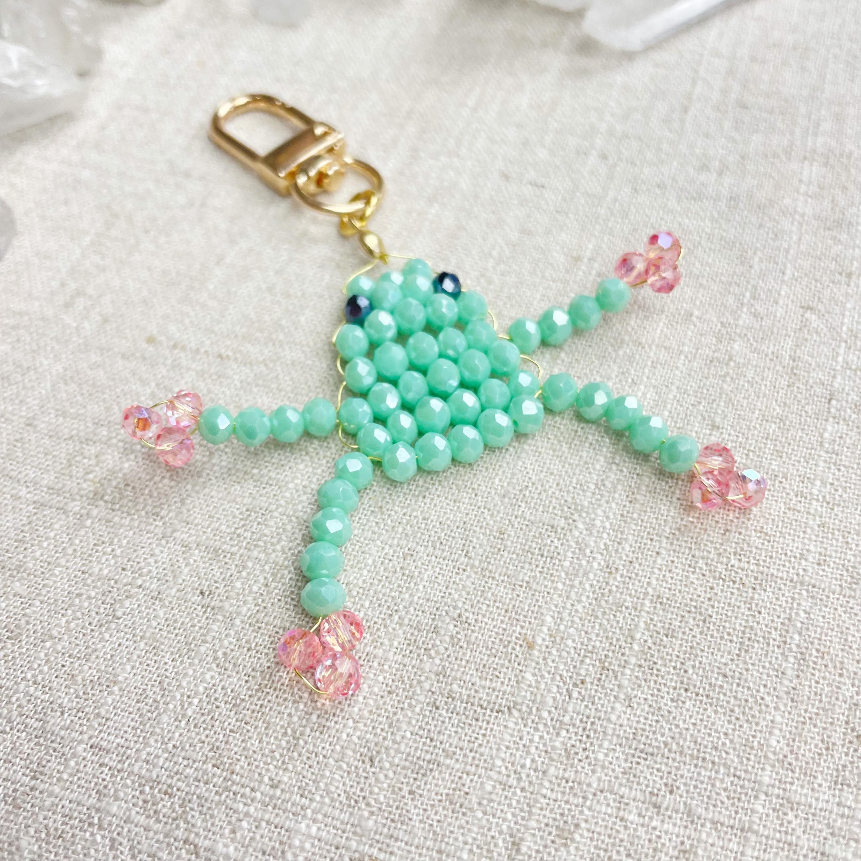 This charm is made from 4mm glass faceted rondelle beads. The beads are woven together with a gold toned wire to create the frog charm. The frog features iridescent green and iridescent pink bead colors.