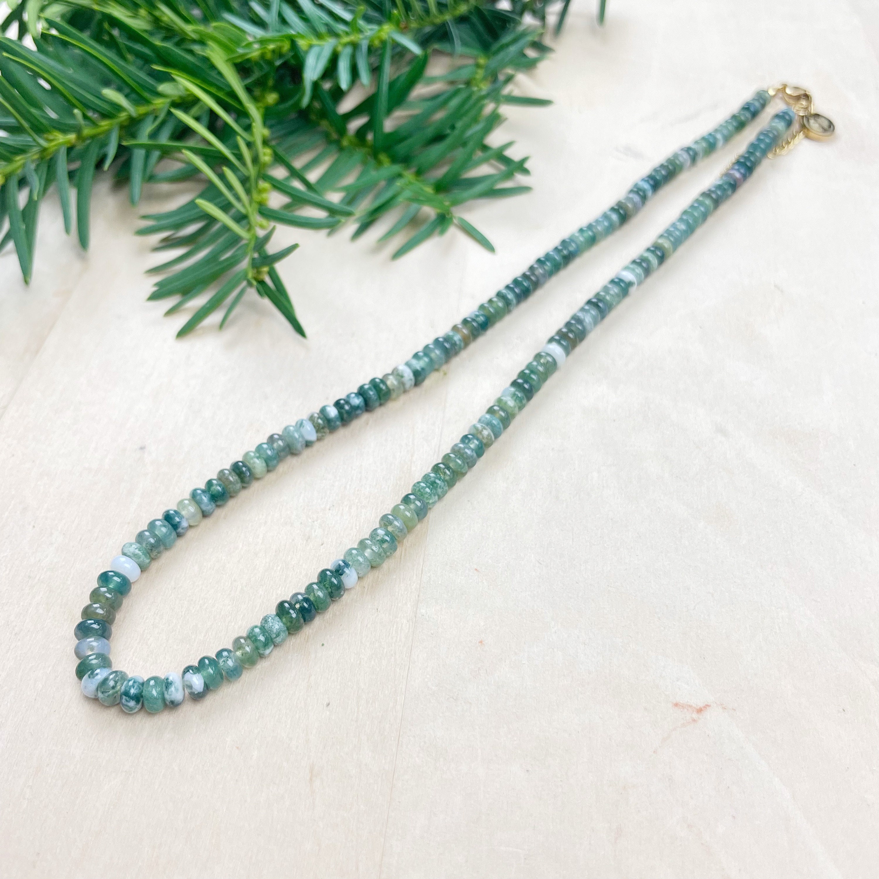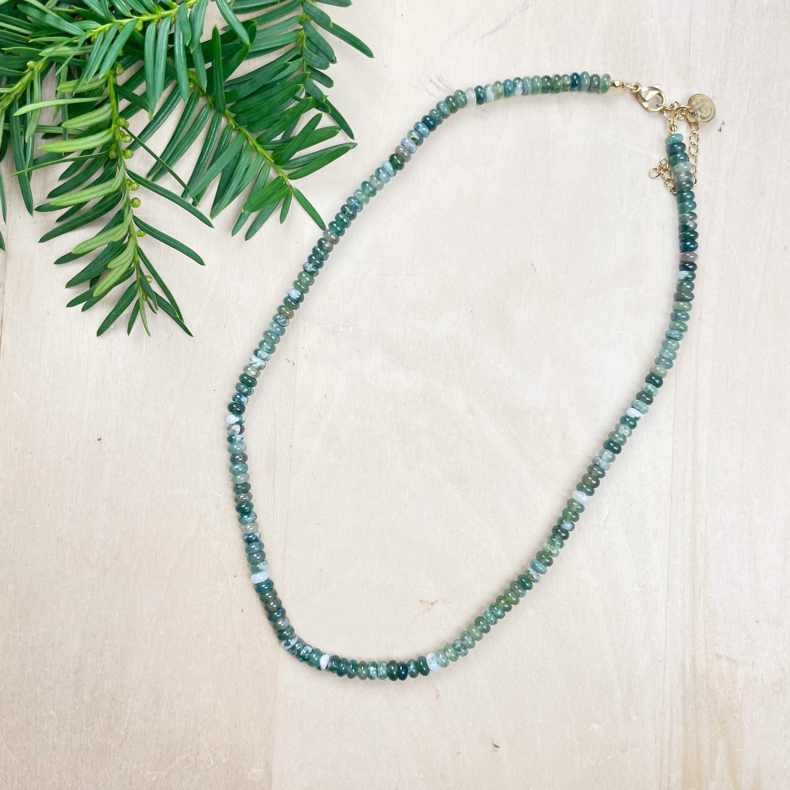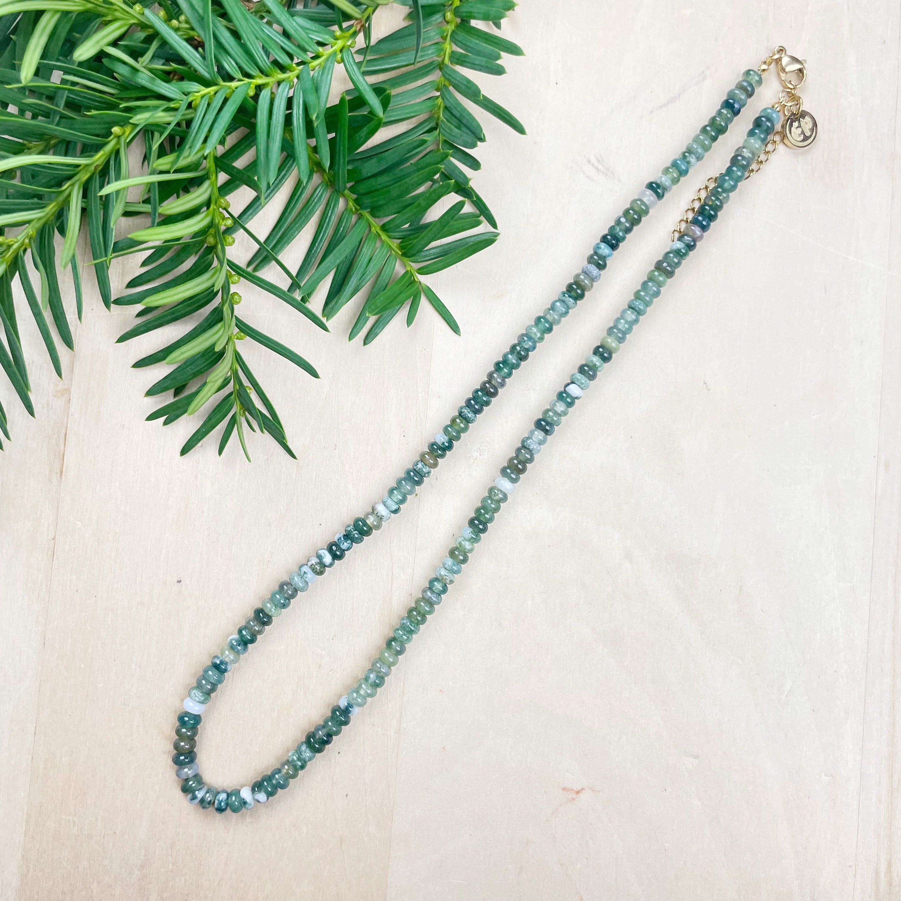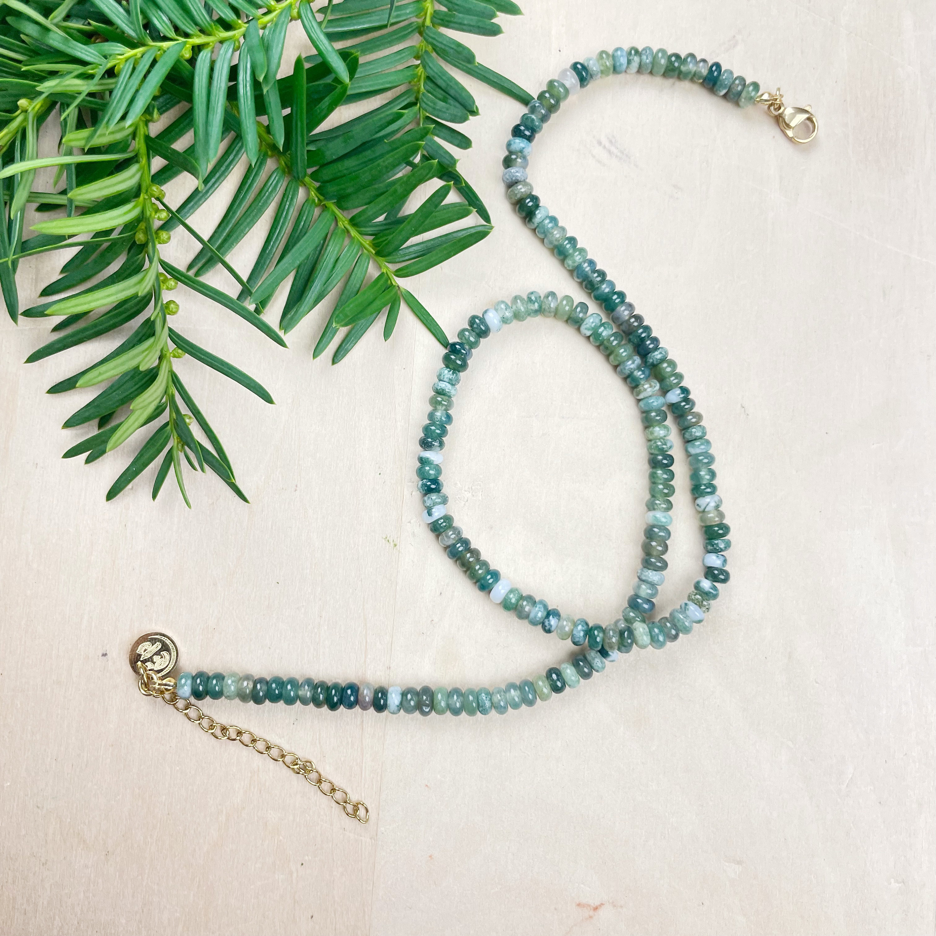 This necklace is made from natural moss agate stone beads. The beads are smooth rondelles that are 2x4mm in size. Each bead is strung on a 100% nylon cord. The necklace is finished off with a gold plated stainless steel chain, clasp and logo charm.