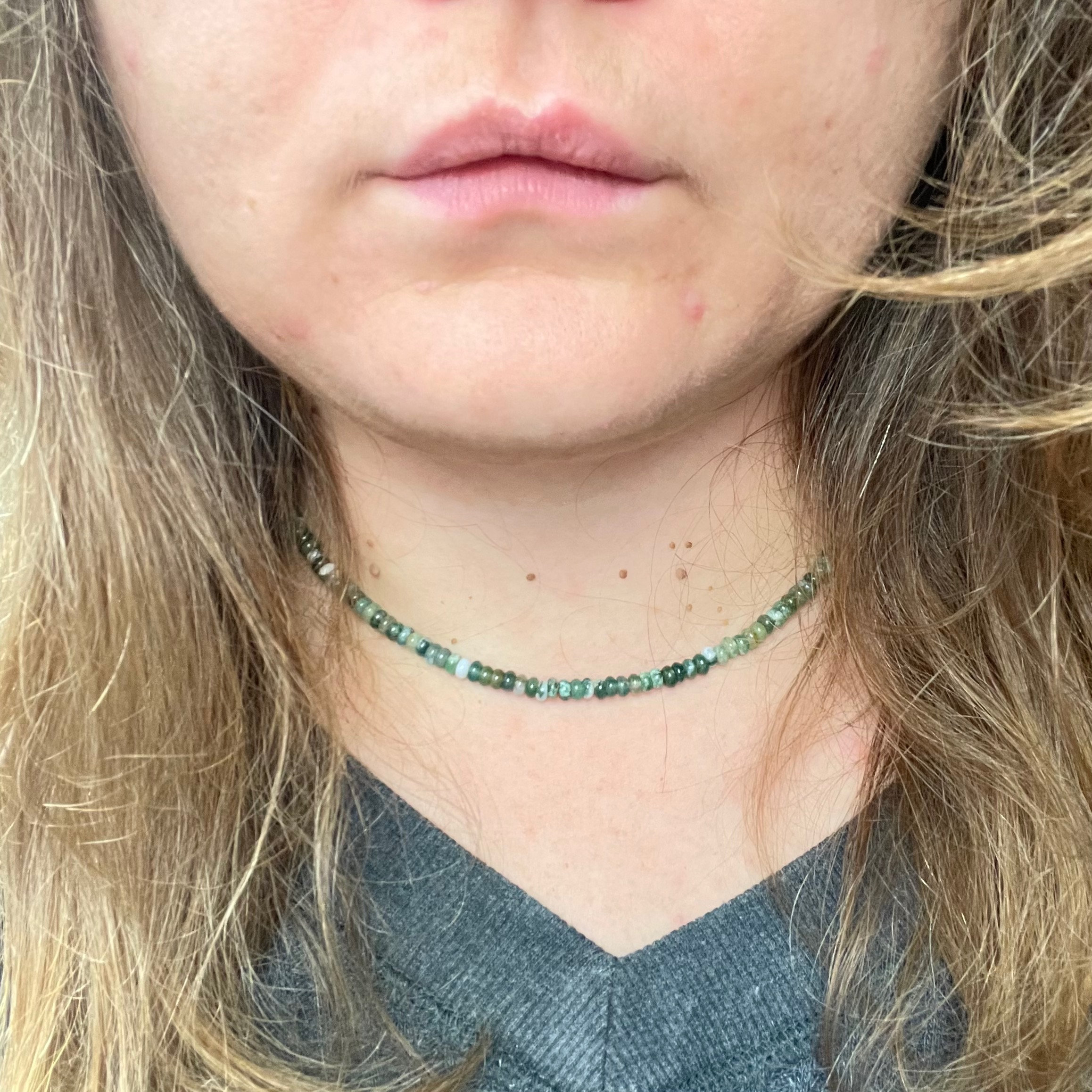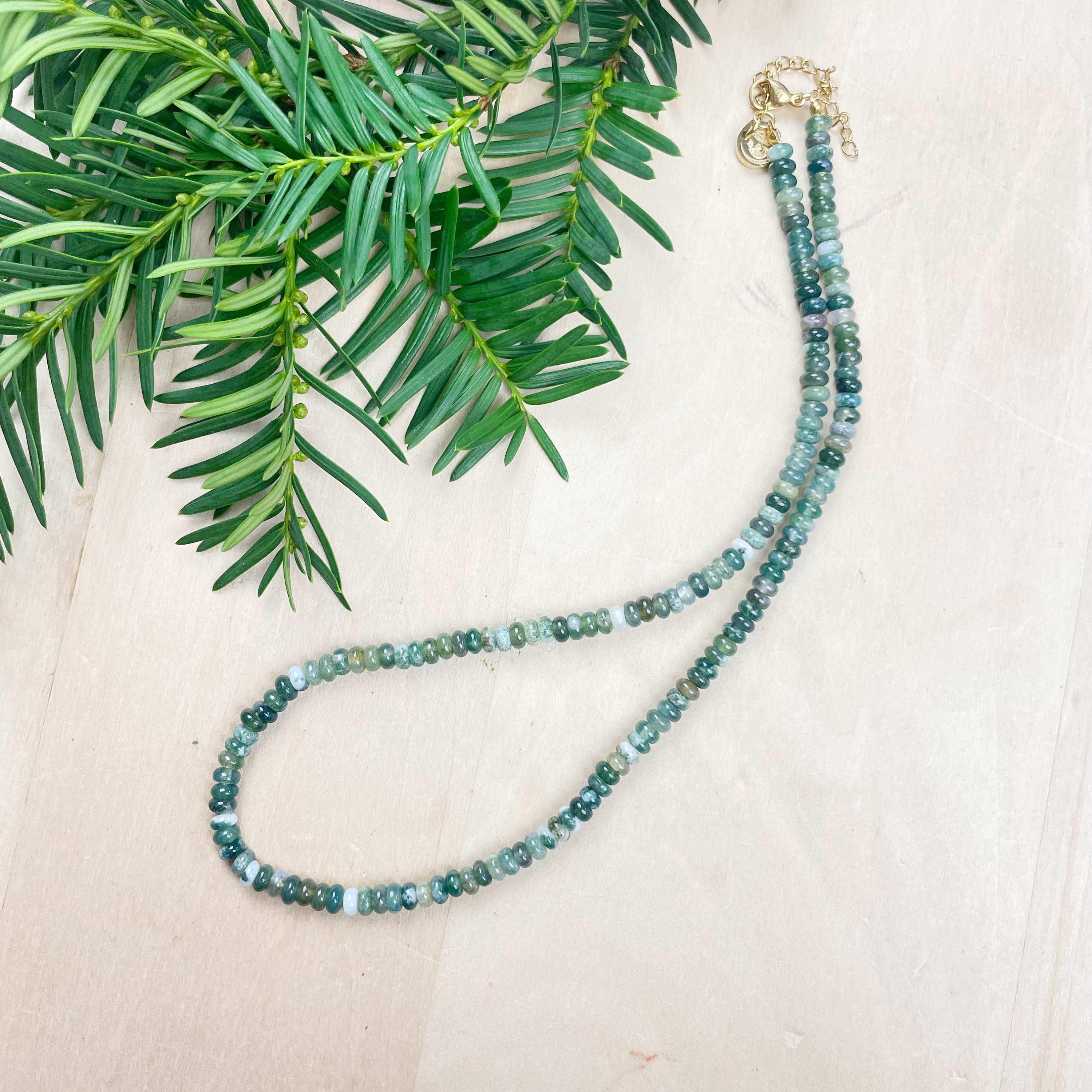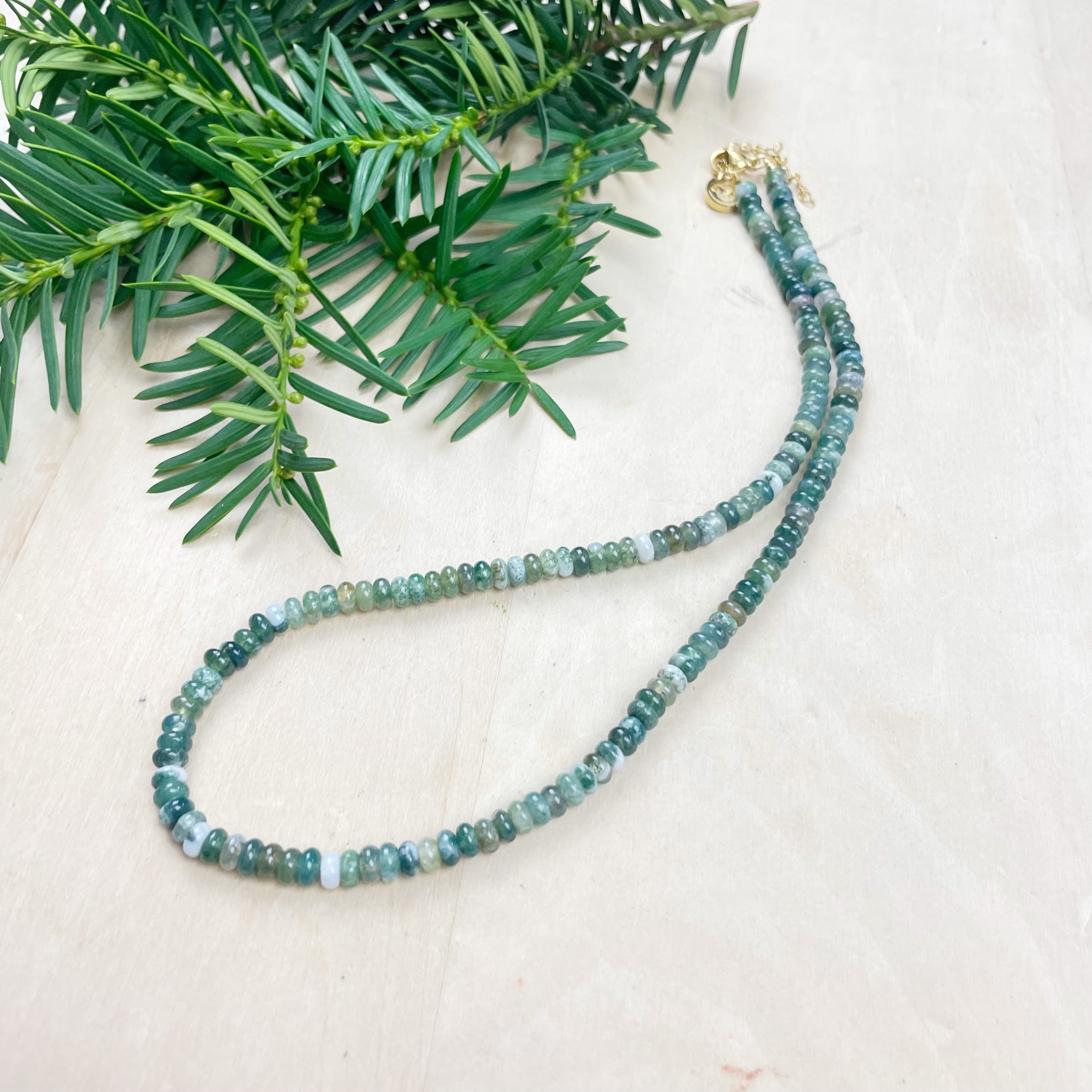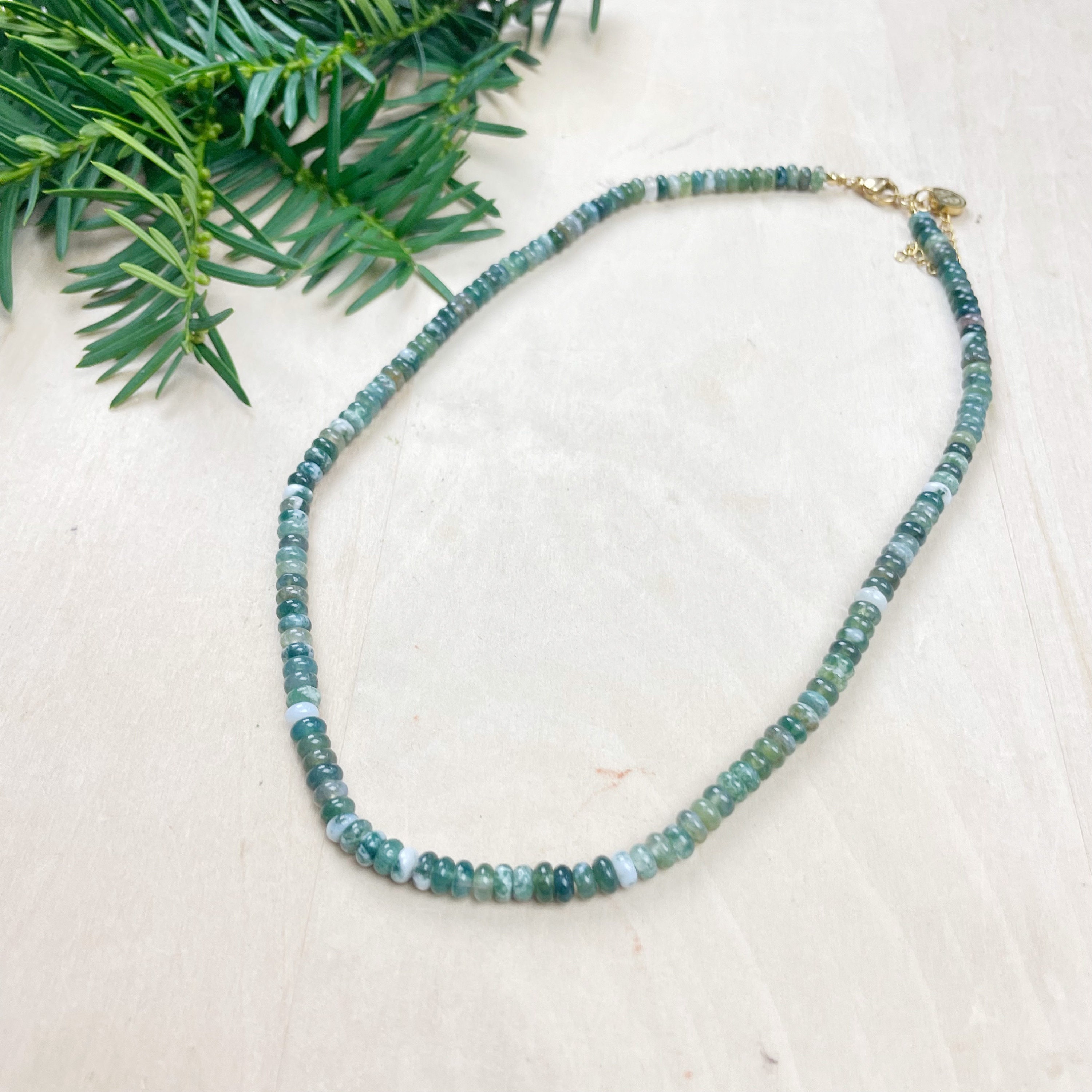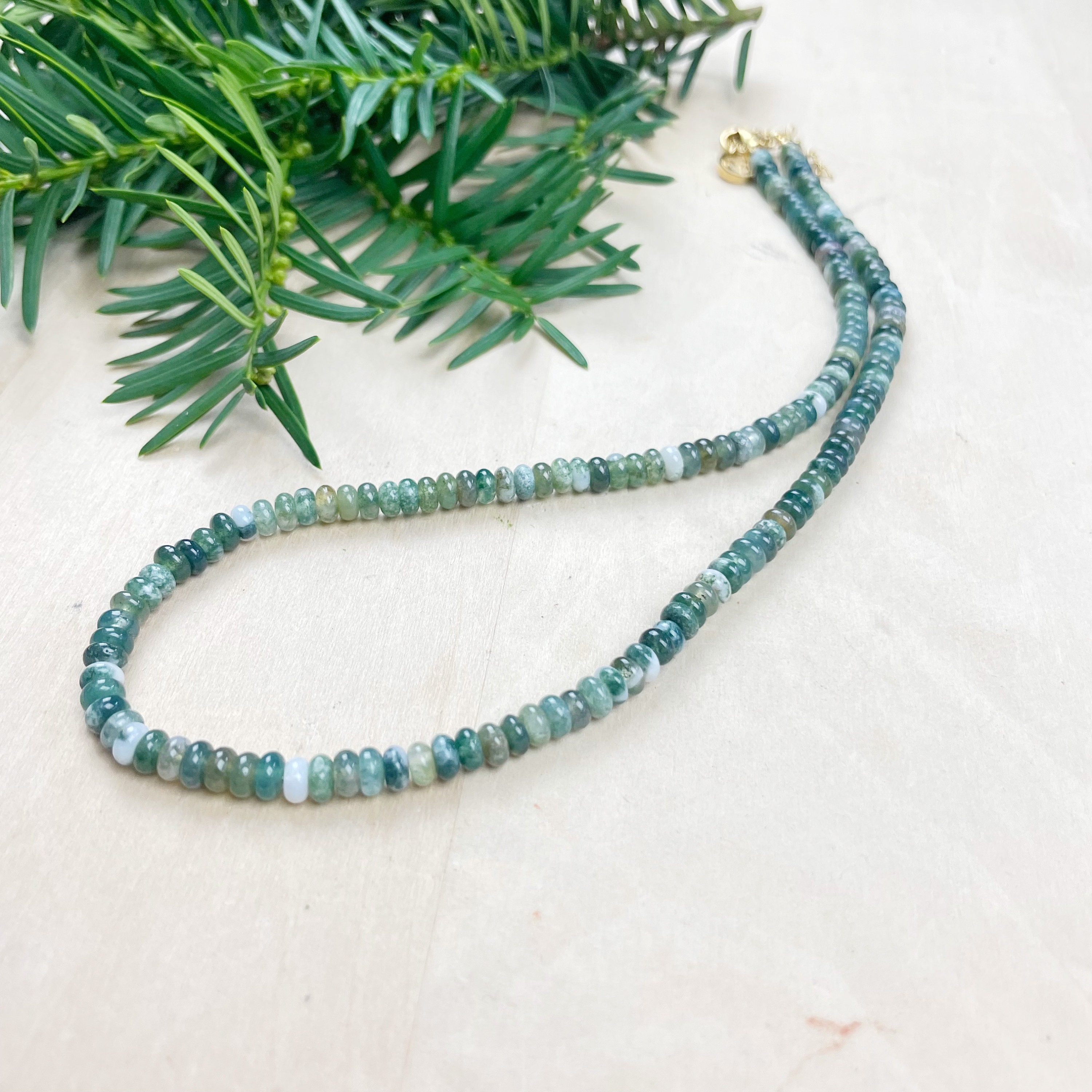 This necklace is made from natural moss agate stone beads. The beads are smooth rondelles that are 2x4mm in size. Each bead is strung on a 100% nylon cord. The necklace is finished off with a gold plated stainless steel chain, clasp and logo charm.