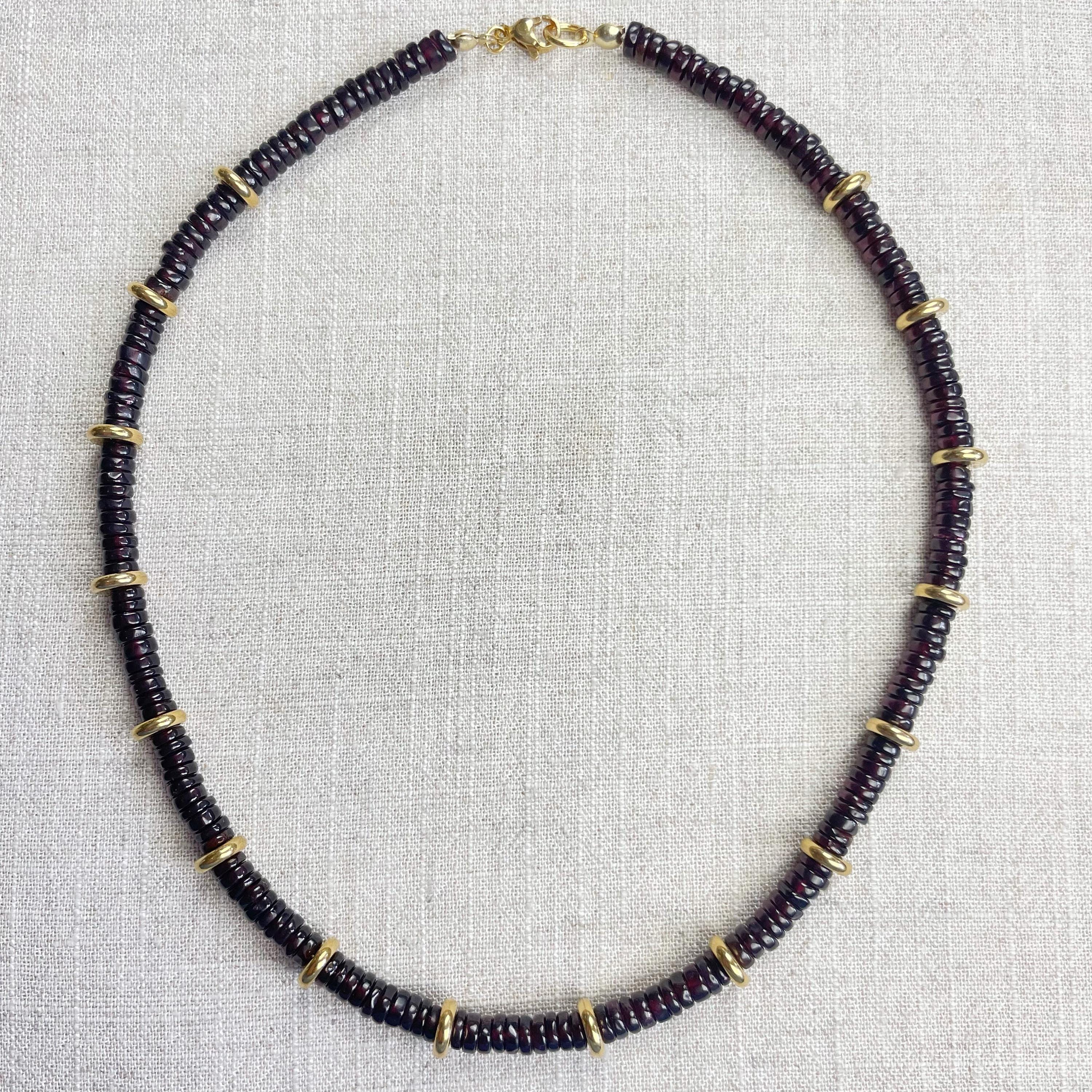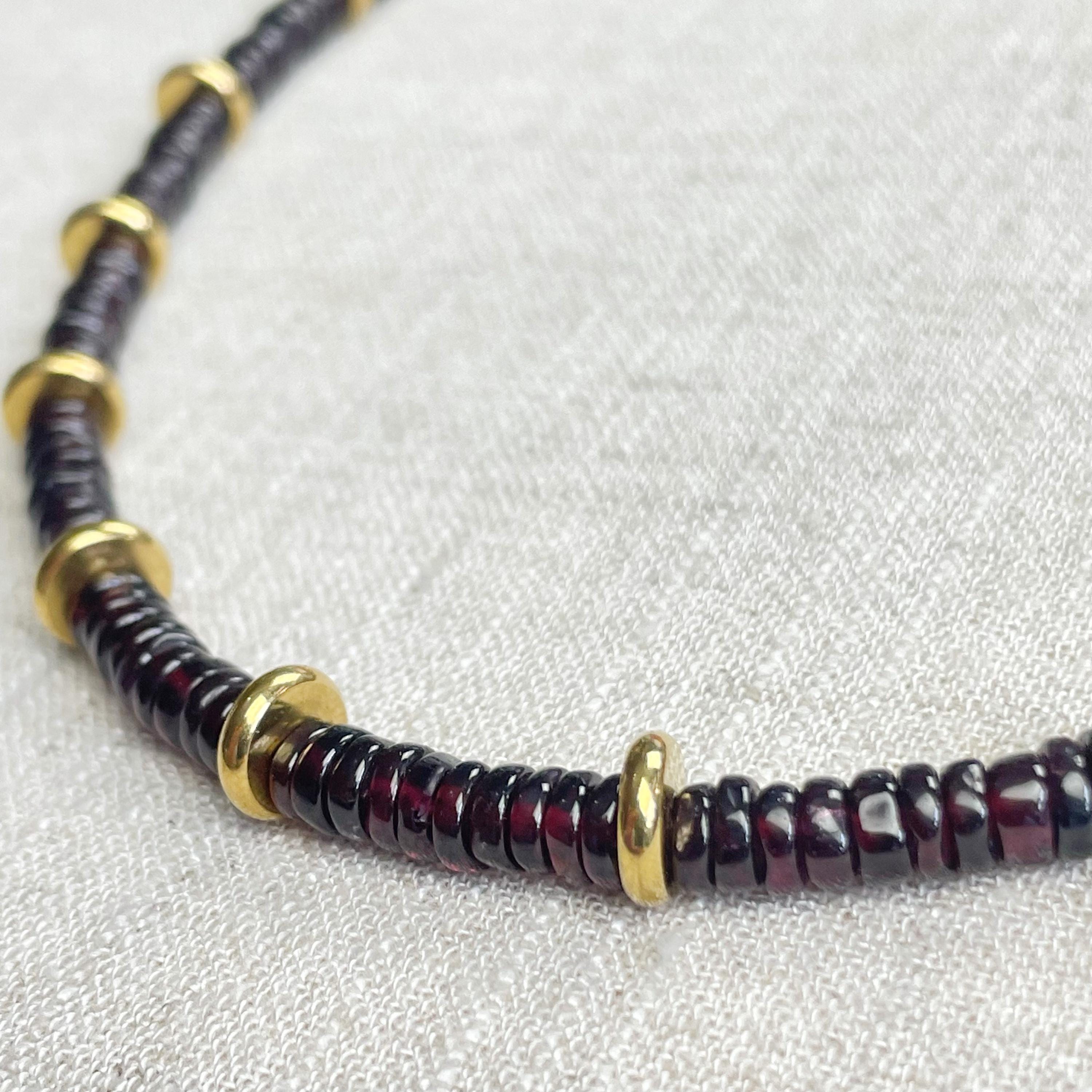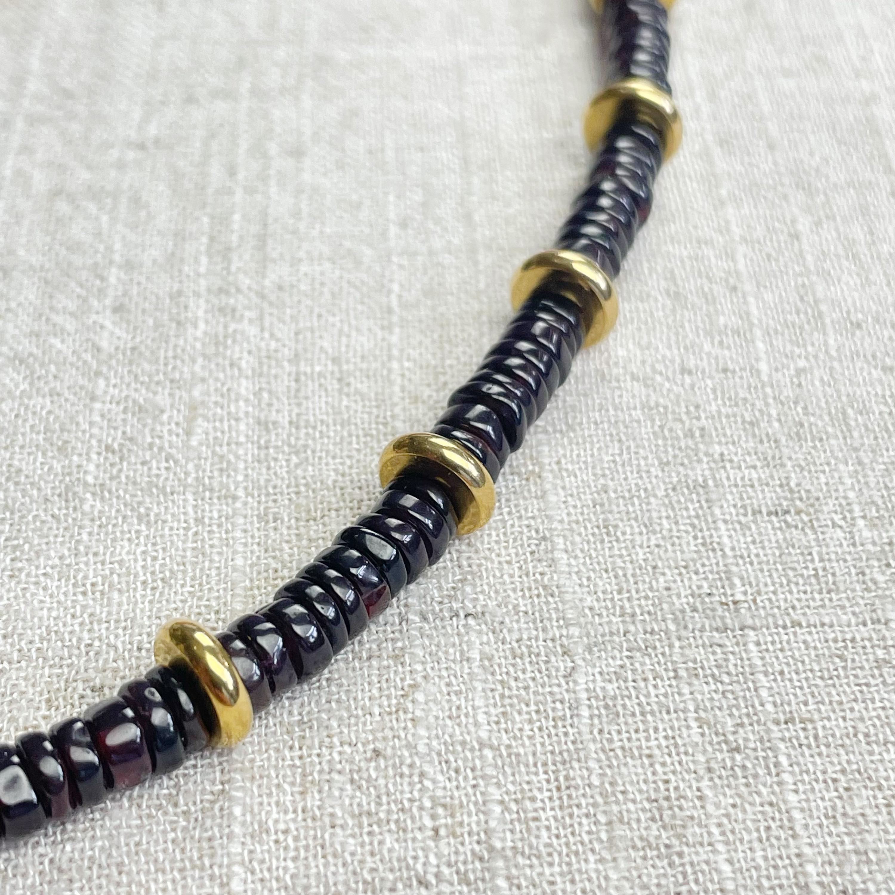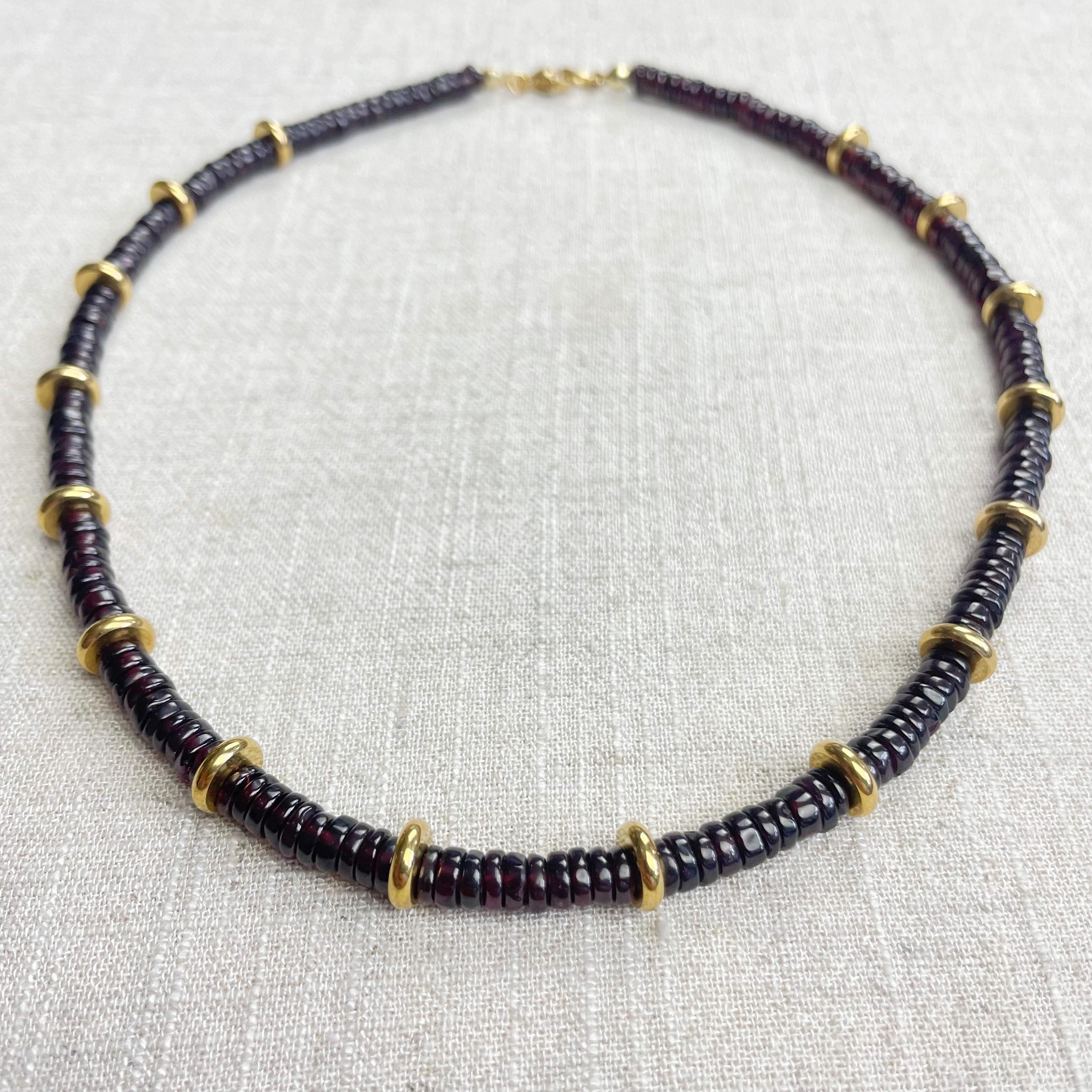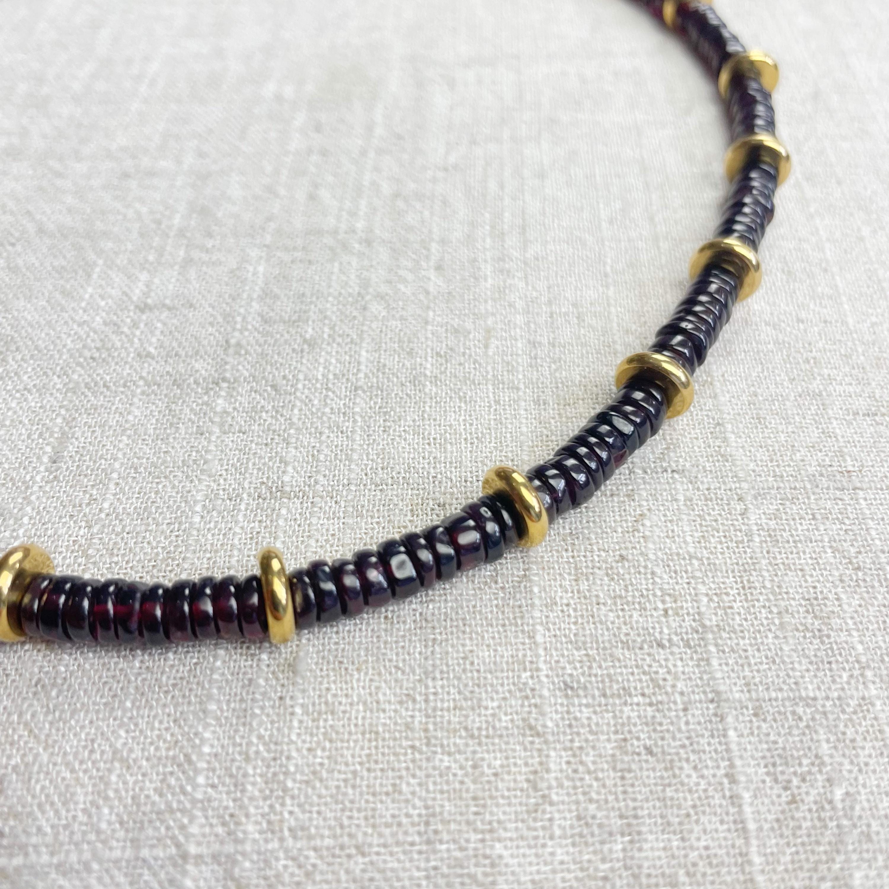 This necklace is made from beautiful garnet beds which are 5mm wide in a heishi (disc) shape. Gold plated stainless steel beads are added between the garnet beads to create a gorgeous necklace. Each necklace is strung on a stainless steel beading wire. The necklace is finished off with a gold plated stainless steel lobster clasp and a logo charm.