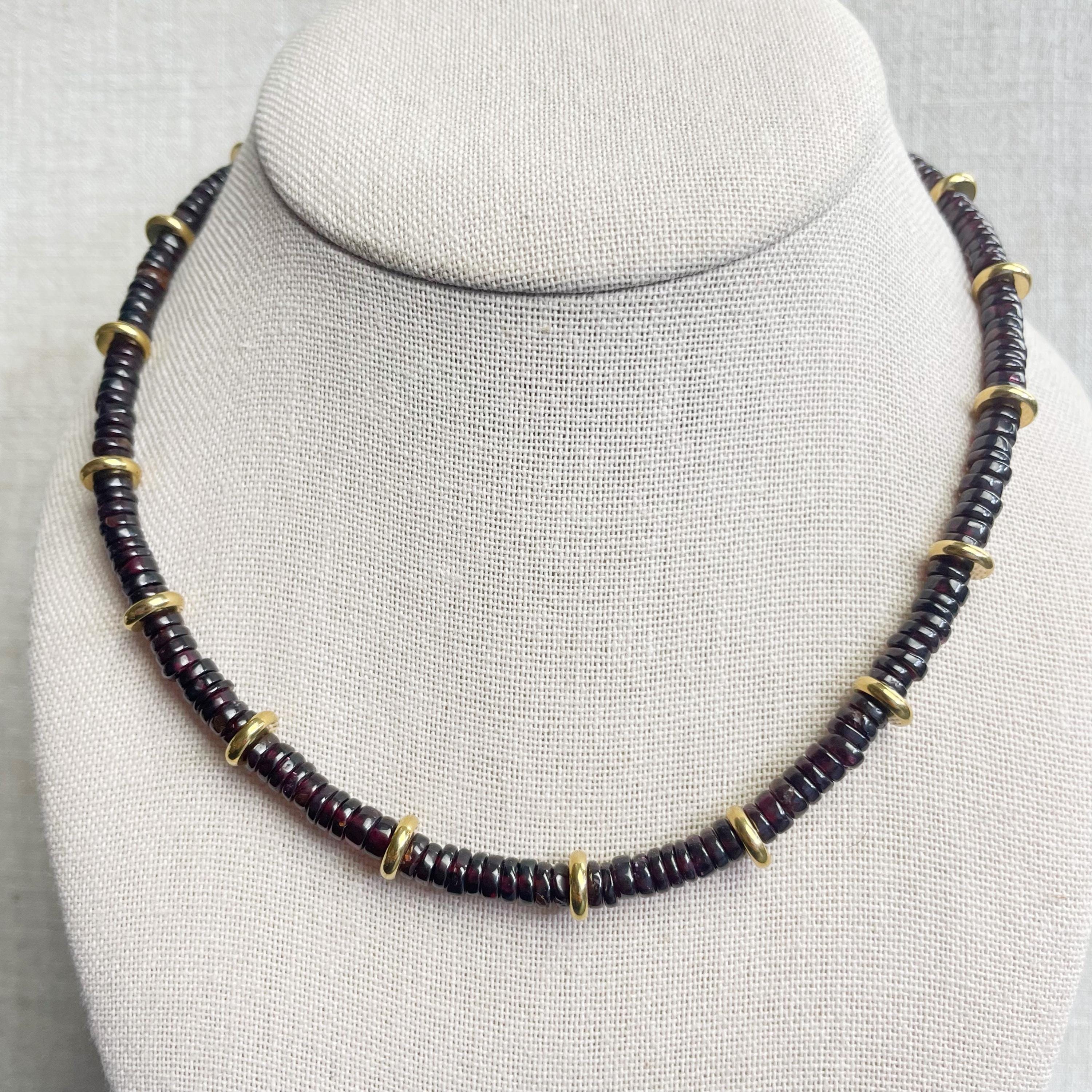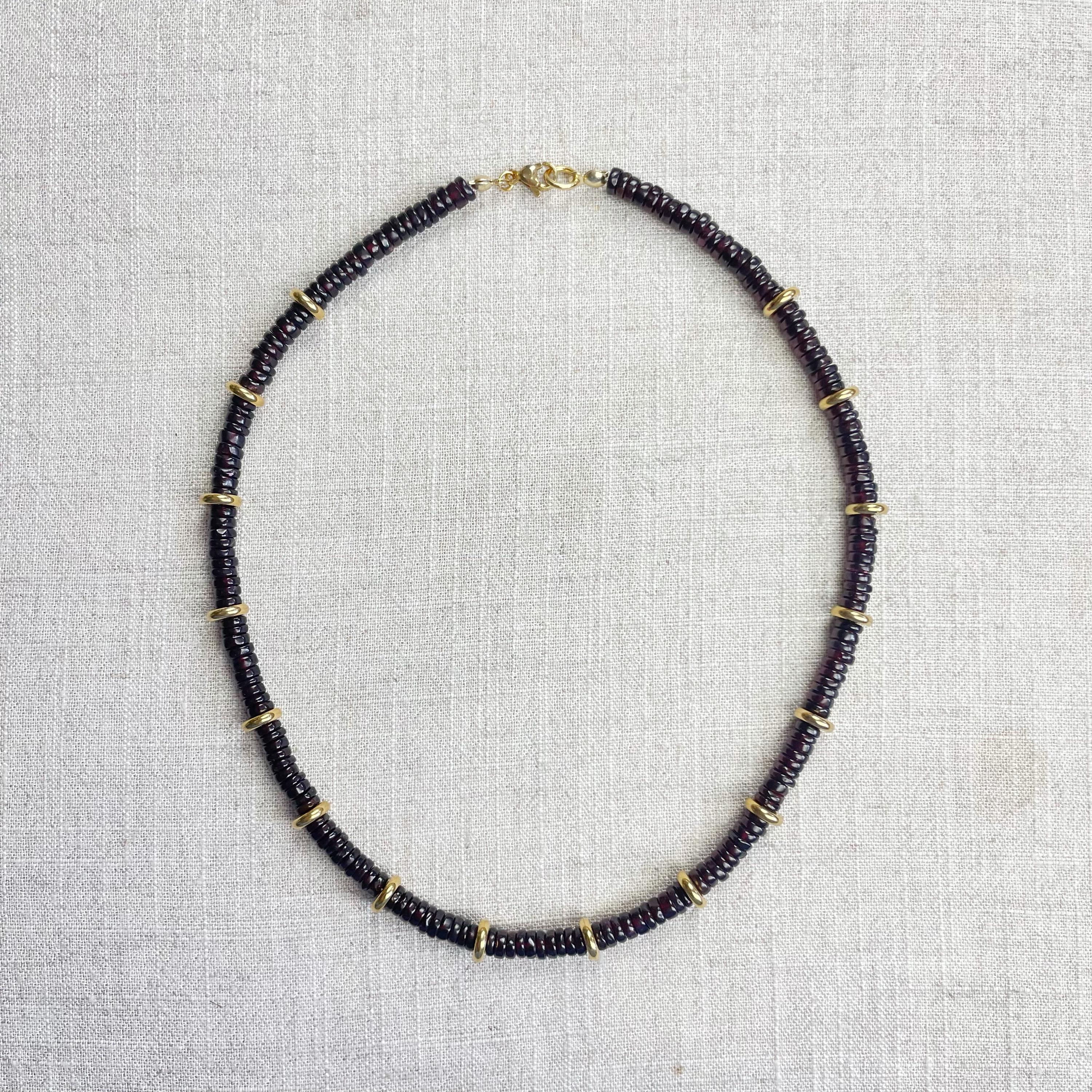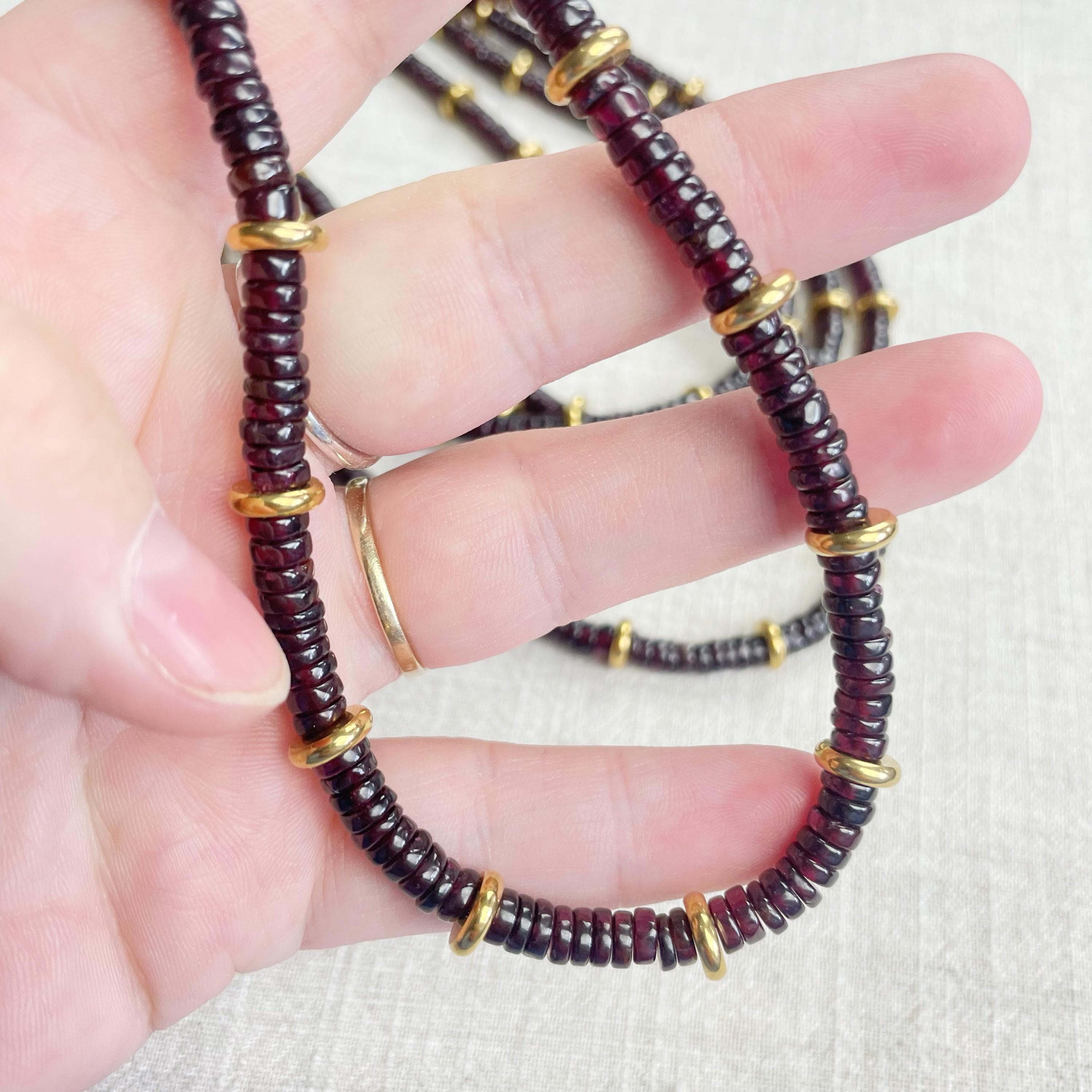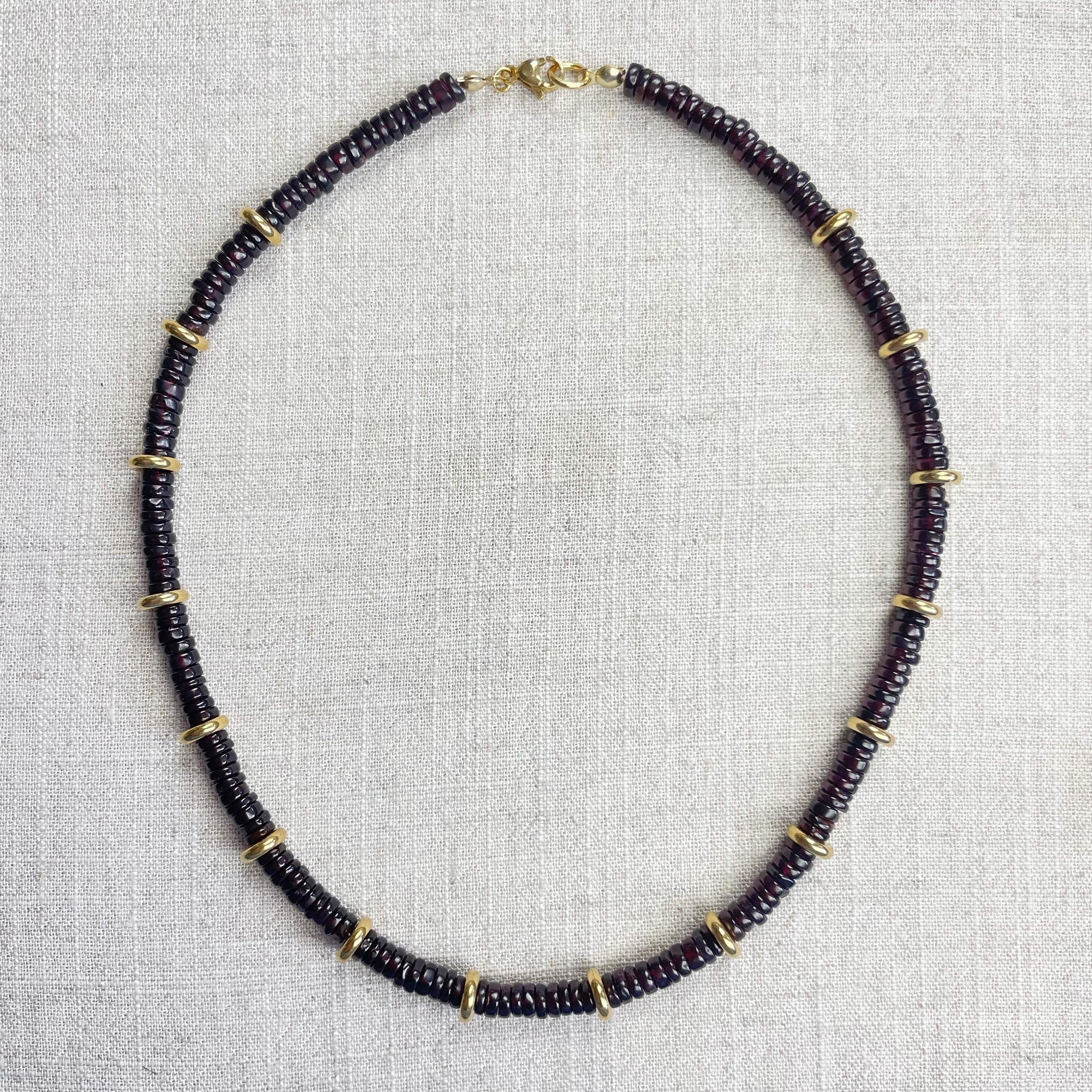 This necklace is made from beautiful garnet beds which are 5mm wide in a heishi (disc) shape. Gold plated stainless steel beads are added between the garnet beads to create a gorgeous necklace. Each necklace is strung on a stainless steel beading wire. The necklace is finished off with a gold plated stainless steel lobster clasp and a logo charm.