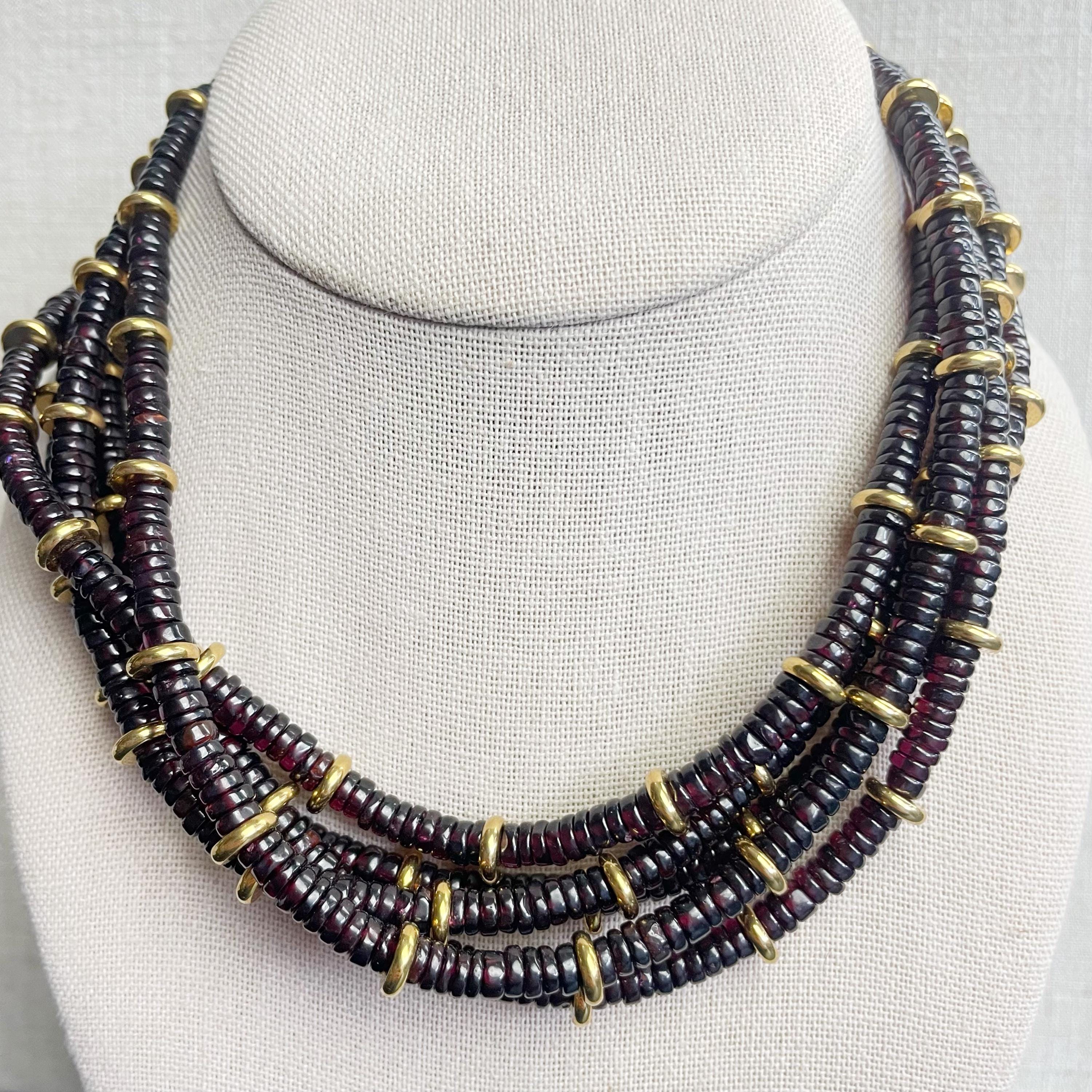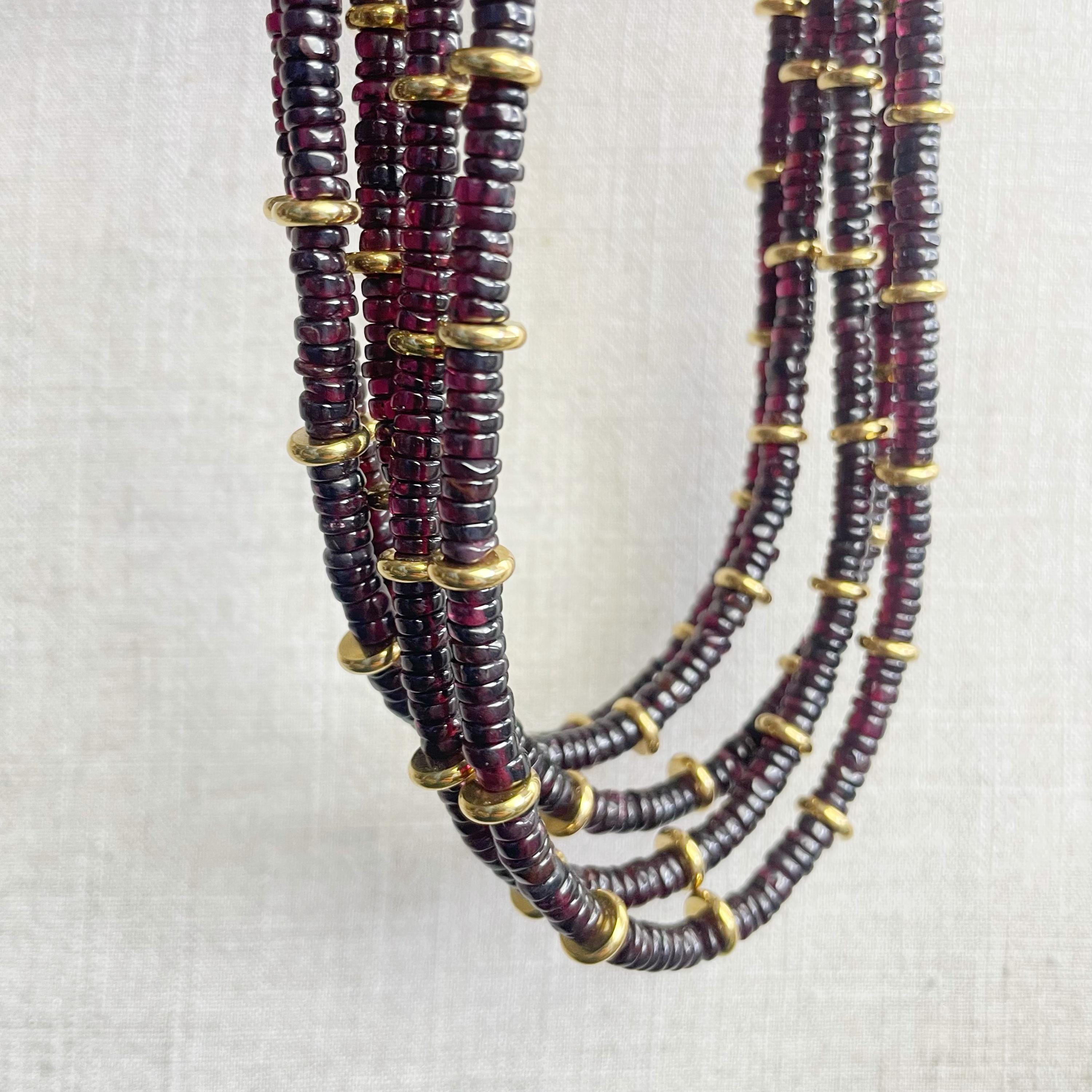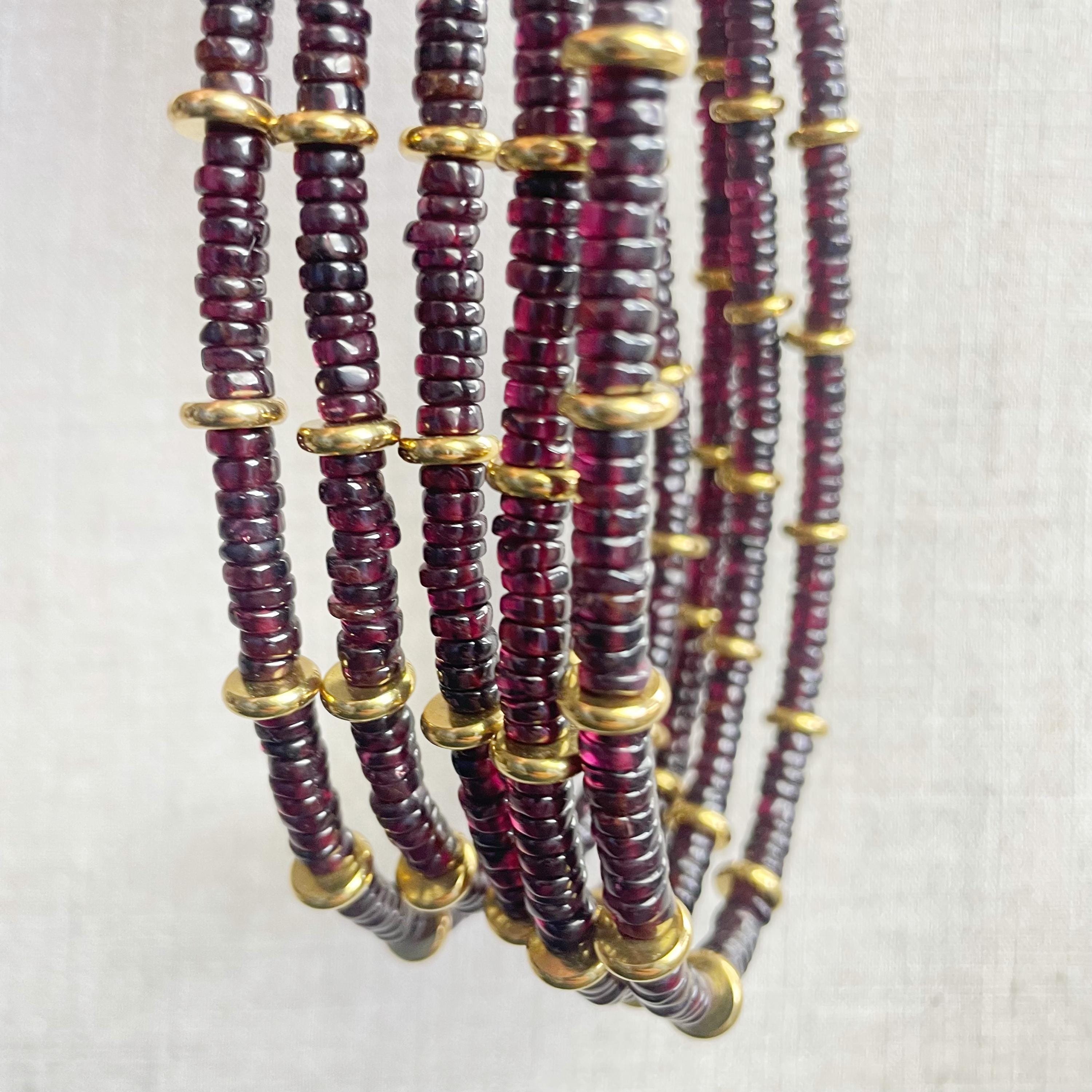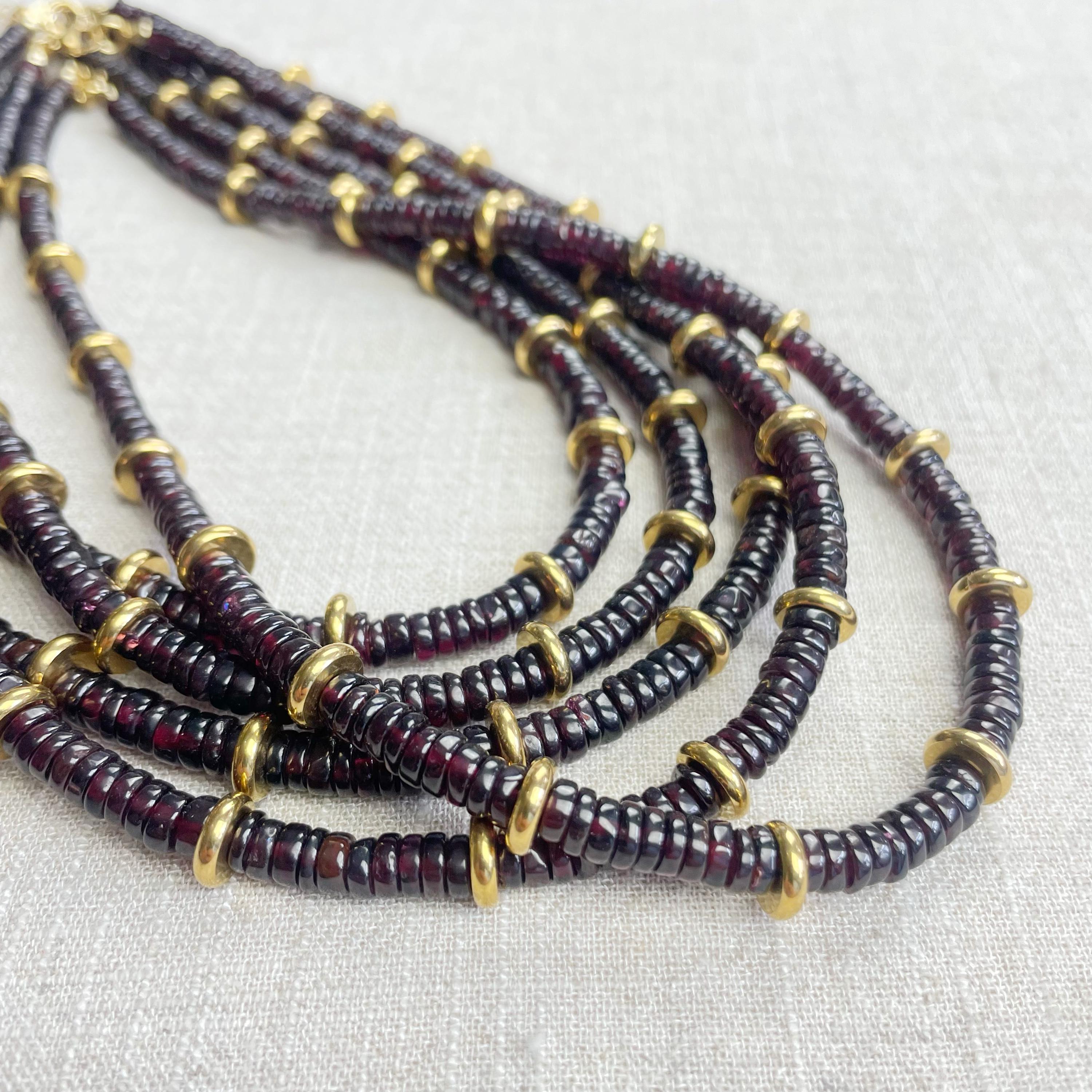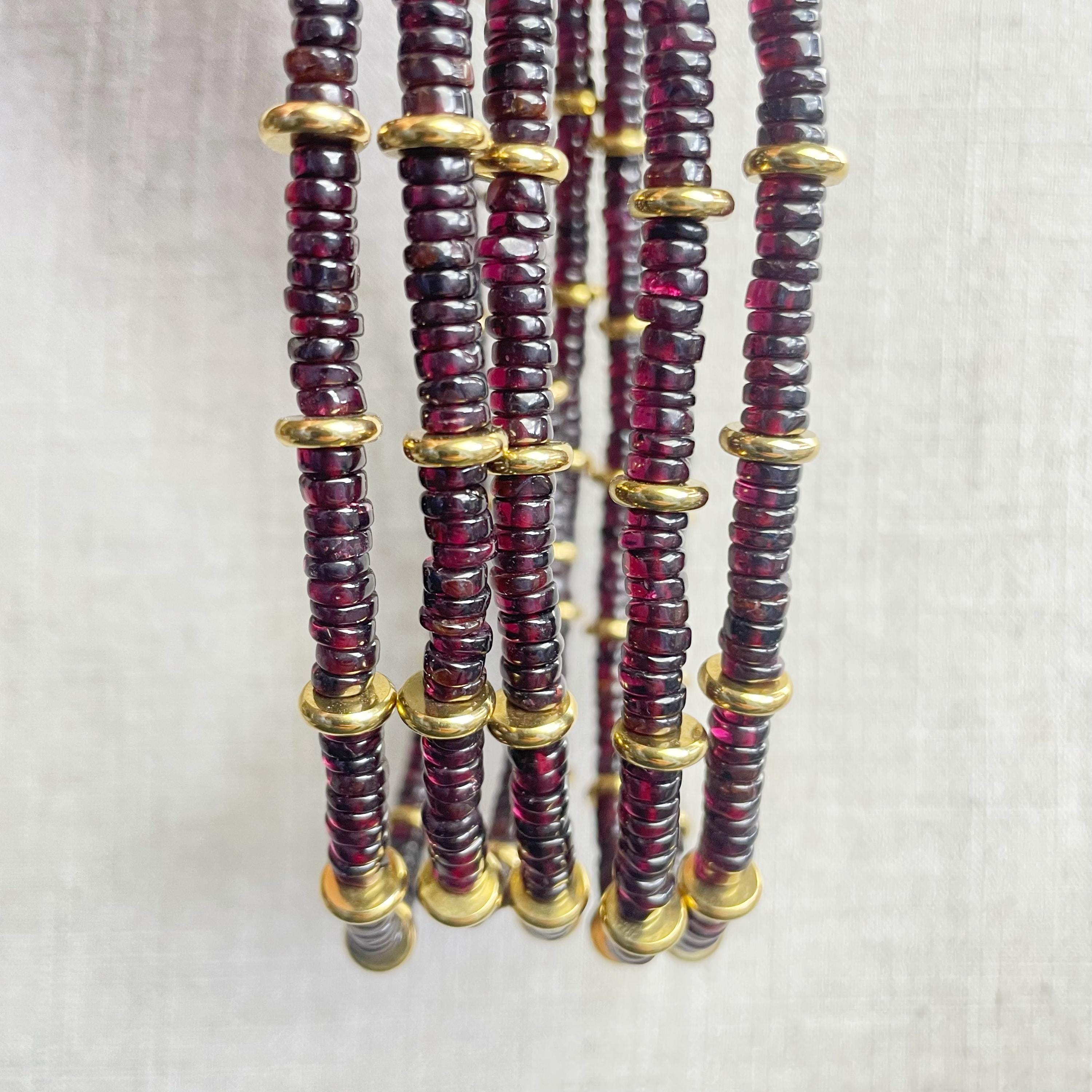 This necklace is made from beautiful garnet beds which are 5mm wide in a heishi (disc) shape. Gold plated stainless steel beads are added between the garnet beads to create a gorgeous necklace. Each necklace is strung on a stainless steel beading wire. The necklace is finished off with a gold plated stainless steel lobster clasp and a logo charm.