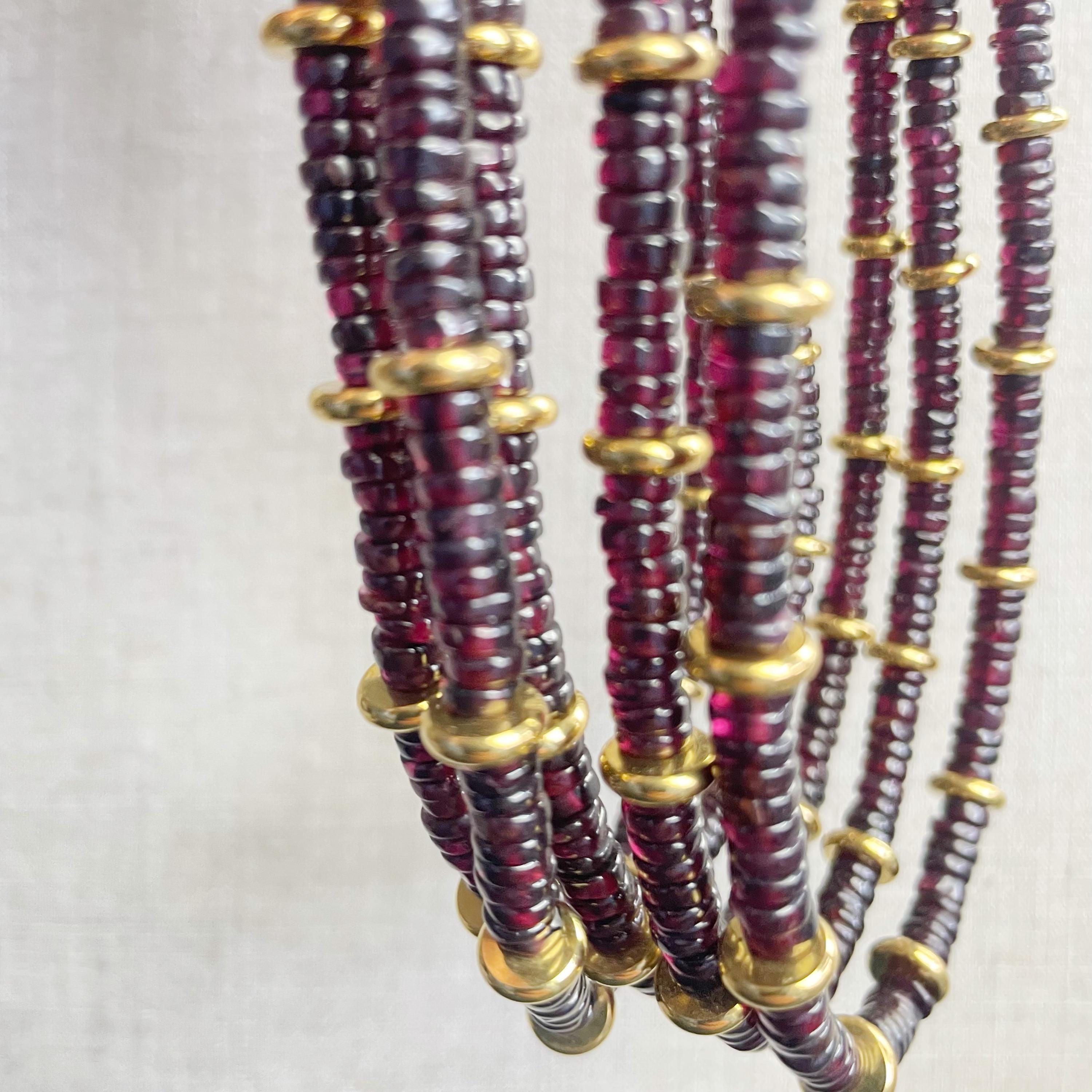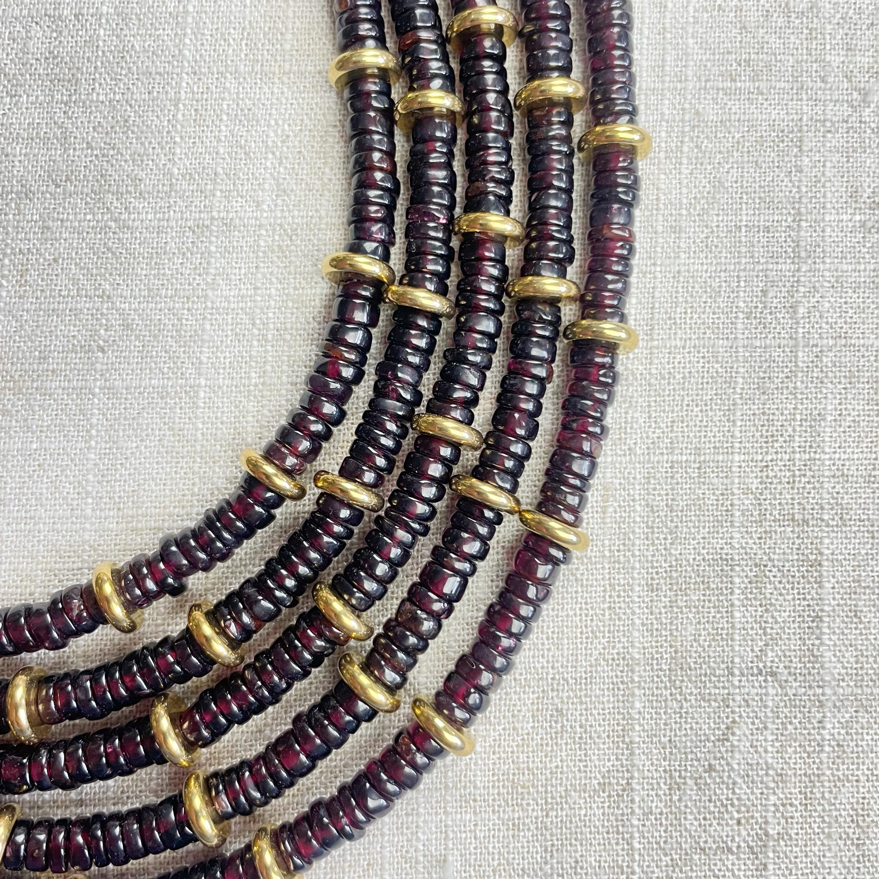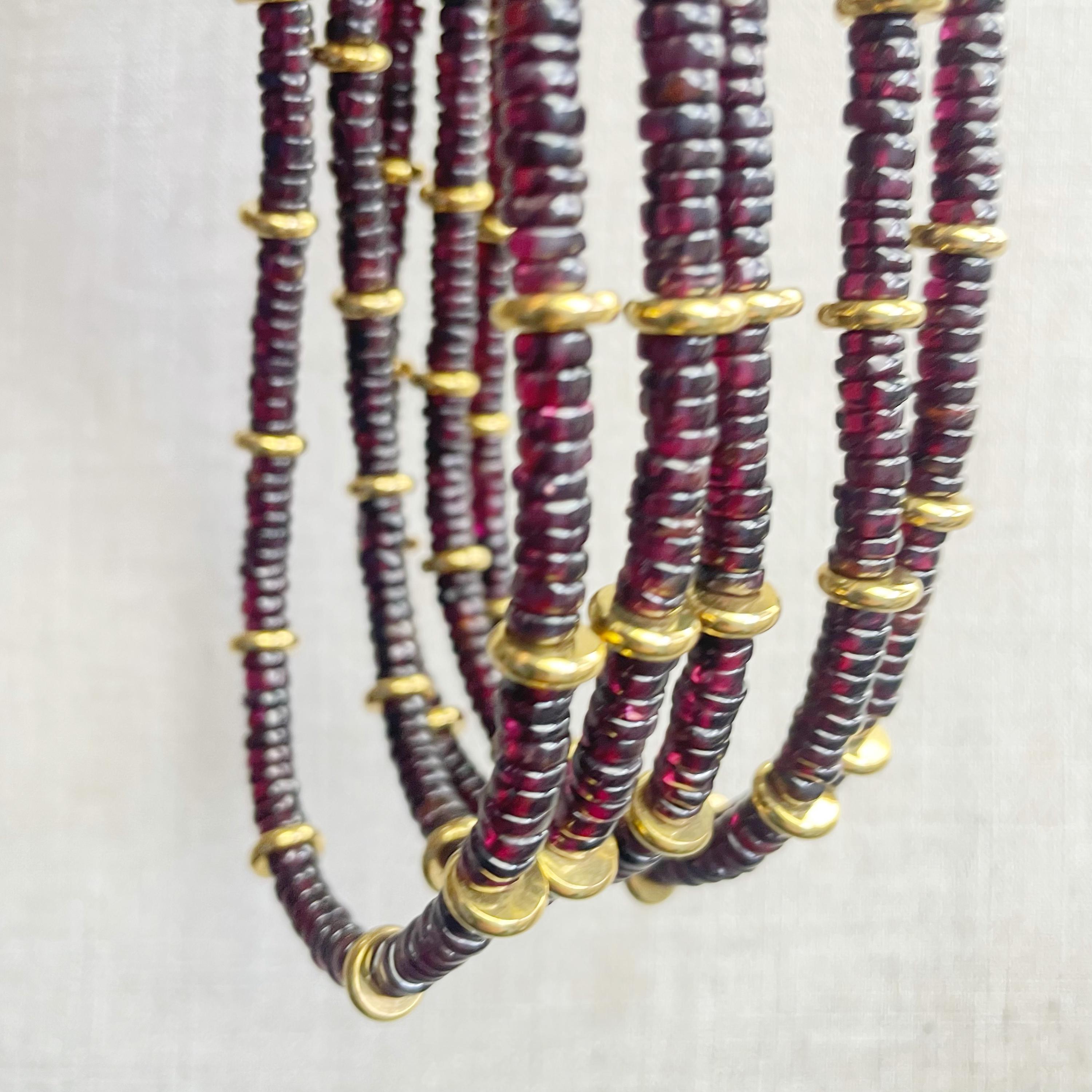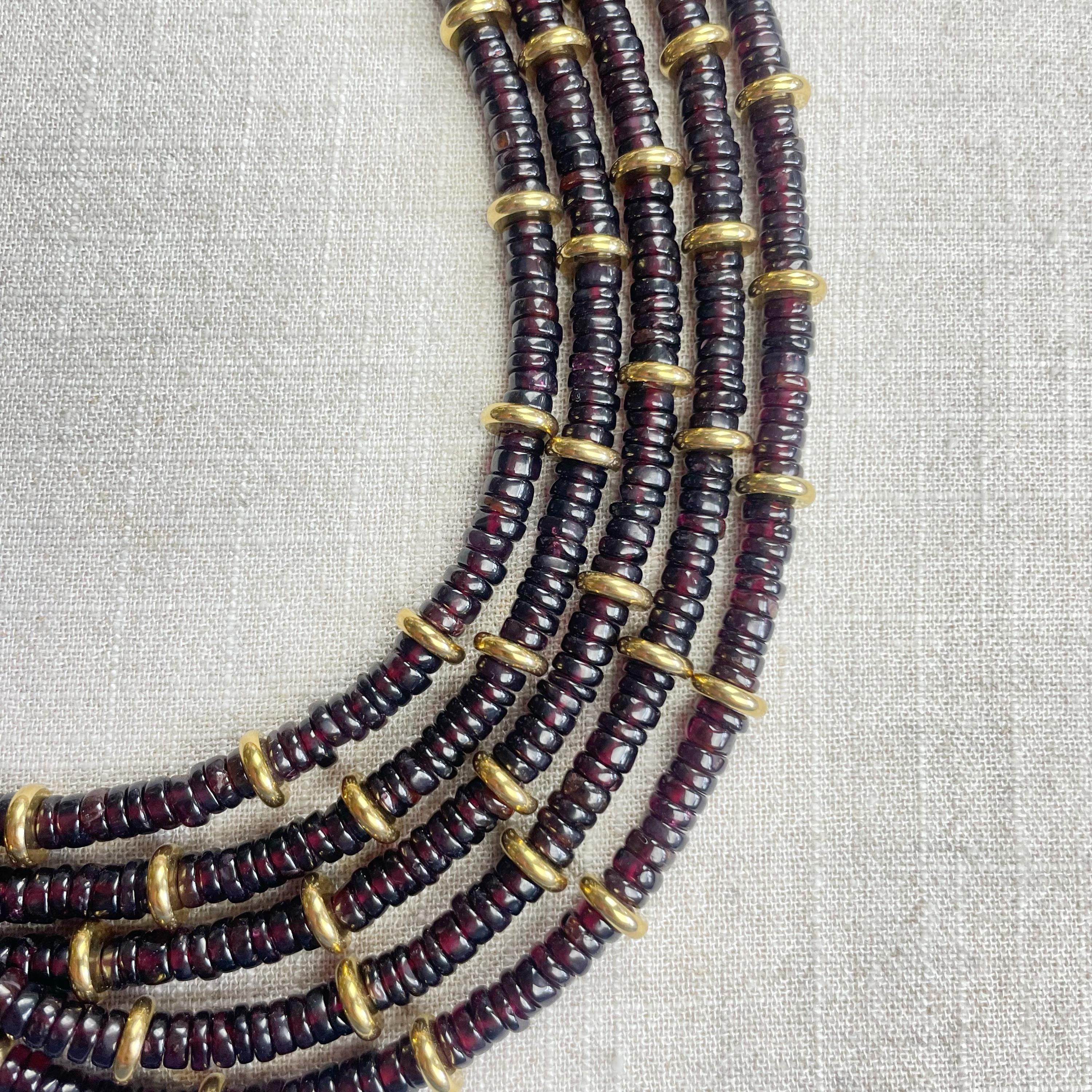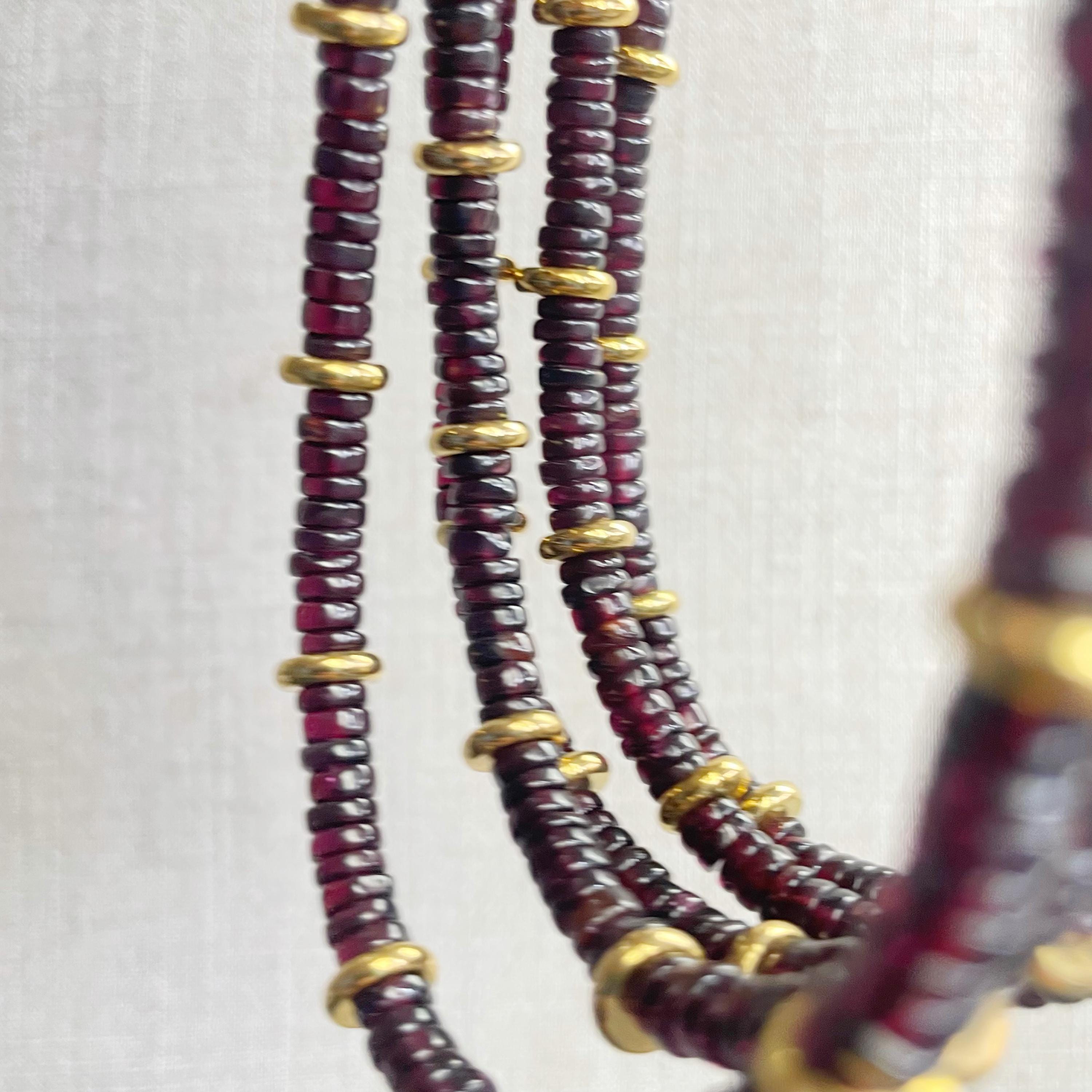 This necklace is made from beautiful garnet beds which are 5mm wide in a heishi (disc) shape. Gold plated stainless steel beads are added between the garnet beads to create a gorgeous necklace. Each necklace is strung on a stainless steel beading wire. The necklace is finished off with a gold plated stainless steel lobster clasp and a logo charm.