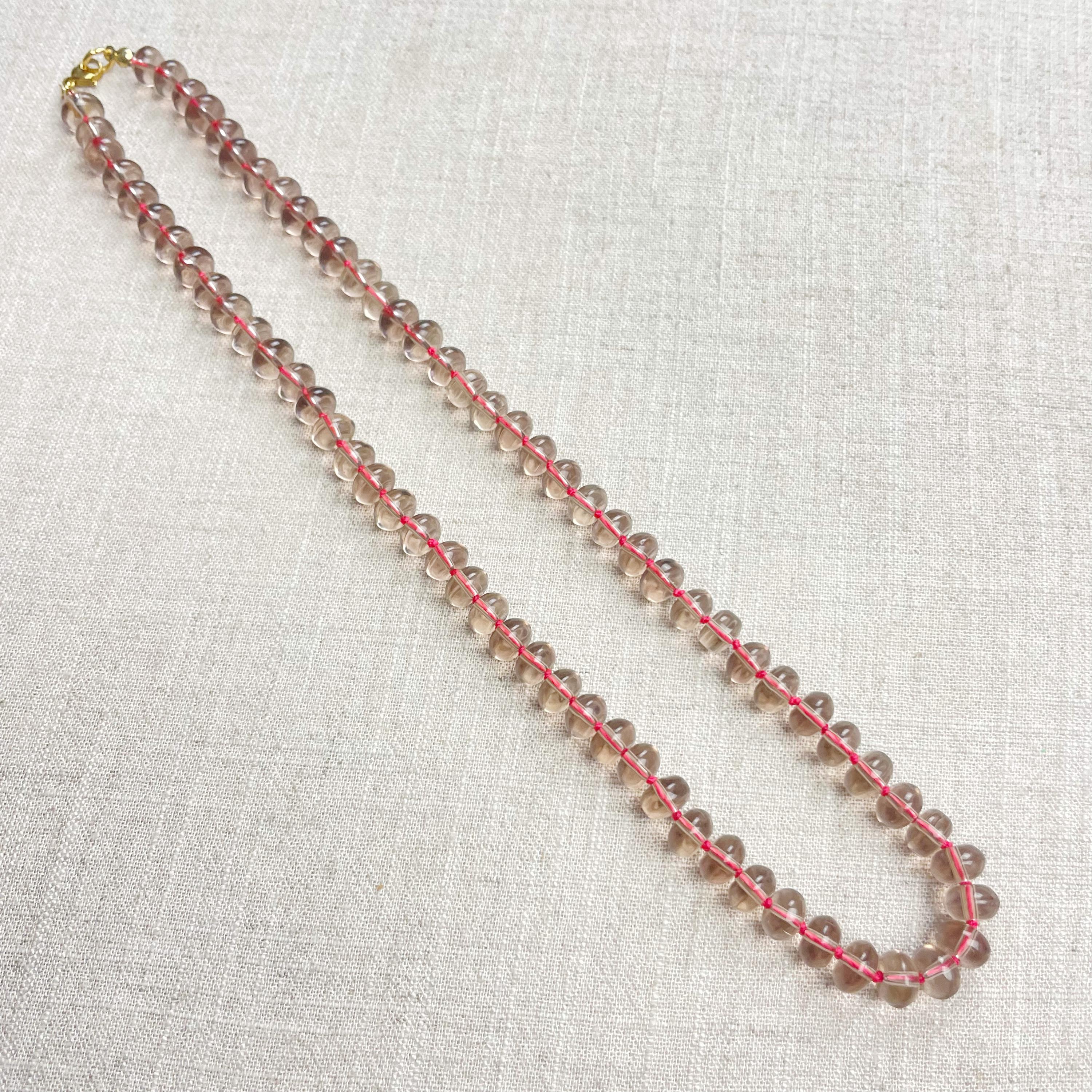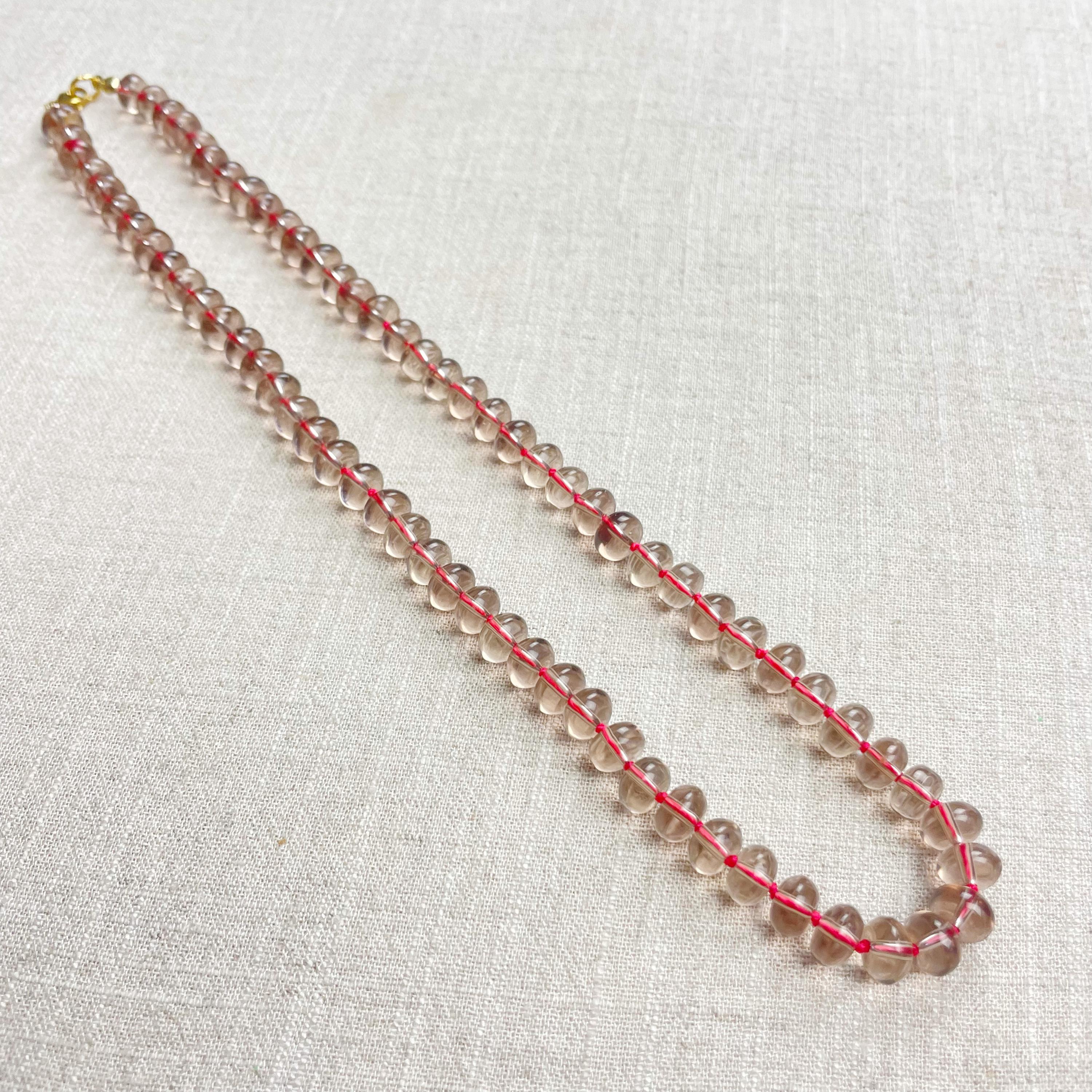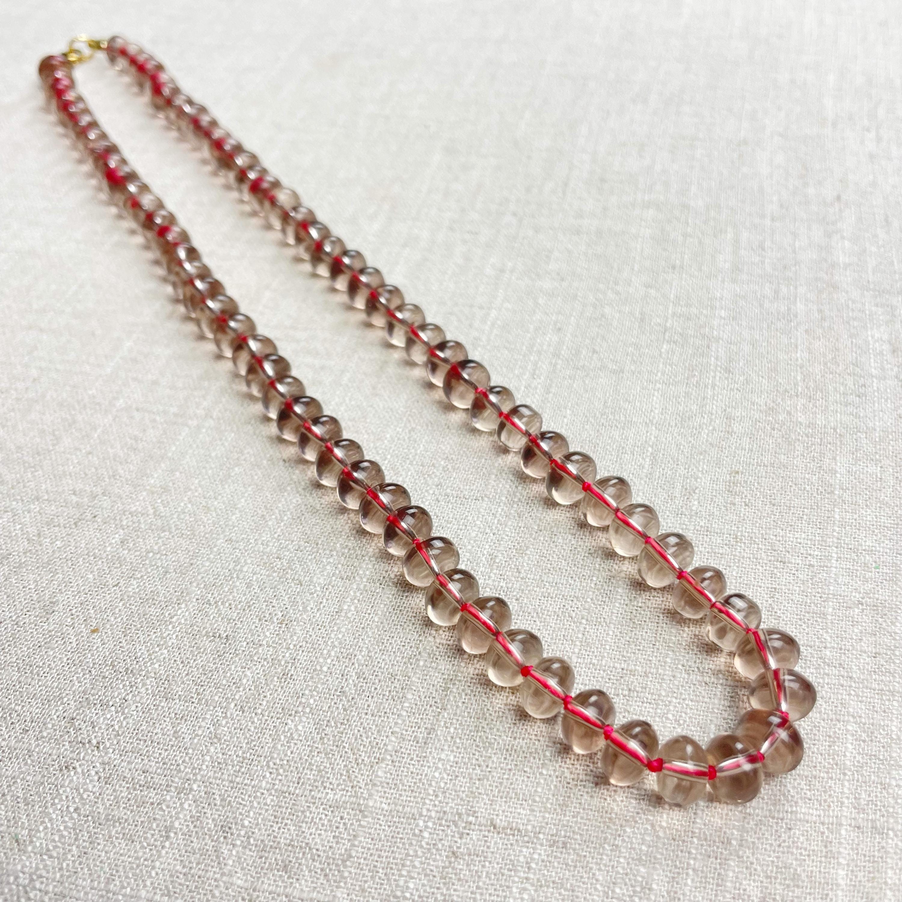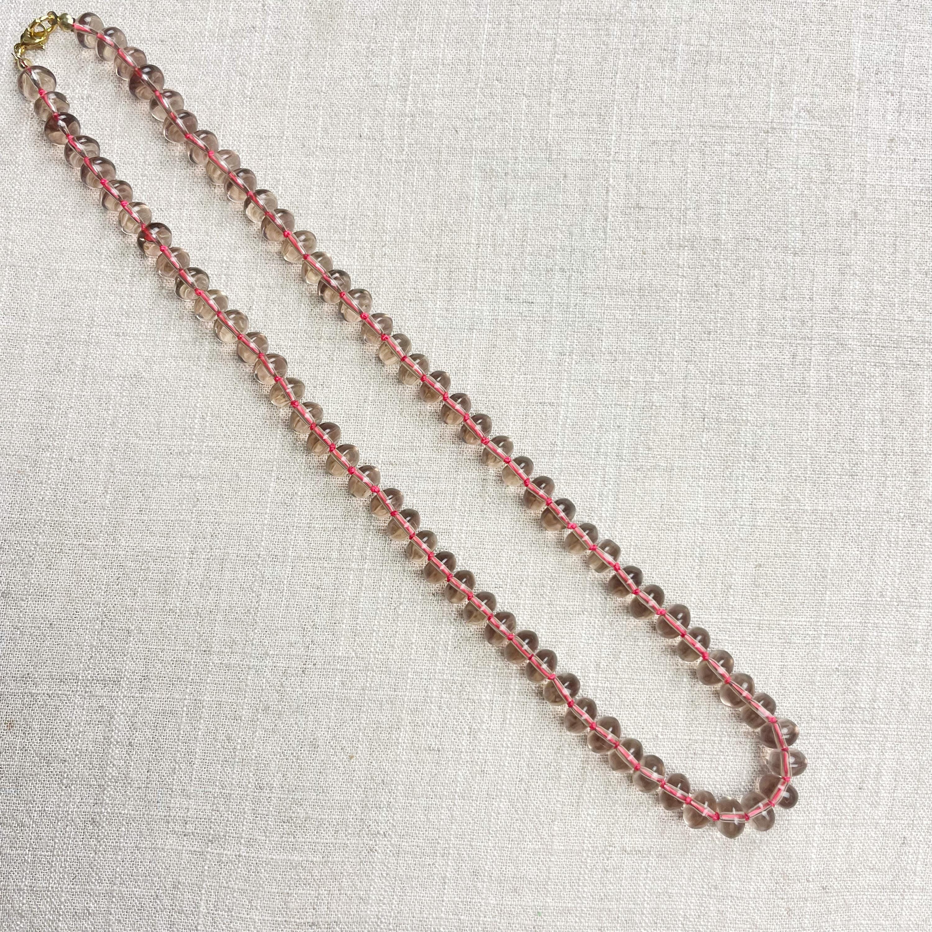 This necklace is made from taupe brown translucent glass beads that are 8mm in size. Each bead is hand knotted with pink 100% nylon cord. The hand knotting in between each beads takes time to do but looks gorgeous making the necklace also very easy to wear. The necklace is finished off with a gold plated stainless steel clasp and logo charm.