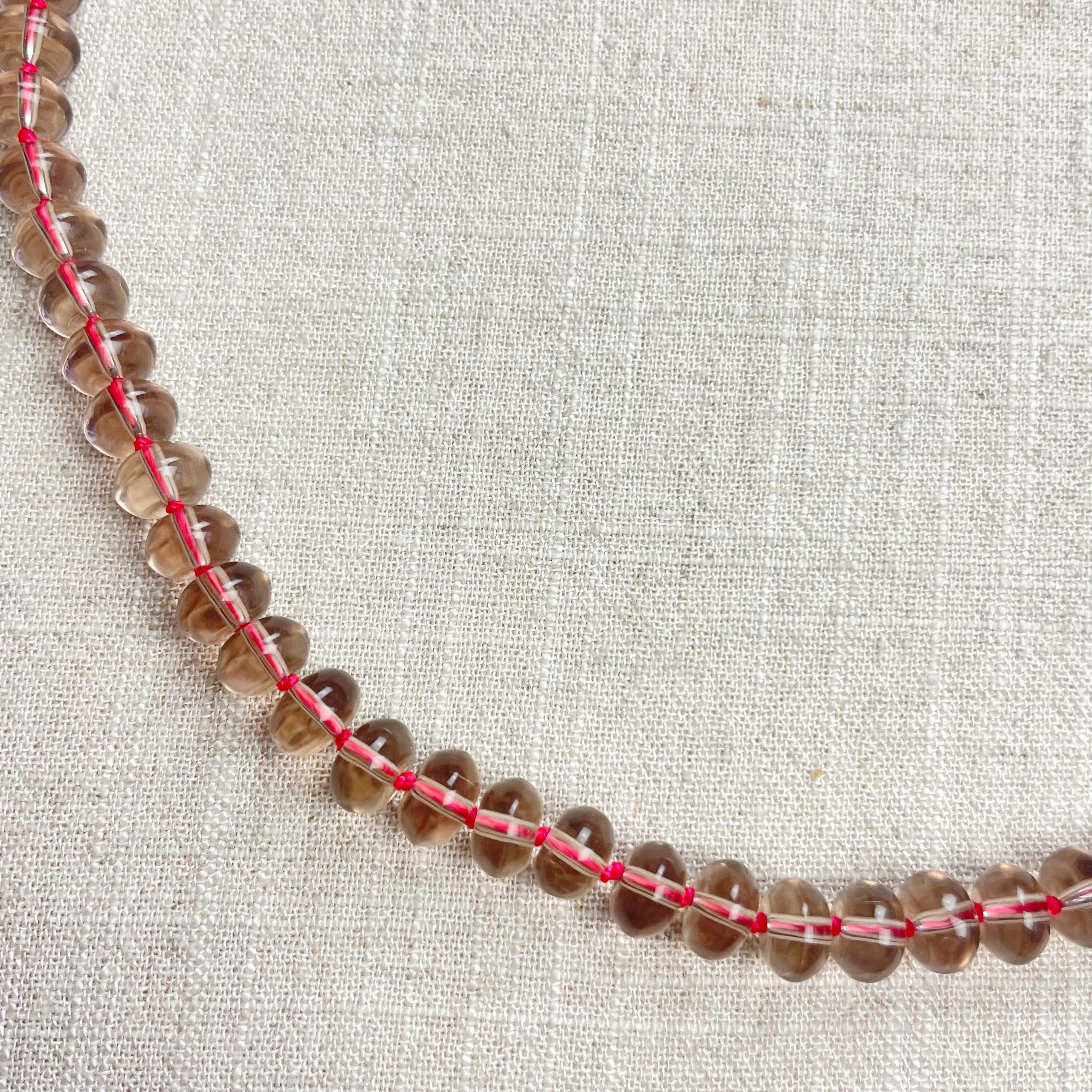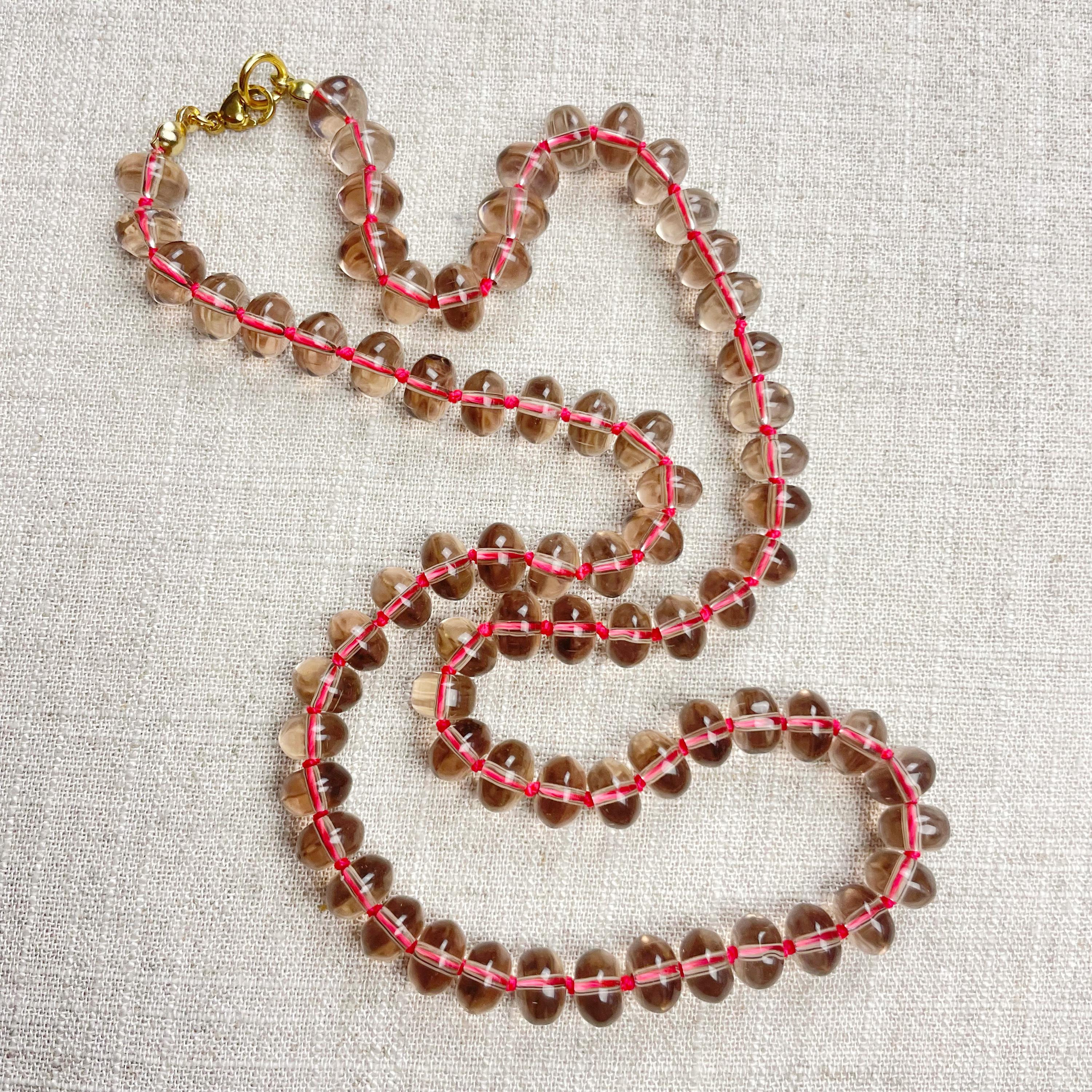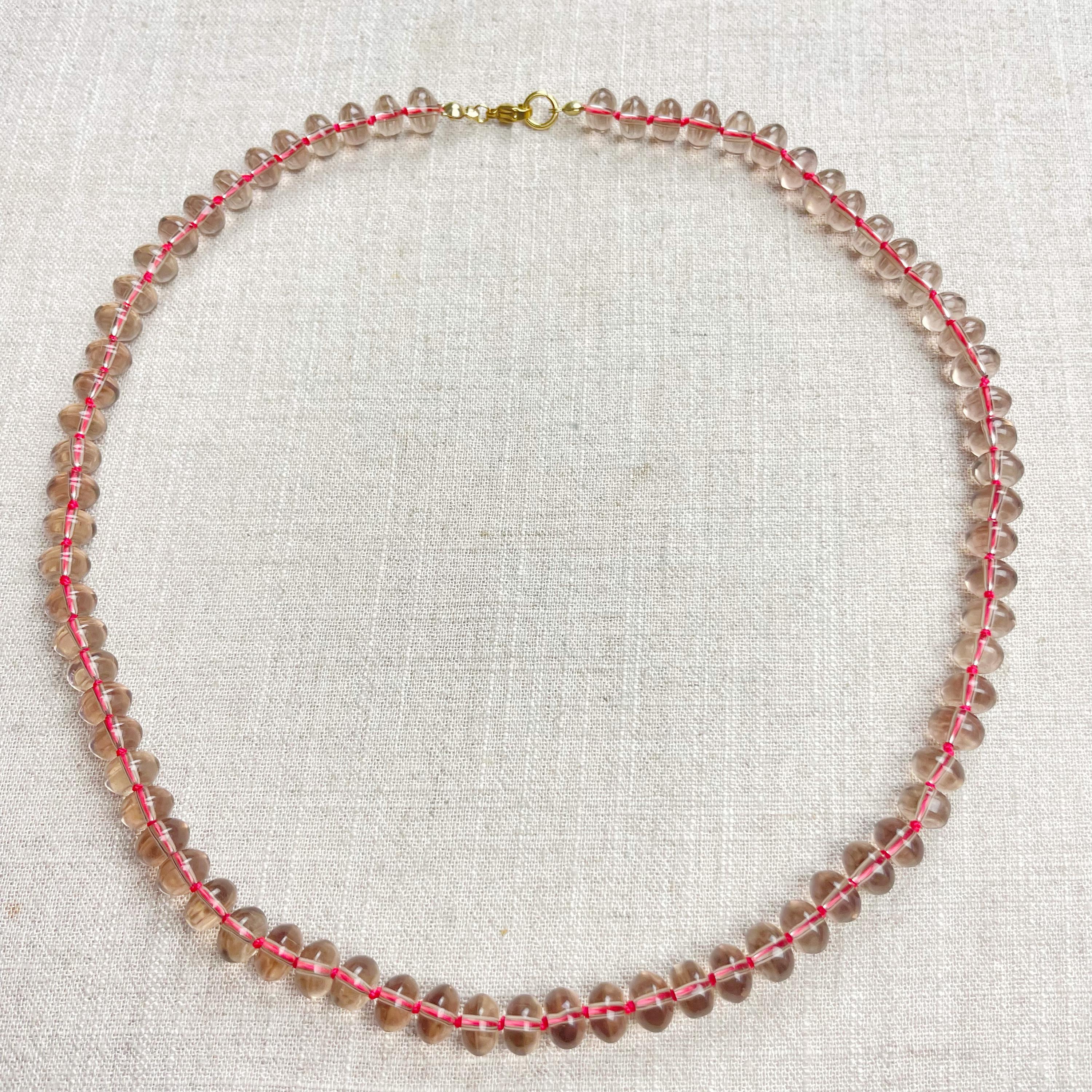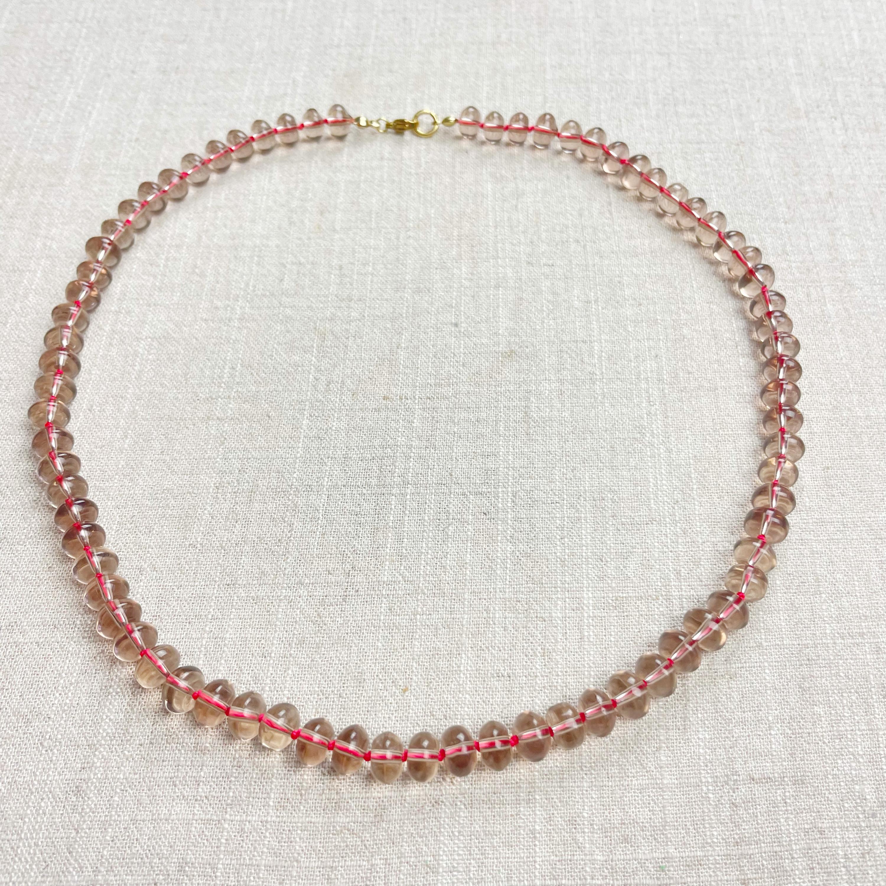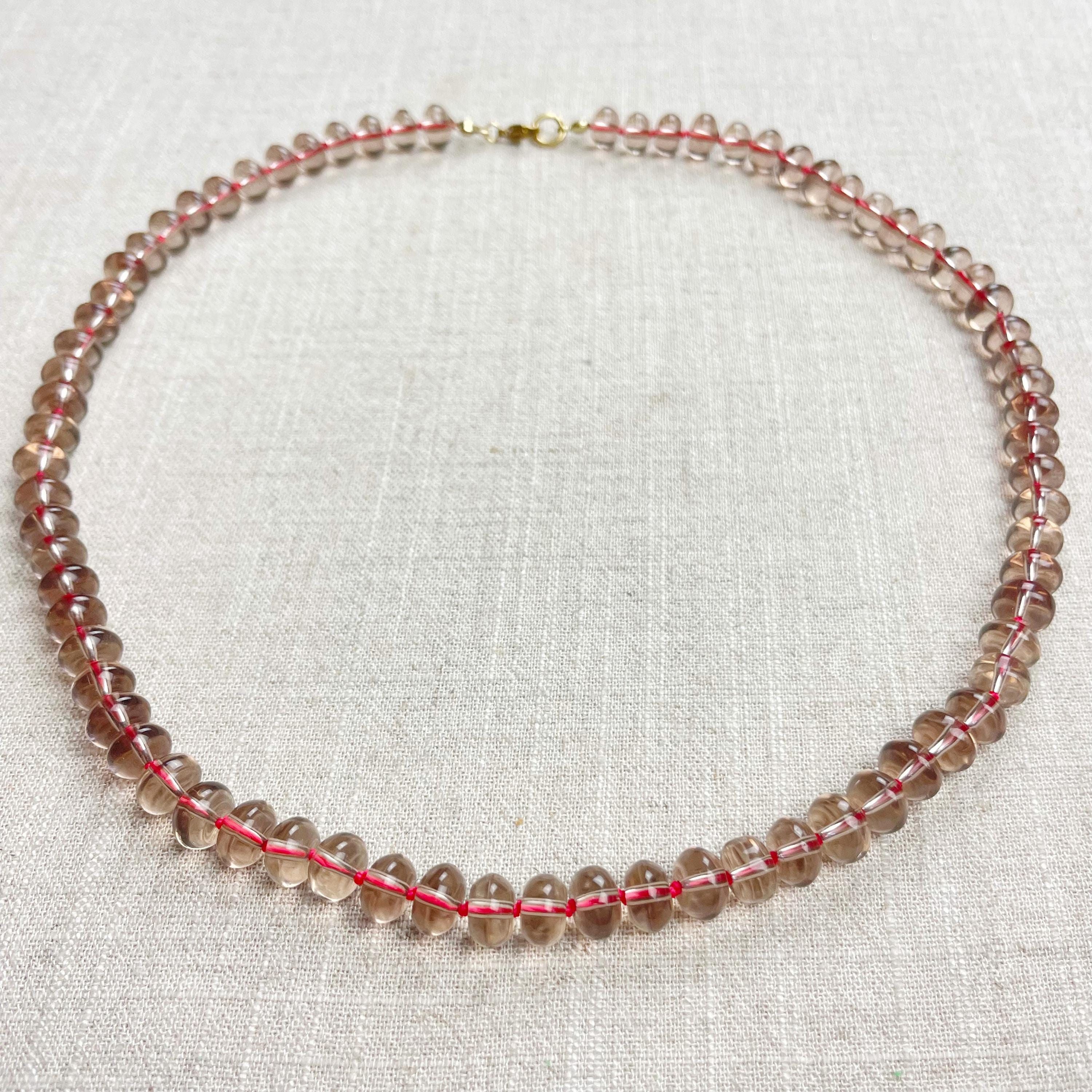 This necklace is made from taupe brown translucent glass beads that are 8mm in size. Each bead is hand knotted with pink 100% nylon cord. The hand knotting in between each beads takes time to do but looks gorgeous making the necklace also very easy to wear. The necklace is finished off with a gold plated stainless steel clasp and logo charm.