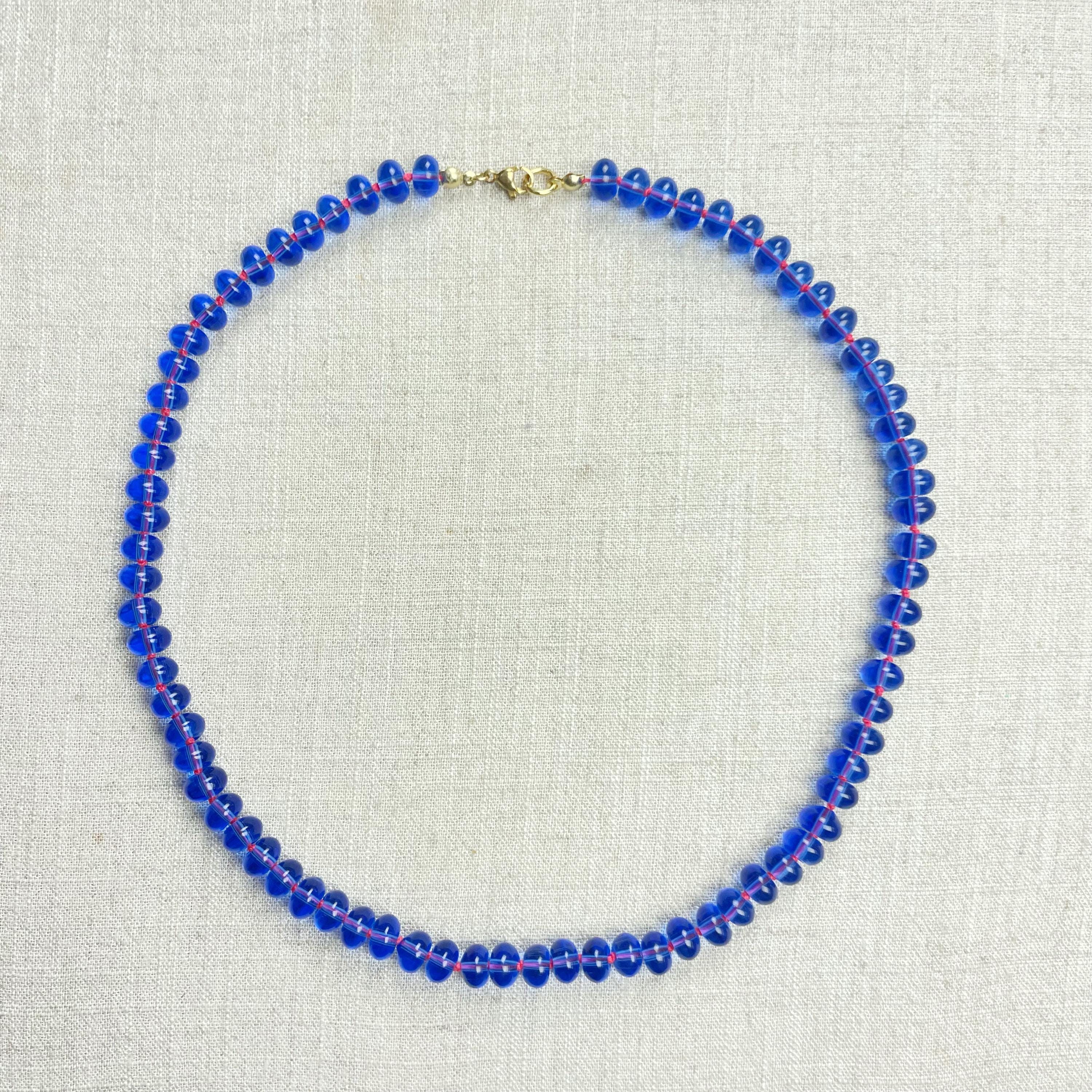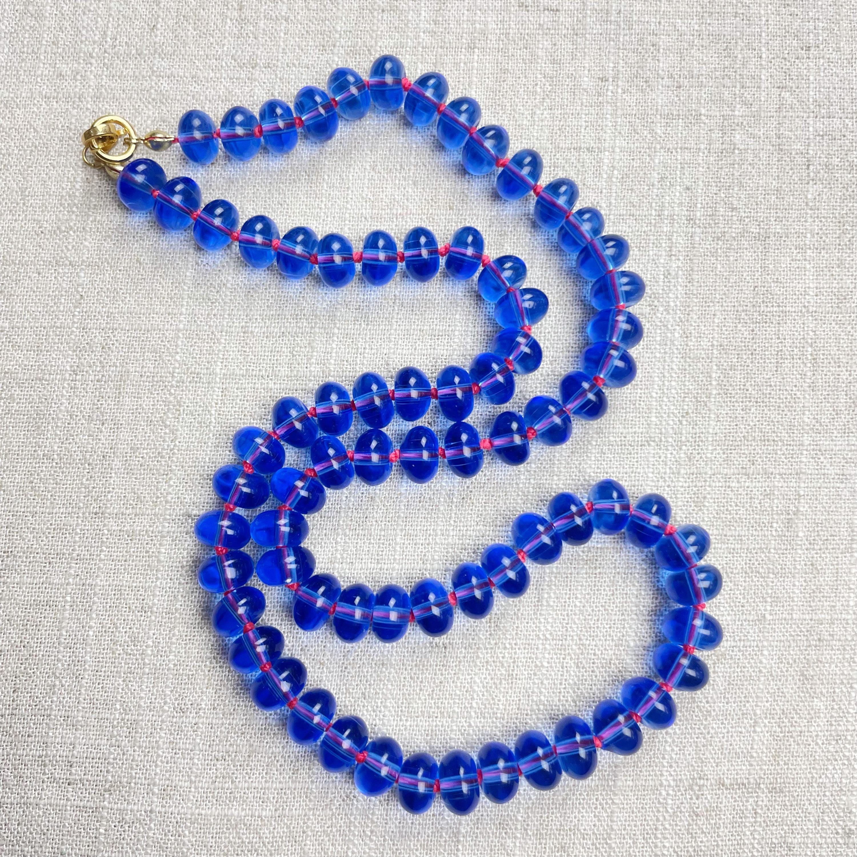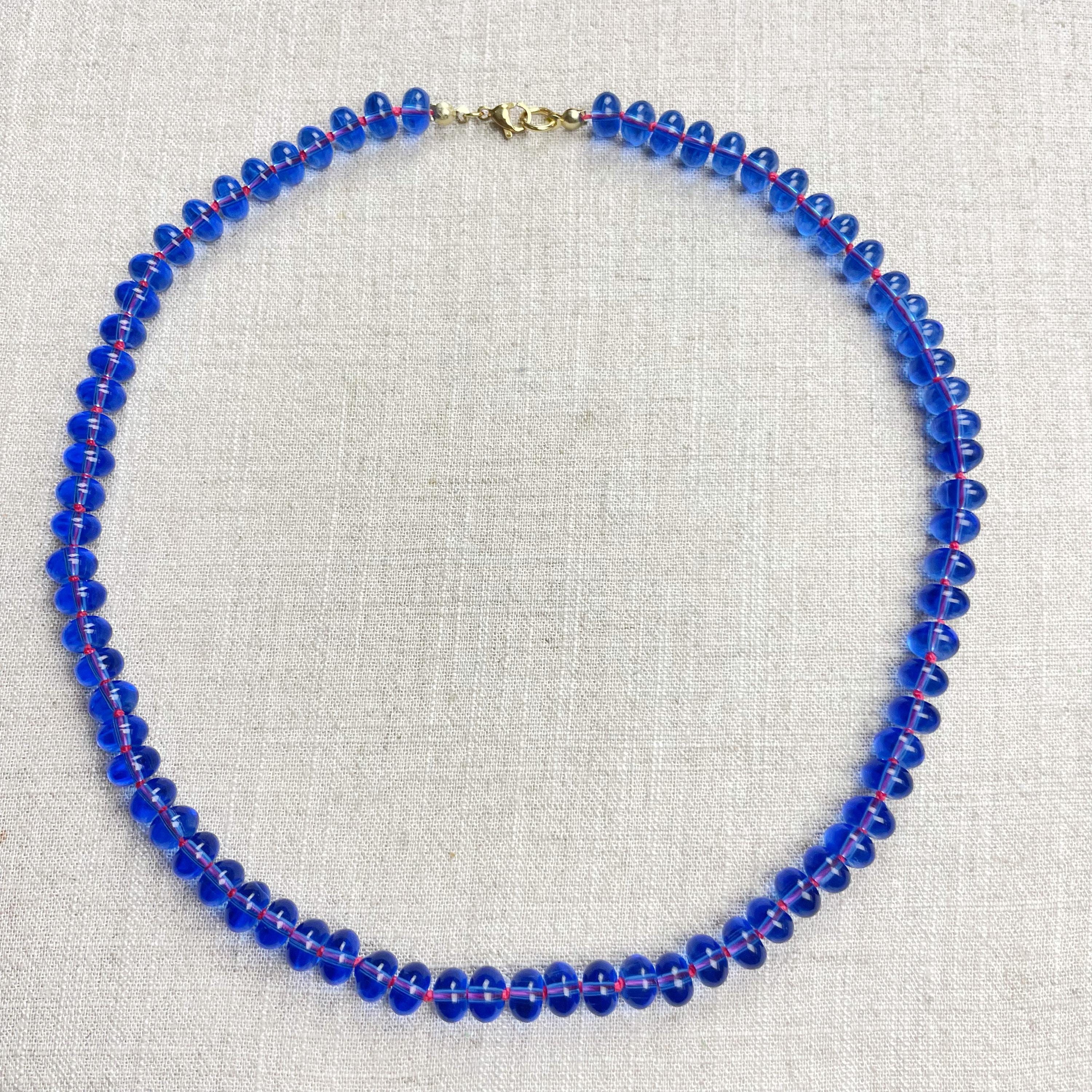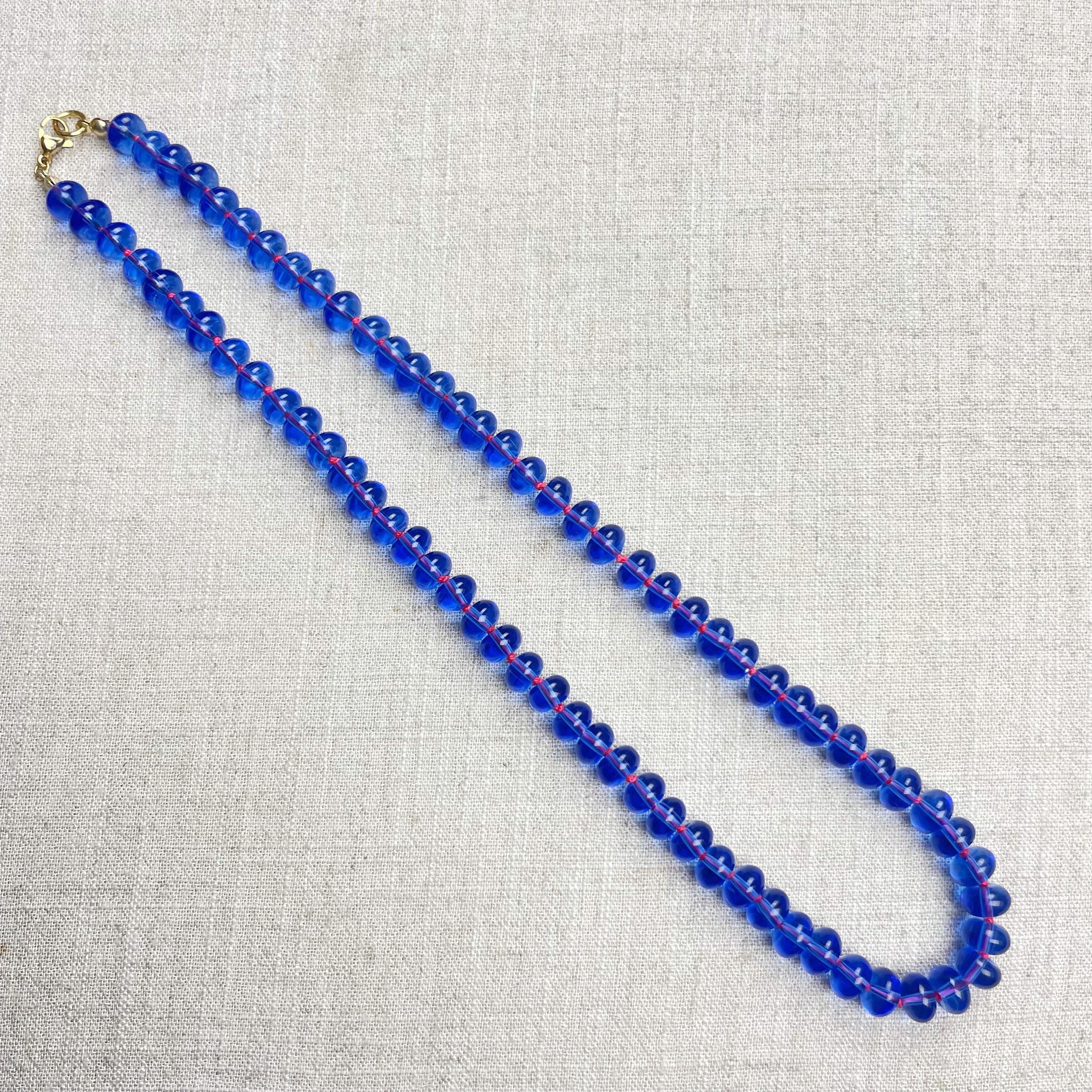 This necklace is made from navy blue translucent glass beads that are 8mm in size. Each bead is hand knotted with pink 100% nylon cord. The hand knotting in between each beads takes time to do but looks gorgeous making the necklace also very easy to wear. The necklace is finished off with a gold plated stainless steel clasp and logo charm.