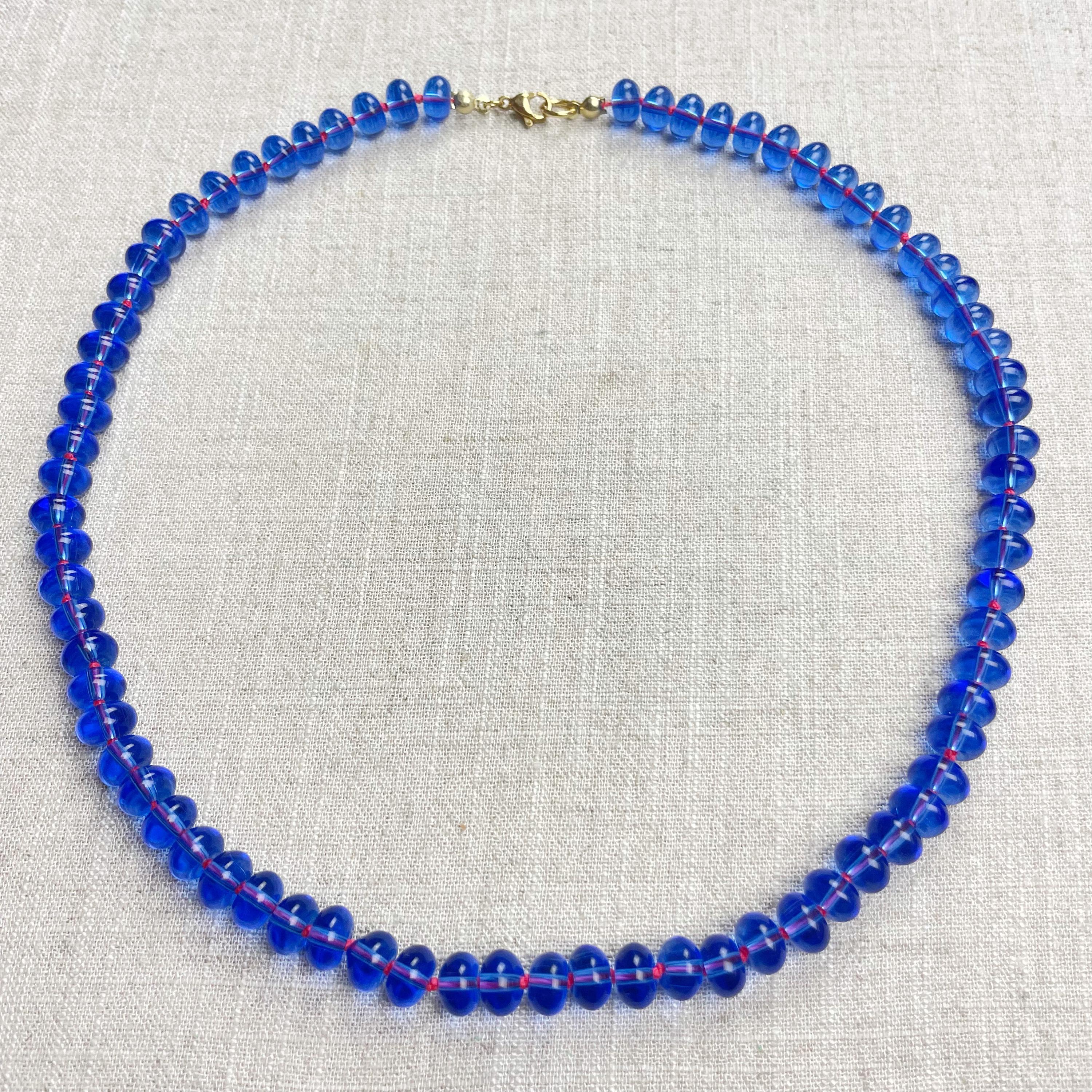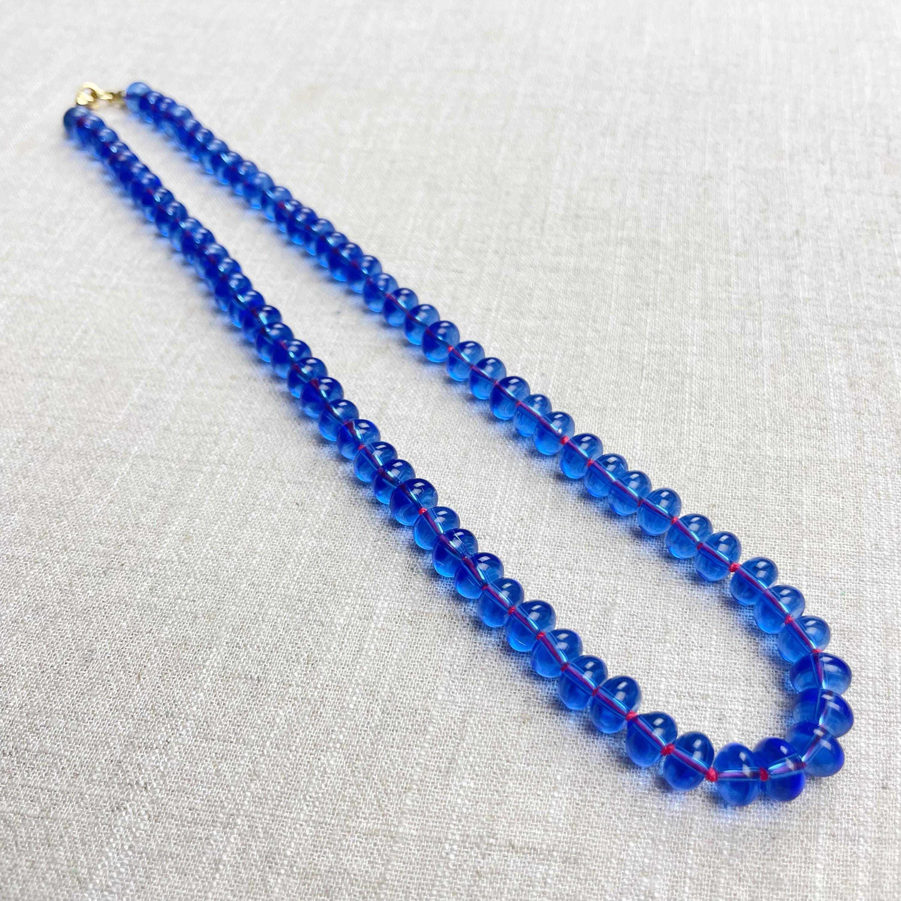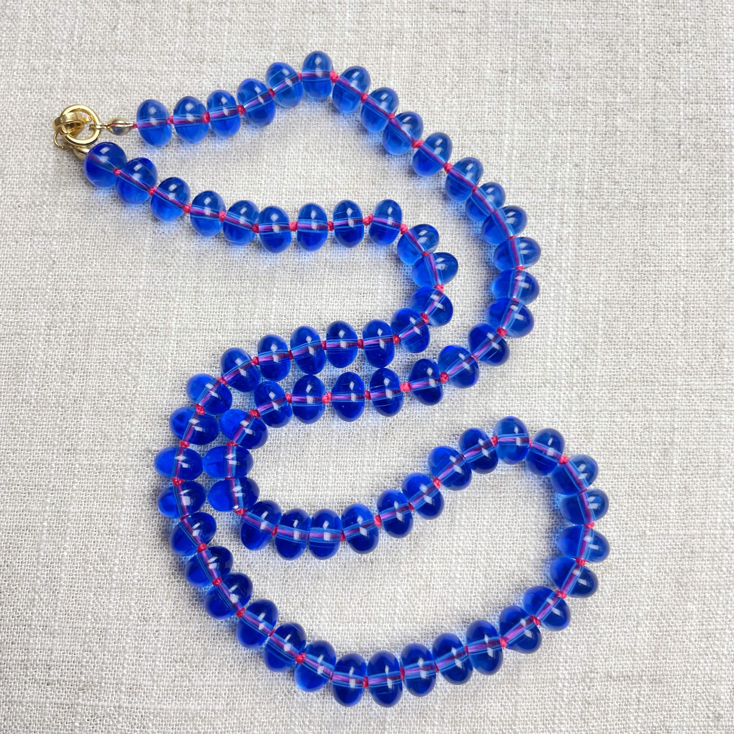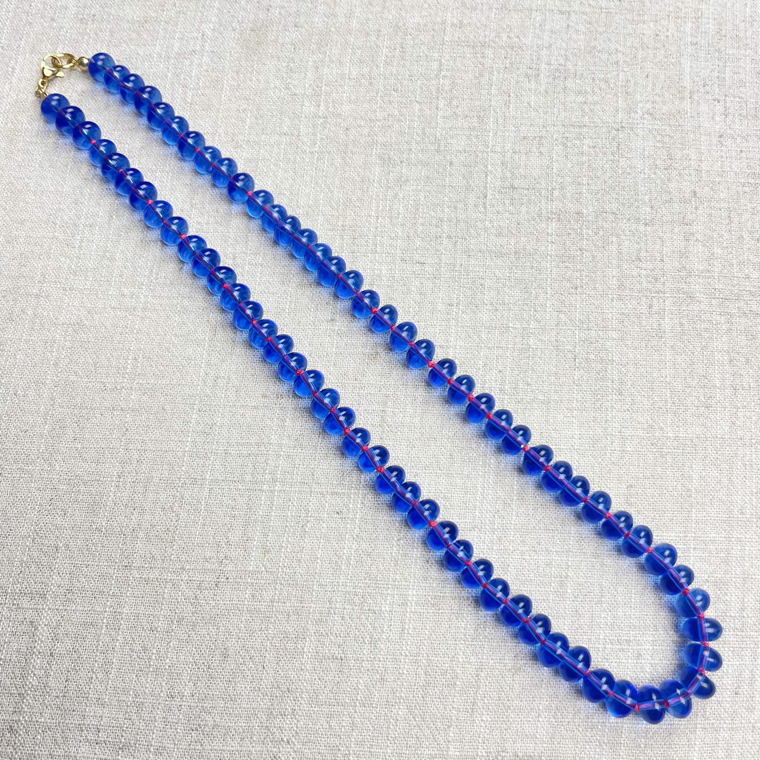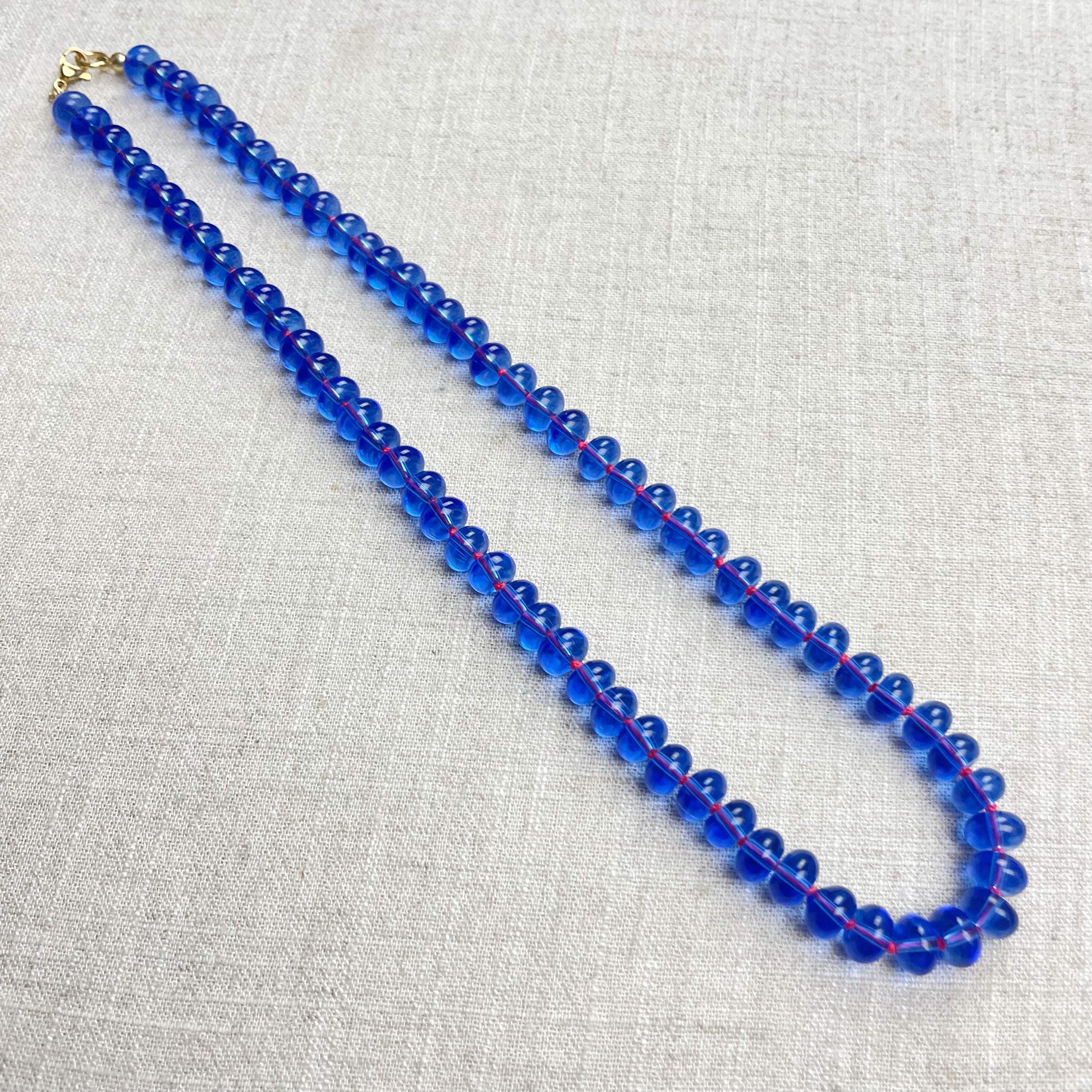 This necklace is made from navy blue translucent glass beads that are 8mm in size. Each bead is hand knotted with pink 100% nylon cord. The hand knotting in between each beads takes time to do but looks gorgeous making the necklace also very easy to wear. The necklace is finished off with a gold plated stainless steel clasp and logo charm.