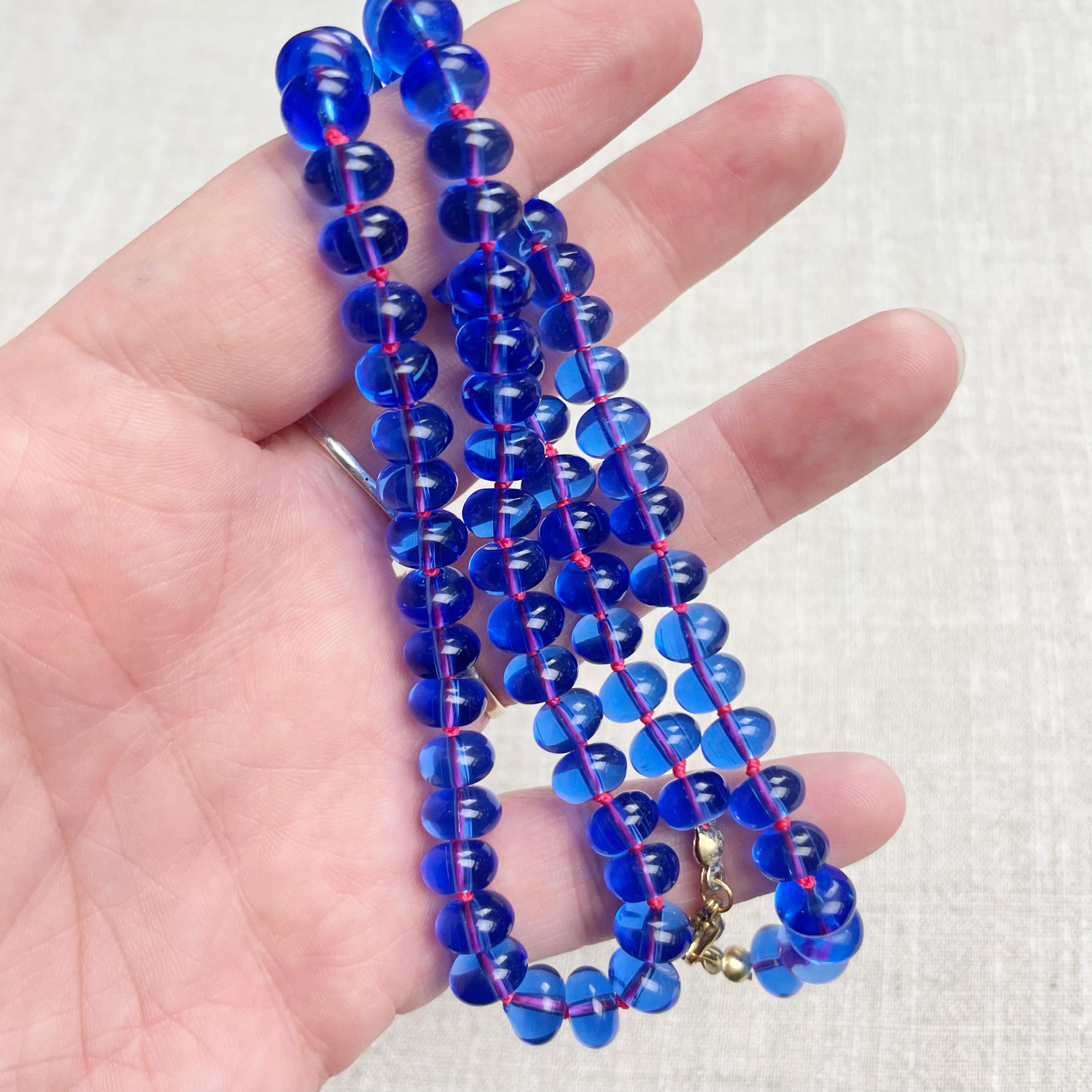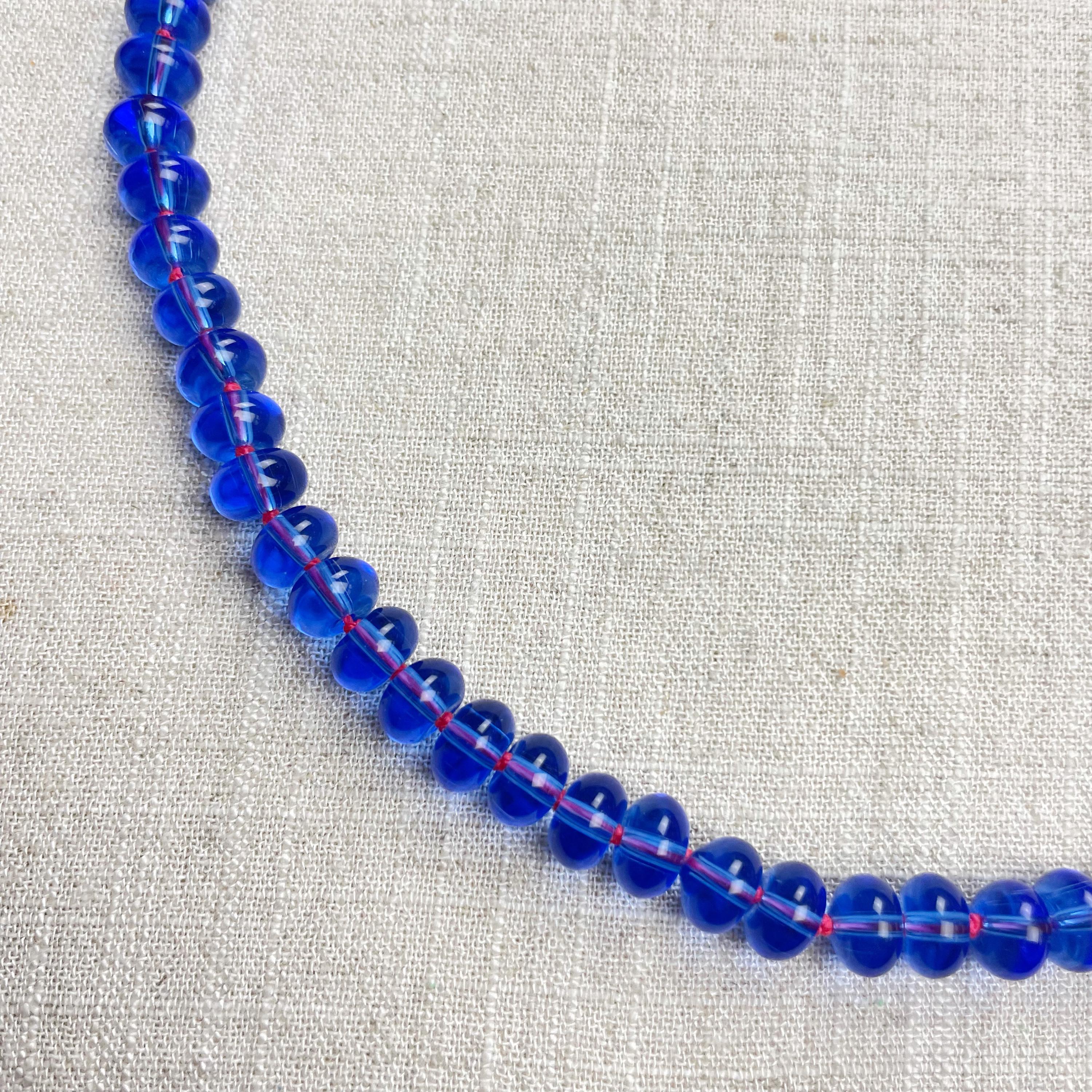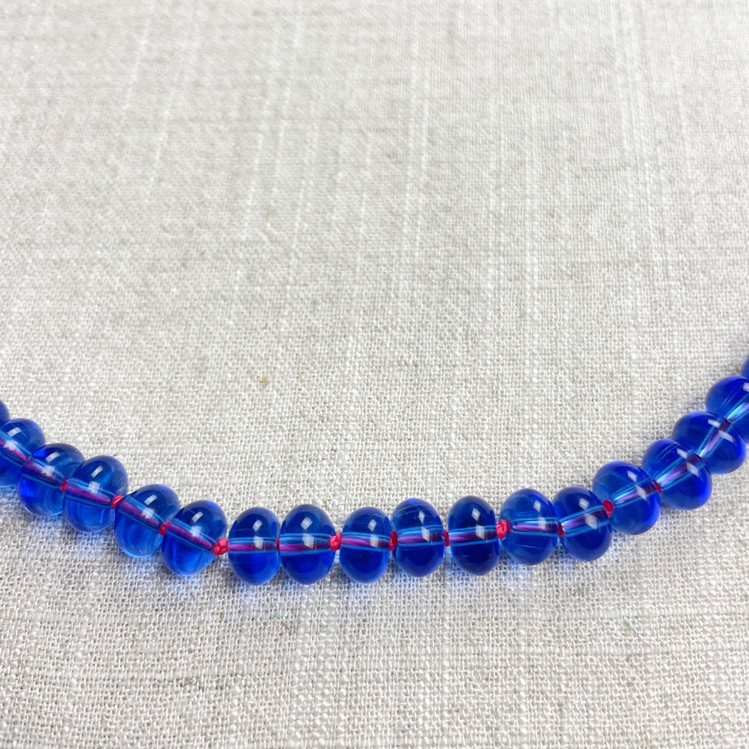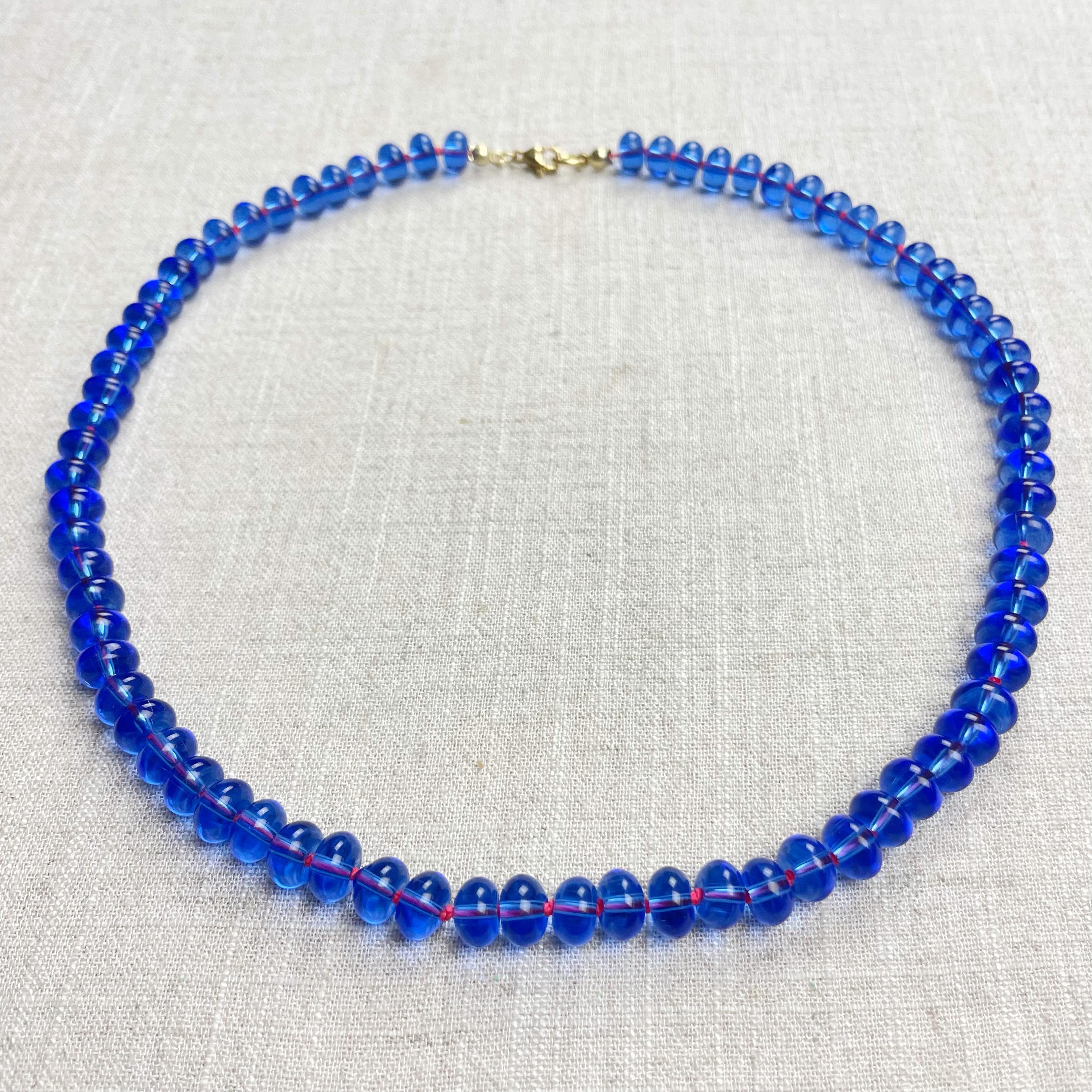 This necklace is made from navy blue translucent glass beads that are 8mm in size. Each bead is hand knotted with pink 100% nylon cord. The hand knotting in between each beads takes time to do but looks gorgeous making the necklace also very easy to wear. The necklace is finished off with a gold plated stainless steel clasp and logo charm.