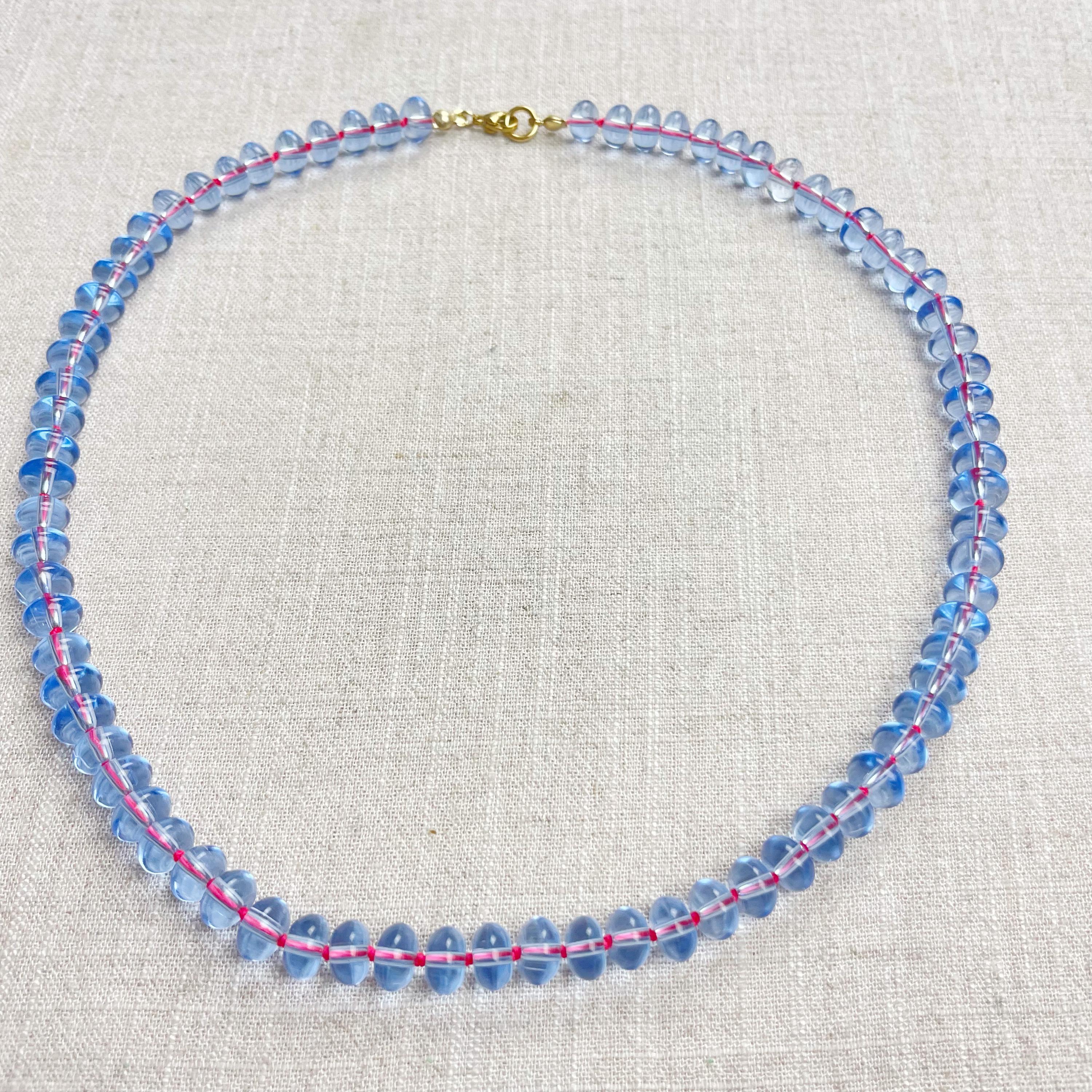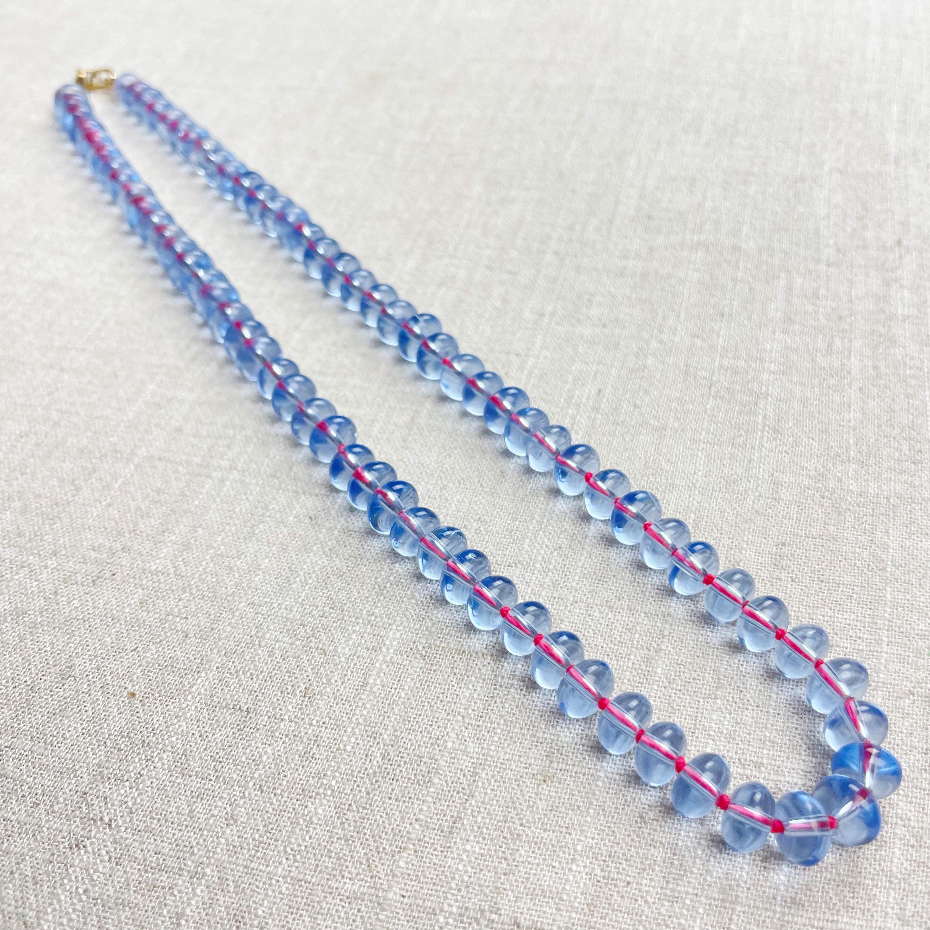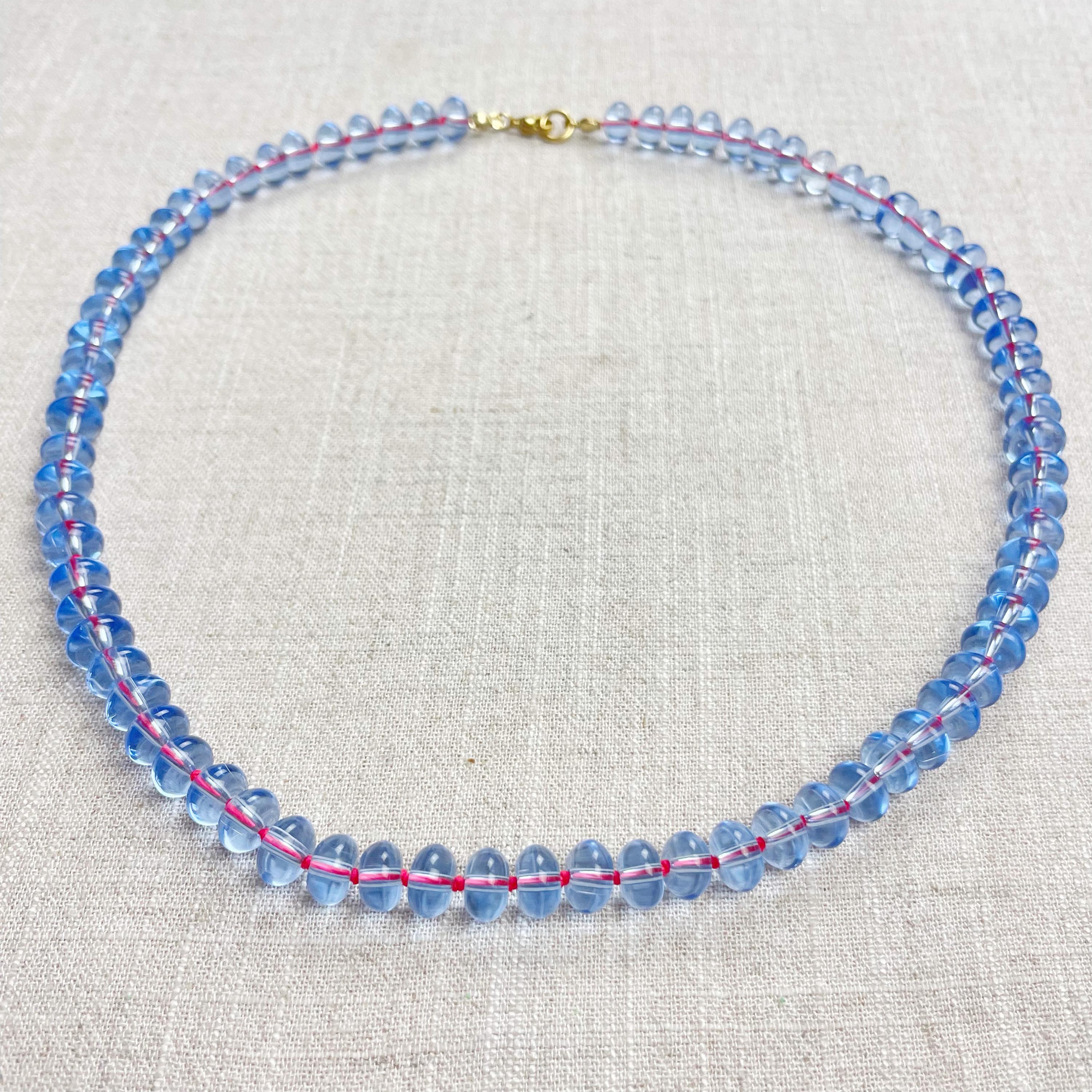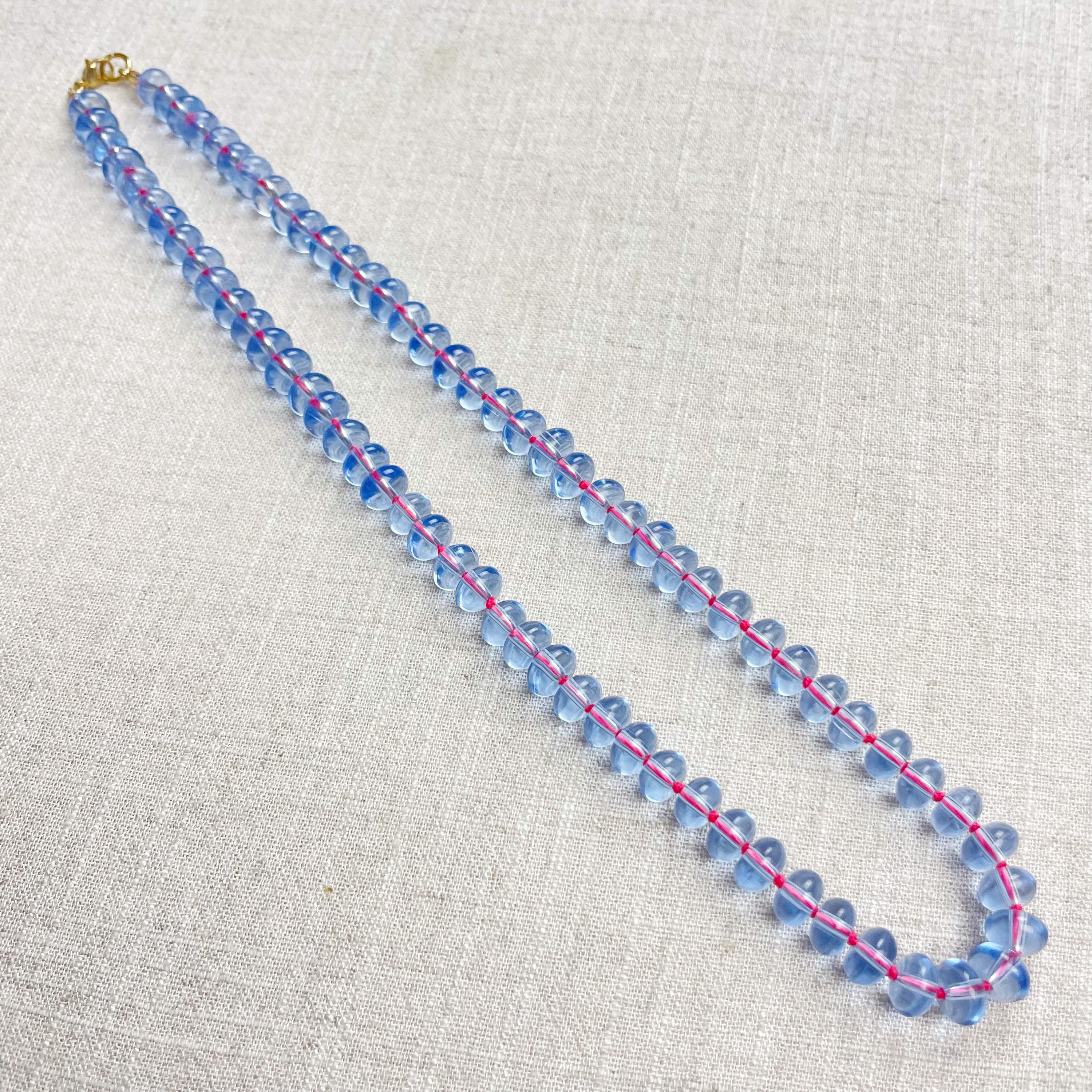 This necklace is made from periwinkle blue translucent glass beads that are 8mm in size. Each bead is hand knotted with pink 100% nylon cord. The hand knotting in between each beads takes time to do but looks gorgeous making the necklace also very easy to wear. The necklace is finished off with a gold plated stainless steel clasp and logo charm.