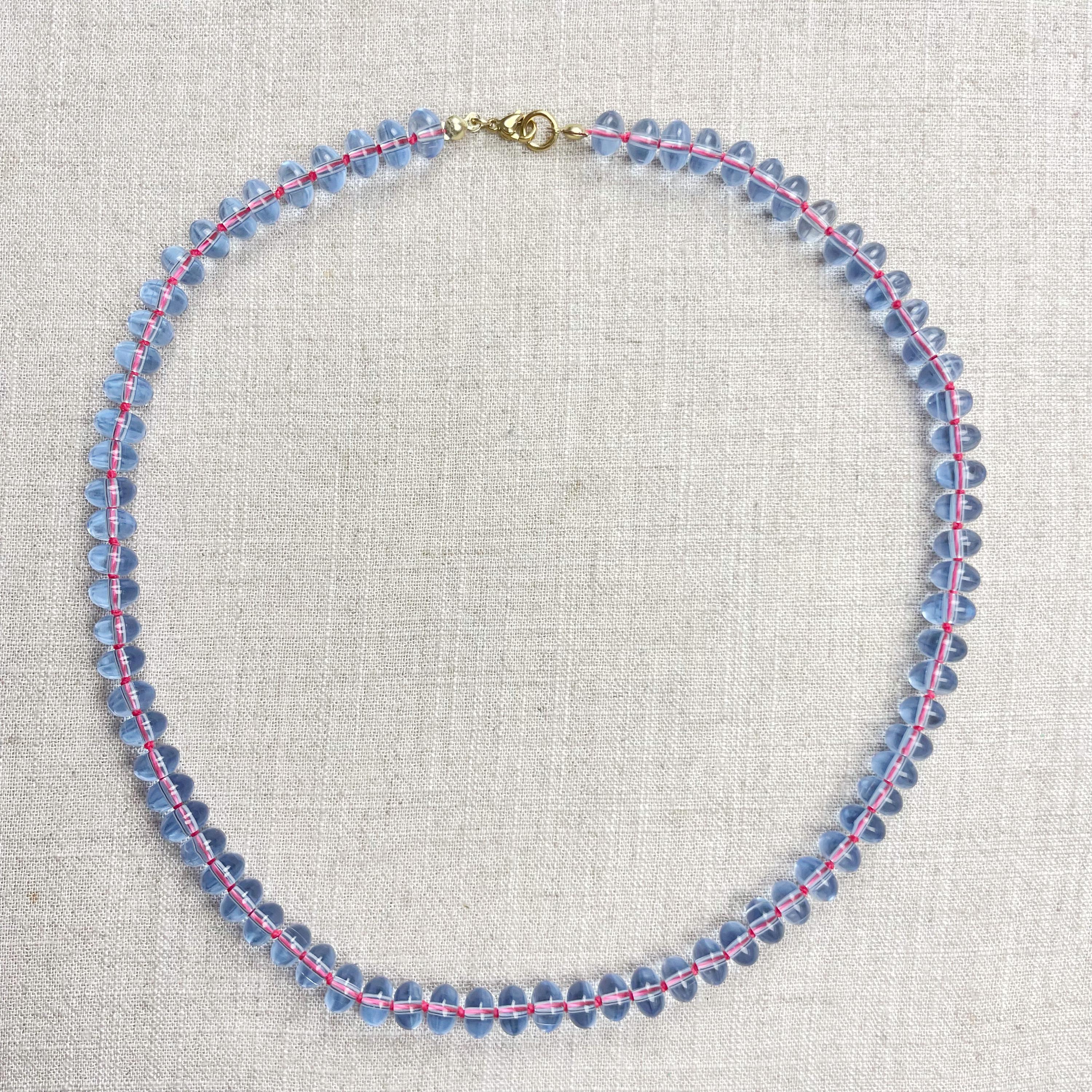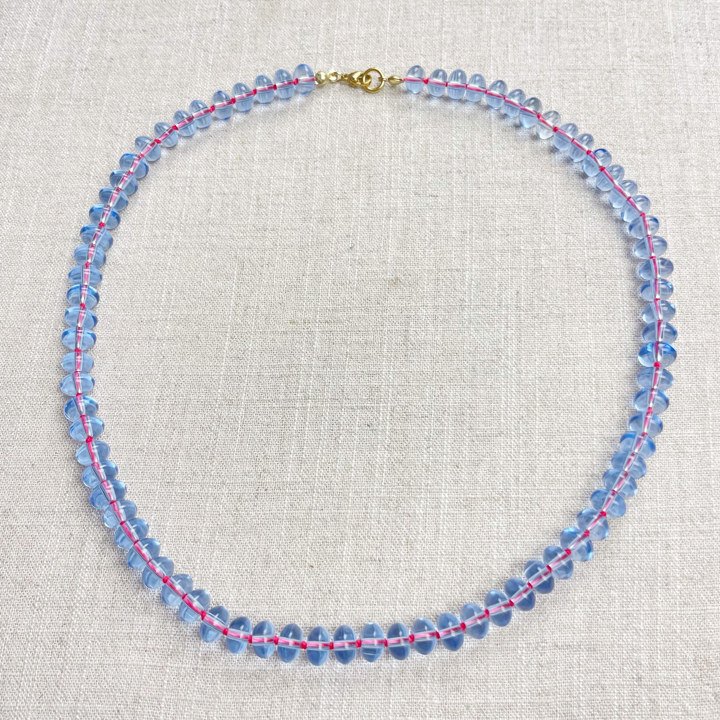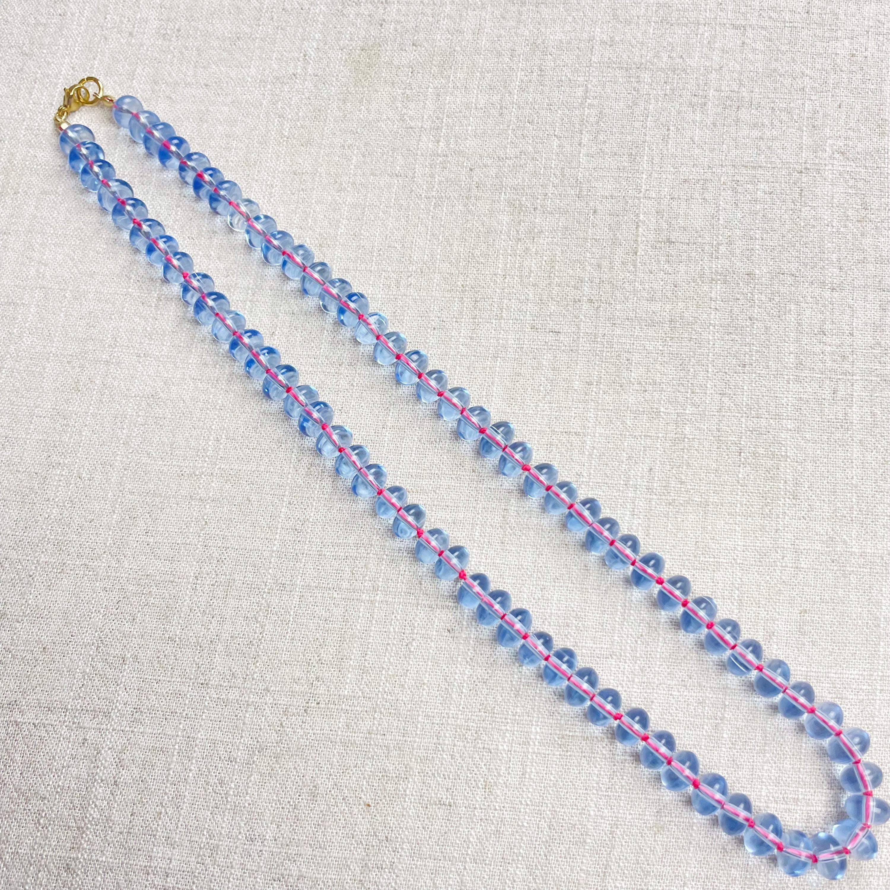 This necklace is made from periwinkle blue translucent glass beads that are 8mm in size. Each bead is hand knotted with pink 100% nylon cord. The hand knotting in between each beads takes time to do but looks gorgeous making the necklace also very easy to wear. The necklace is finished off with a gold plated stainless steel clasp and logo charm.