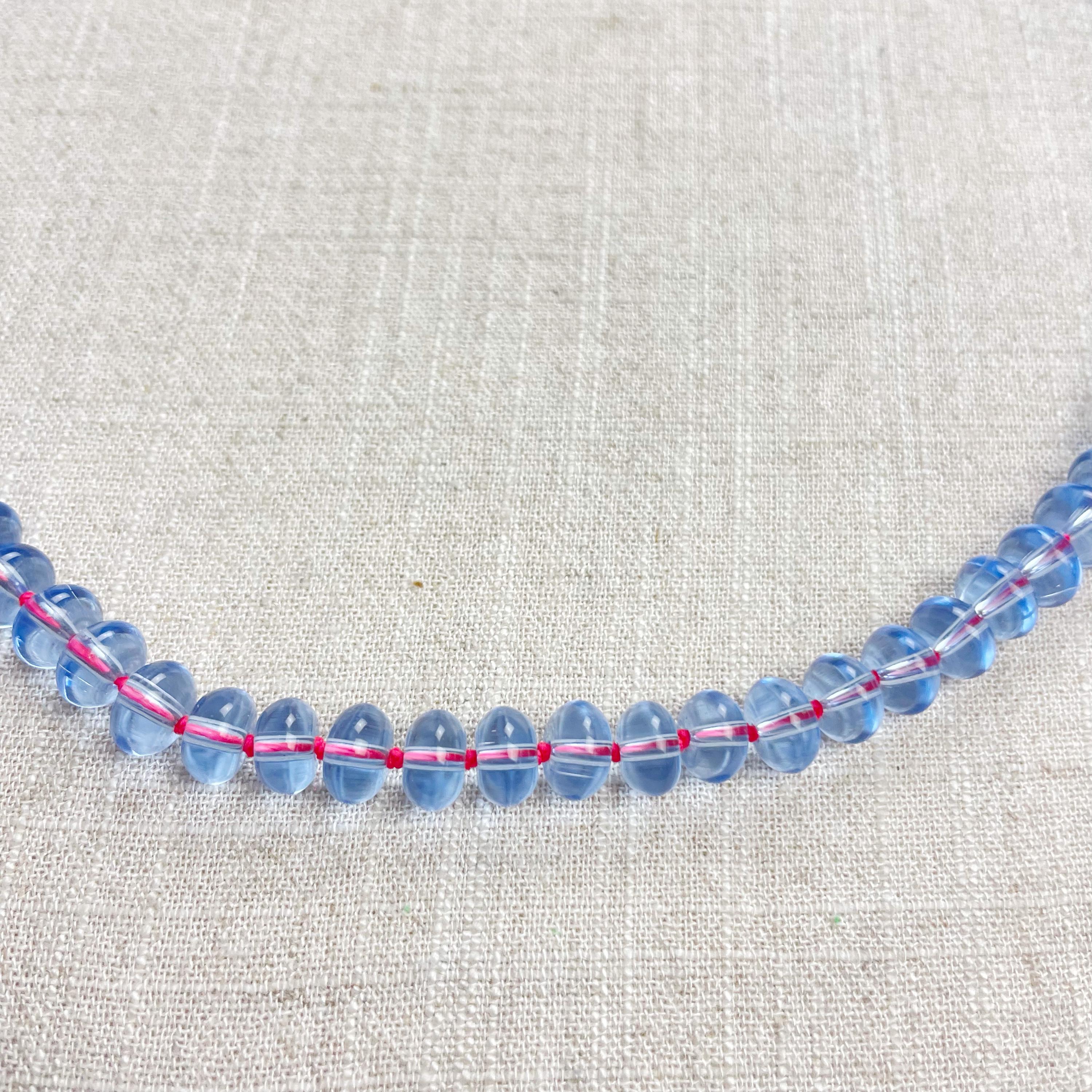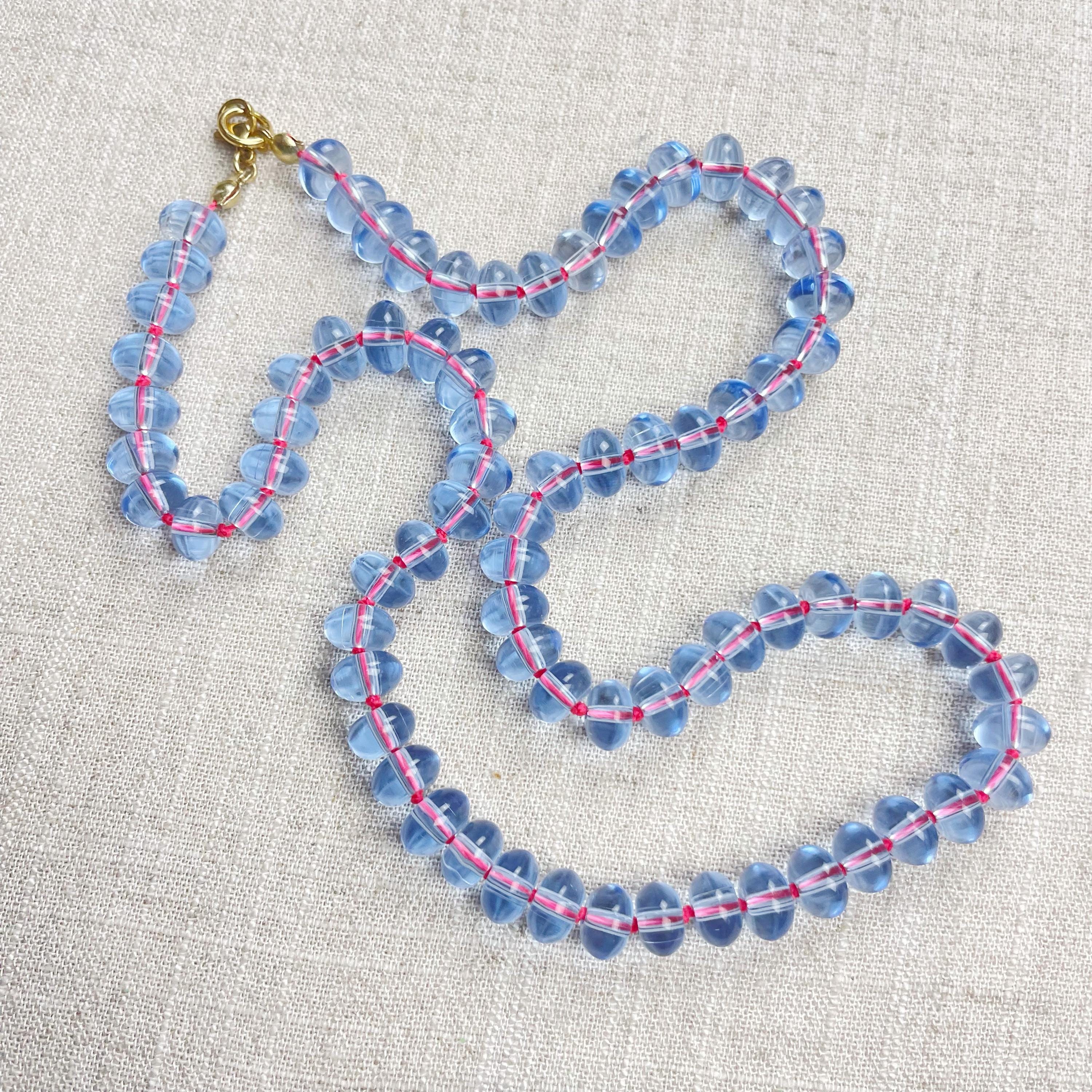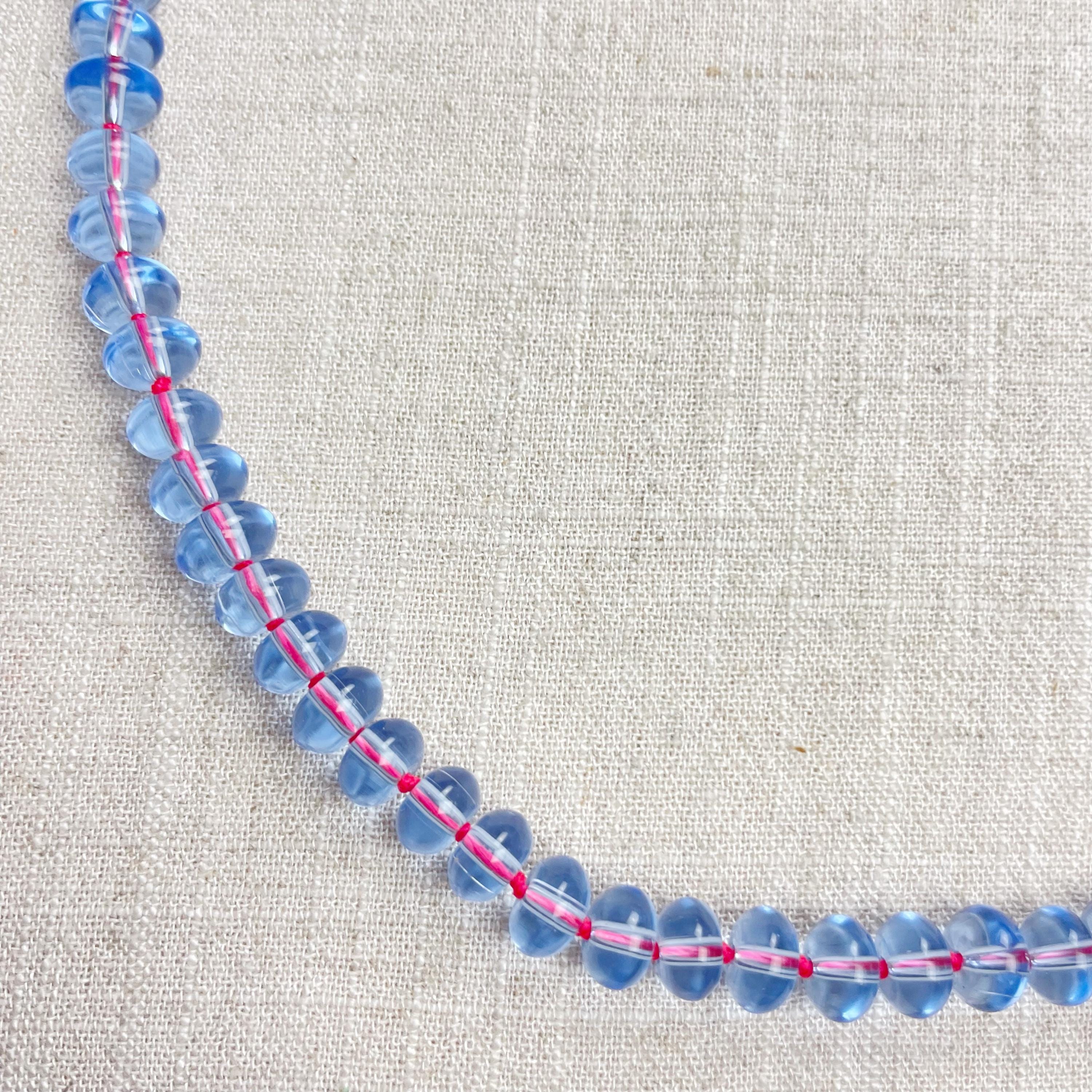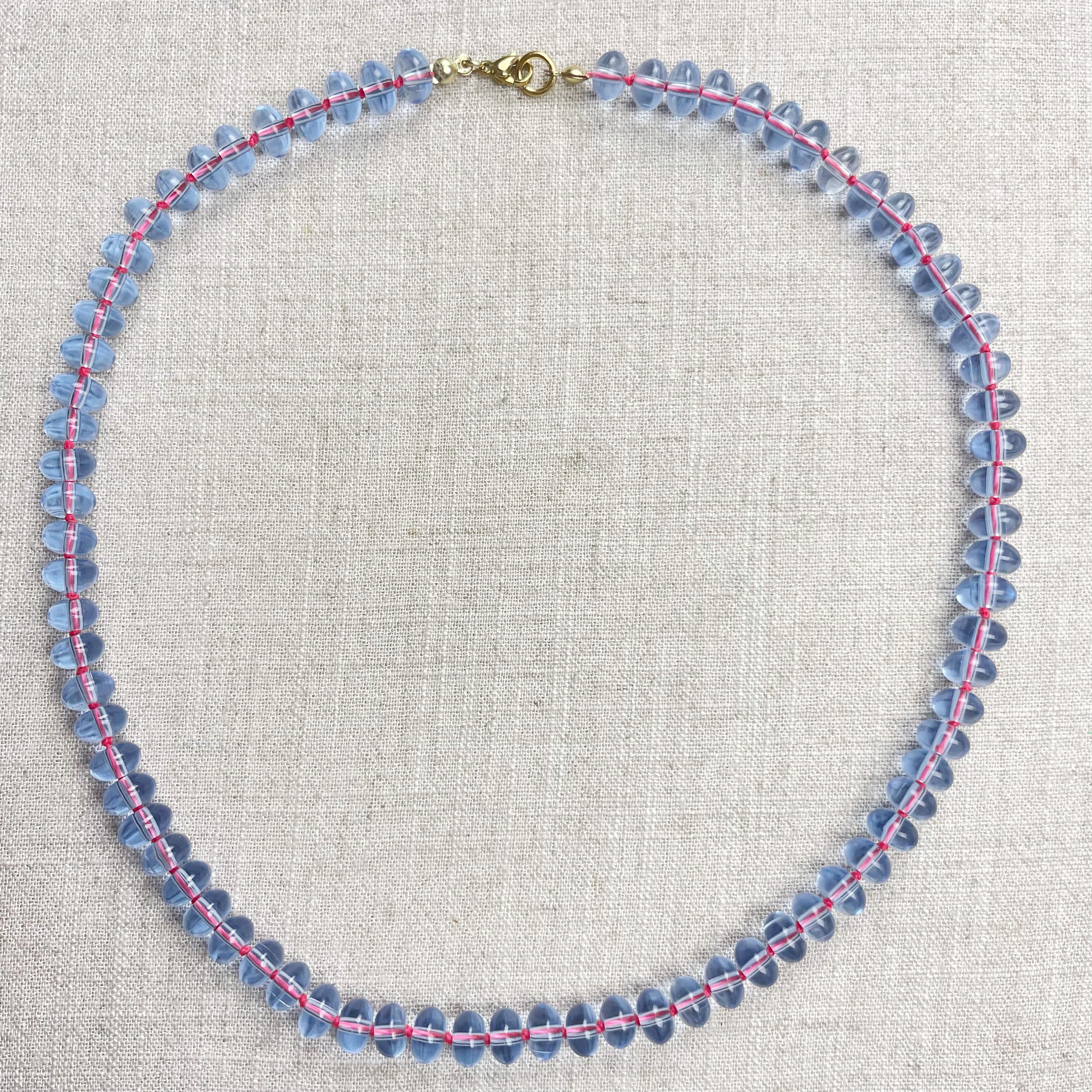 This necklace is made from periwinkle blue translucent glass beads that are 8mm in size. Each bead is hand knotted with pink 100% nylon cord. The hand knotting in between each beads takes time to do but looks gorgeous making the necklace also very easy to wear. The necklace is finished off with a gold plated stainless steel clasp and logo charm.