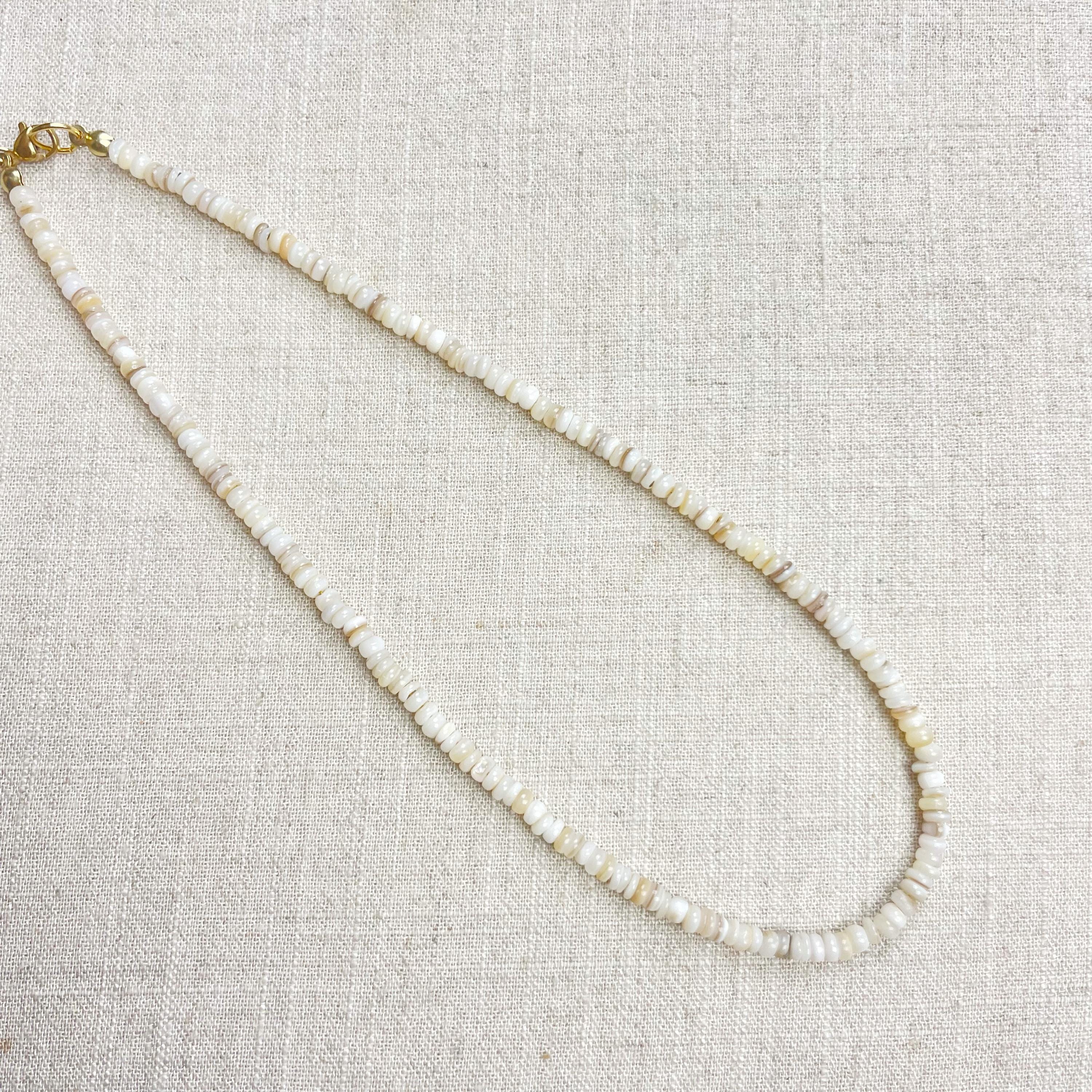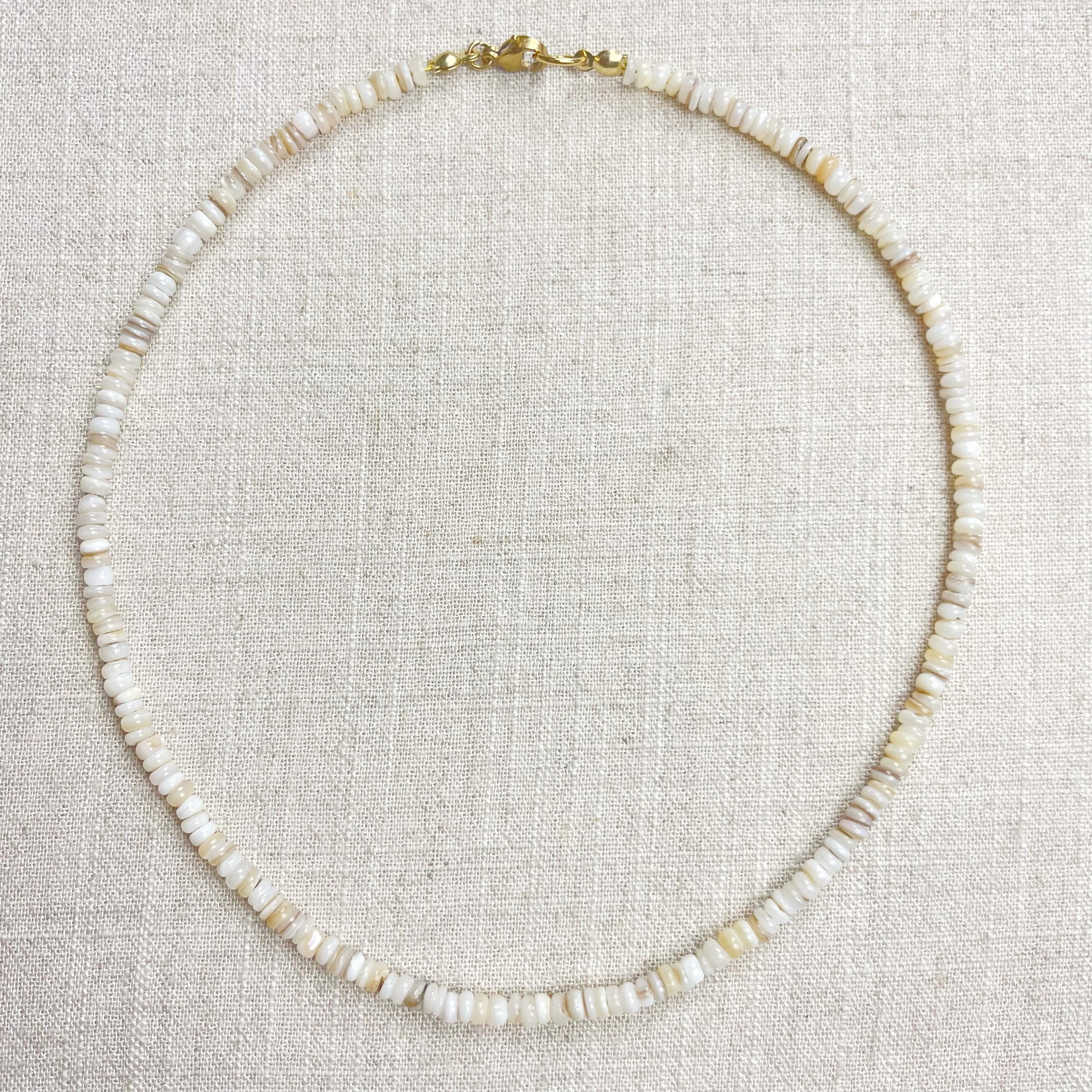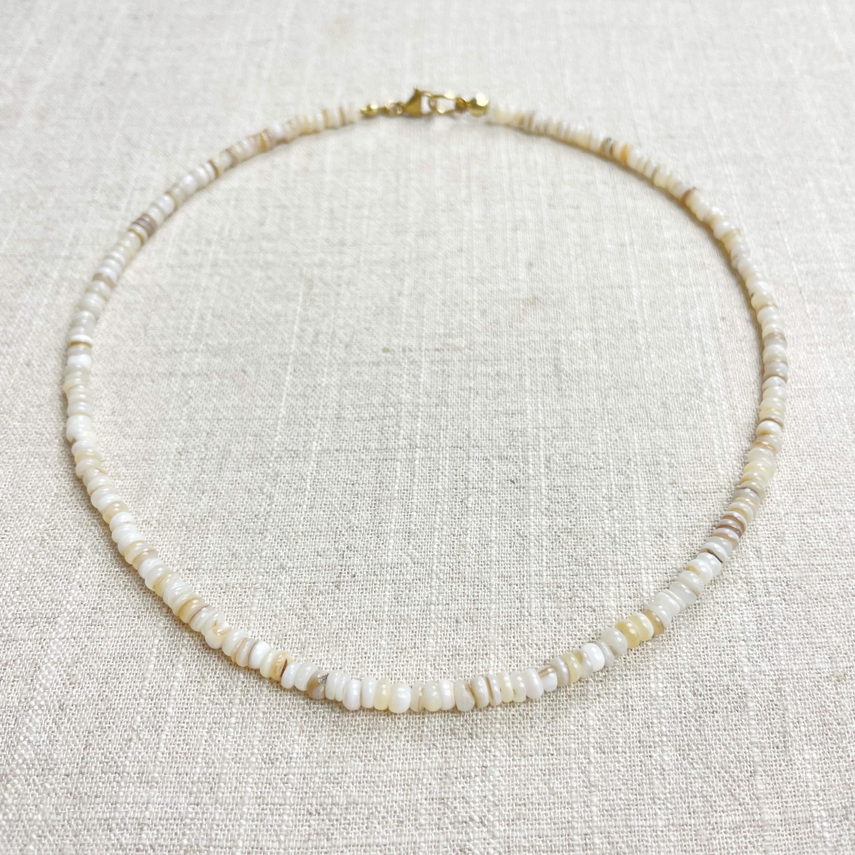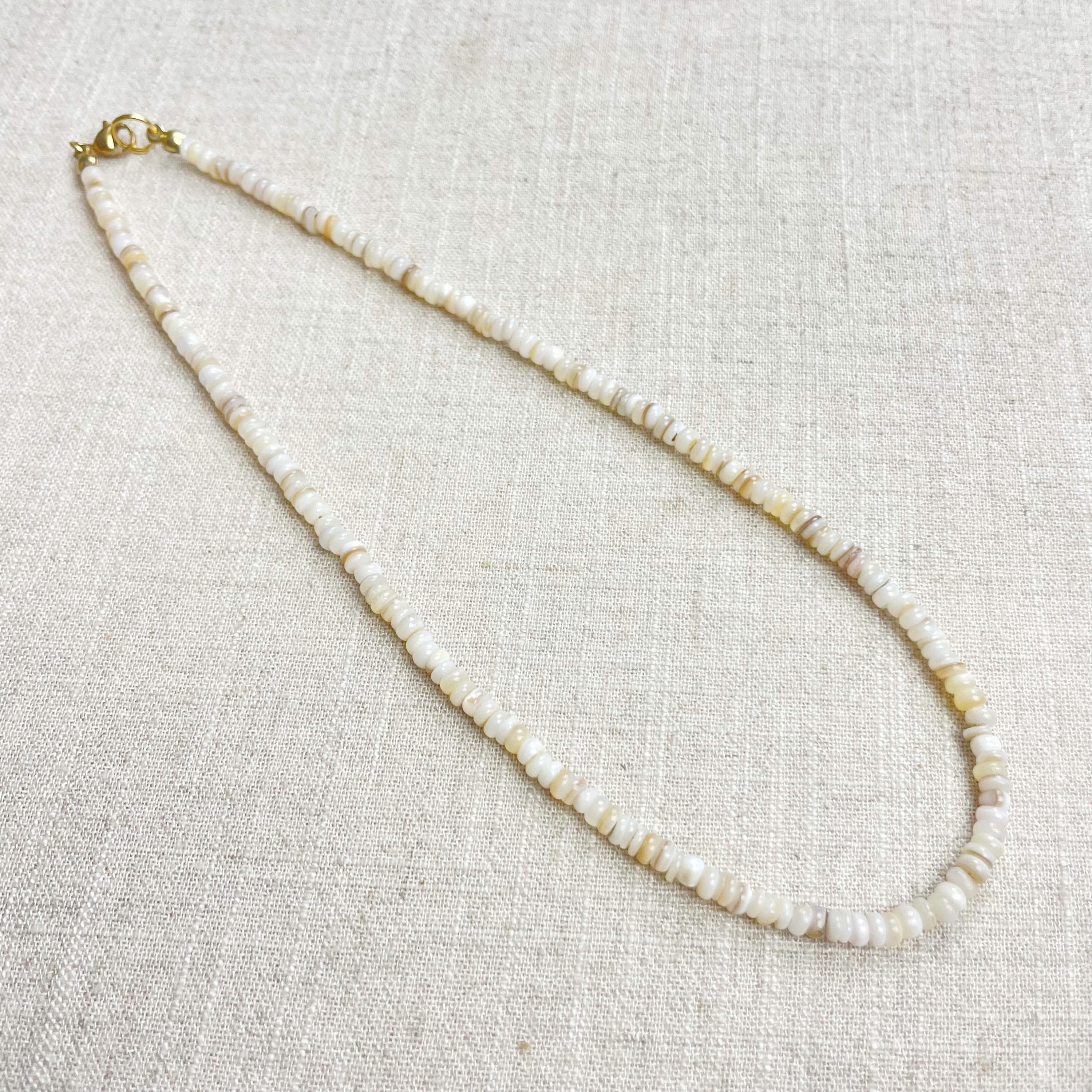 This necklace is made from beautiful shell beads which are in a white color. The beads are 4mm wide. Each necklace is strung on a stainless steel beading wire. The necklace is finished off with a gold plated stainless steel lobster clasp and a logo charm.