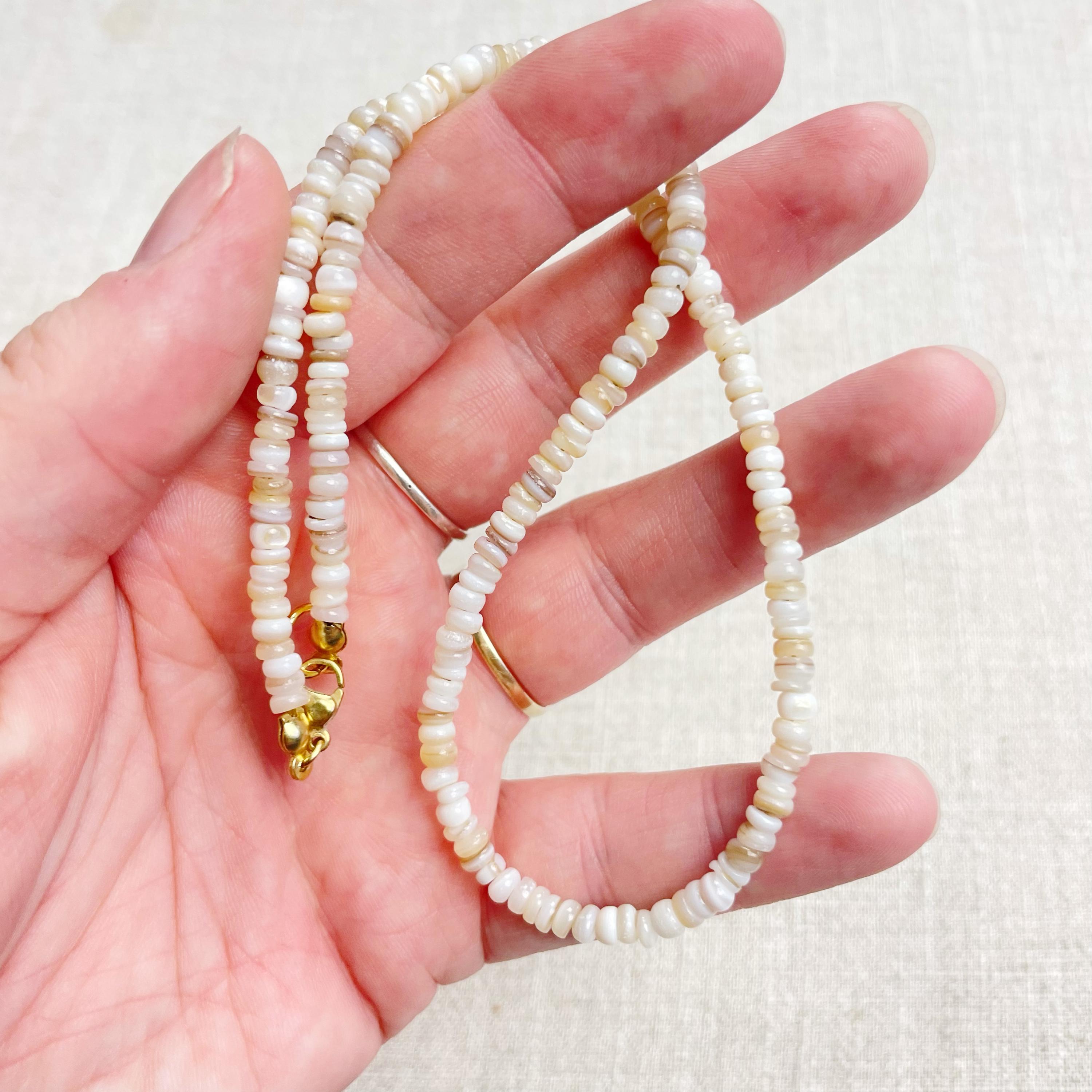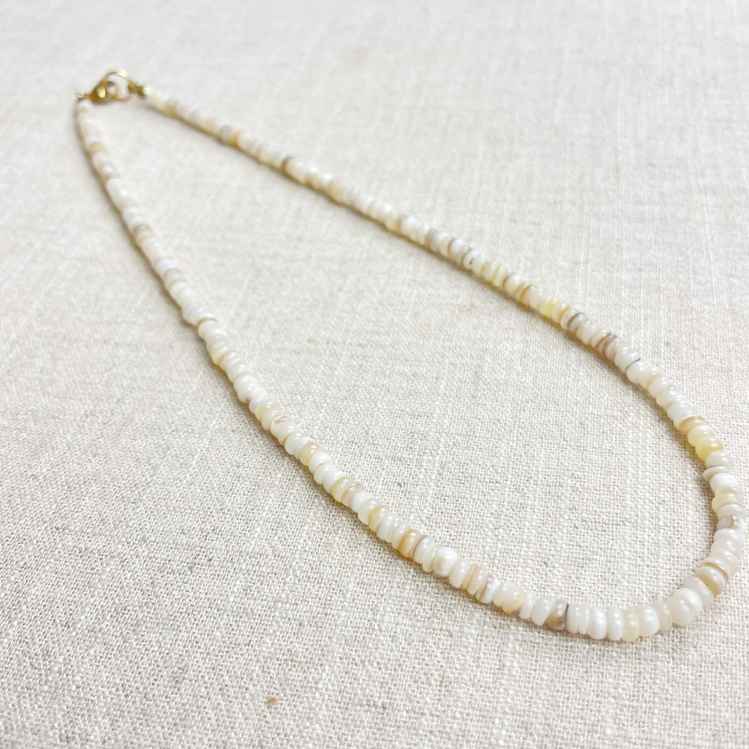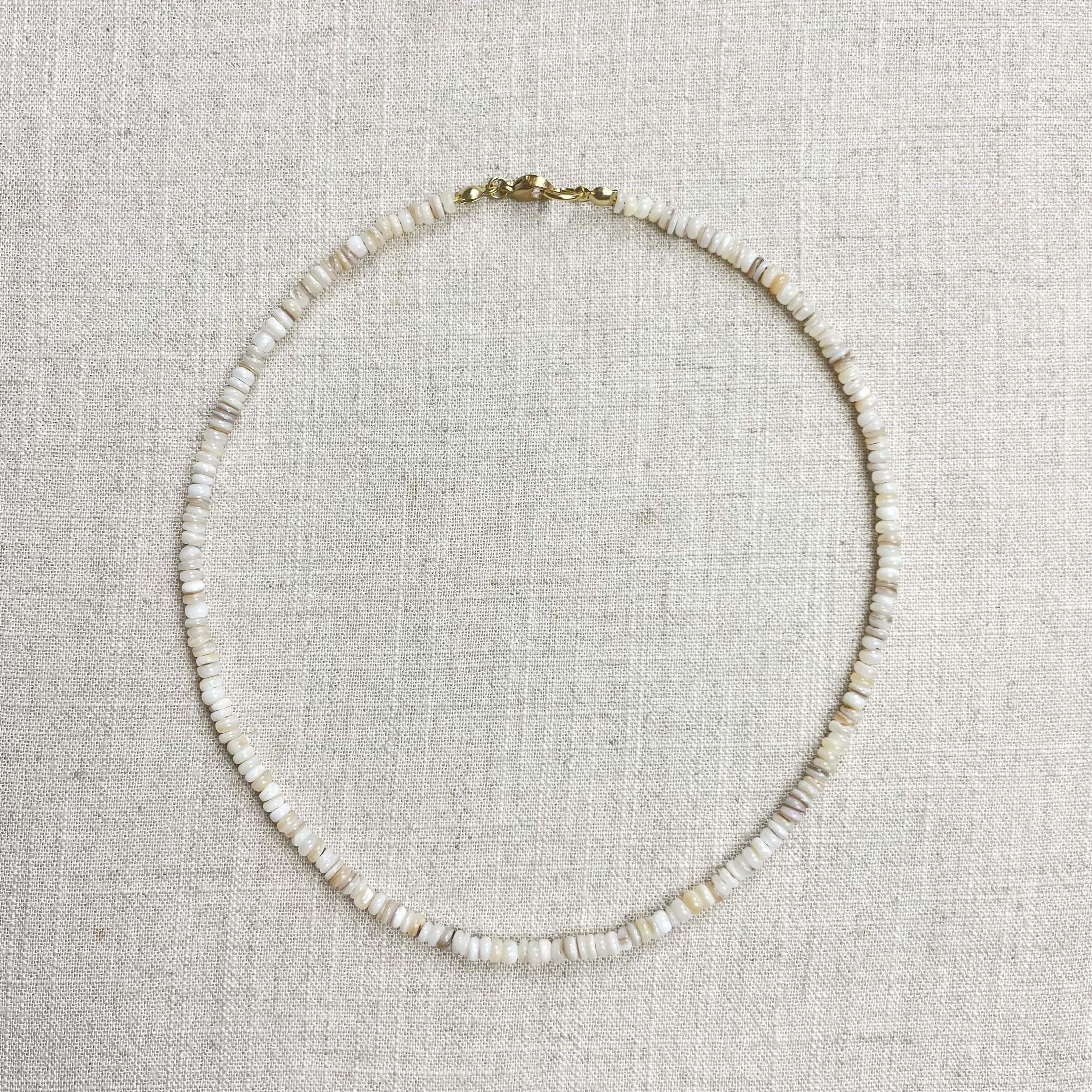 This necklace is made from beautiful shell beads which are in a white color. The beads are 4mm wide. Each necklace is strung on a stainless steel beading wire. The necklace is finished off with a gold plated stainless steel lobster clasp and a logo charm.
