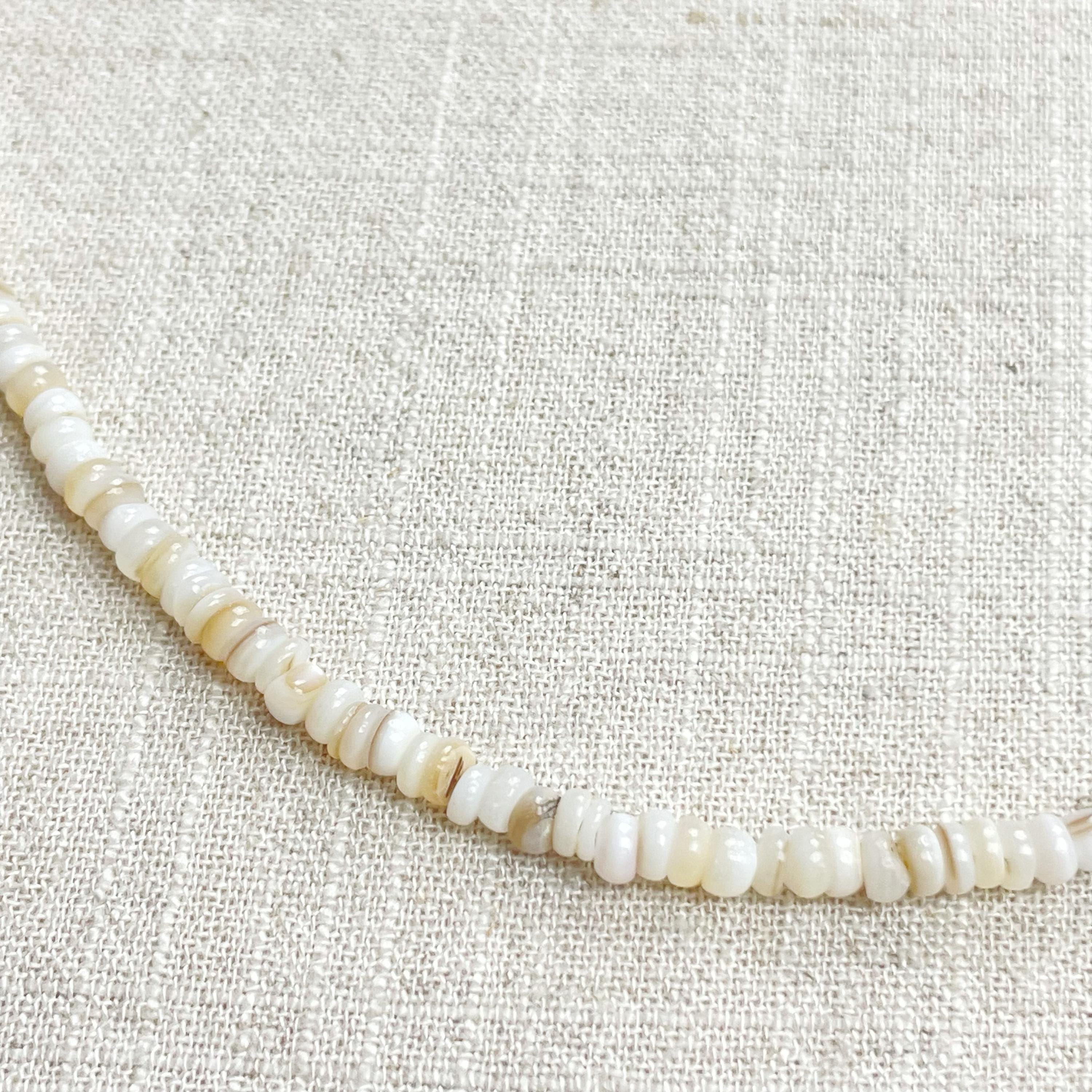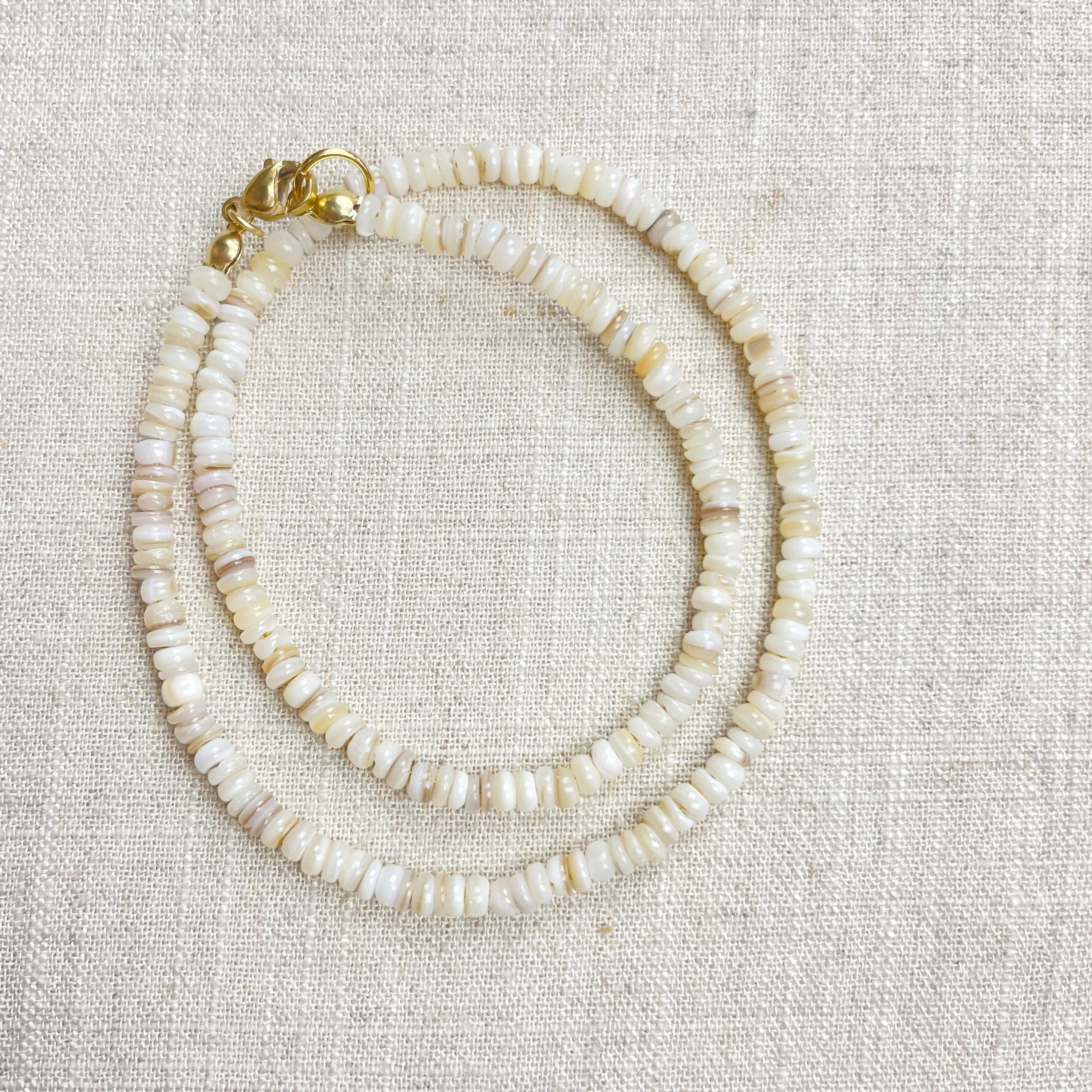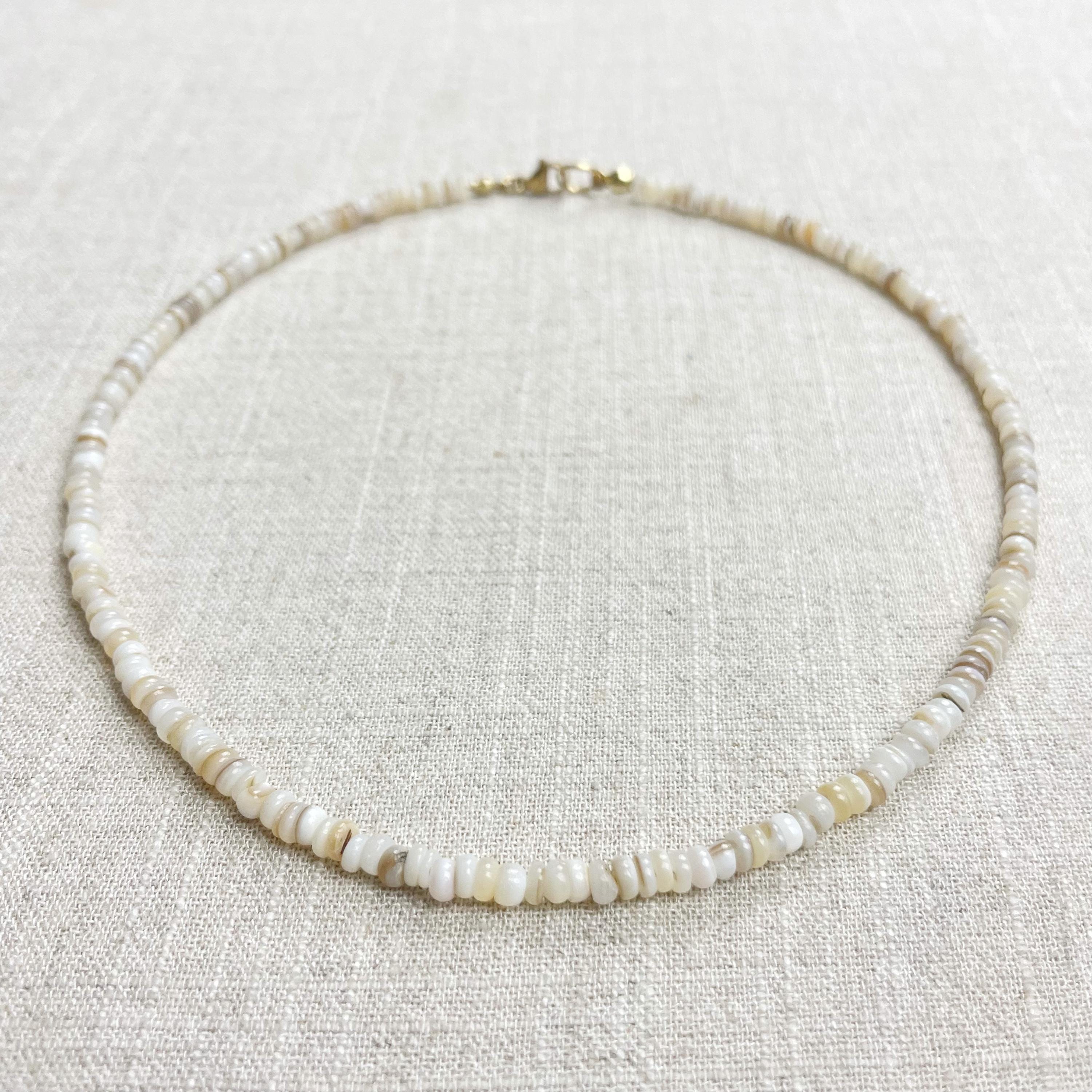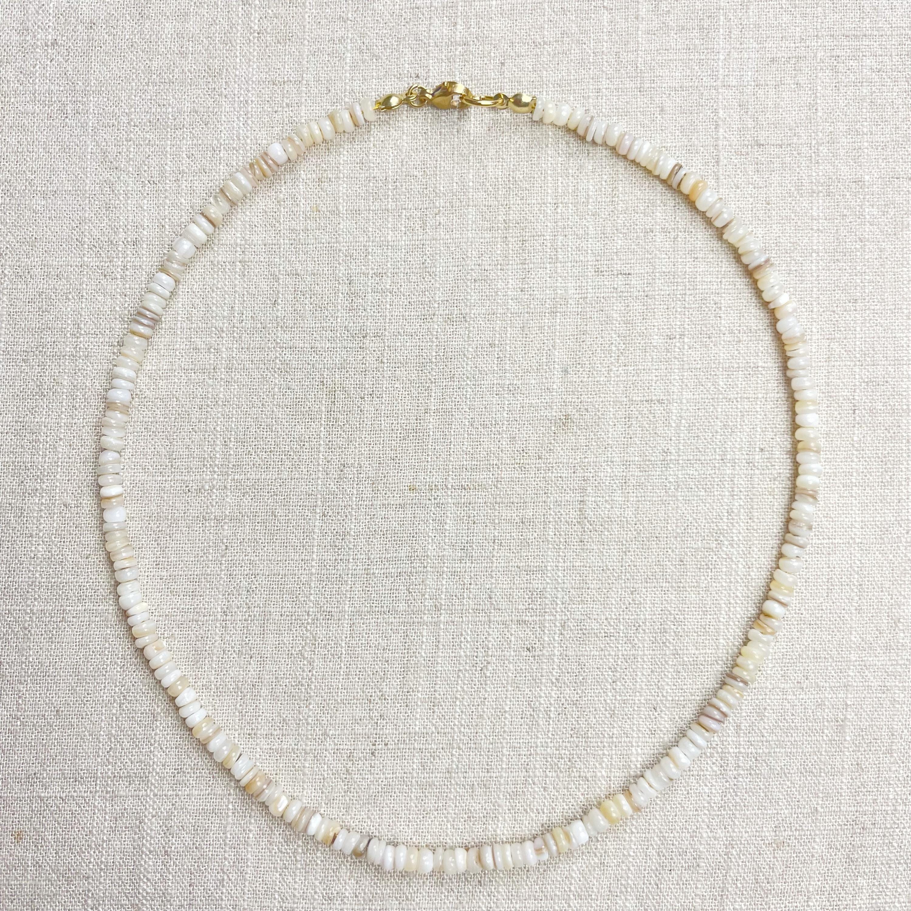 This necklace is made from beautiful shell beads which are in a white color. The beads are 4mm wide. Each necklace is strung on a stainless steel beading wire. The necklace is finished off with a gold plated stainless steel lobster clasp and a logo charm.