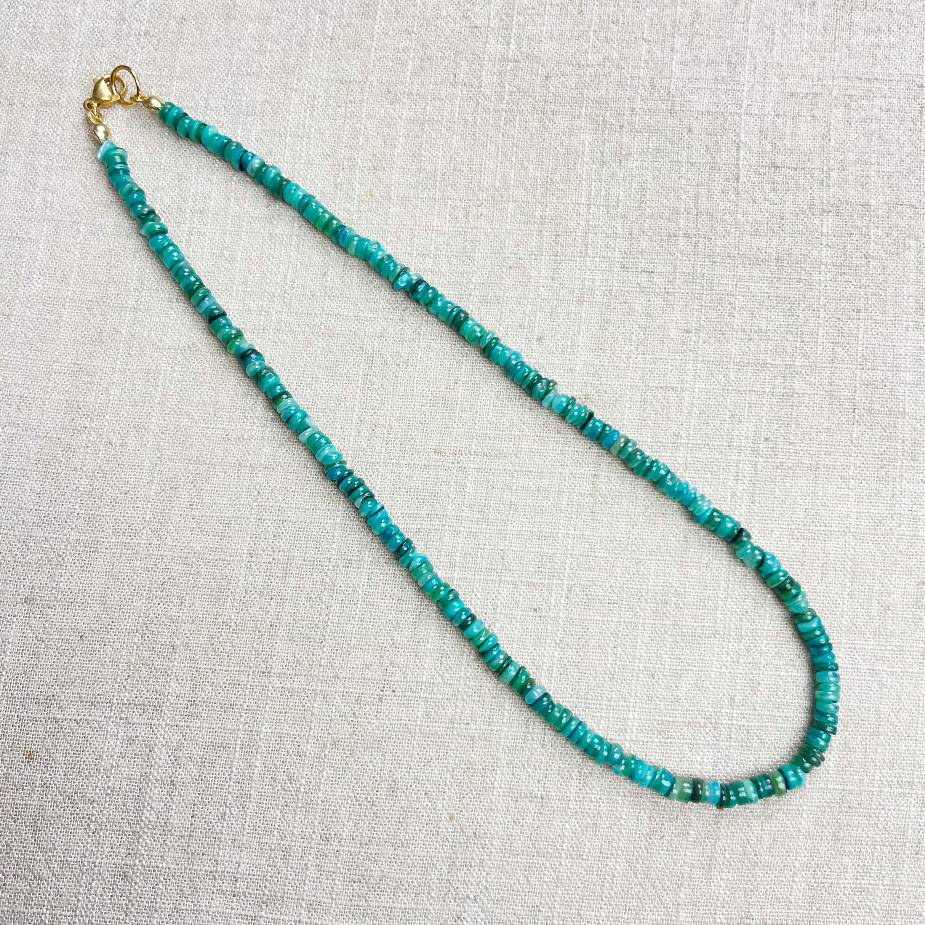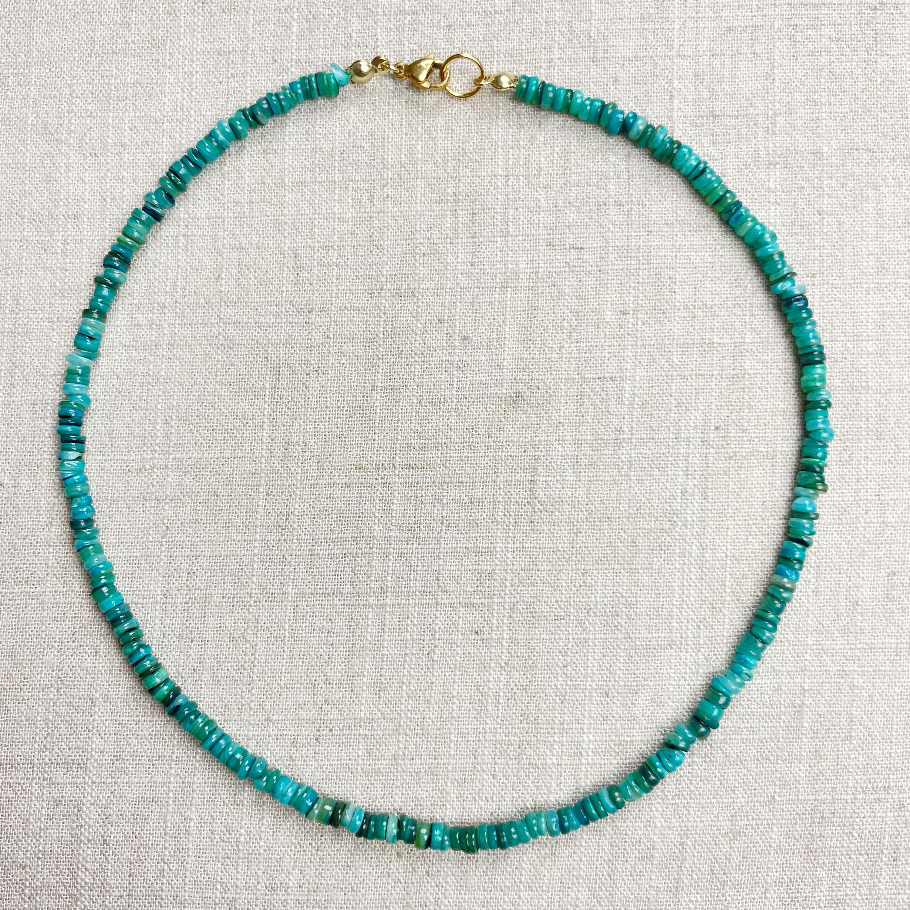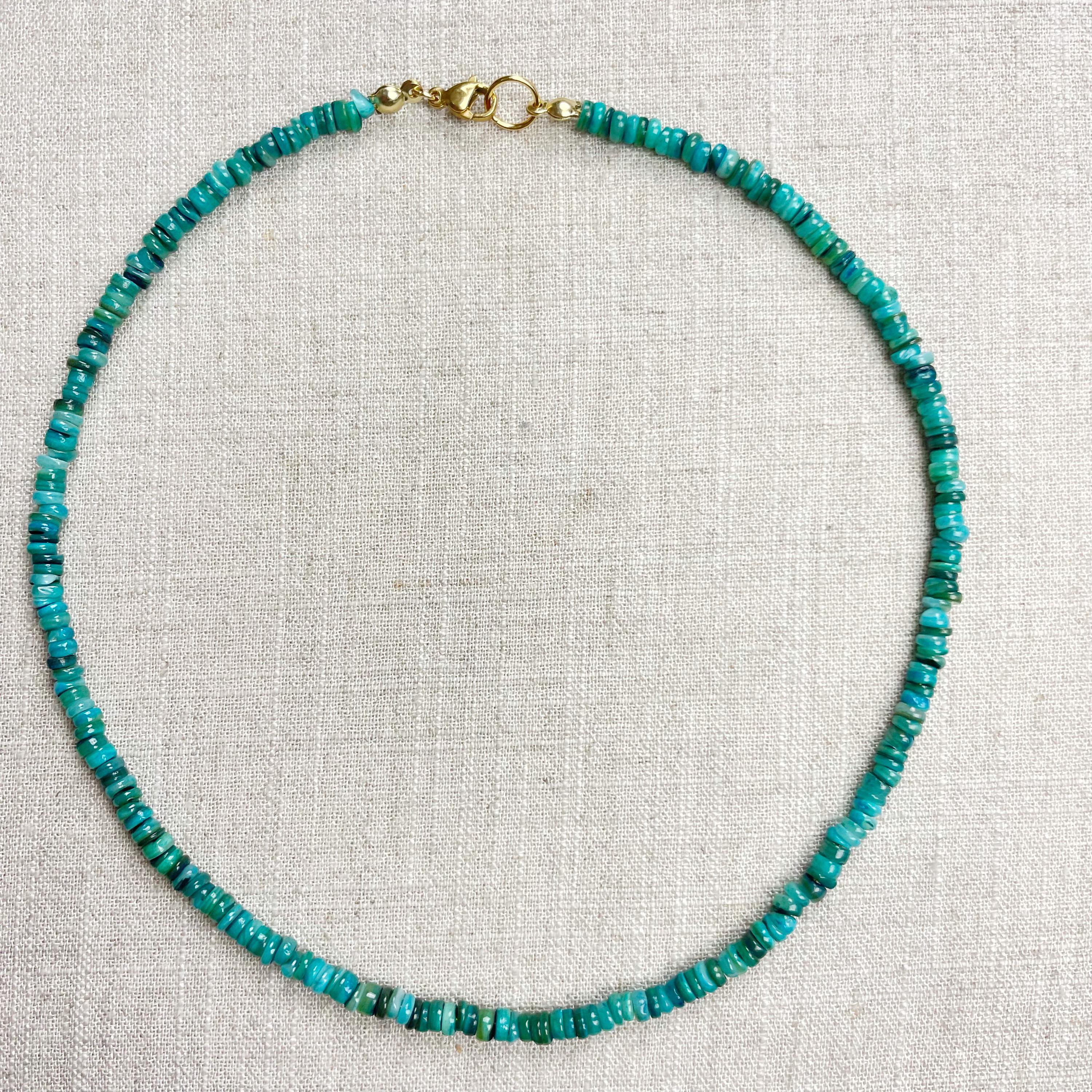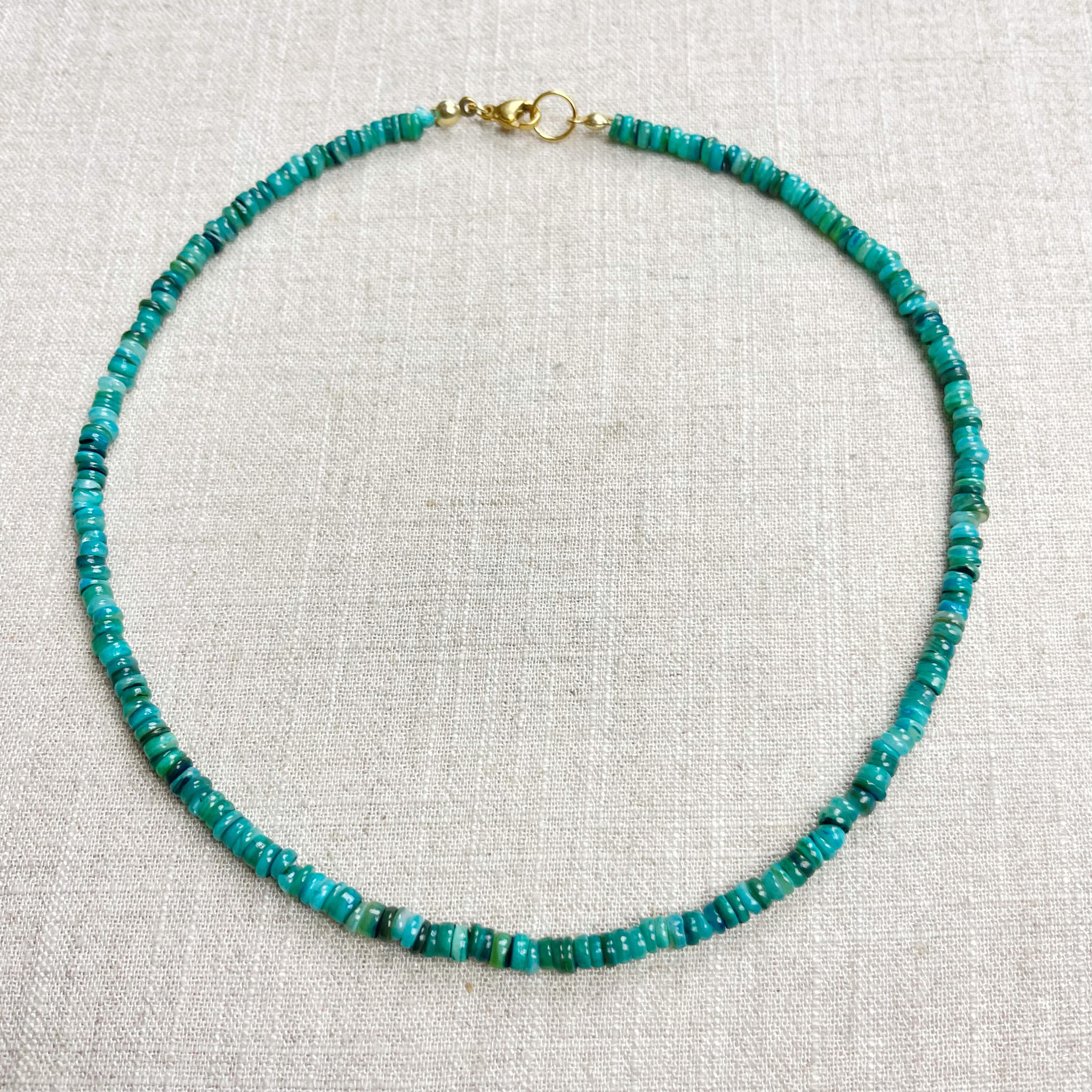 This necklace is made from beautiful shell beads which have been dyed a bright teal color. The beads are 4mm wide. Each necklace is strung on a stainless steel beading wire. The necklace is finished off with a gold plated stainless steel lobster clasp and a logo charm.