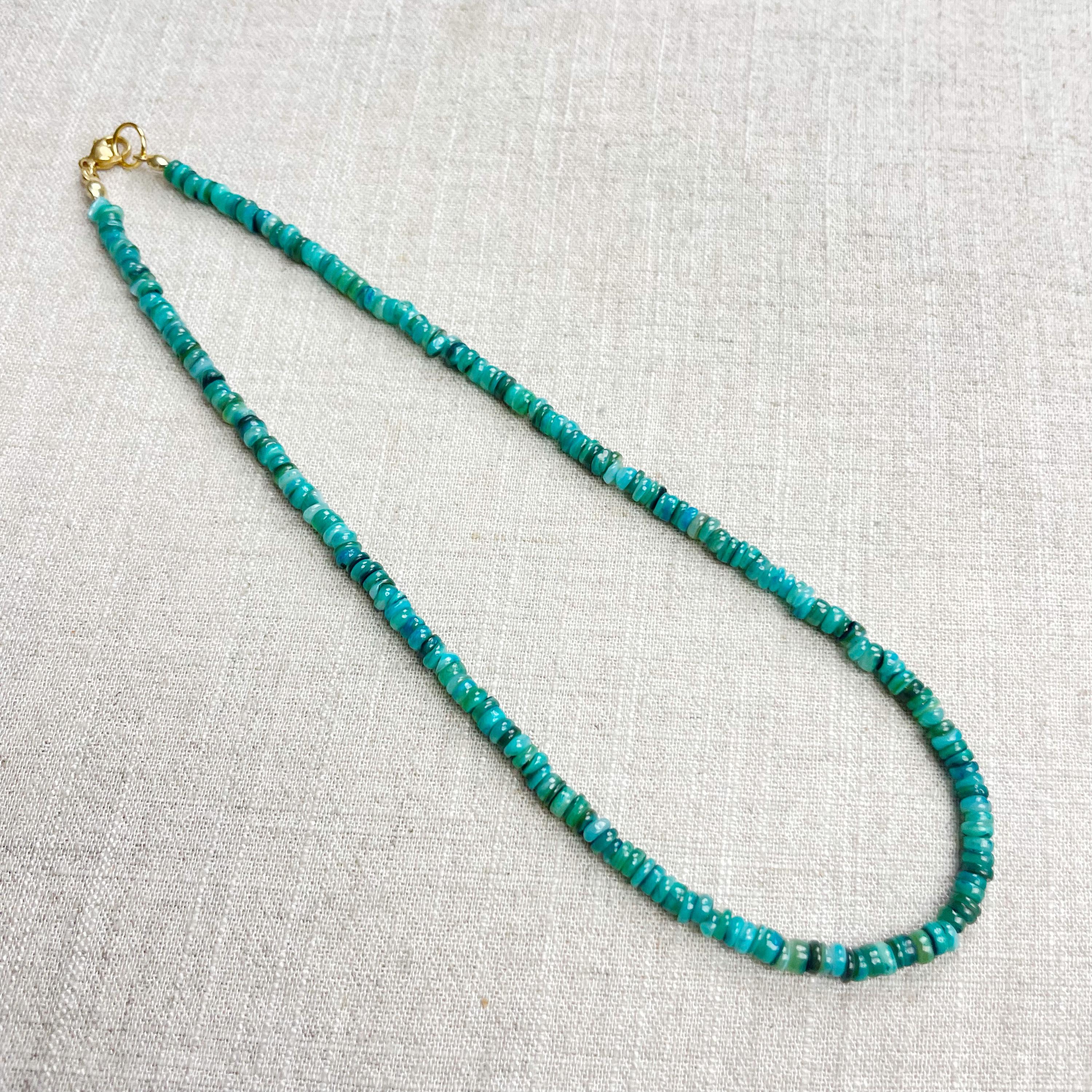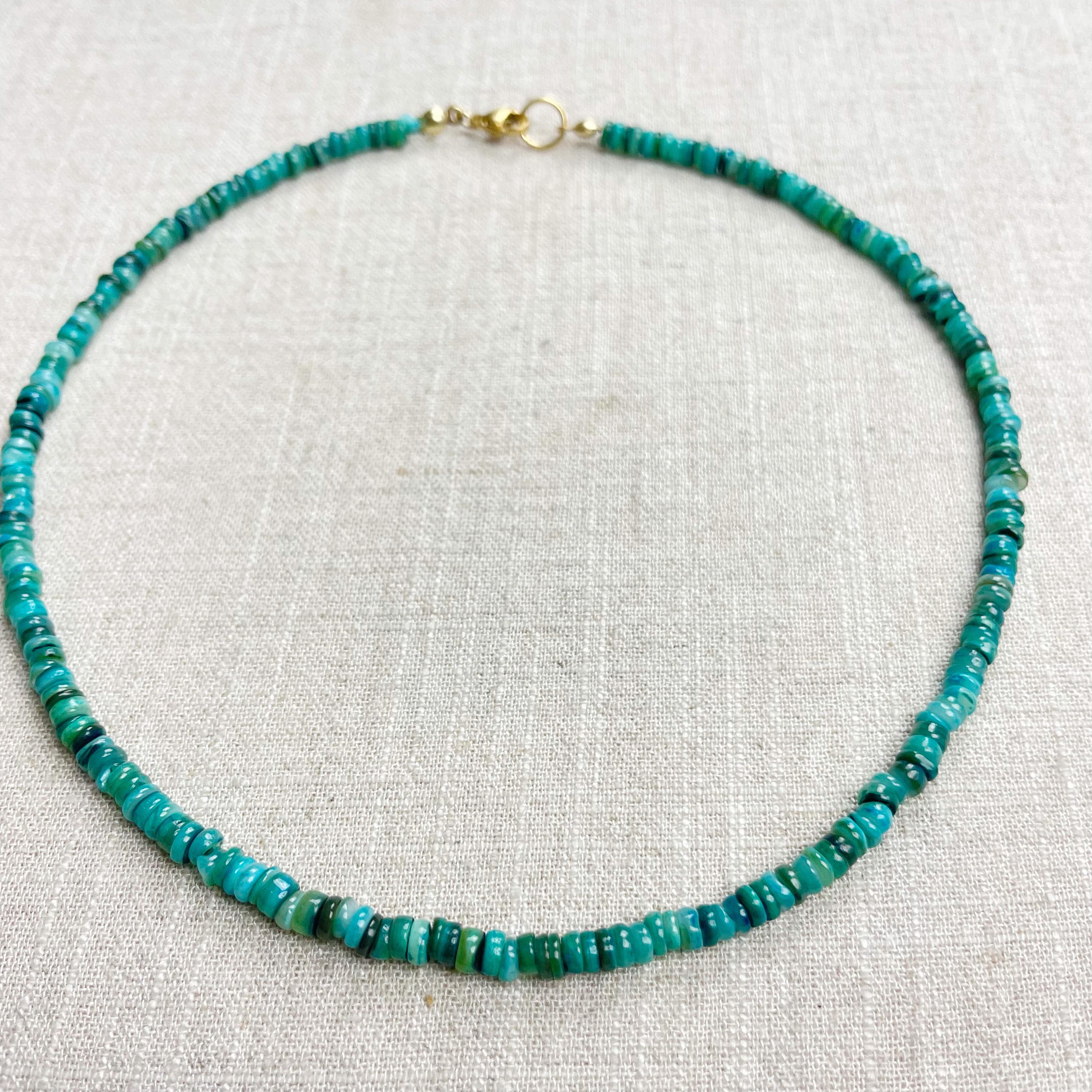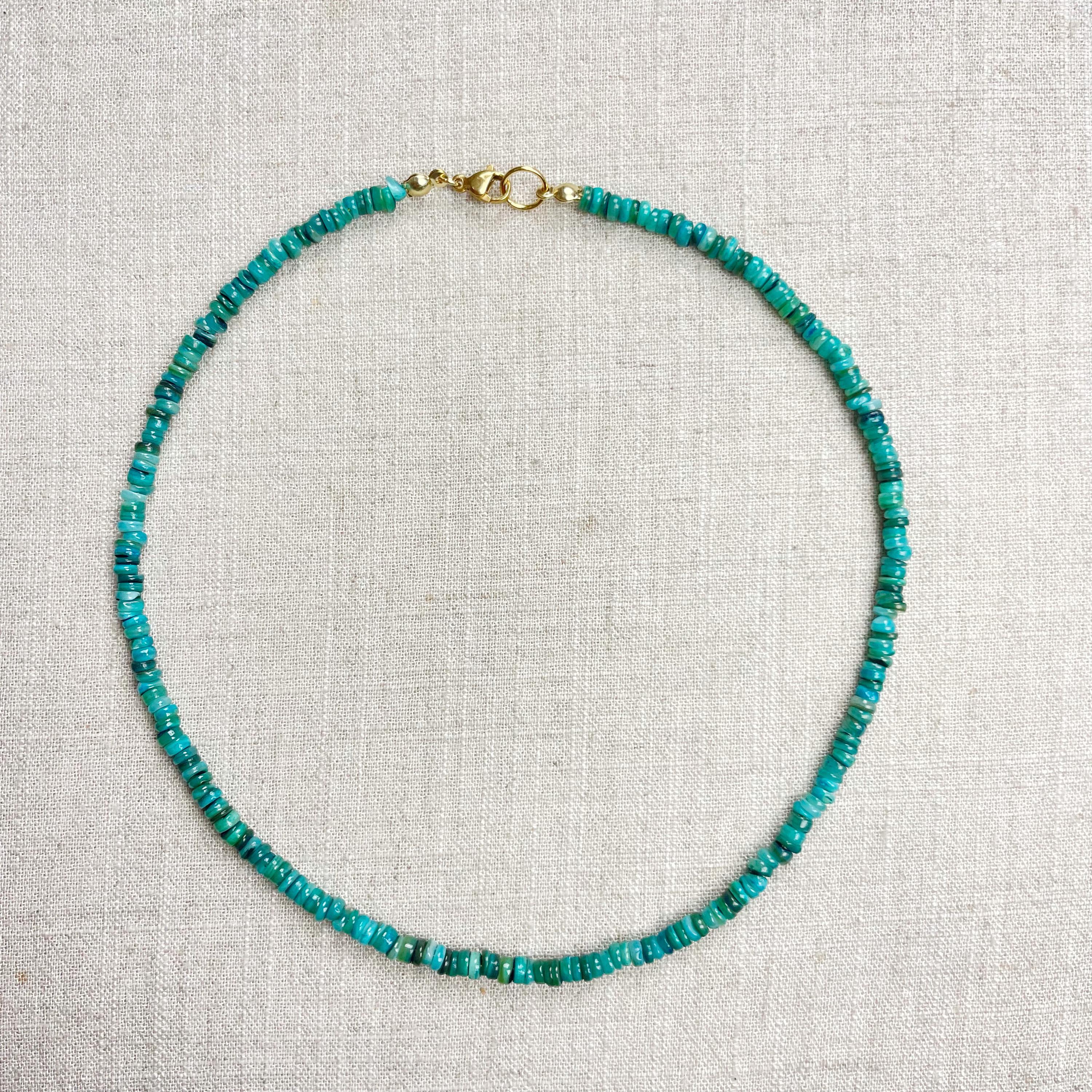 This necklace is made from beautiful shell beads which have been dyed a bright teal color. The beads are 4mm wide. Each necklace is strung on a stainless steel beading wire. The necklace is finished off with a gold plated stainless steel lobster clasp and a logo charm.