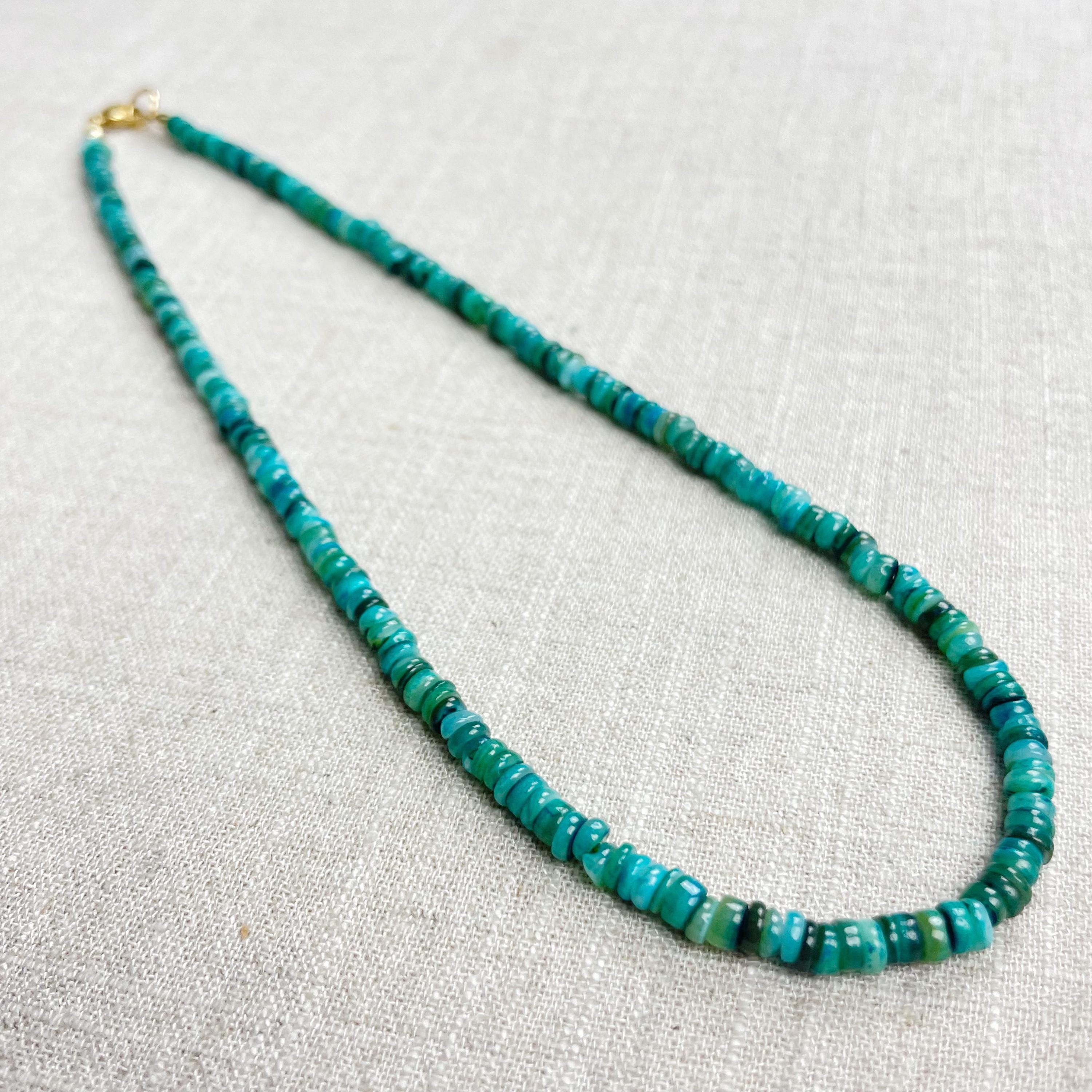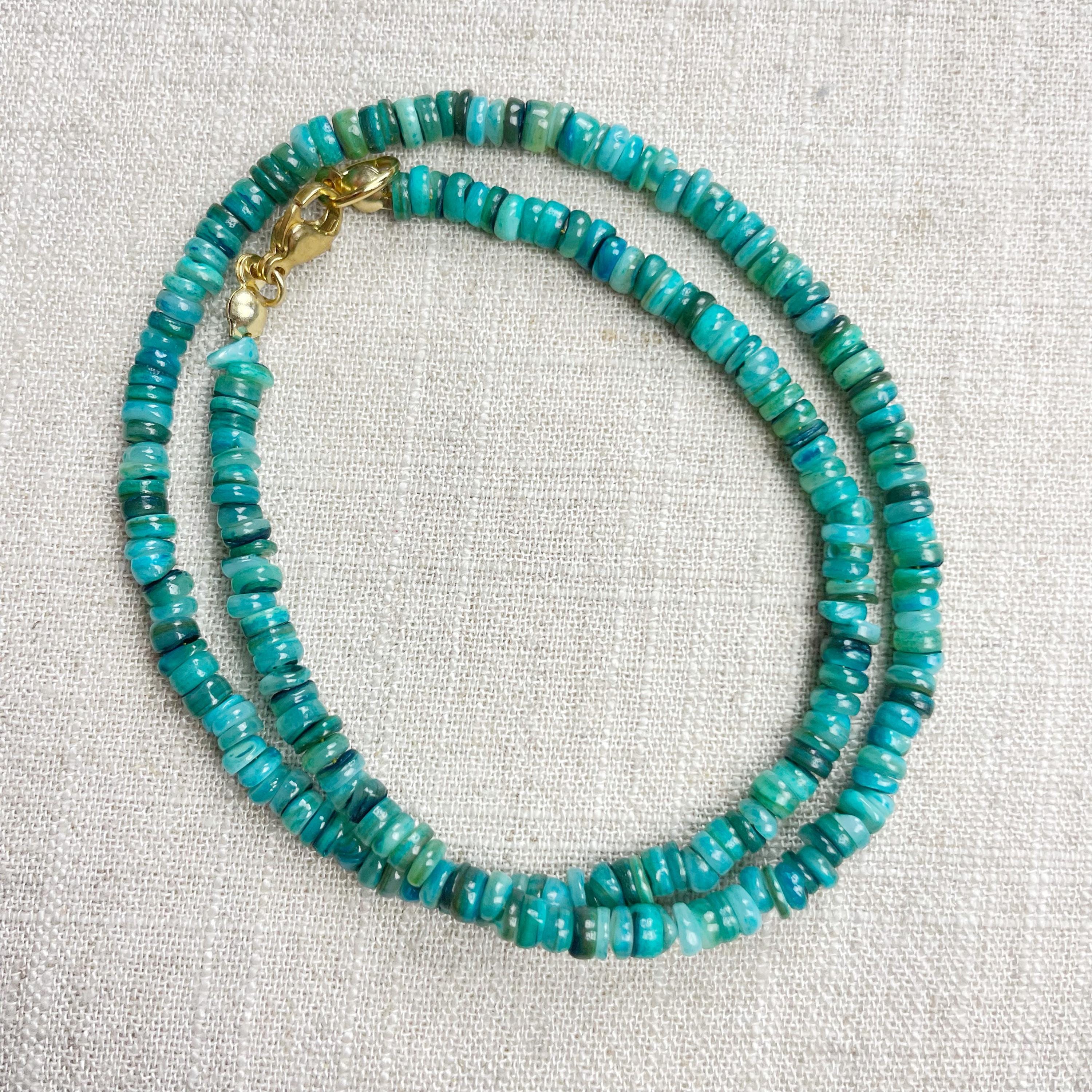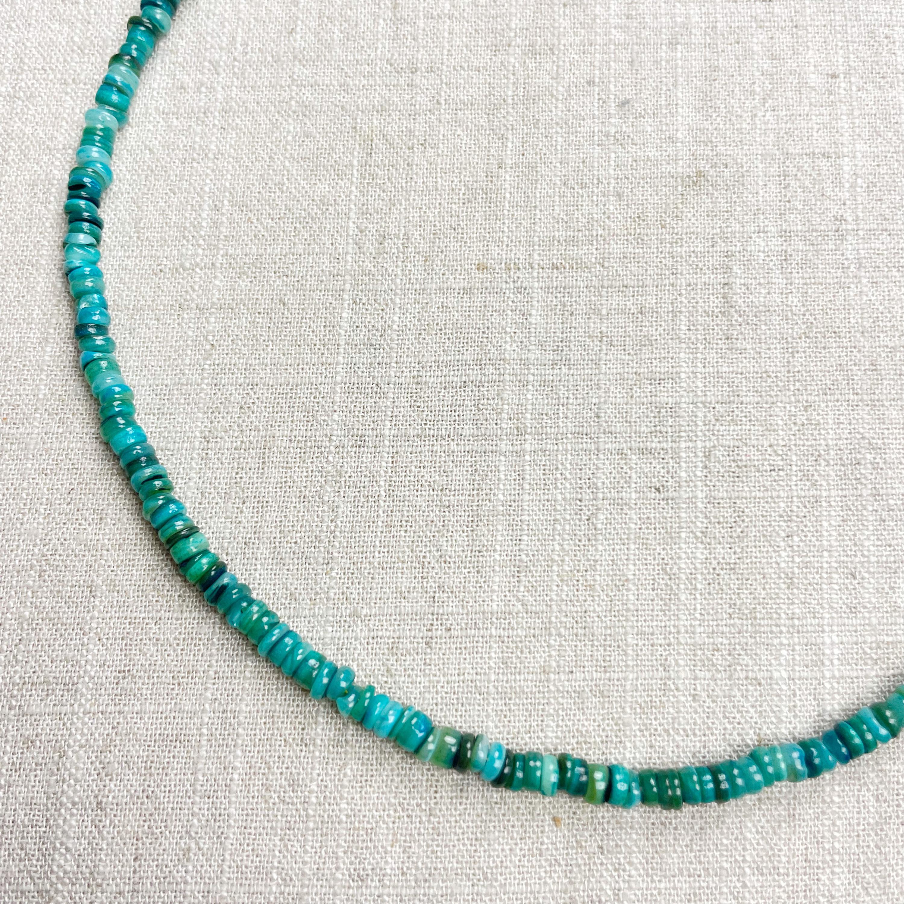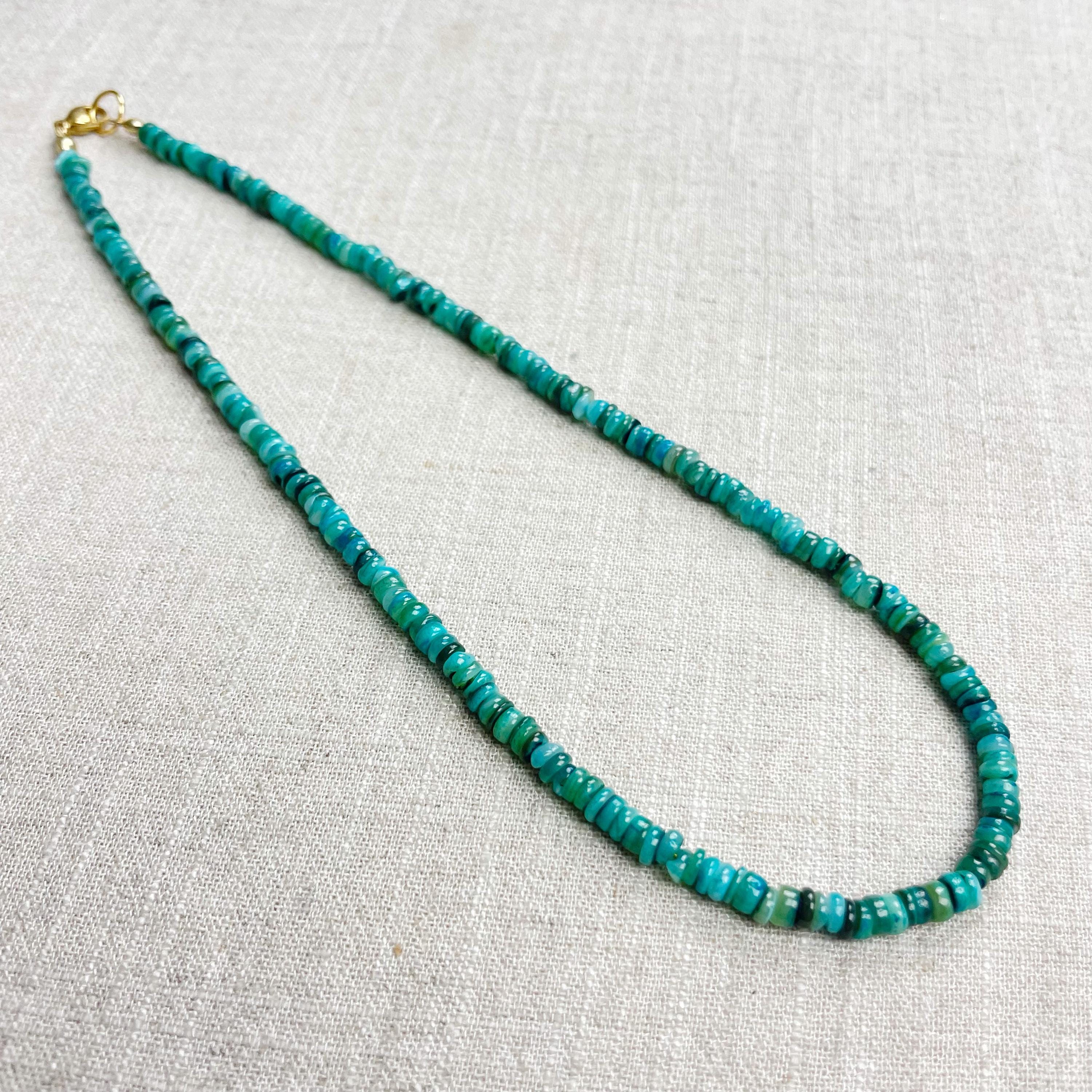 This necklace is made from beautiful shell beads which have been dyed a bright teal color. The beads are 4mm wide. Each necklace is strung on a stainless steel beading wire. The necklace is finished off with a gold plated stainless steel lobster clasp and a logo charm.