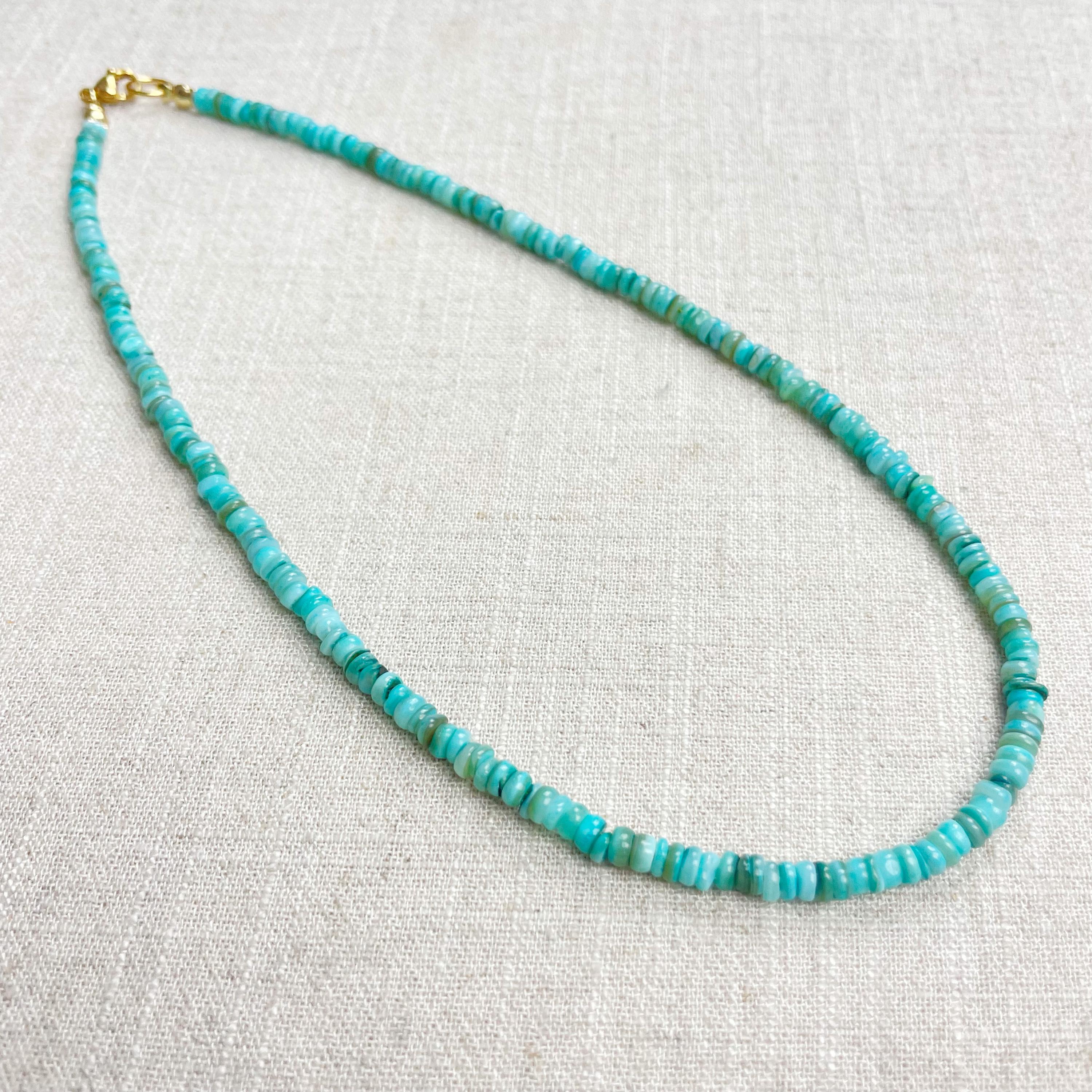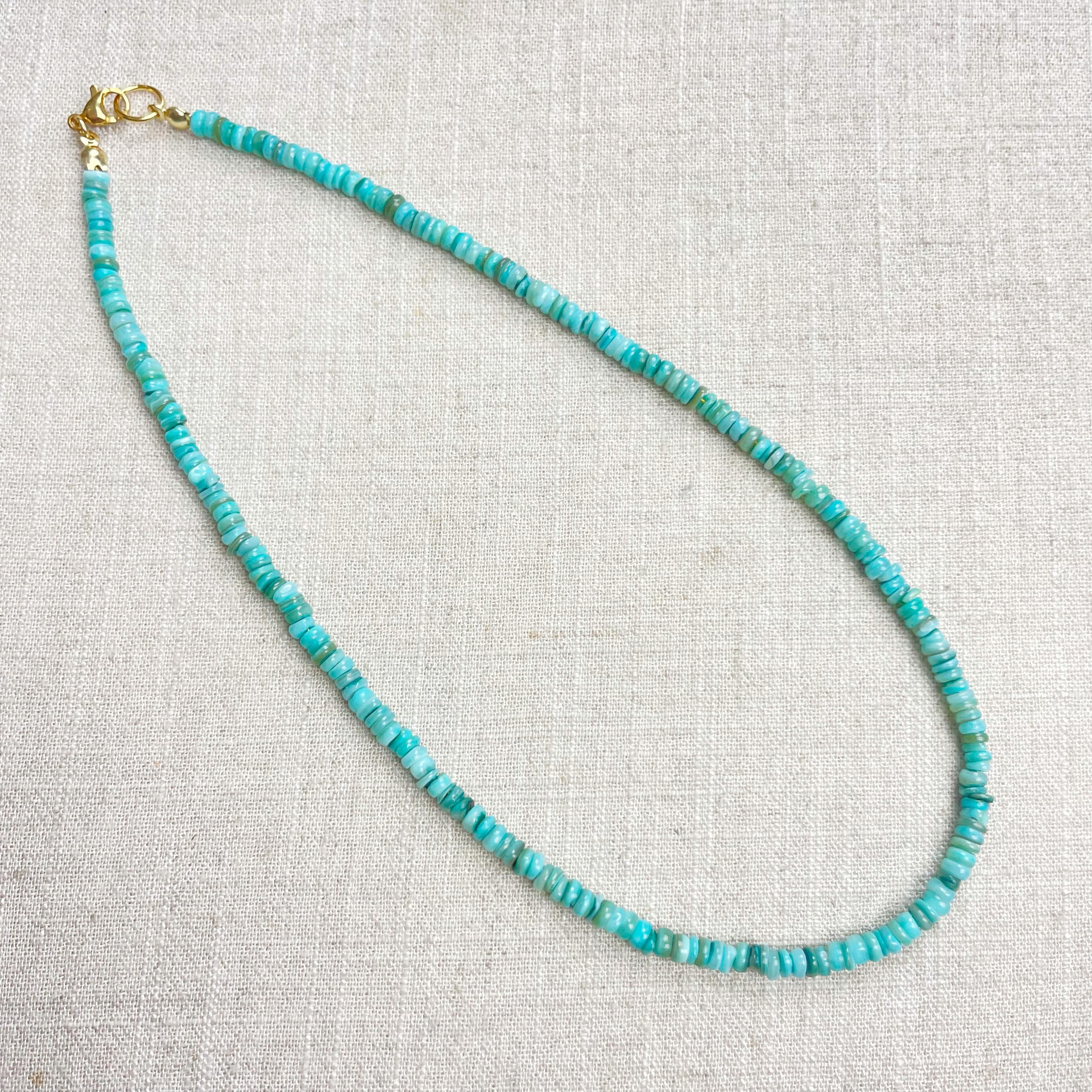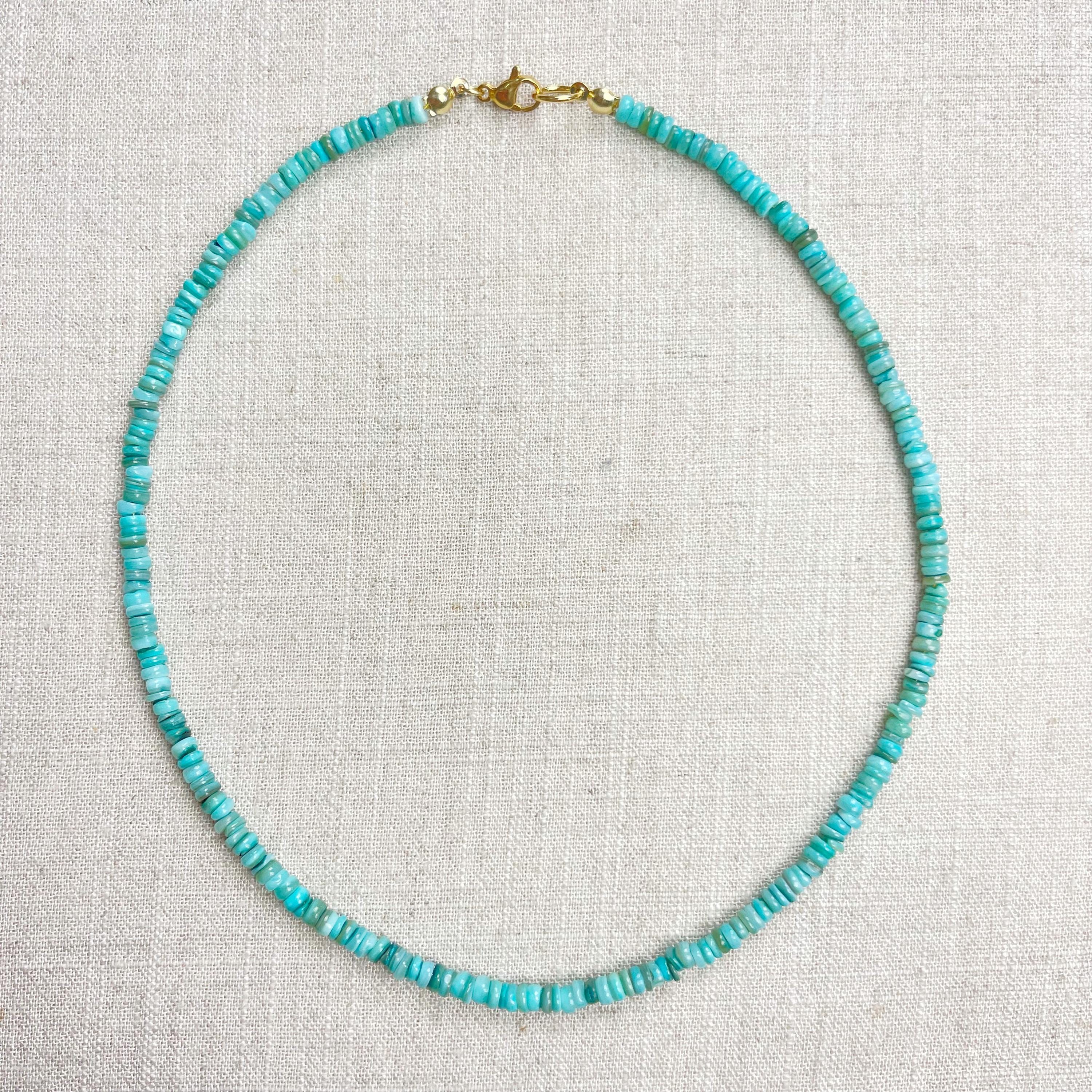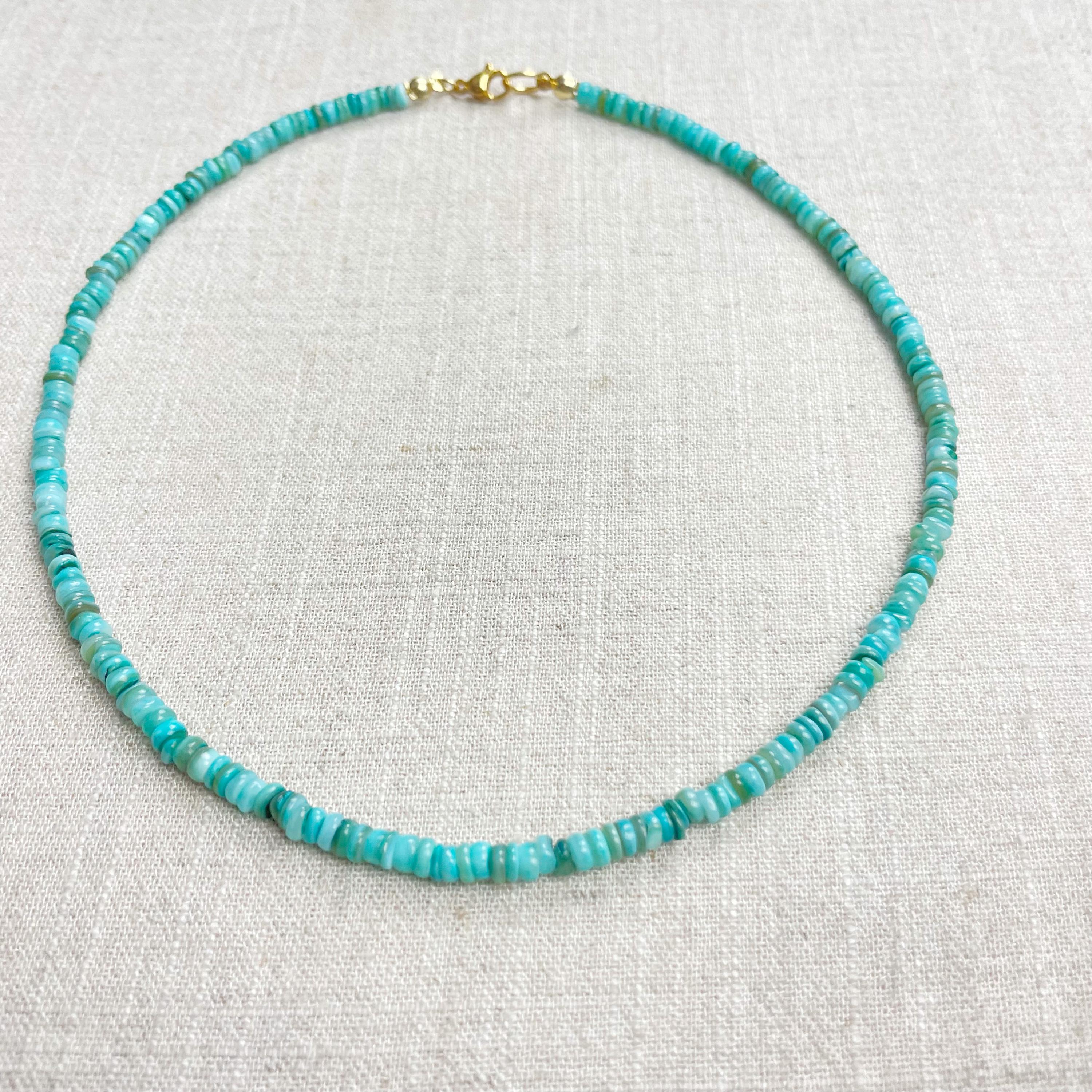 This necklace is made from beautiful shell beads which have been dyed a bright turquoise color. The beads are 4mm wide. Each necklace is strung on a stainless steel beading wire. The necklace is finished off with a gold plated stainless steel lobster clasp and a logo charm.