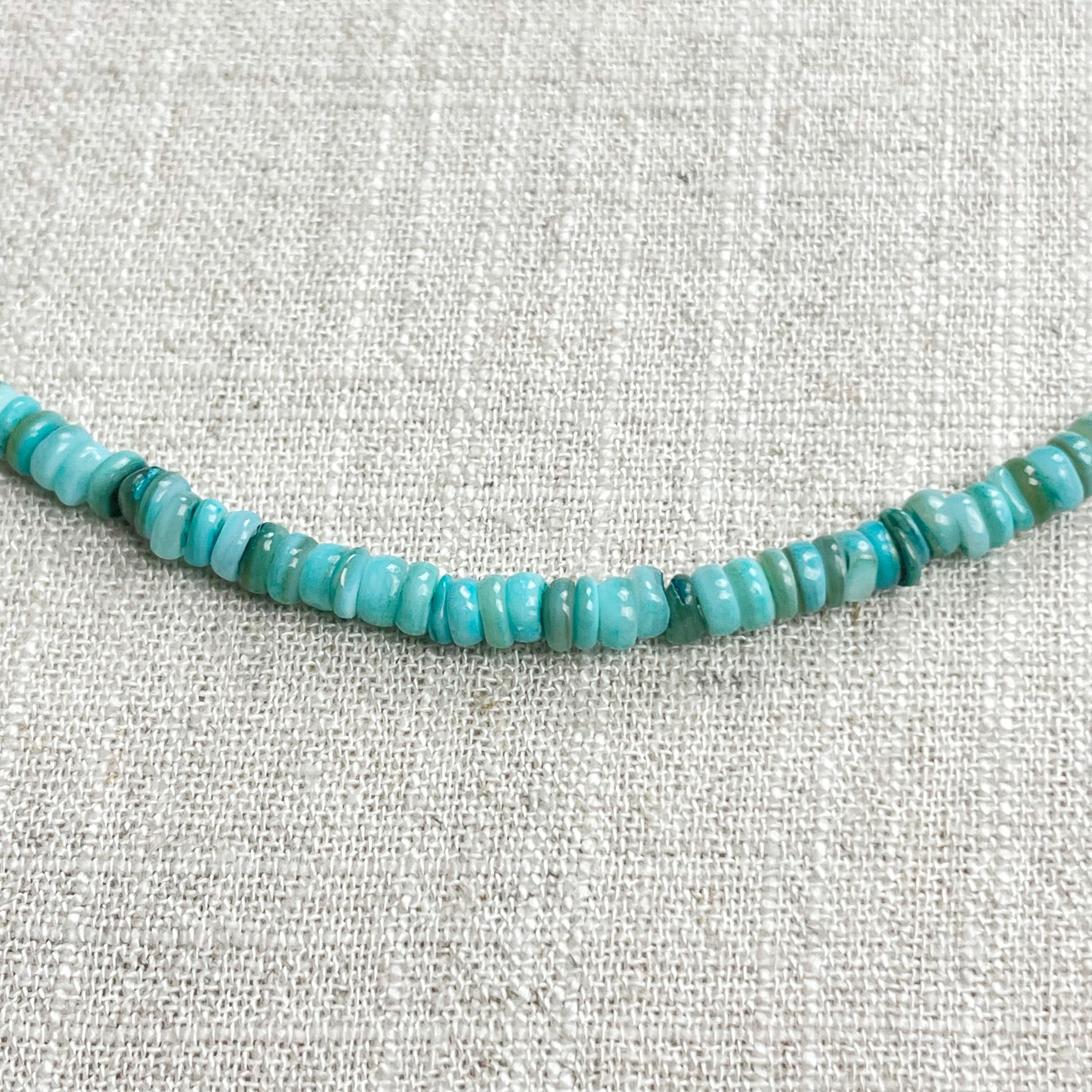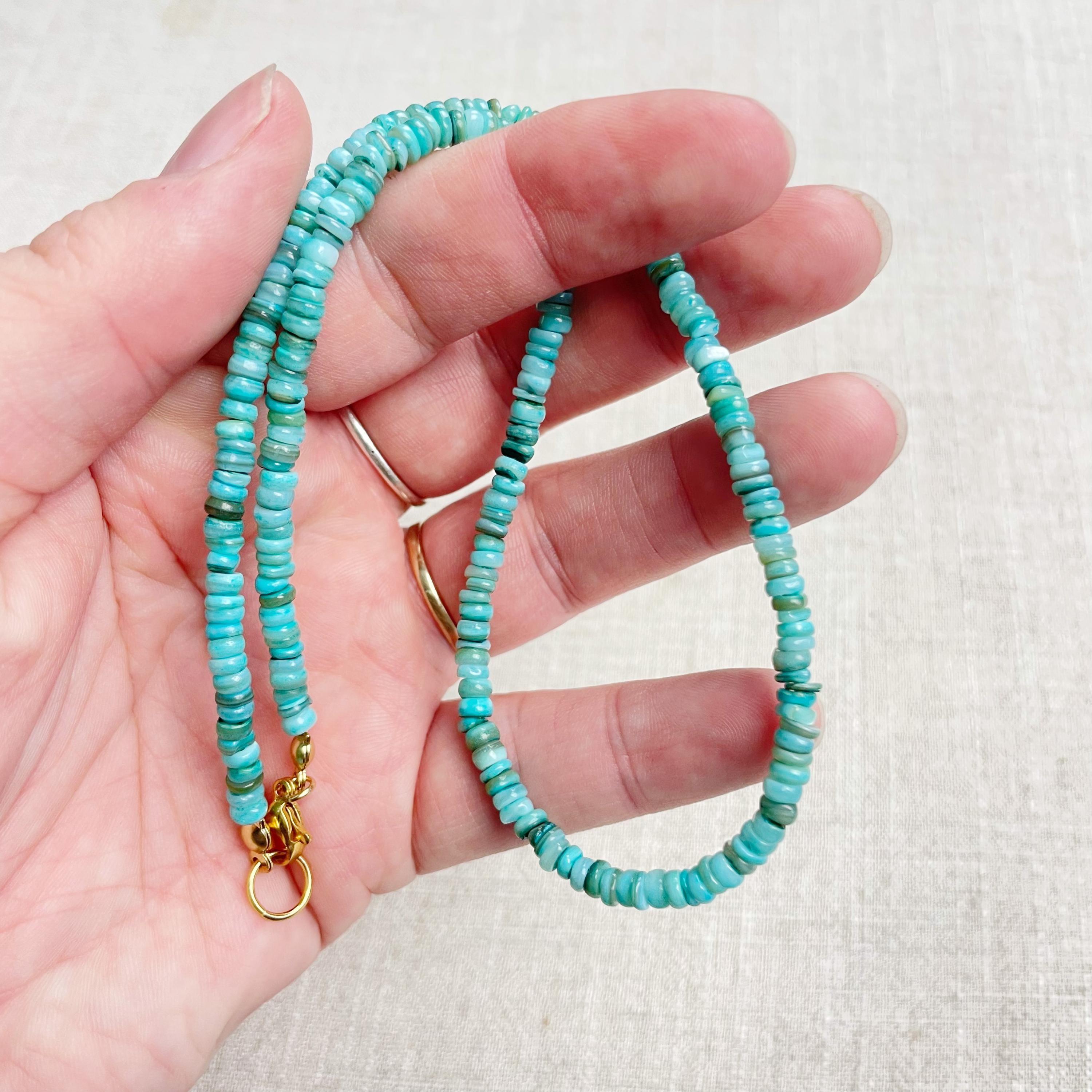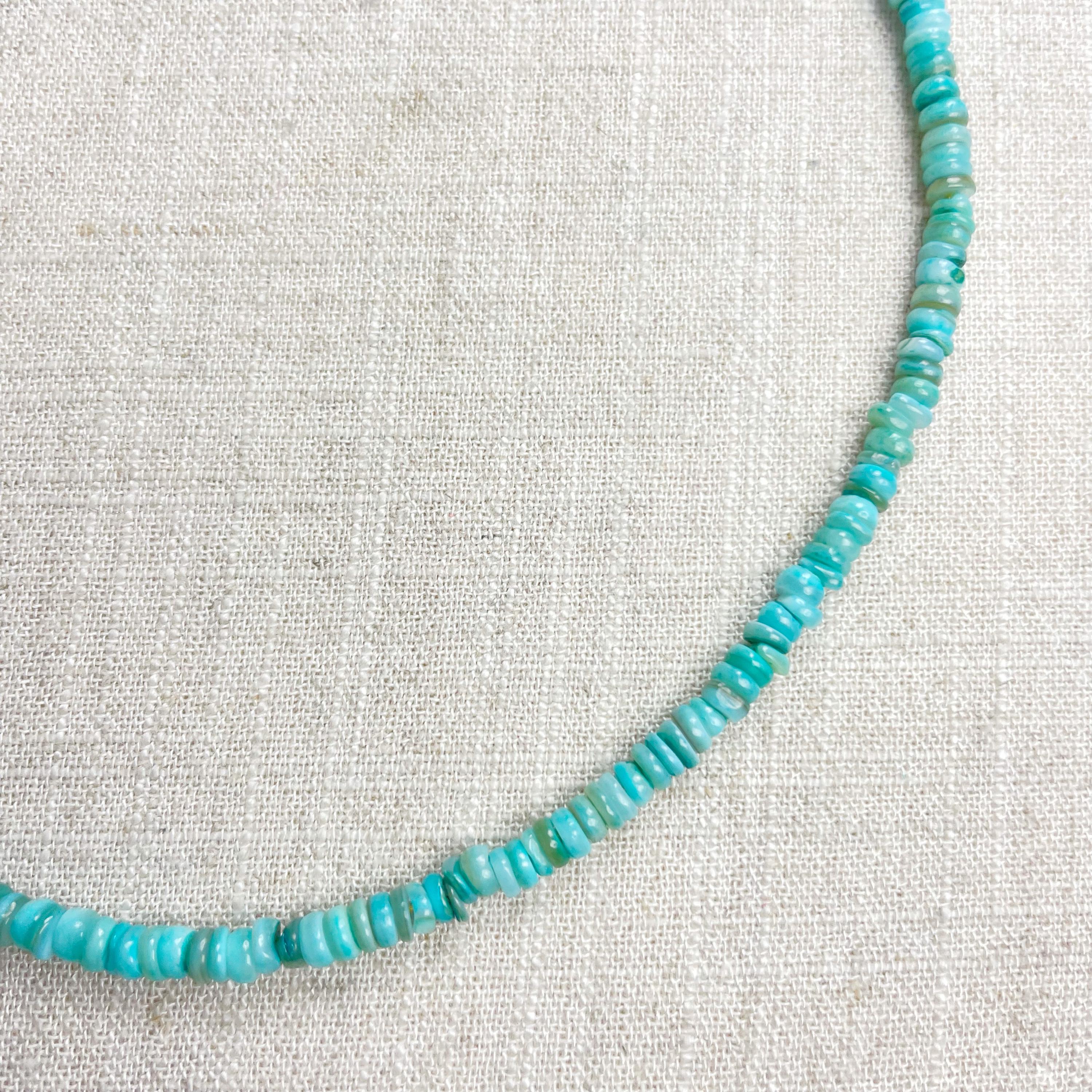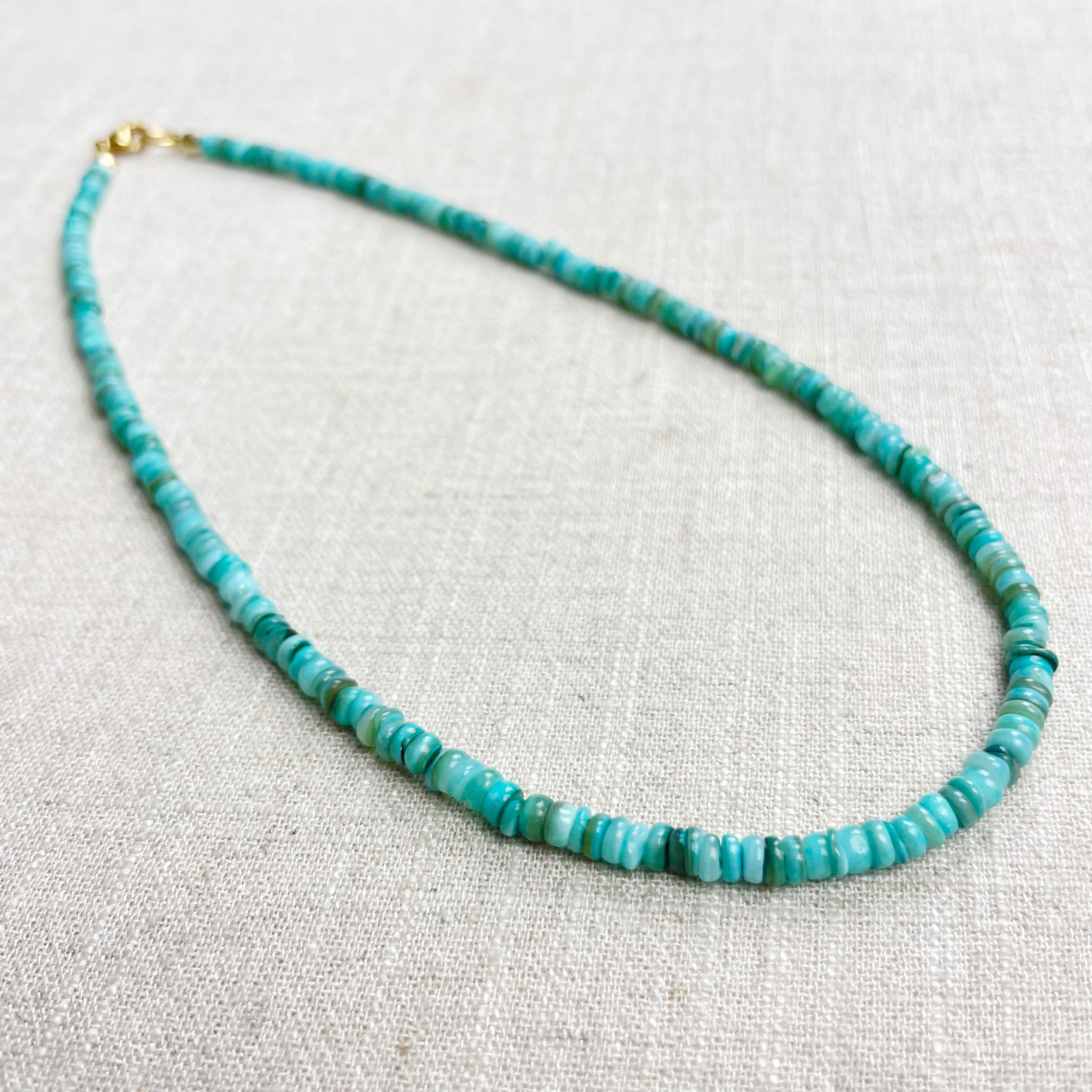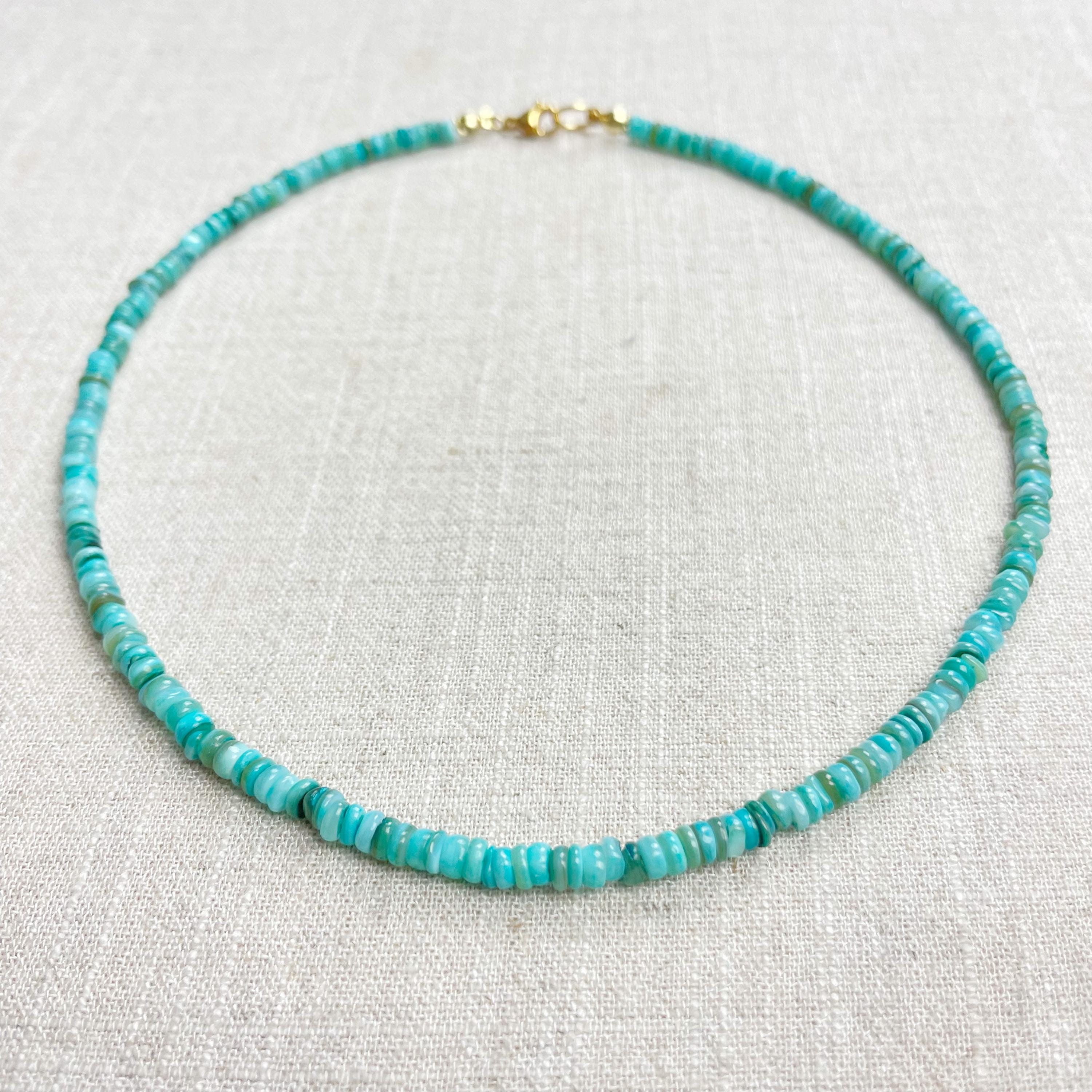 This necklace is made from beautiful shell beads which have been dyed a bright turquoise color. The beads are 4mm wide. Each necklace is strung on a stainless steel beading wire. The necklace is finished off with a gold plated stainless steel lobster clasp and a logo charm.
