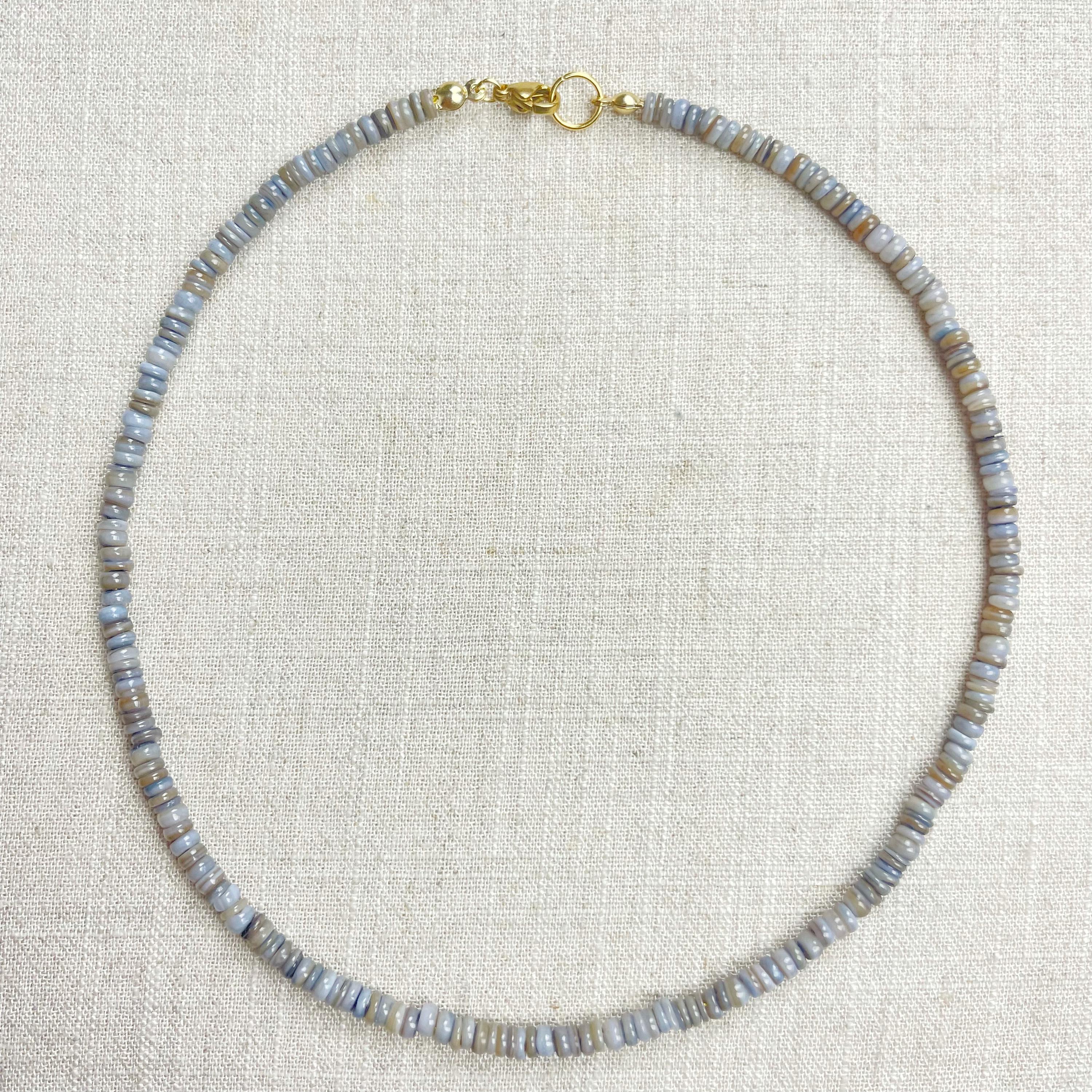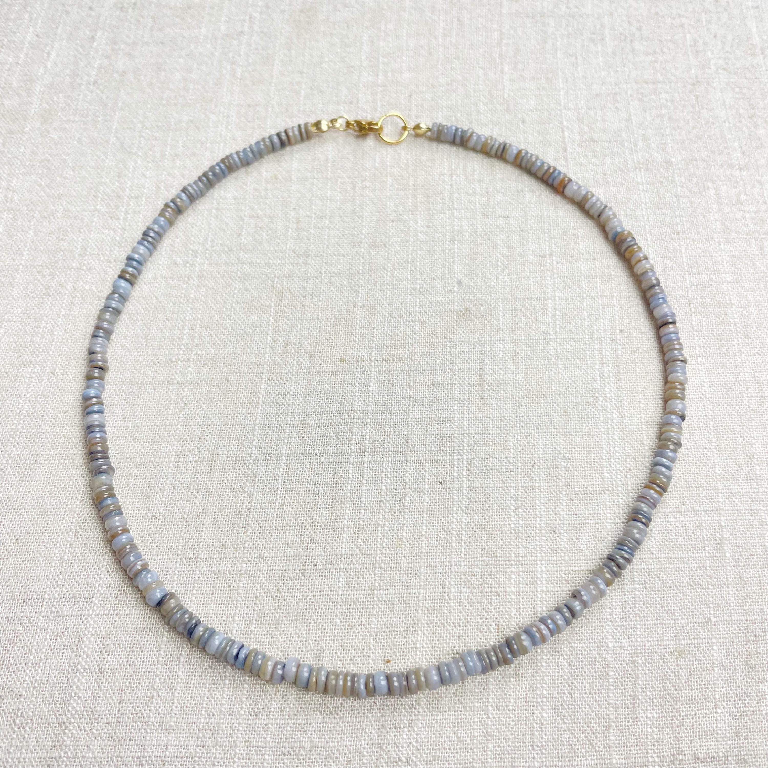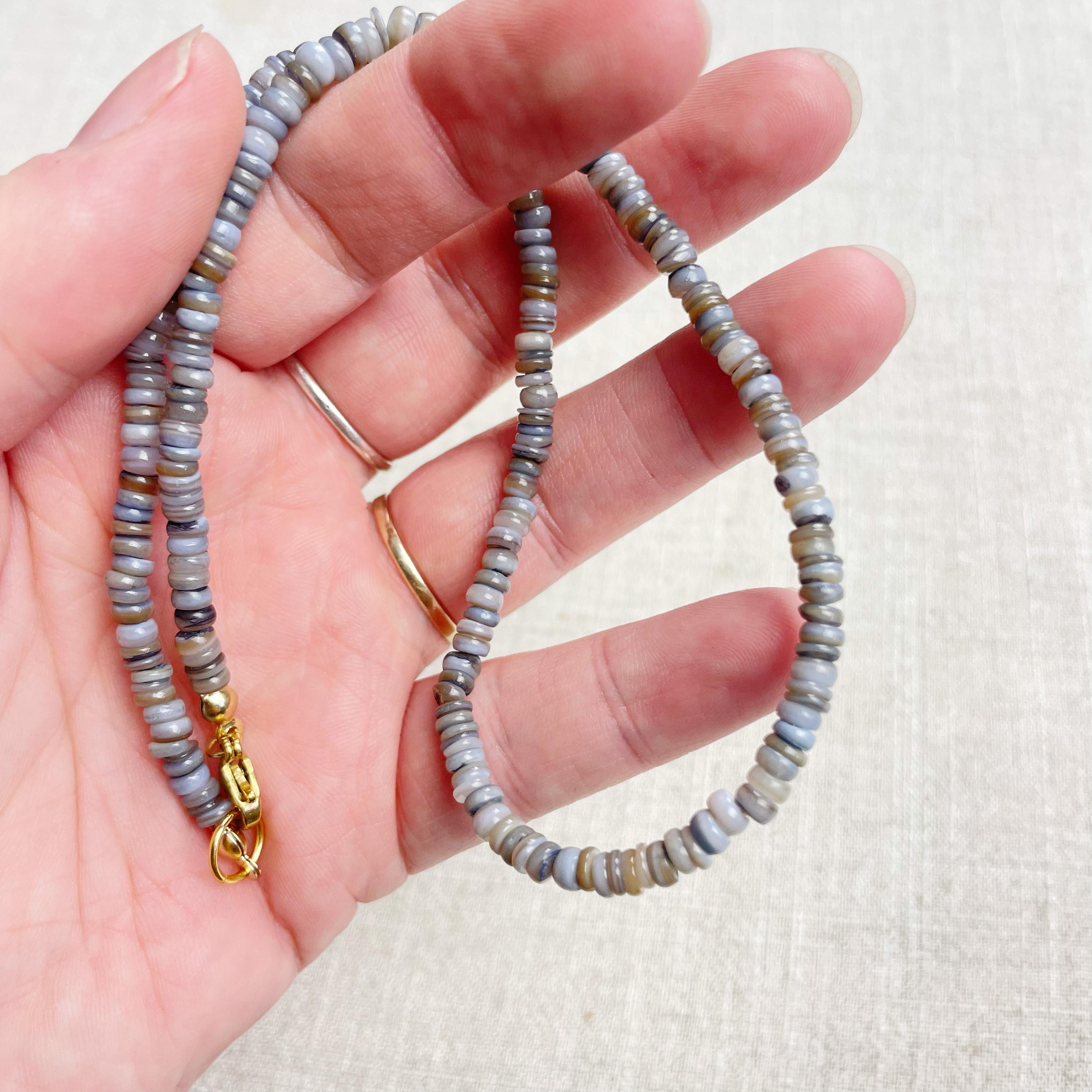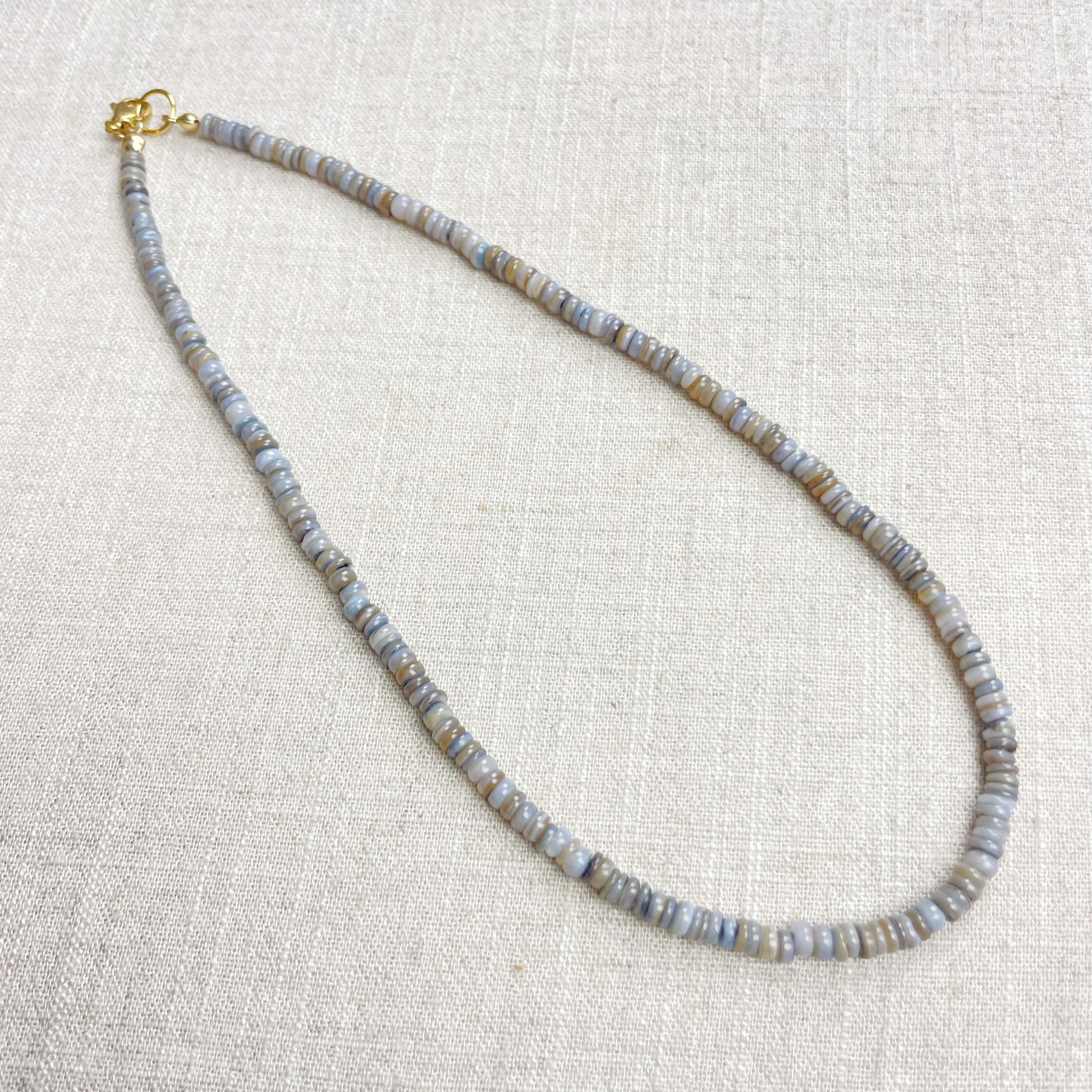 This necklace is made from beautiful shell beads which have been dyed a grey color. The beads are 4mm wide. Each necklace is strung on a stainless steel beading wire. The necklace is finished off with a gold plated stainless steel lobster clasp and a logo charm.