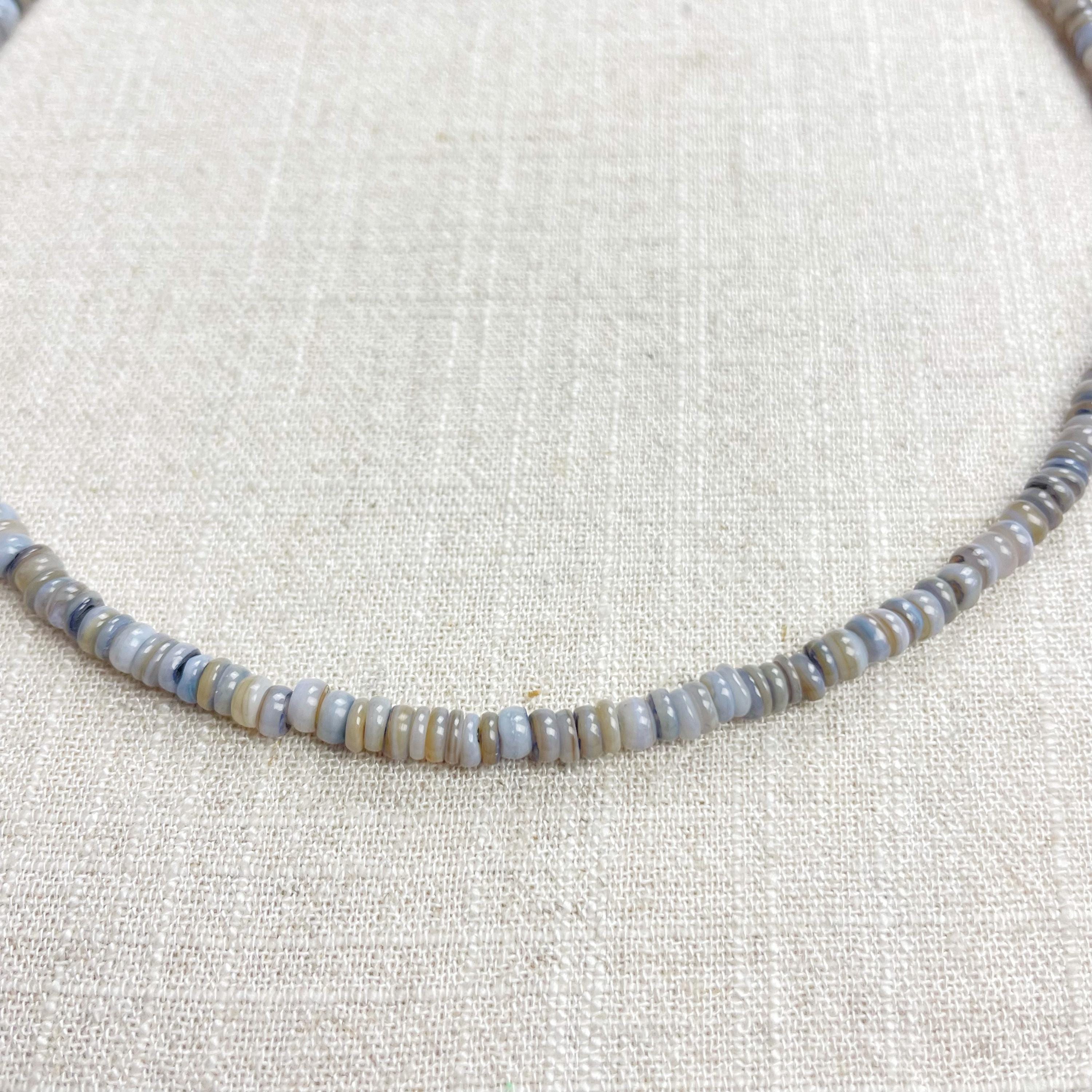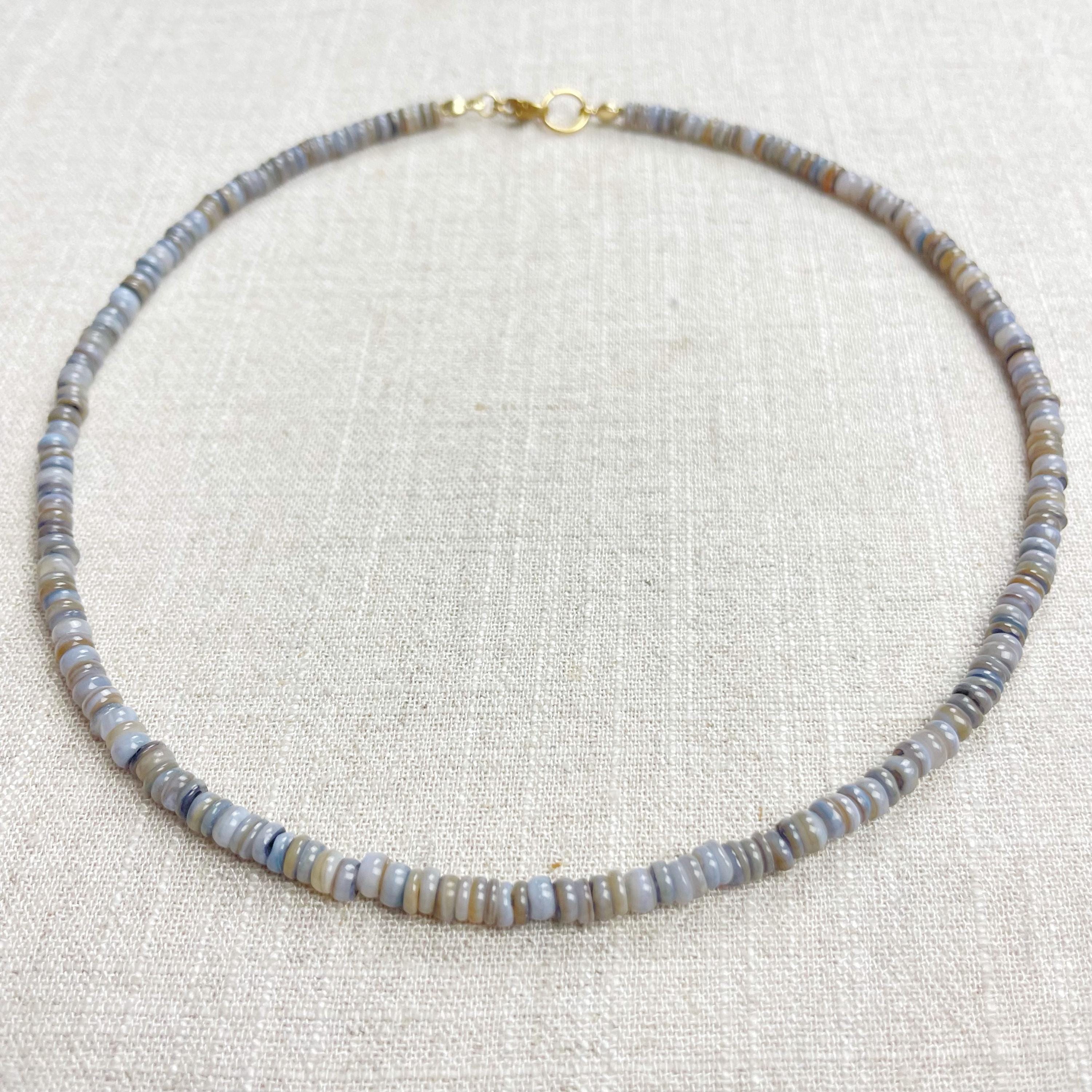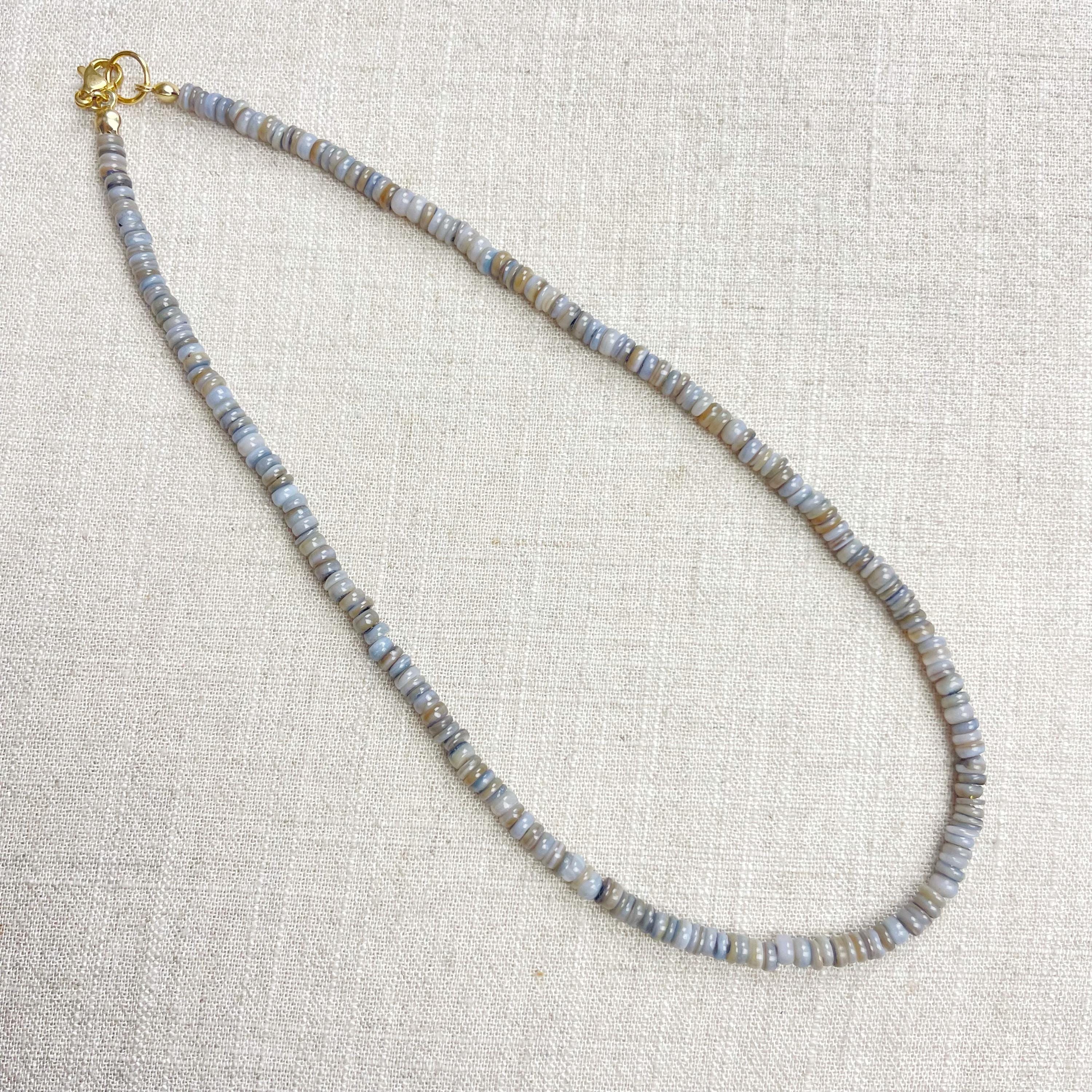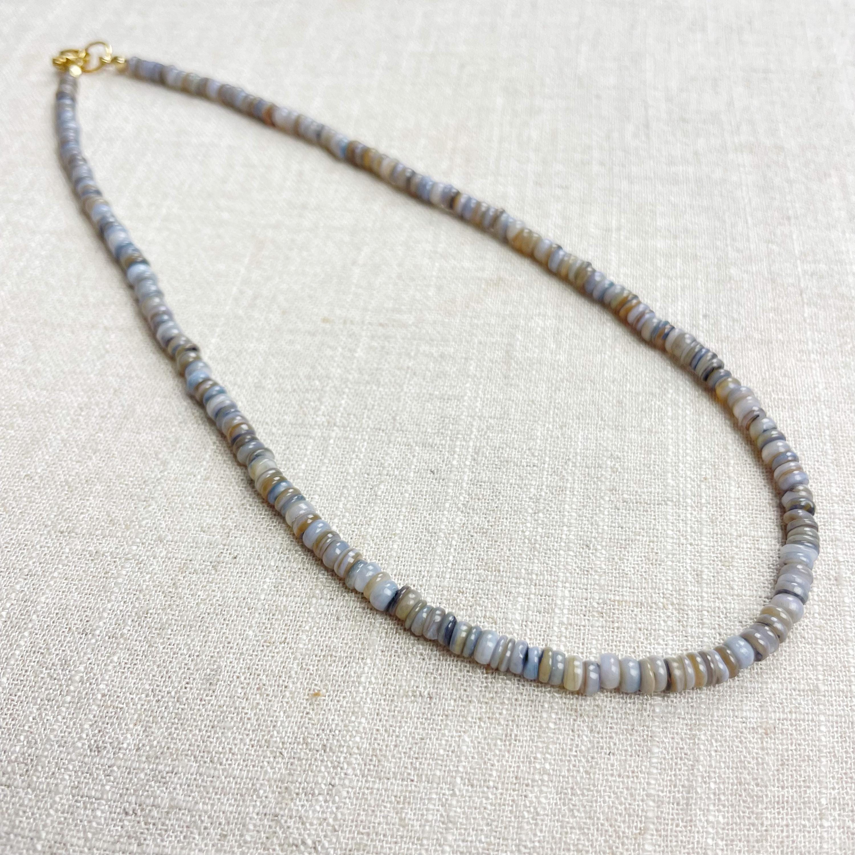 This necklace is made from beautiful shell beads which have been dyed a grey color. The beads are 4mm wide. Each necklace is strung on a stainless steel beading wire. The necklace is finished off with a gold plated stainless steel lobster clasp and a logo charm.