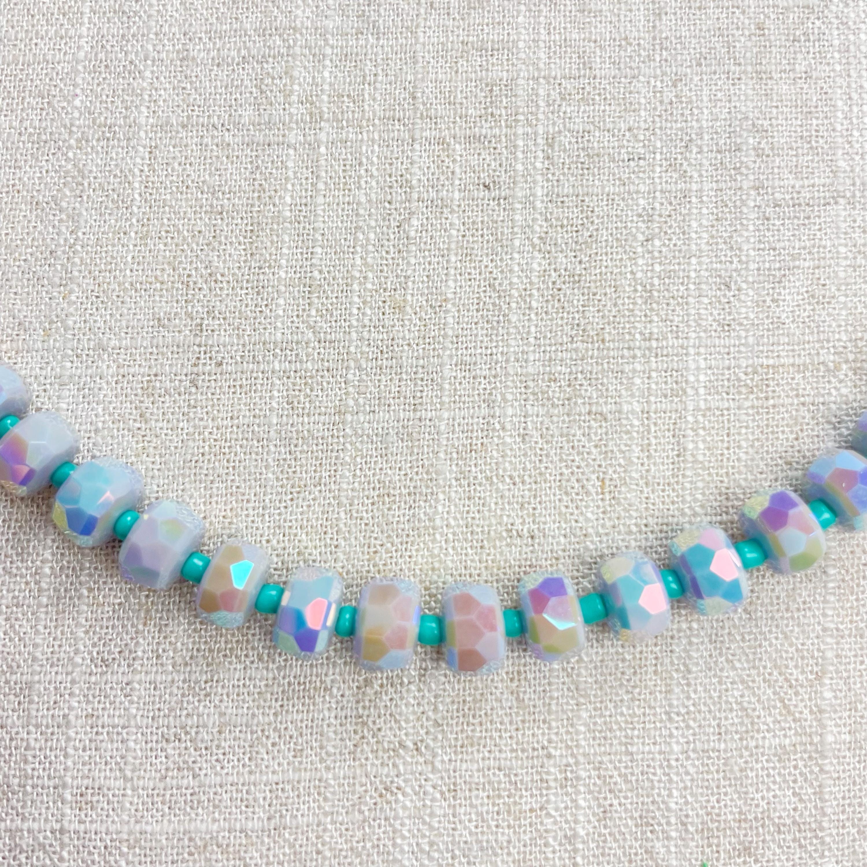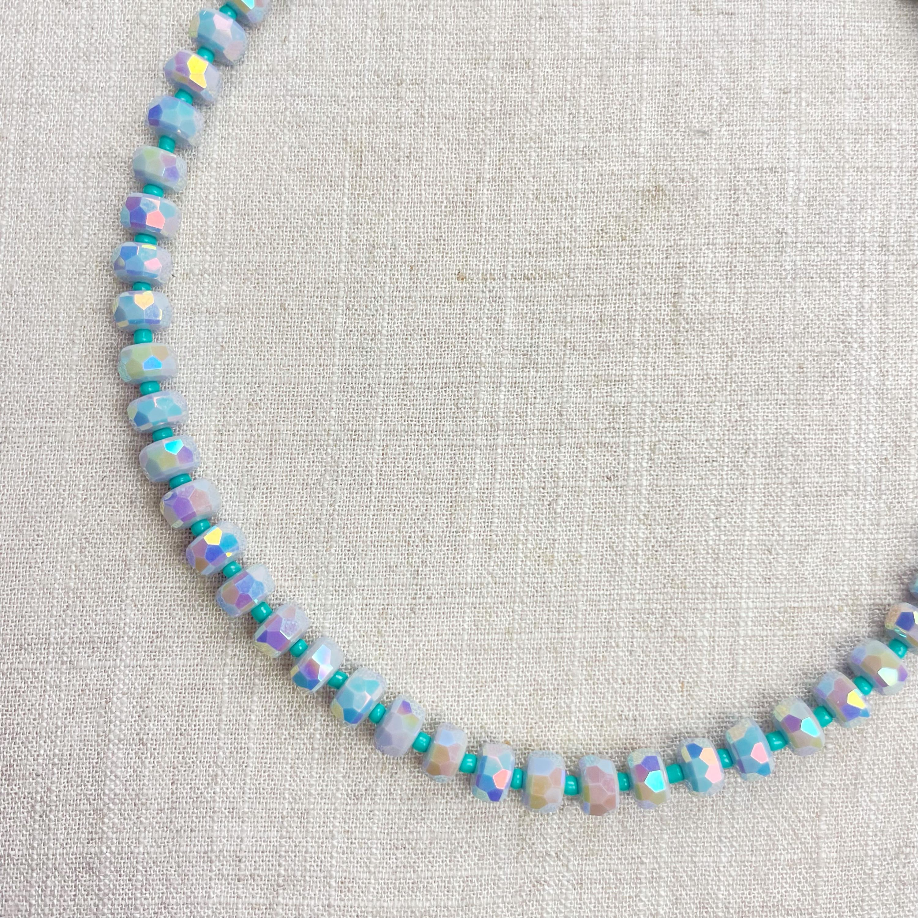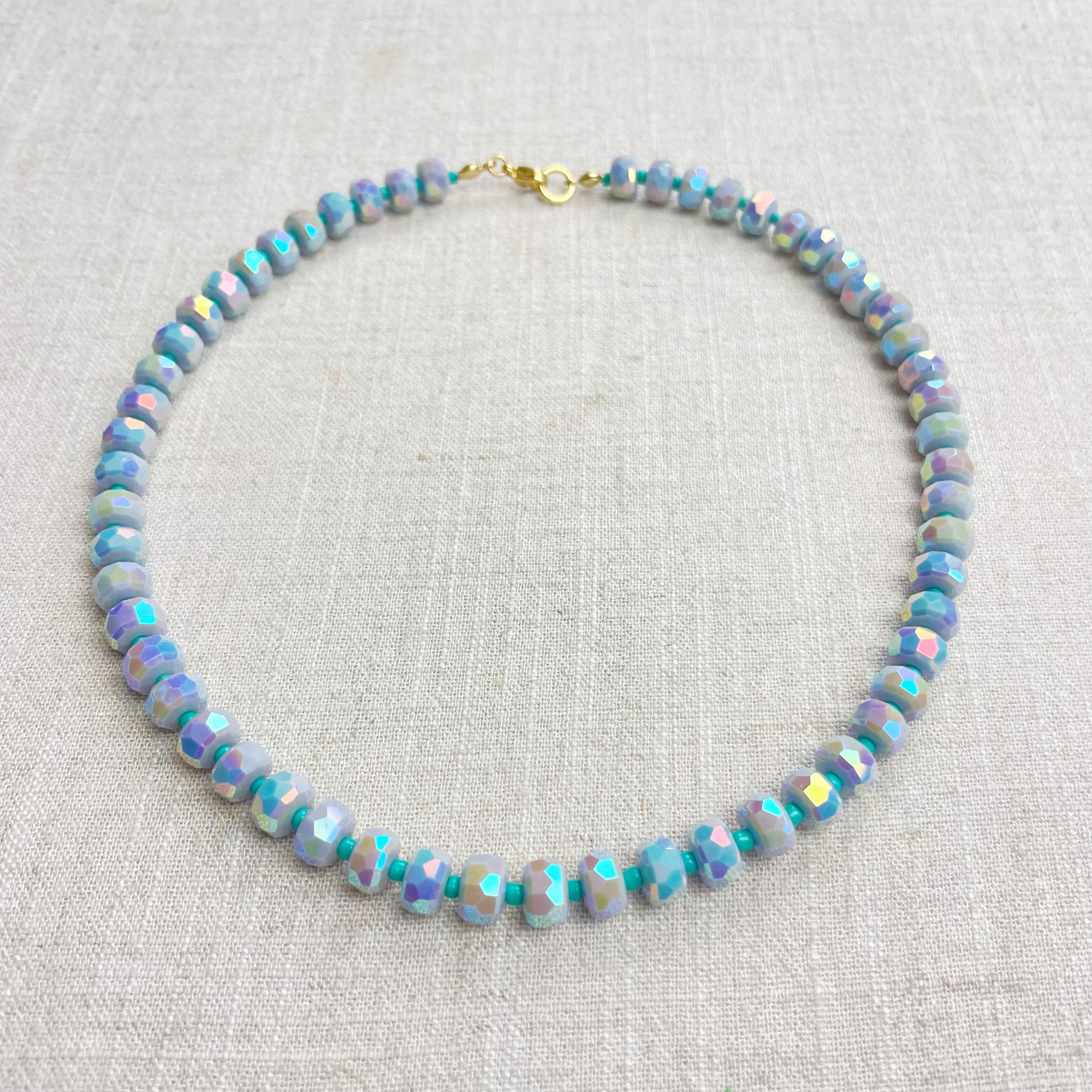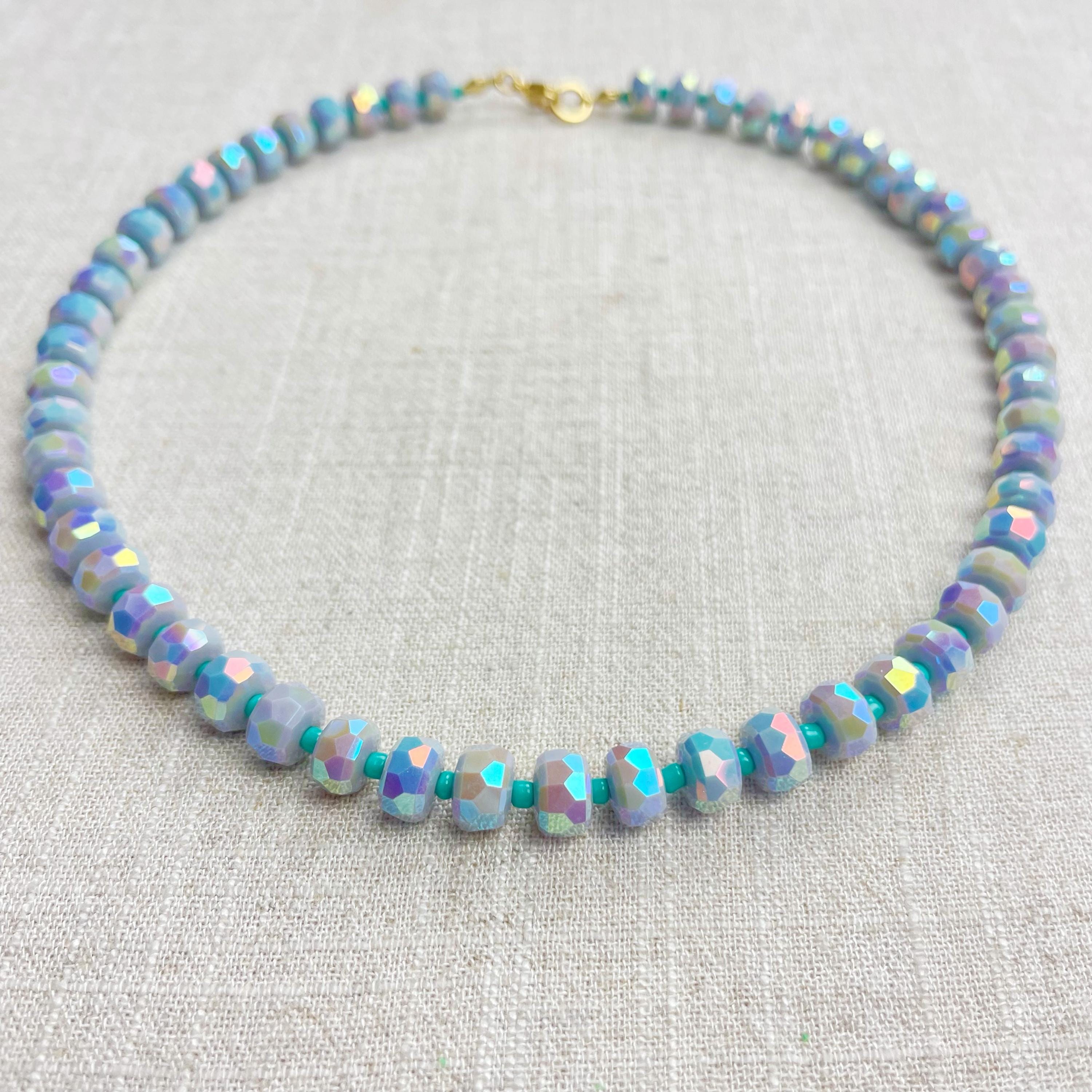 This necklace is made from beautiful czech glass faceted beads which have an iridescent coloring. Small glass seed beads are between the large beads. The czech glass beads are 8mm. Each necklace is strung on a stainless steel beading wire. The necklace is finished off with a gold plated stainless steel lobster clasp and a logo charm.