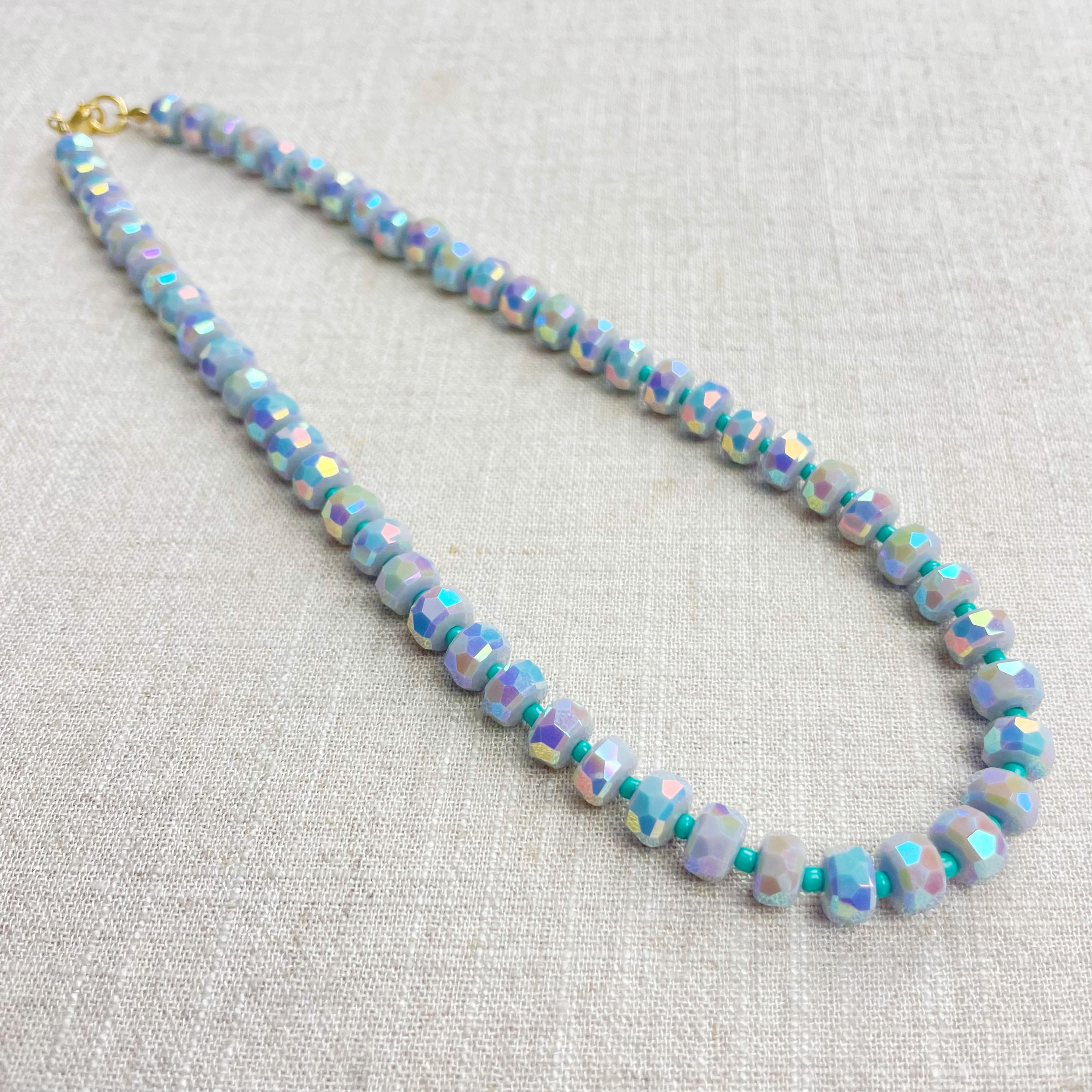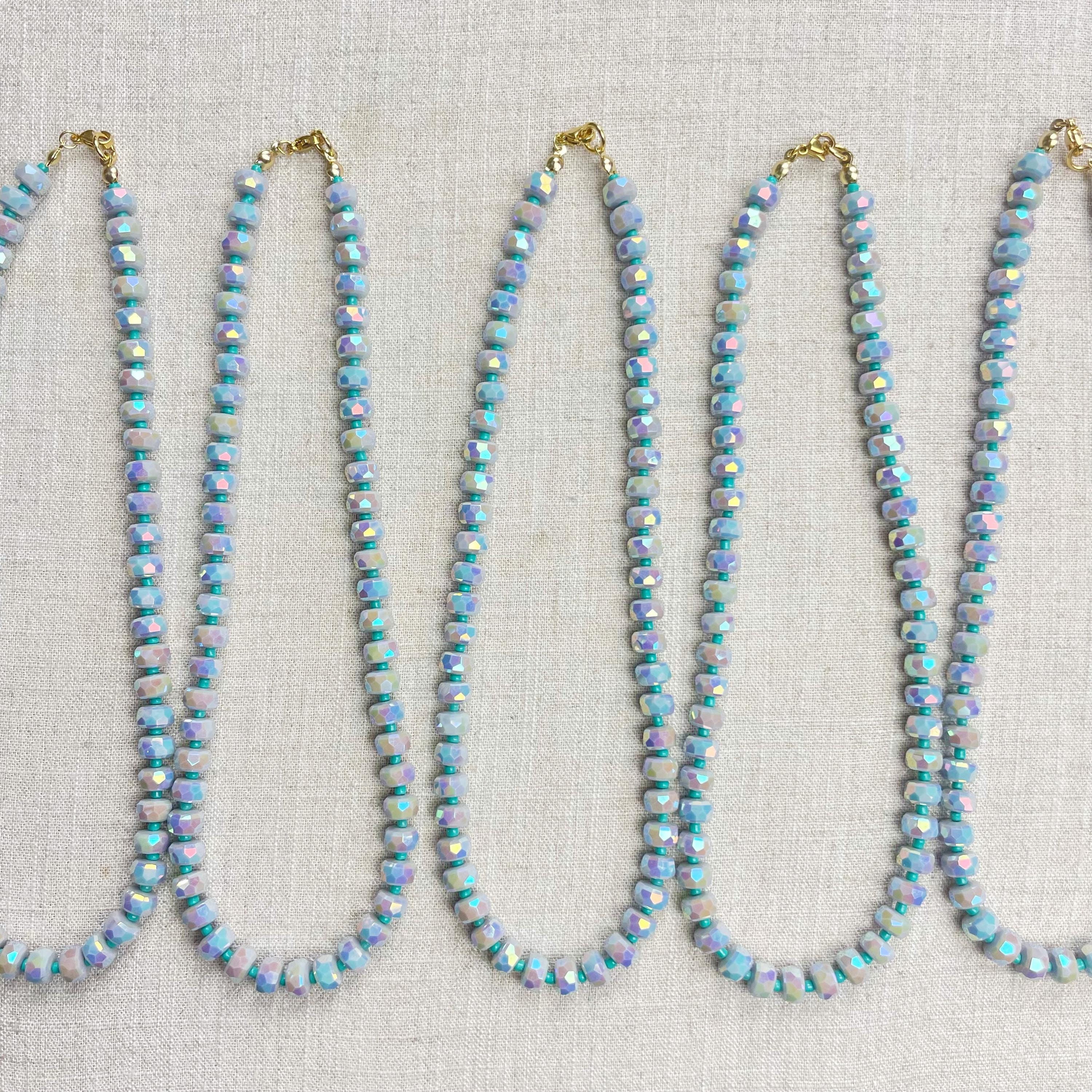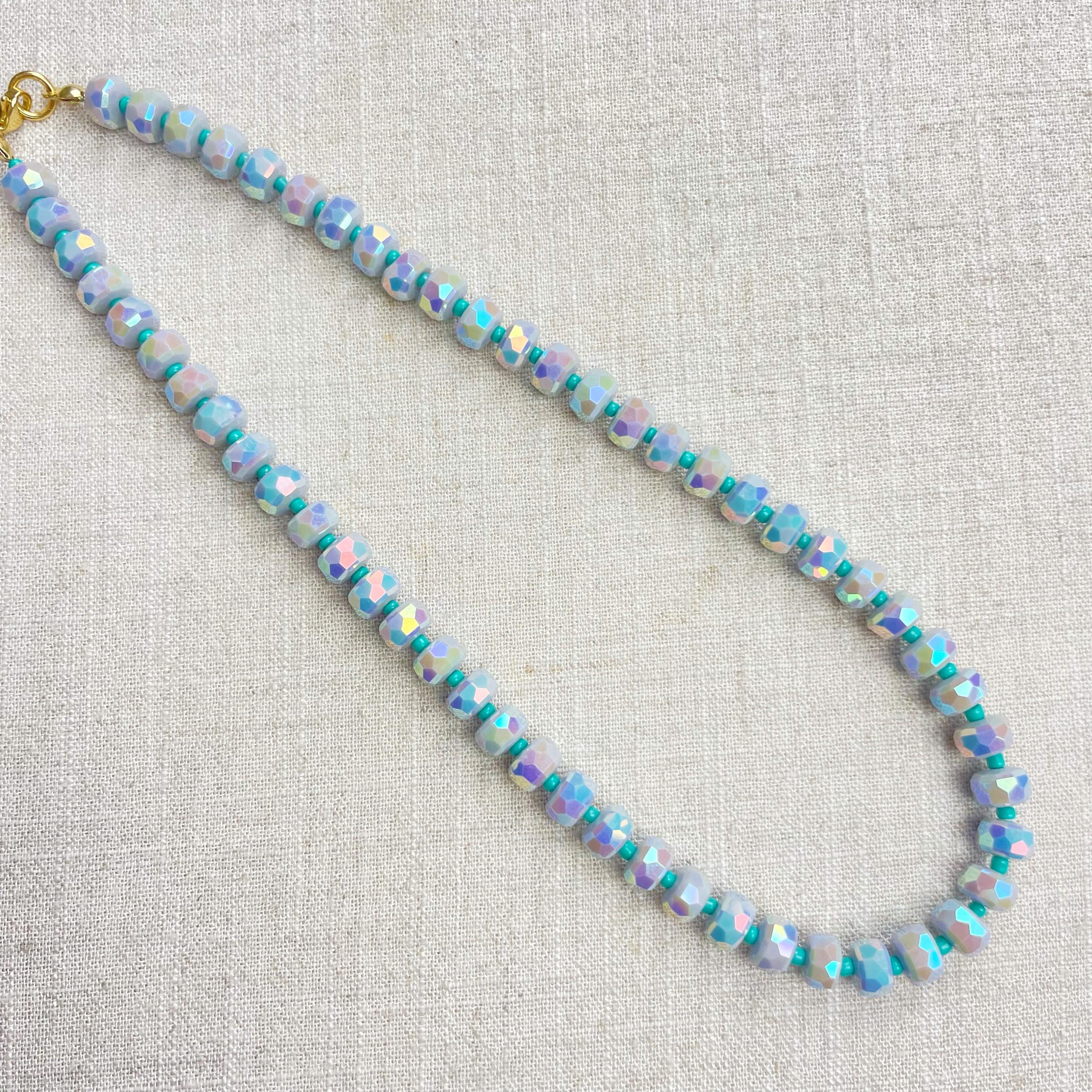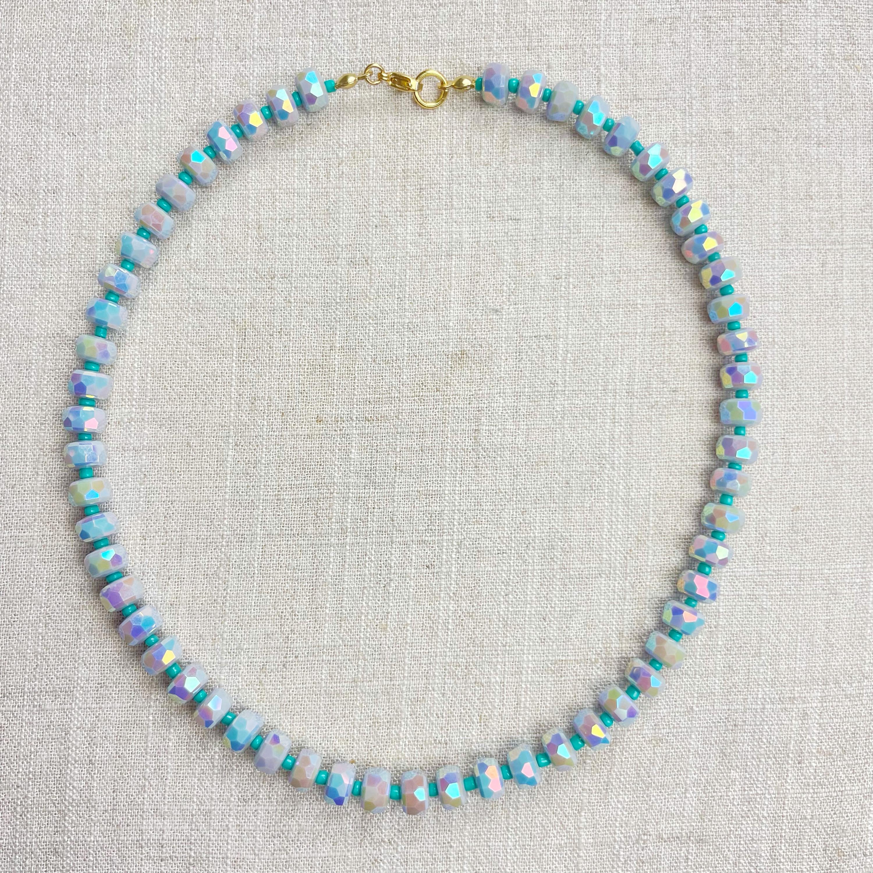 This necklace is made from beautiful czech glass faceted beads which have an iridescent coloring. Small glass seed beads are between the large beads. The czech glass beads are 8mm. Each necklace is strung on a stainless steel beading wire. The necklace is finished off with a gold plated stainless steel lobster clasp and a logo charm.