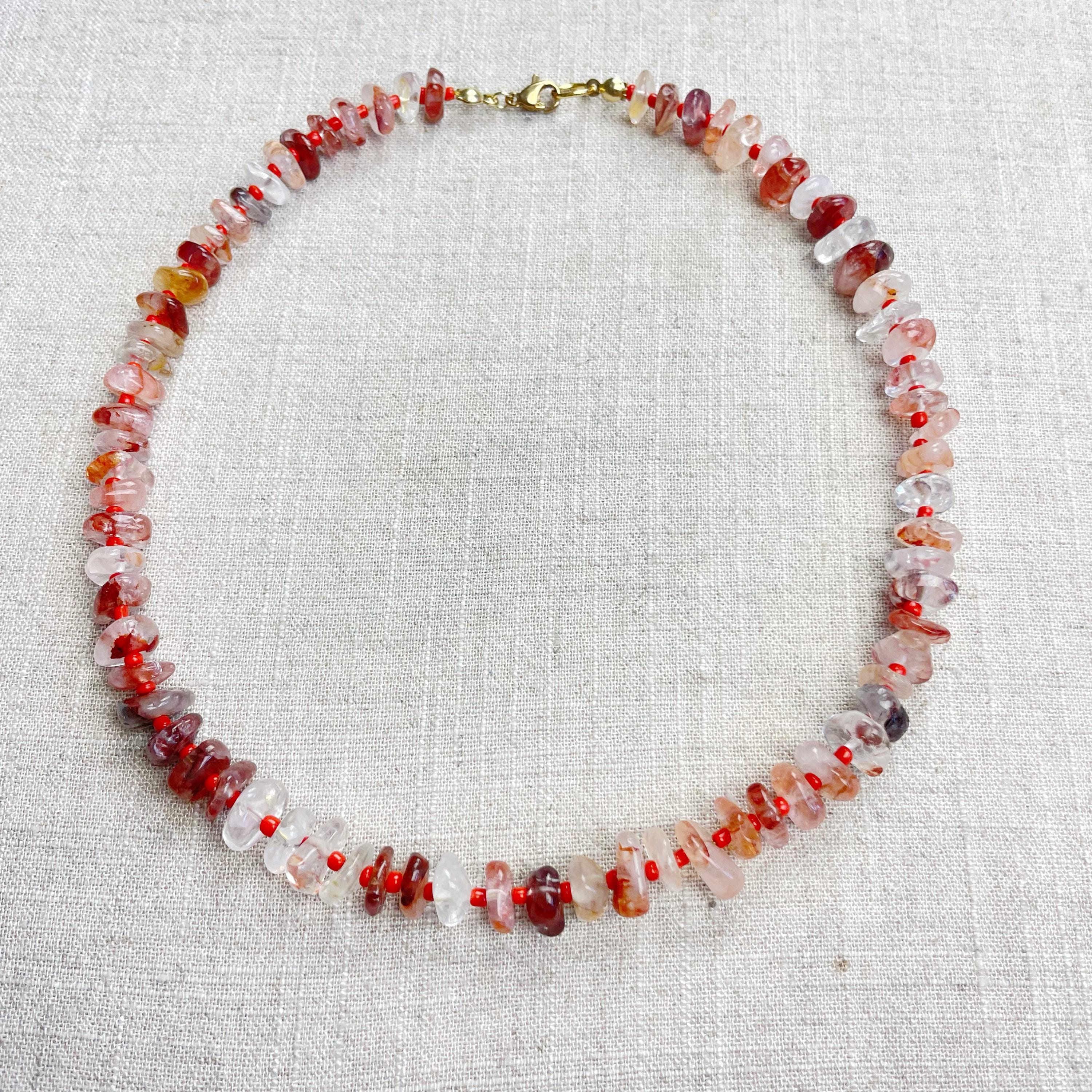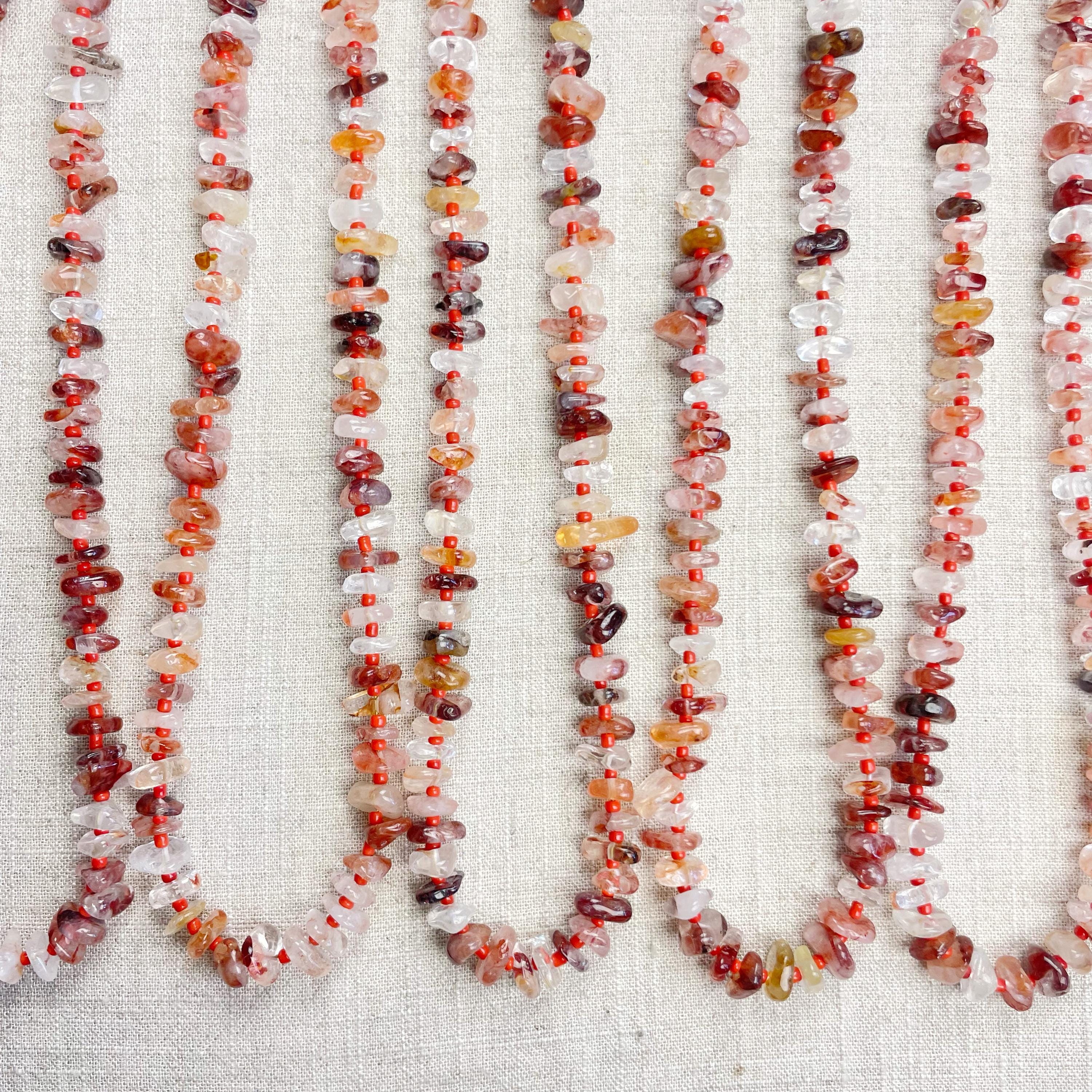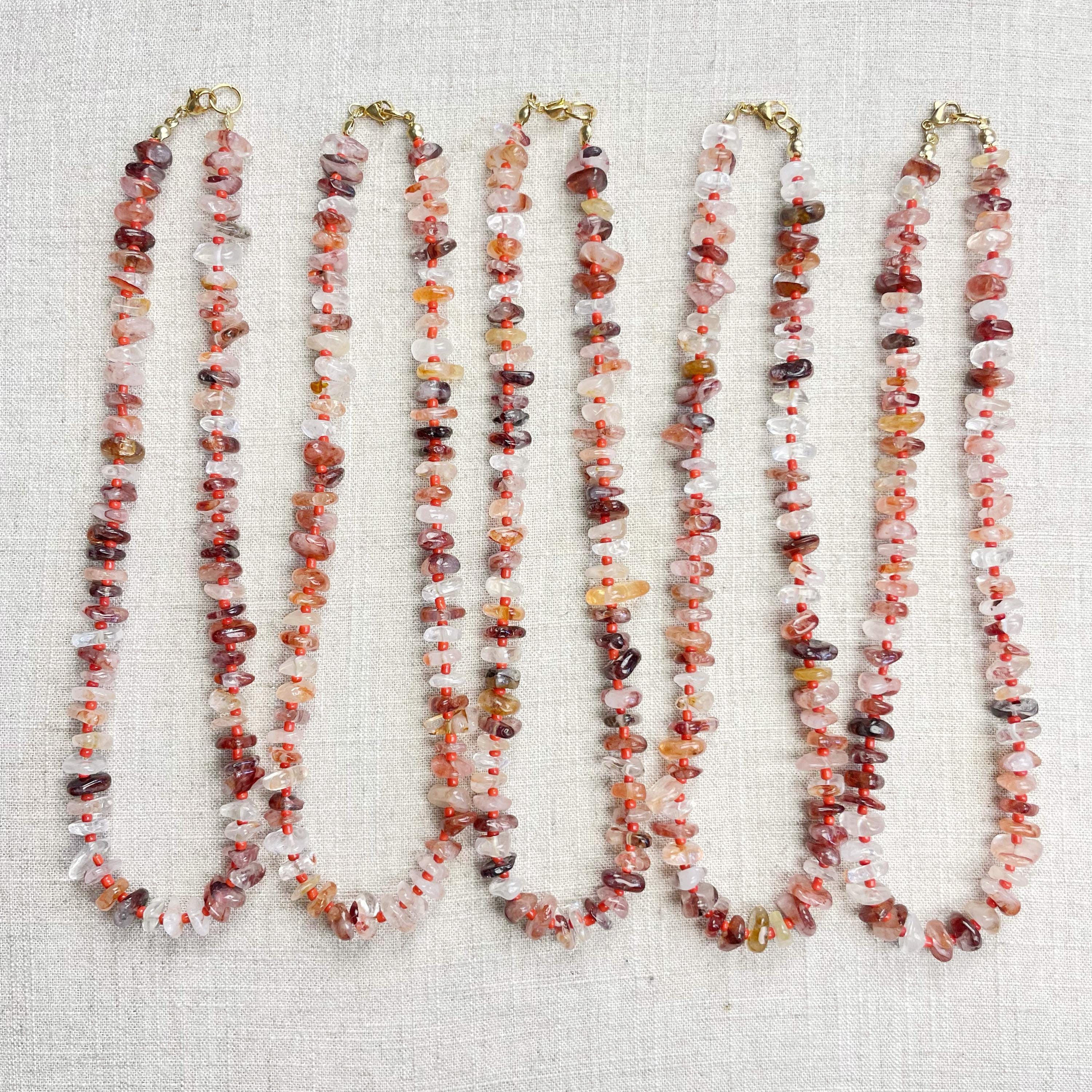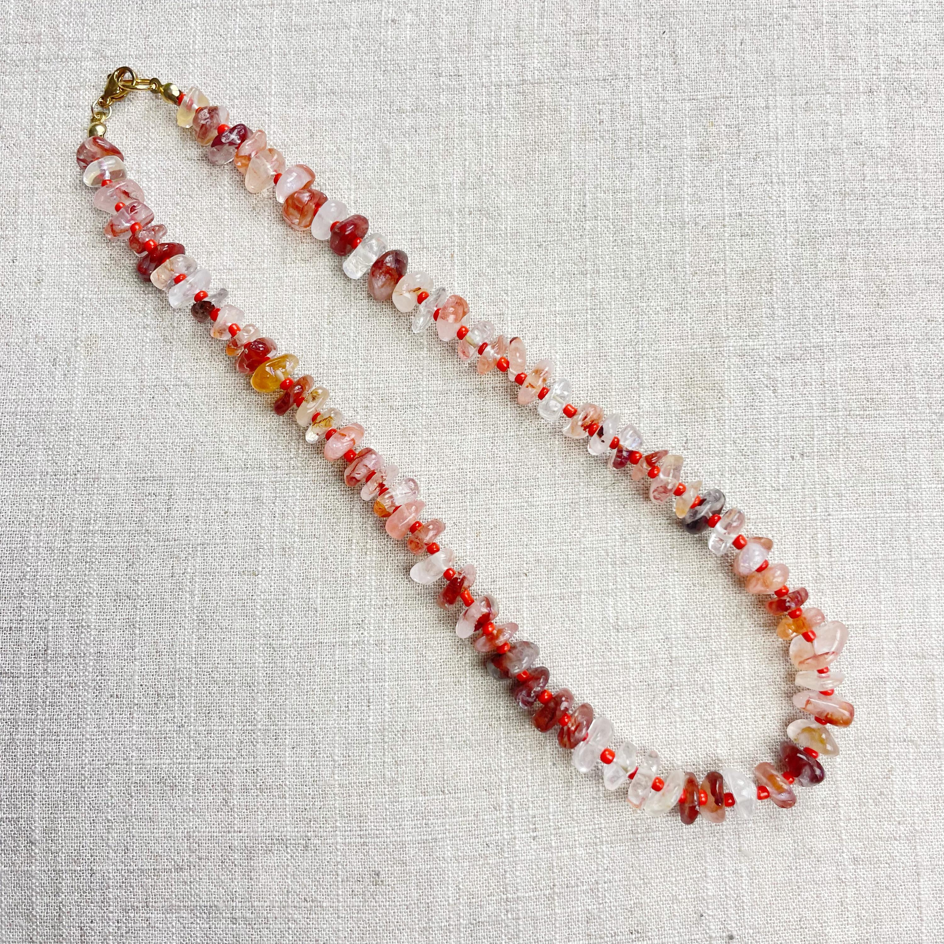 This necklace is made from beautiful chip beads. The chip beads are red fire quartz which makes each bead unique and once of a kind in inclusions and coloring. Tiny glass seed beads are between each bead to give some color and spacer between the chip beads. Each necklace is strung on a stainless steel beading wire. The necklace is finished off with a gold plated stainless steel lobster clasp and a logo charm.