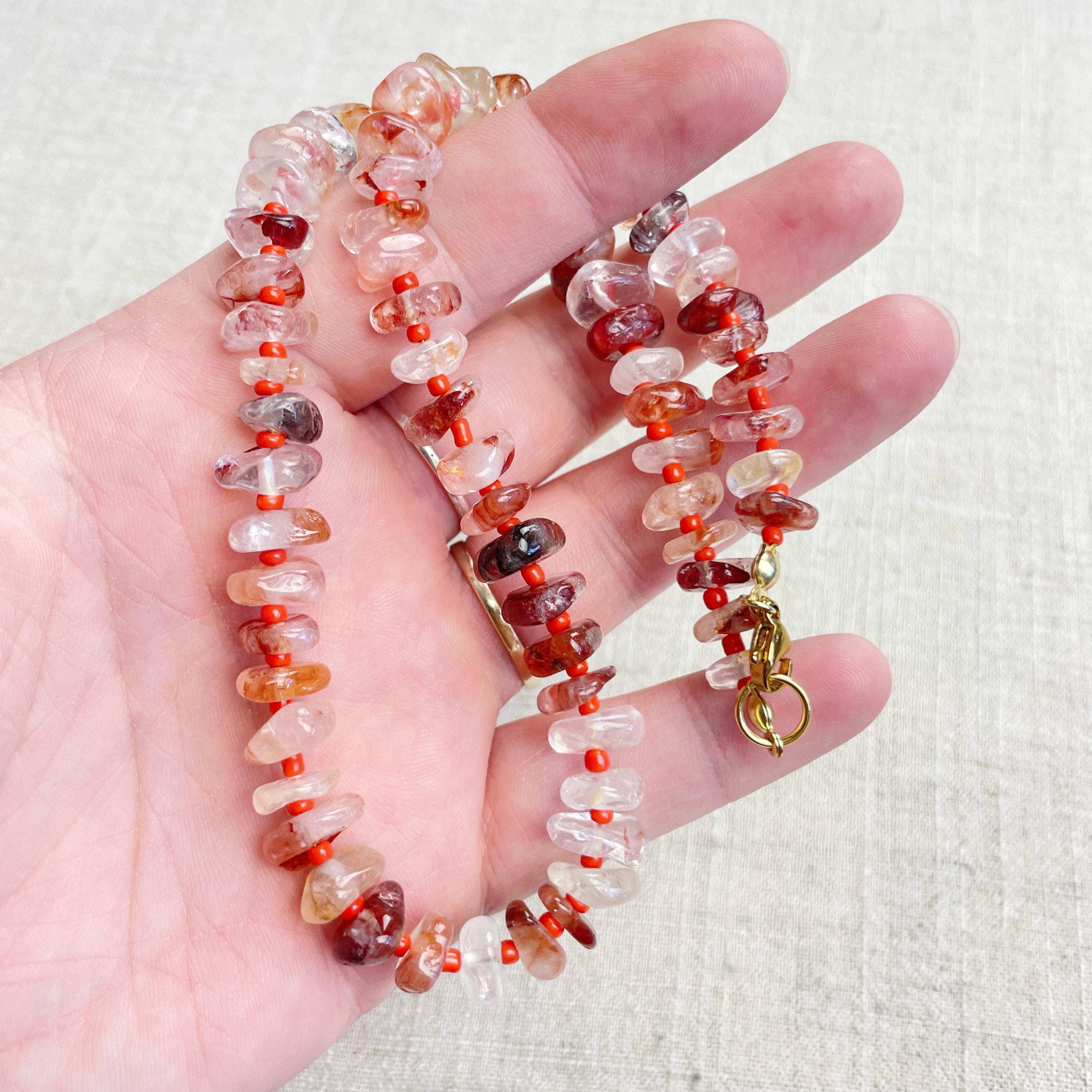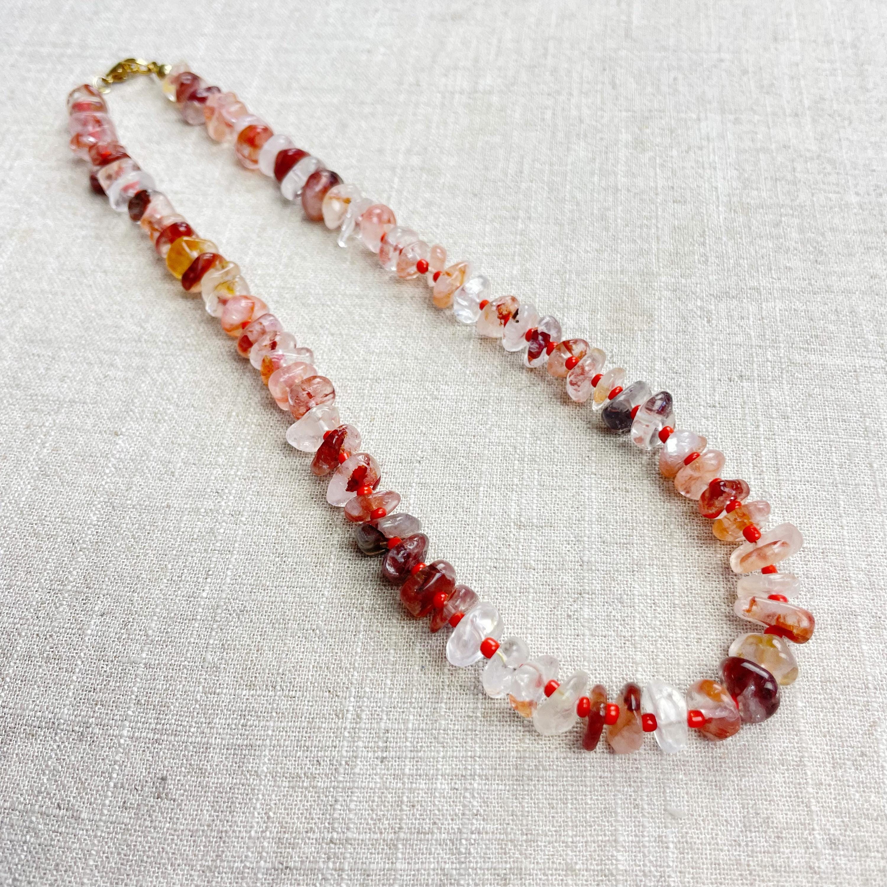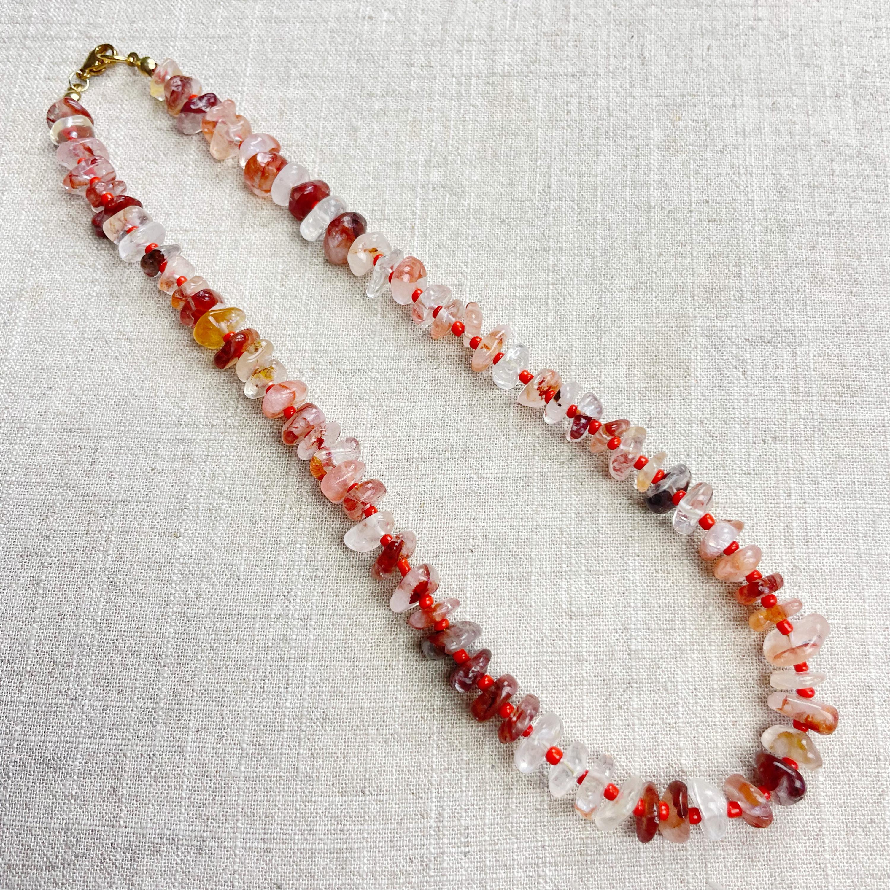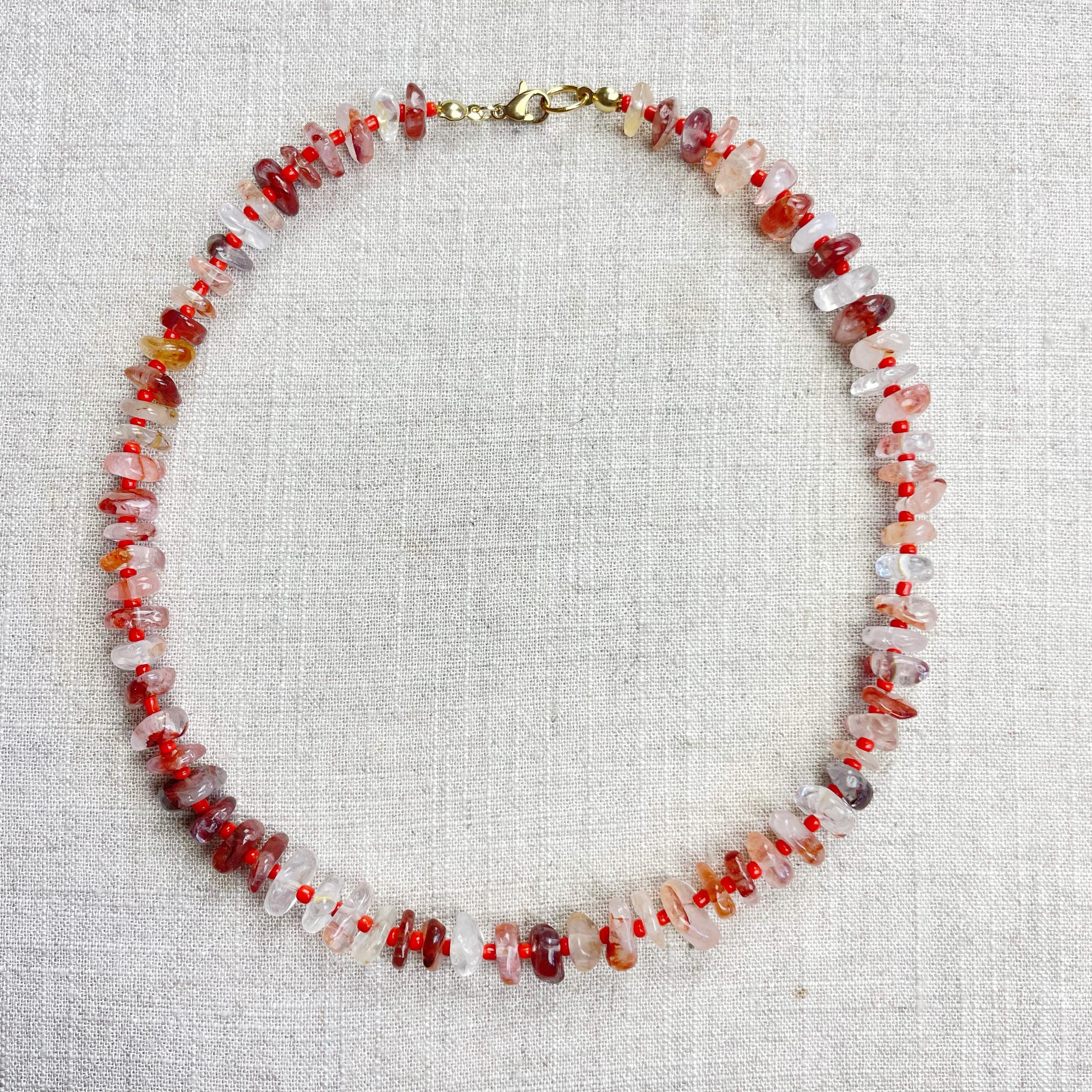 This necklace is made from beautiful chip beads. The chip beads are red fire quartz which makes each bead unique and once of a kind in inclusions and coloring. Tiny glass seed beads are between each bead to give some color and spacer between the chip beads. Each necklace is strung on a stainless steel beading wire. The necklace is finished off with a gold plated stainless steel lobster clasp and a logo charm.