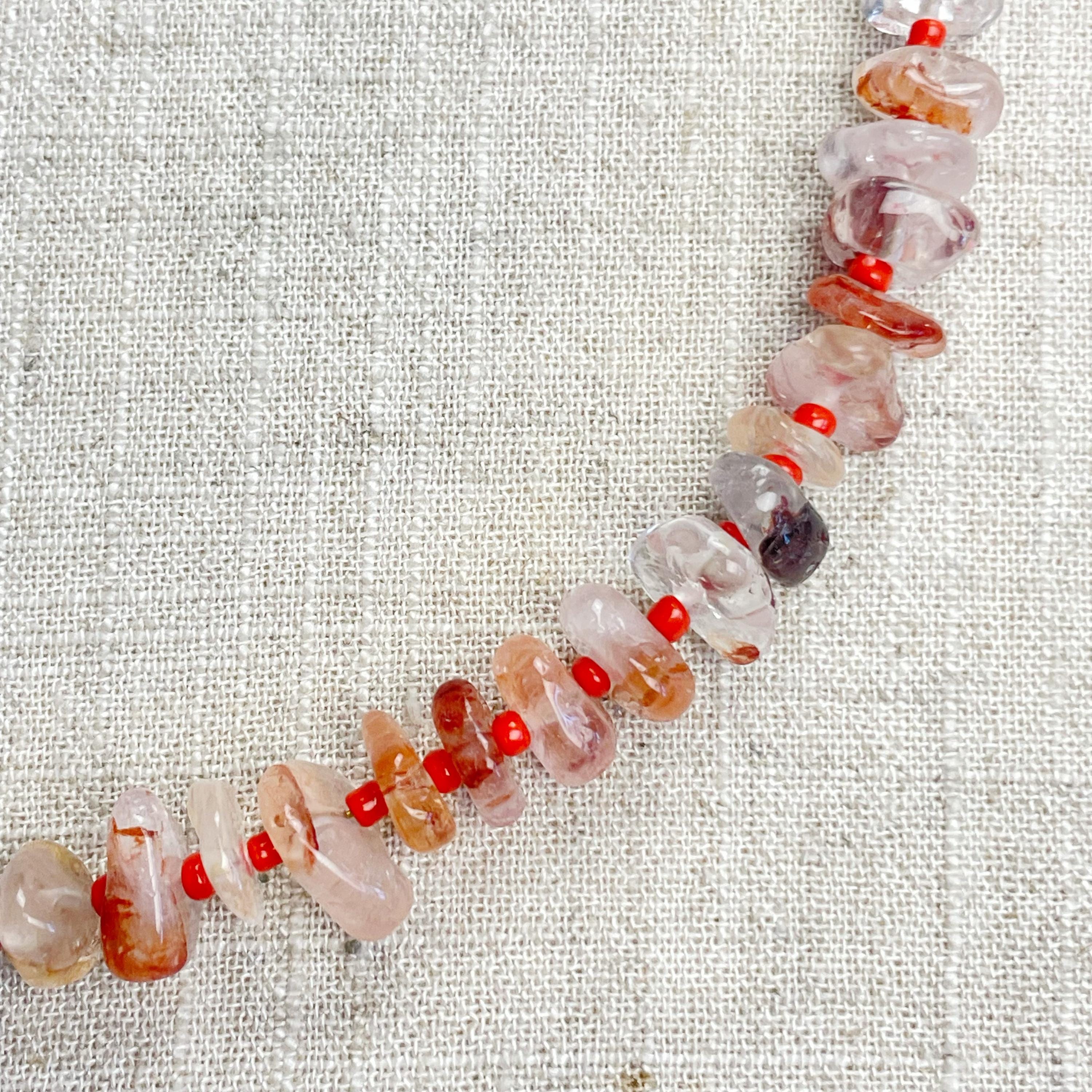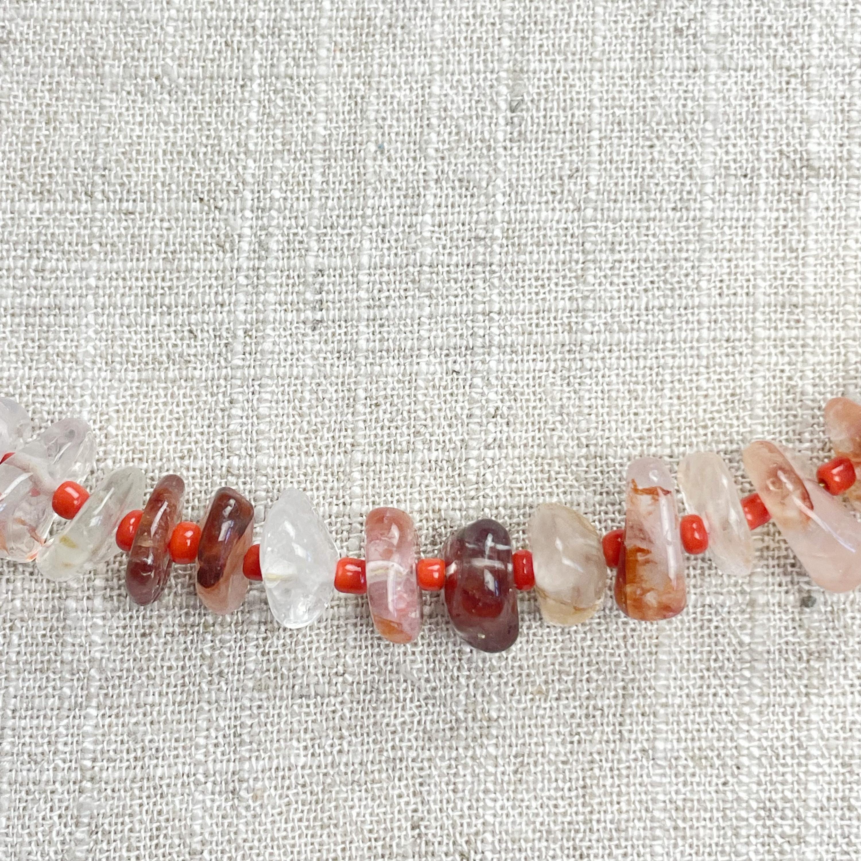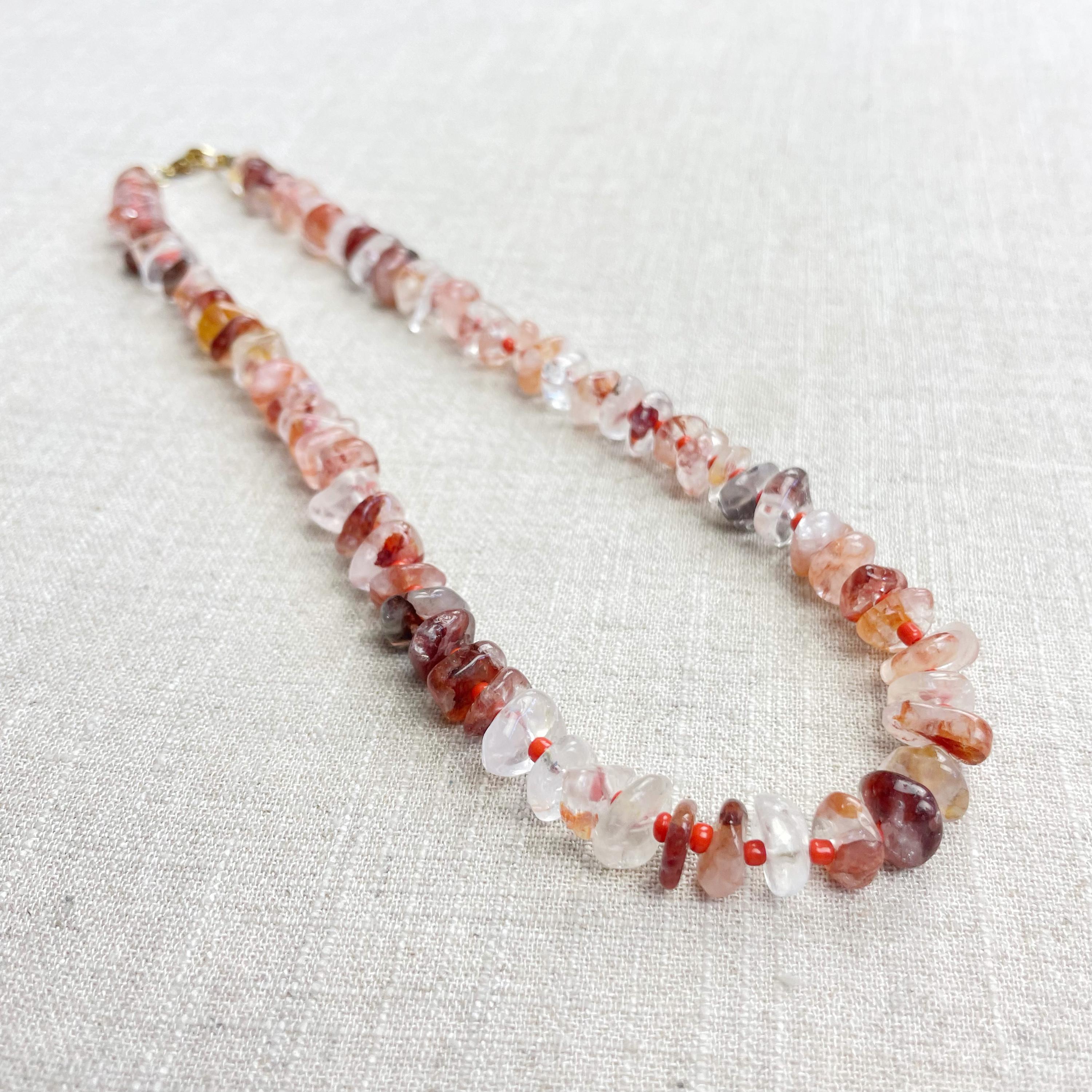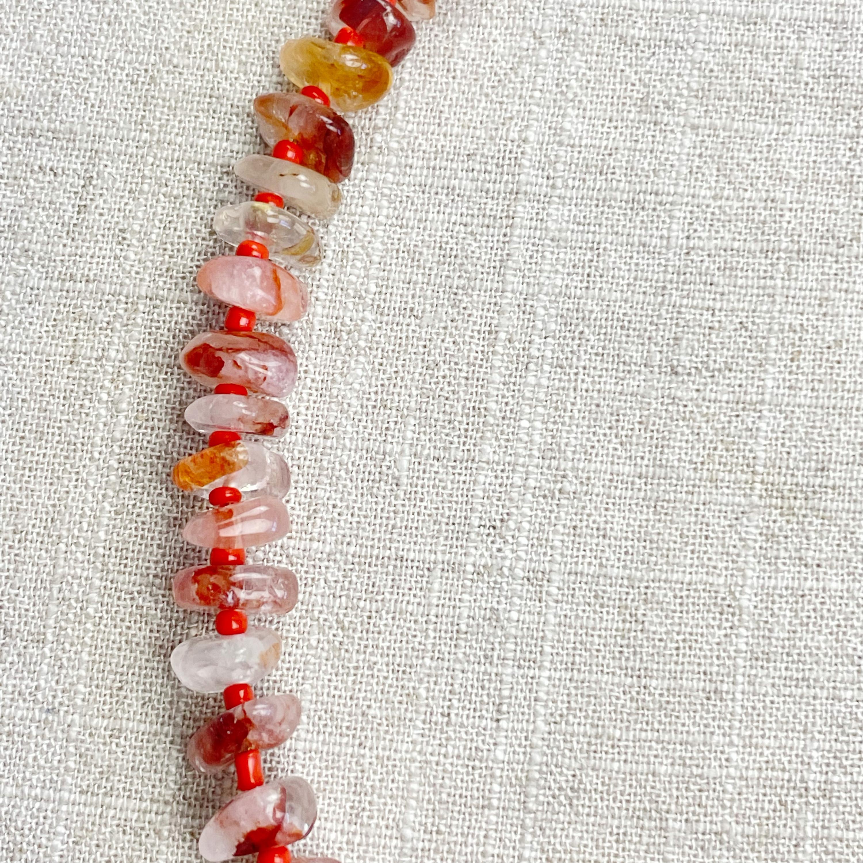 This necklace is made from beautiful chip beads. The chip beads are red fire quartz which makes each bead unique and once of a kind in inclusions and coloring. Tiny glass seed beads are between each bead to give some color and spacer between the chip beads. Each necklace is strung on a stainless steel beading wire. The necklace is finished off with a gold plated stainless steel lobster clasp and a logo charm.