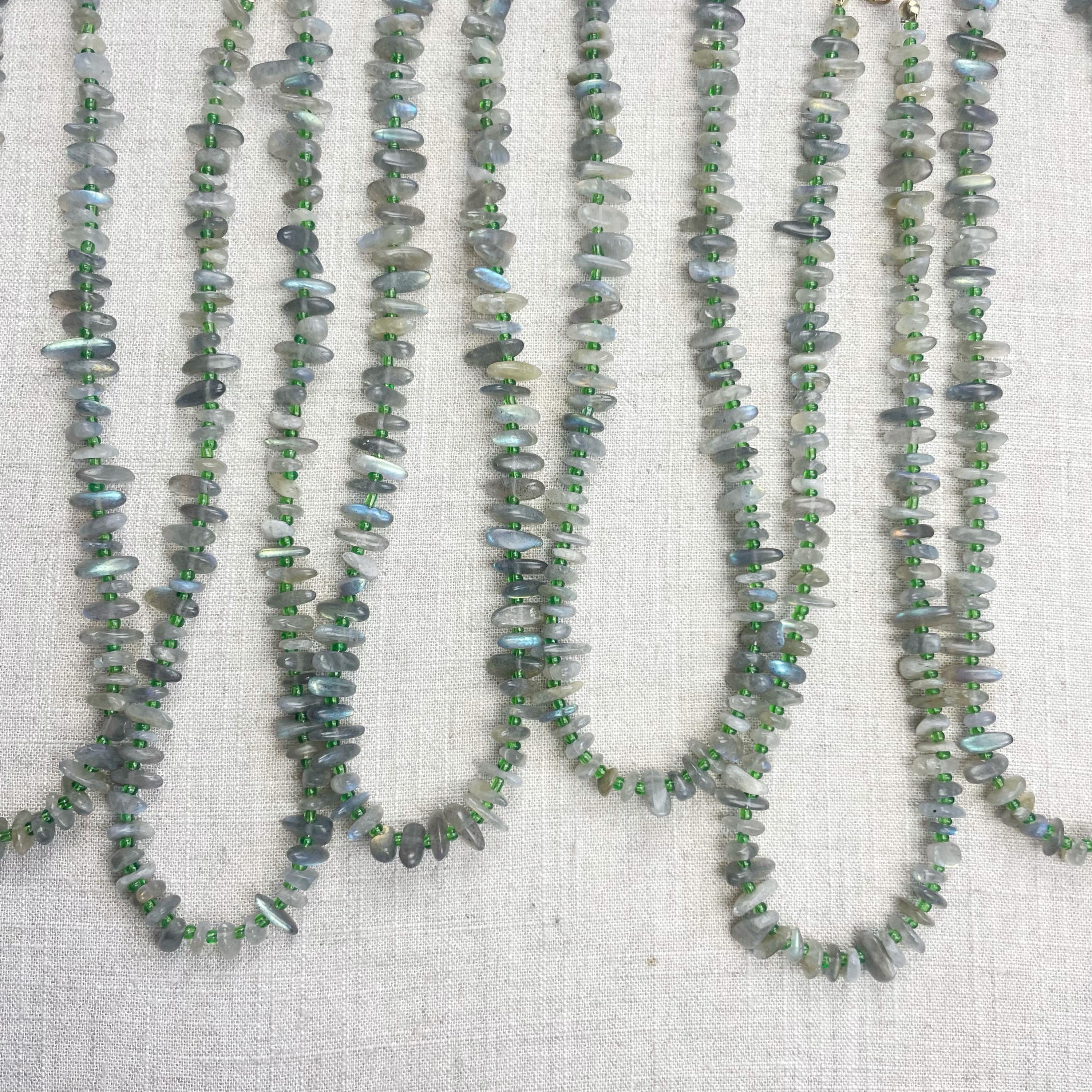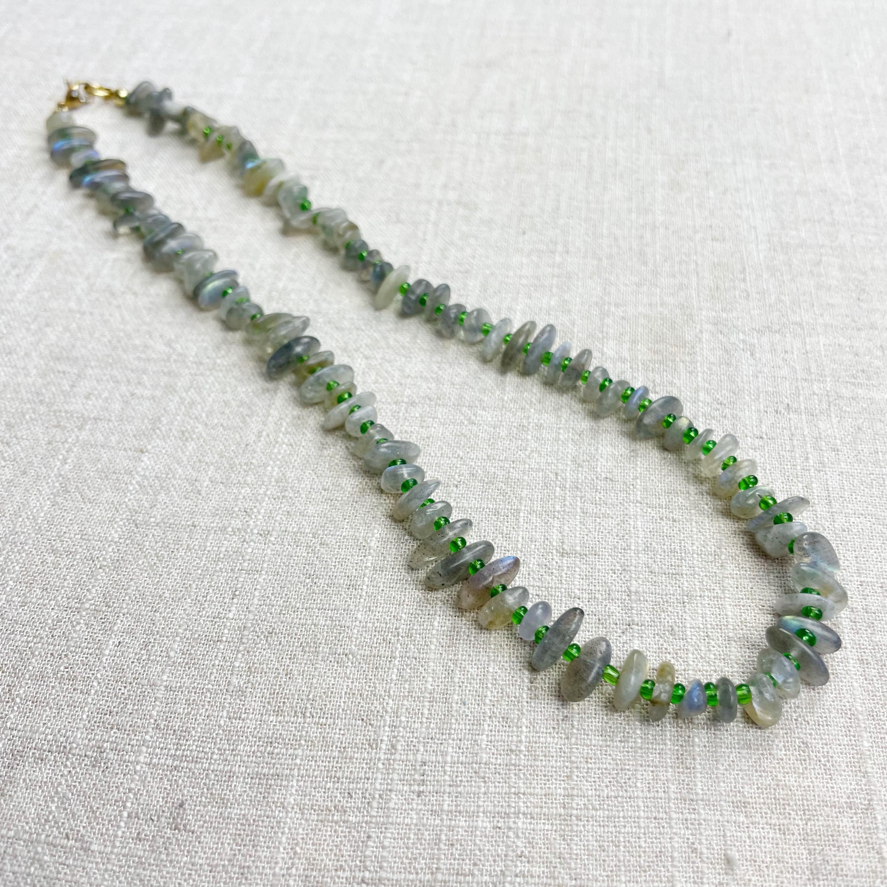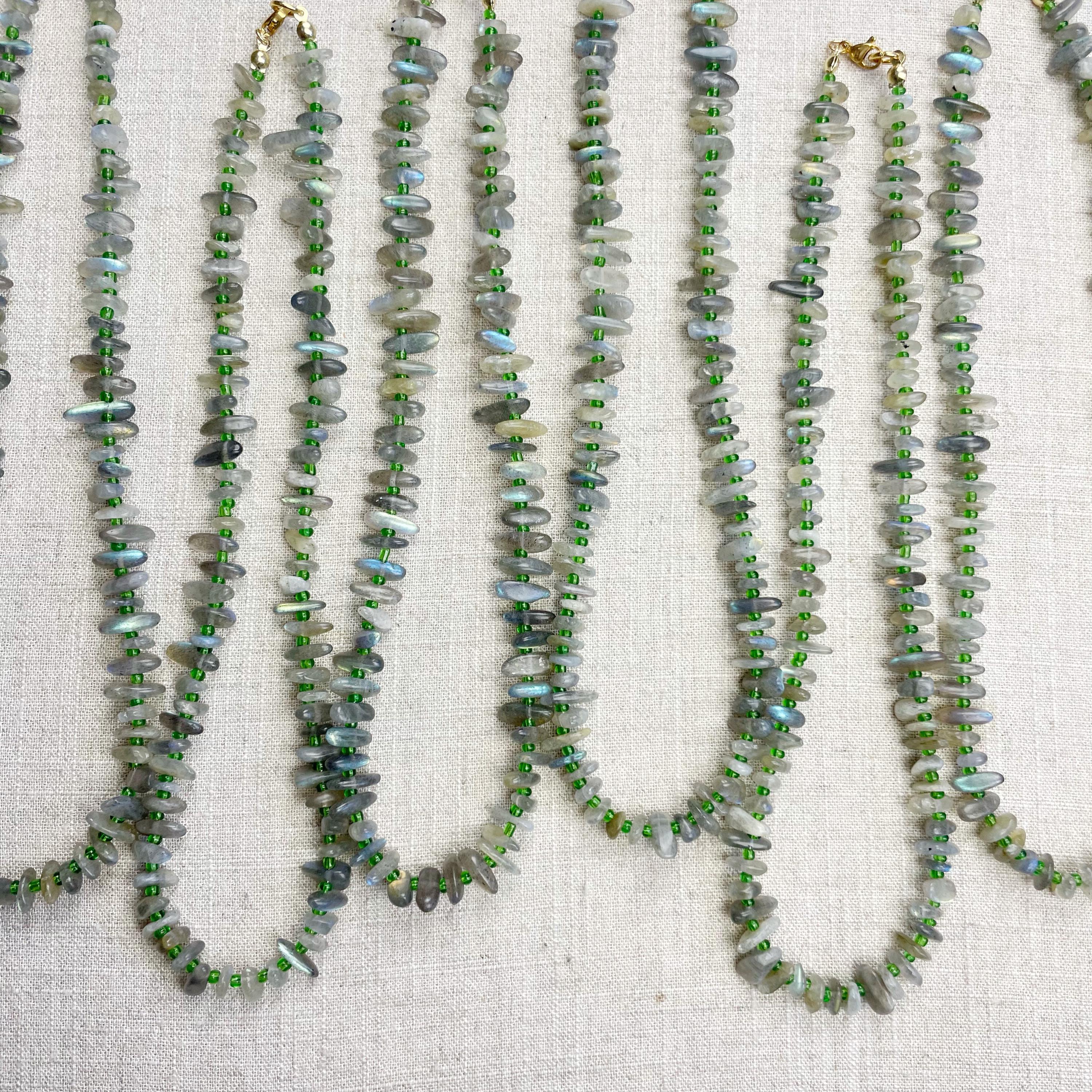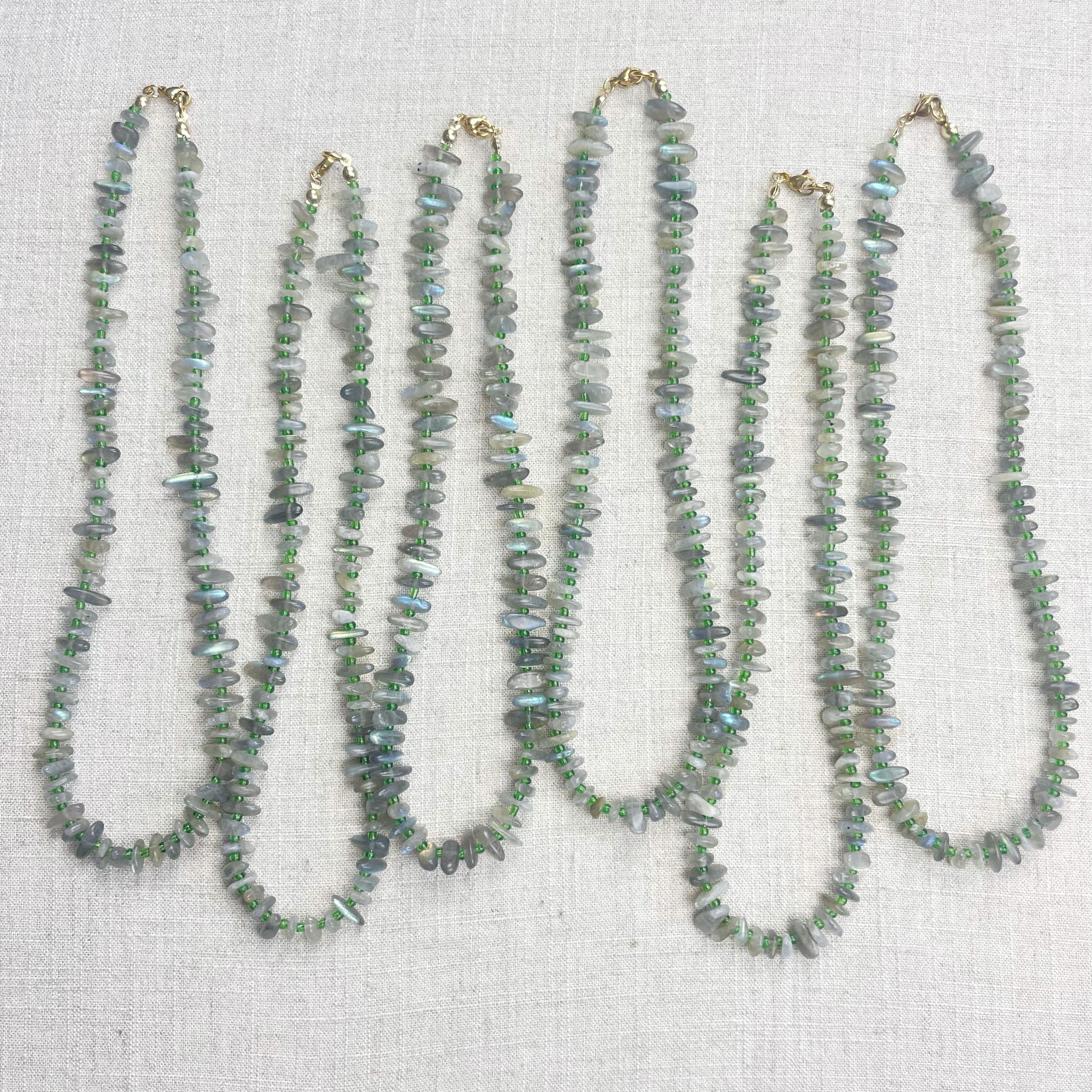 This necklace is made from beautiful chip beads. The chip beads are labradorite which have beautiful flash in different colors. Tiny glass seed beads are between each bead to give some color and spacer between the chip beads. Each necklace is strung on a stainless steel beading wire. The necklace is finished off with a gold plated stainless steel lobster clasp and a logo charm.