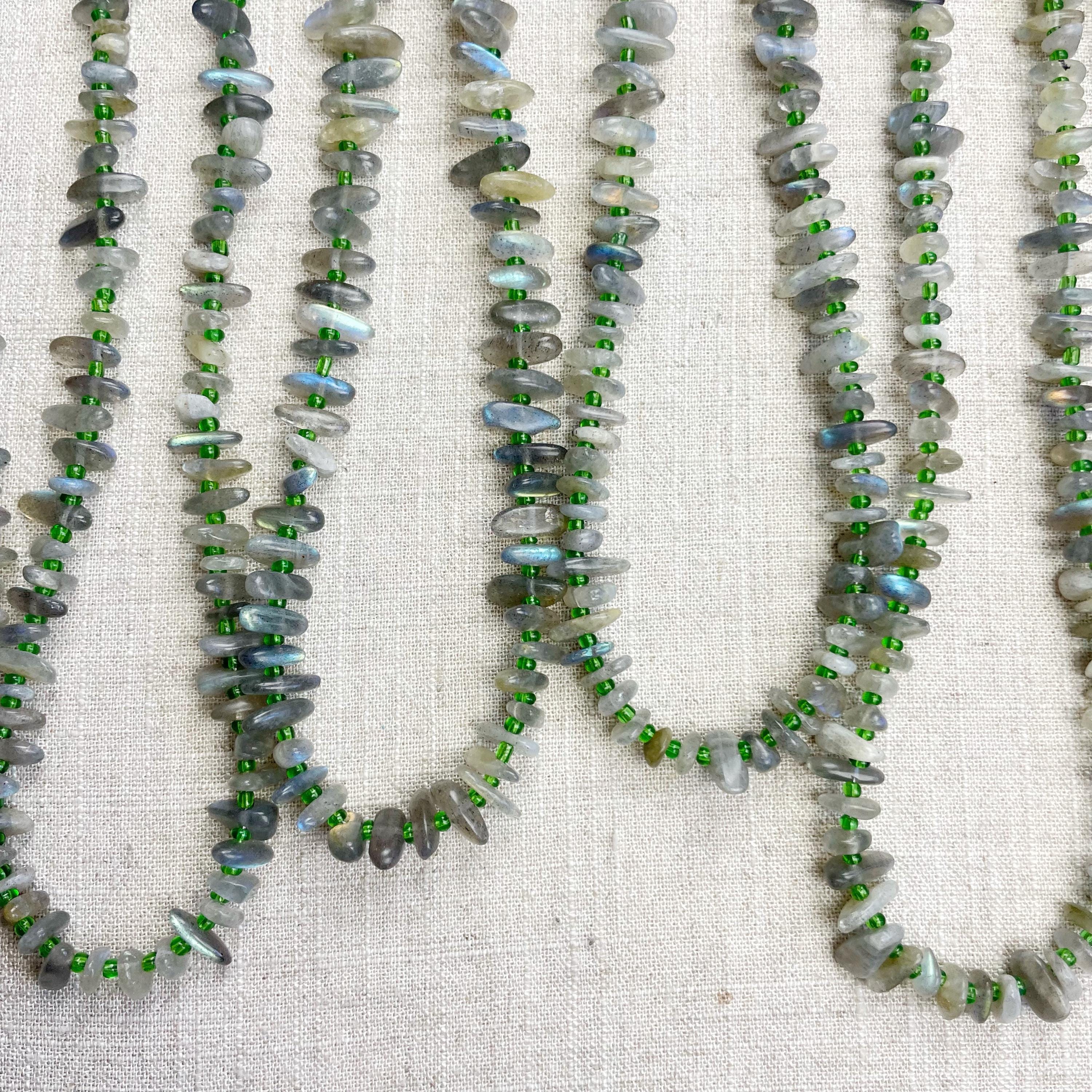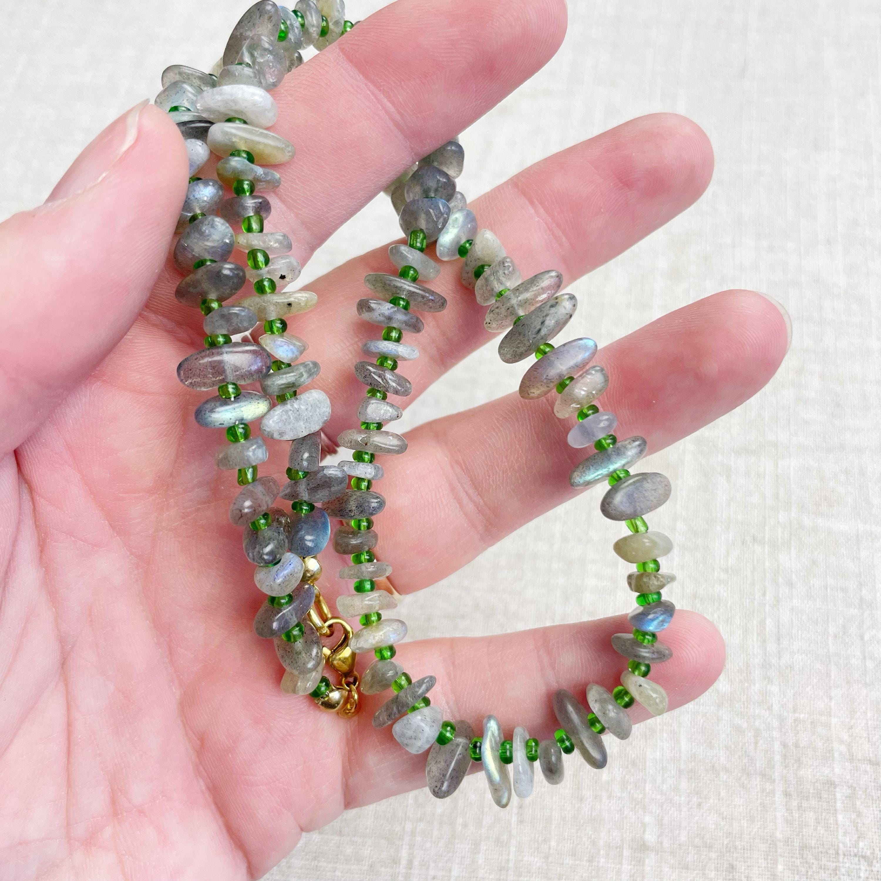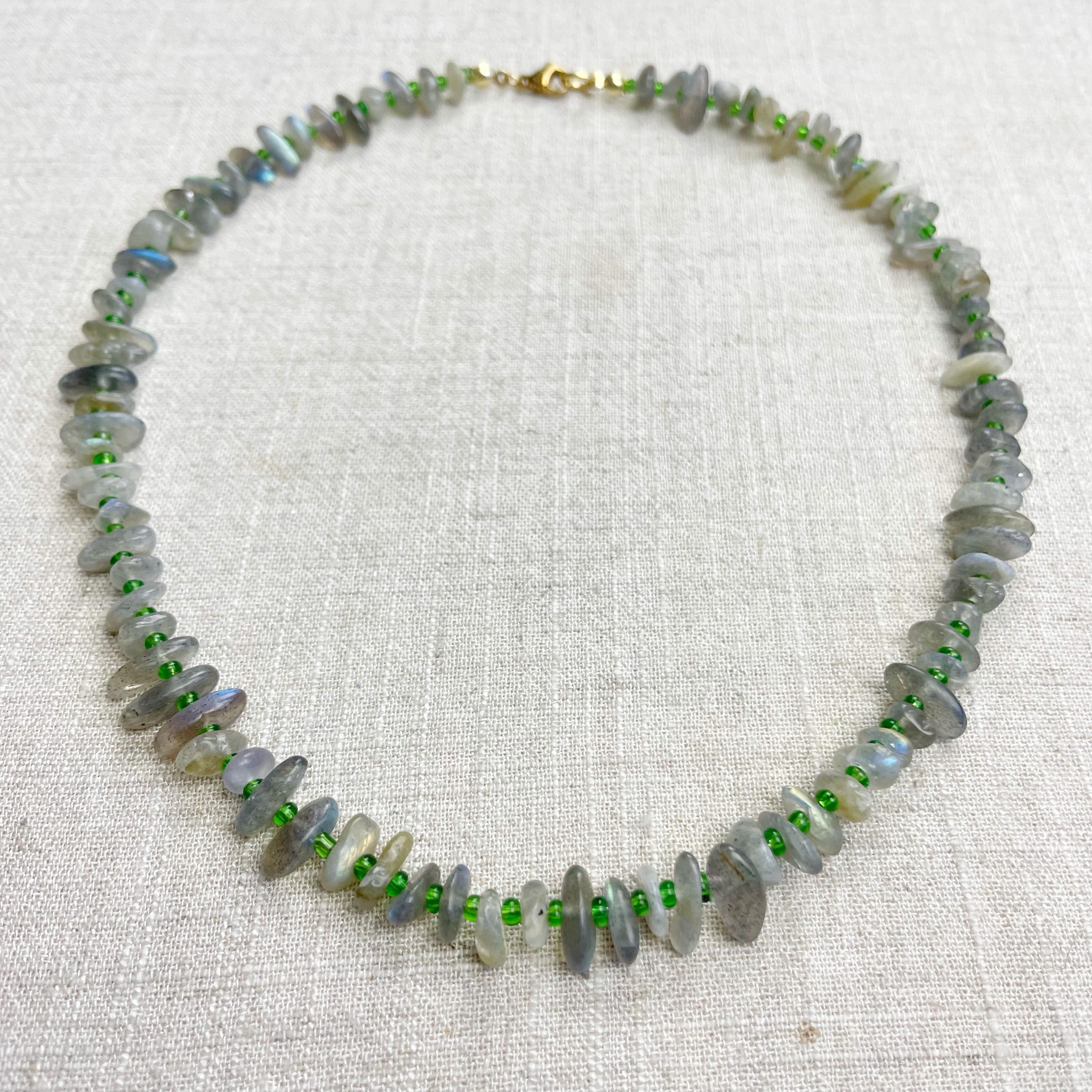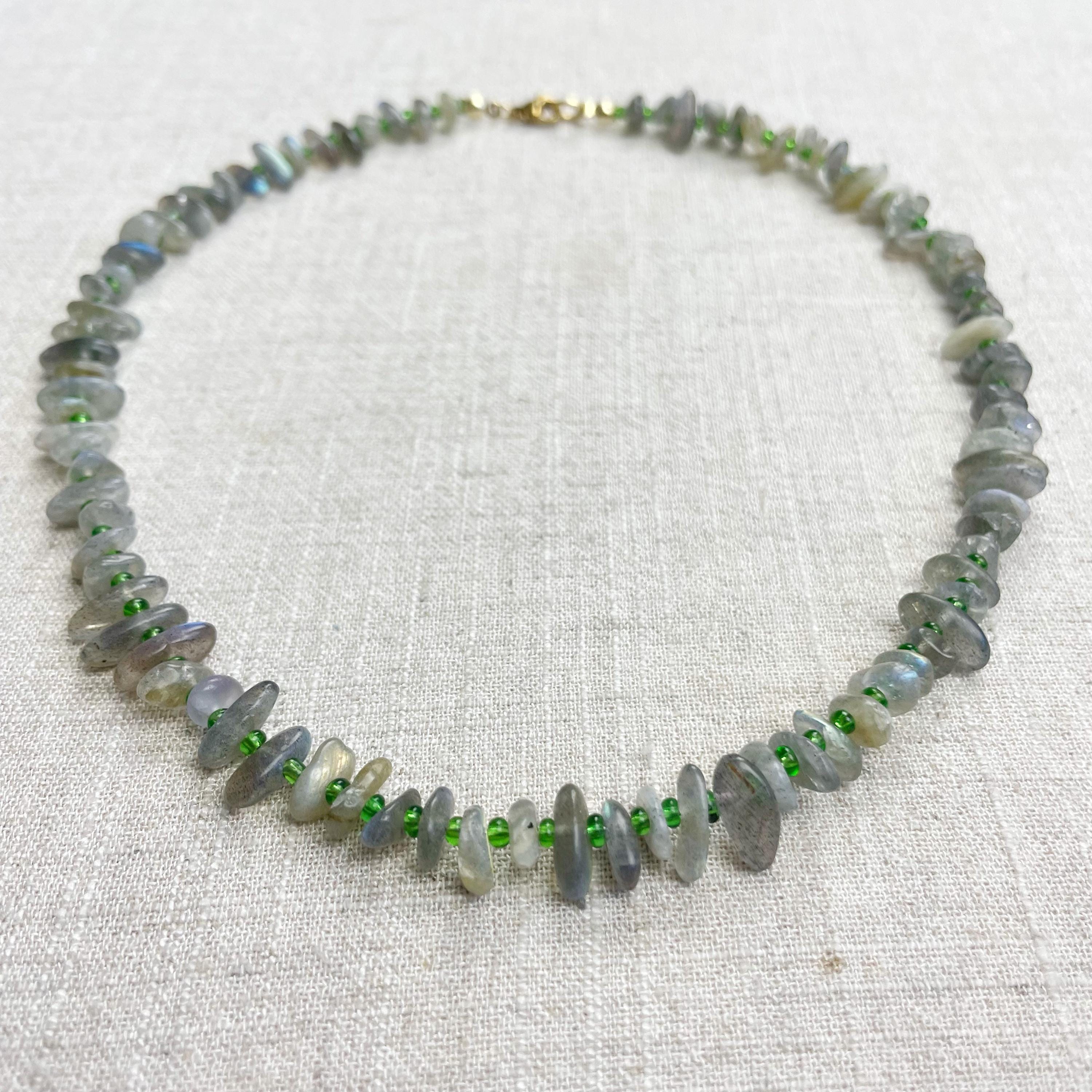 This necklace is made from beautiful chip beads. The chip beads are labradorite which have beautiful flash in different colors. Tiny glass seed beads are between each bead to give some color and spacer between the chip beads. Each necklace is strung on a stainless steel beading wire. The necklace is finished off with a gold plated stainless steel lobster clasp and a logo charm.