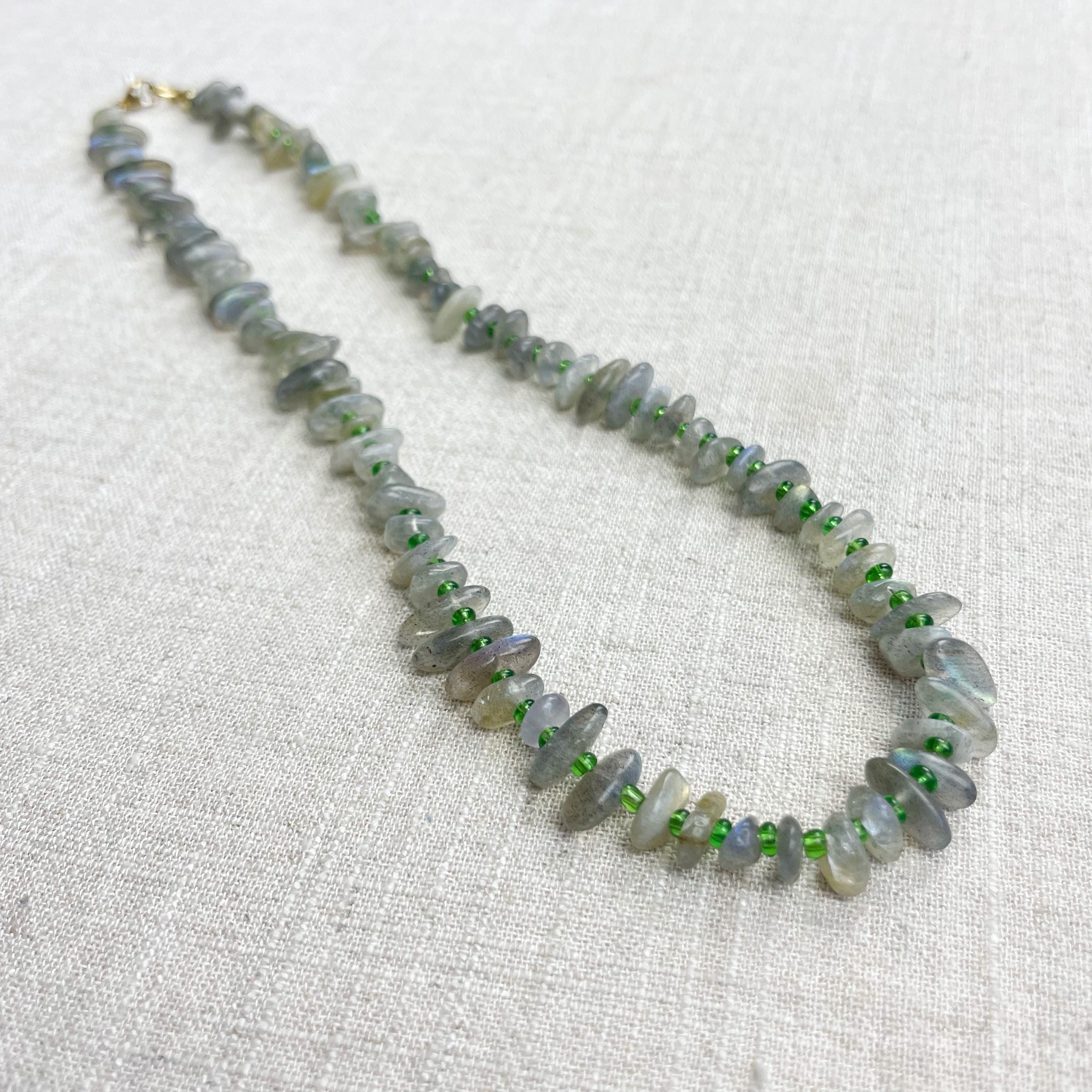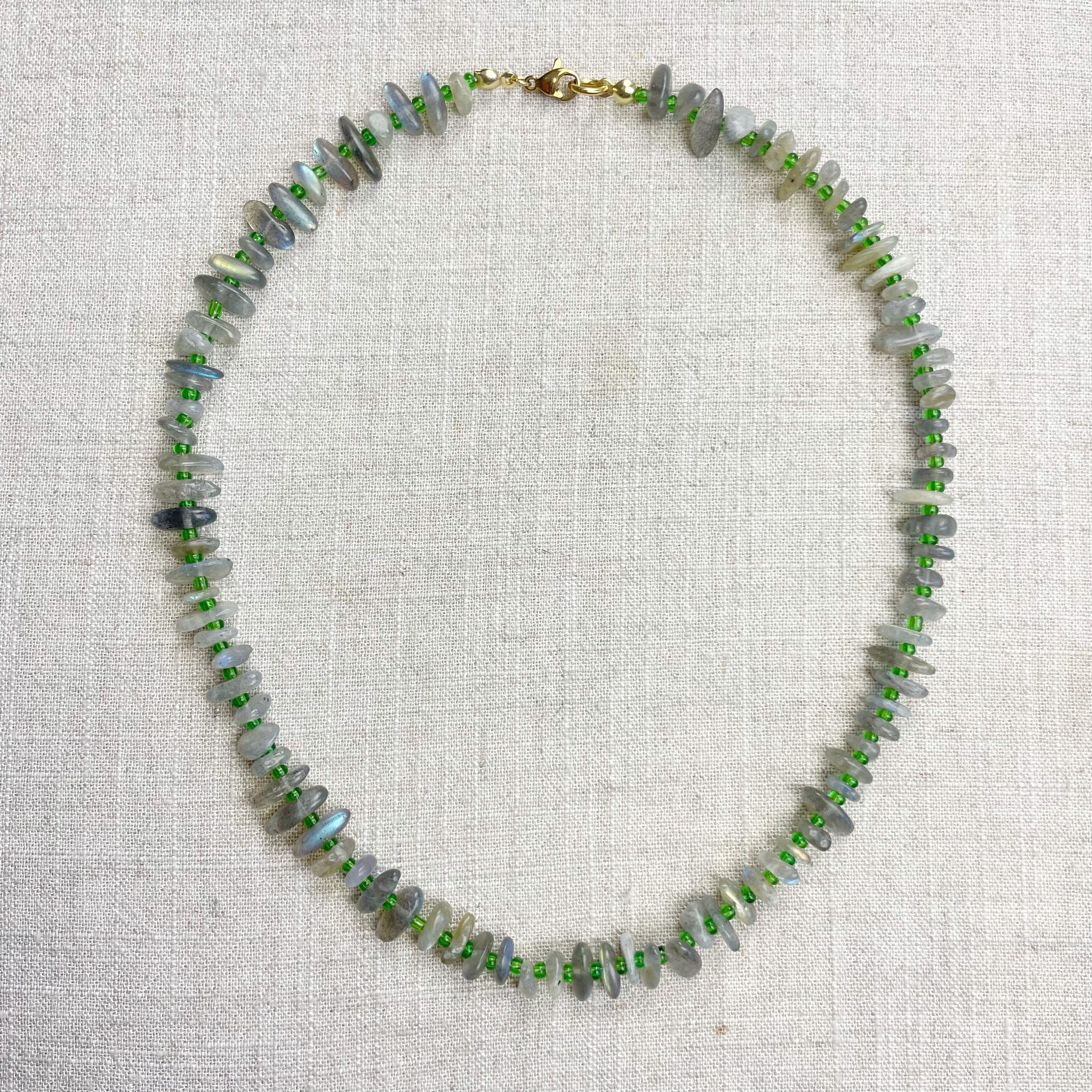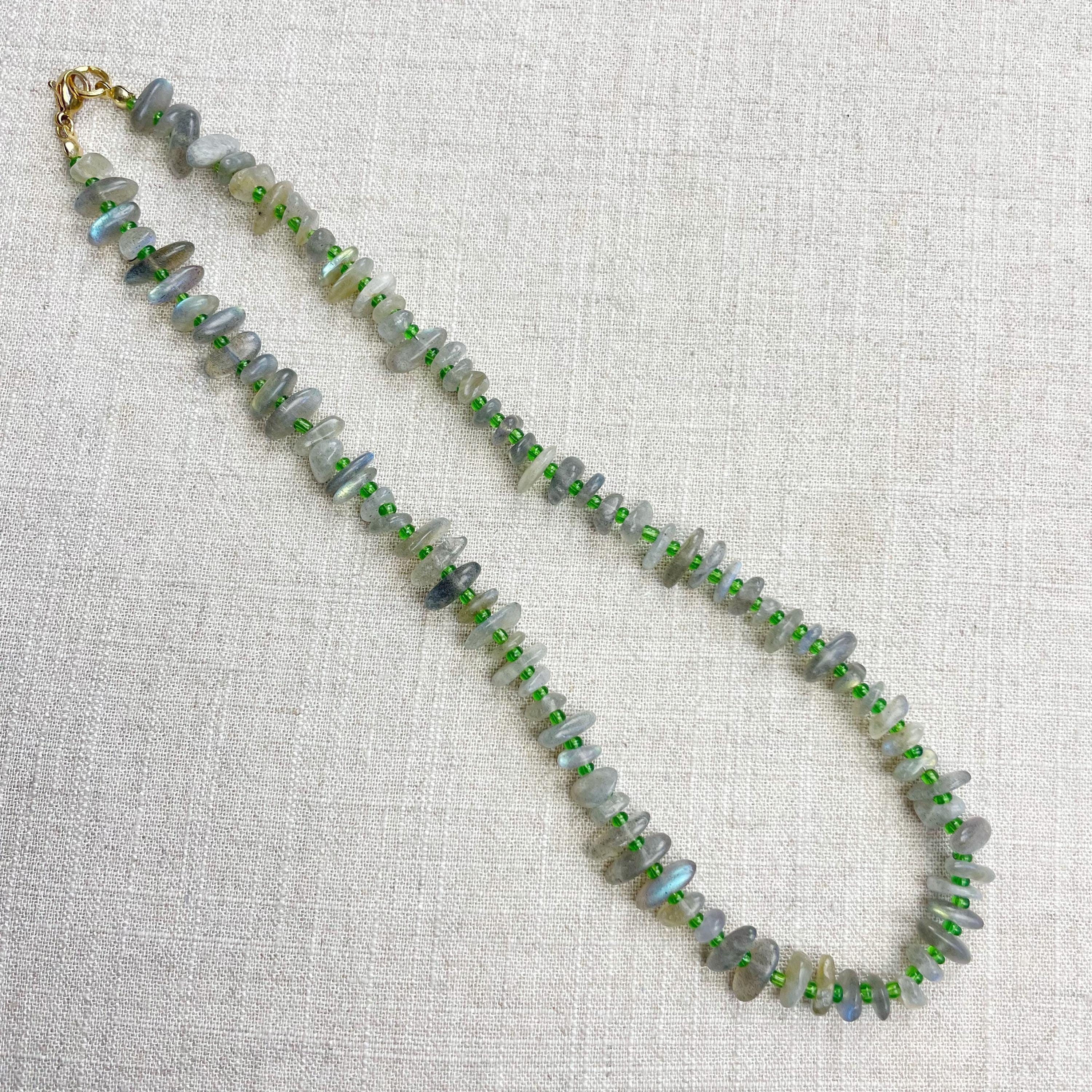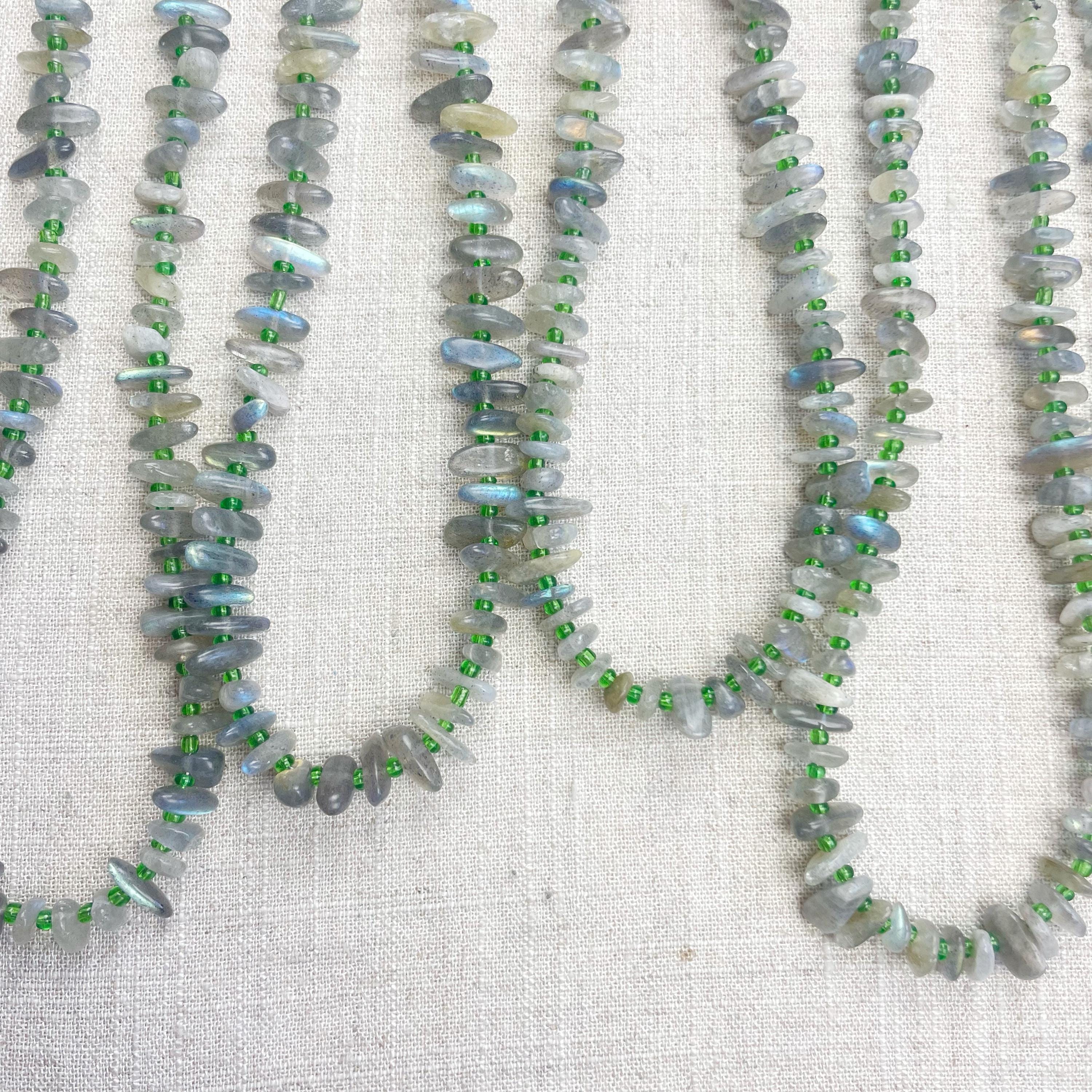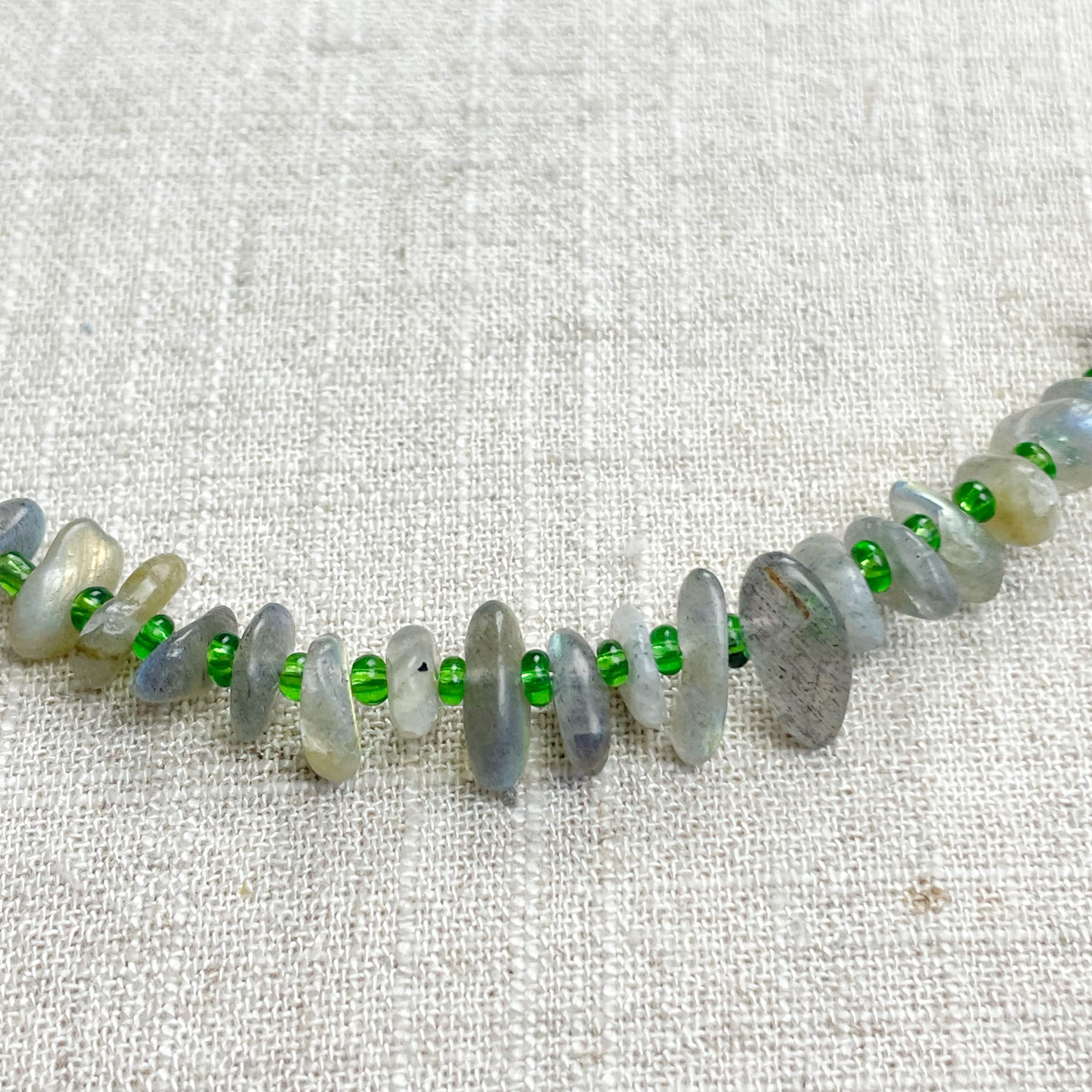 This necklace is made from beautiful chip beads. The chip beads are labradorite which have beautiful flash in different colors. Tiny glass seed beads are between each bead to give some color and spacer between the chip beads. Each necklace is strung on a stainless steel beading wire. The necklace is finished off with a gold plated stainless steel lobster clasp and a logo charm.