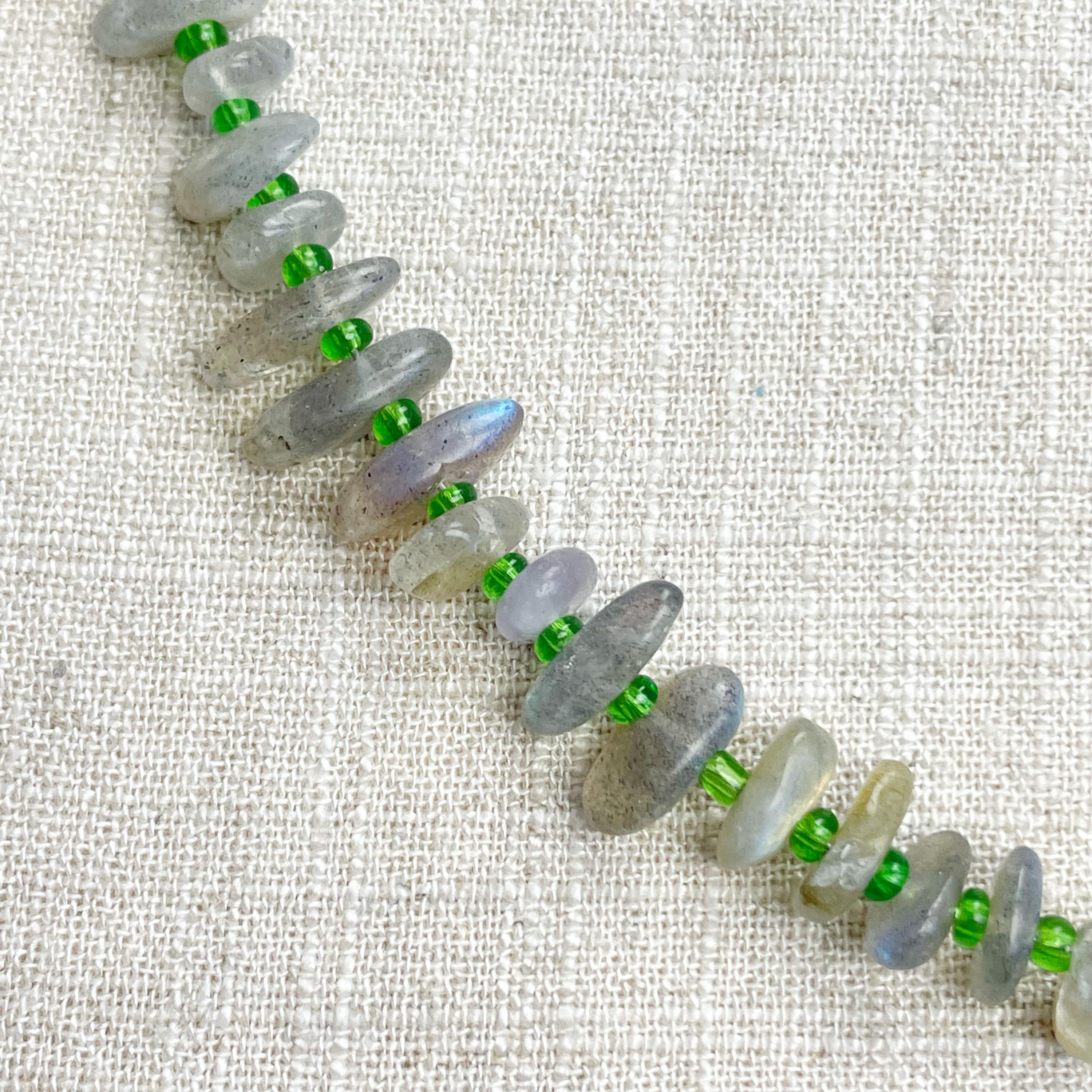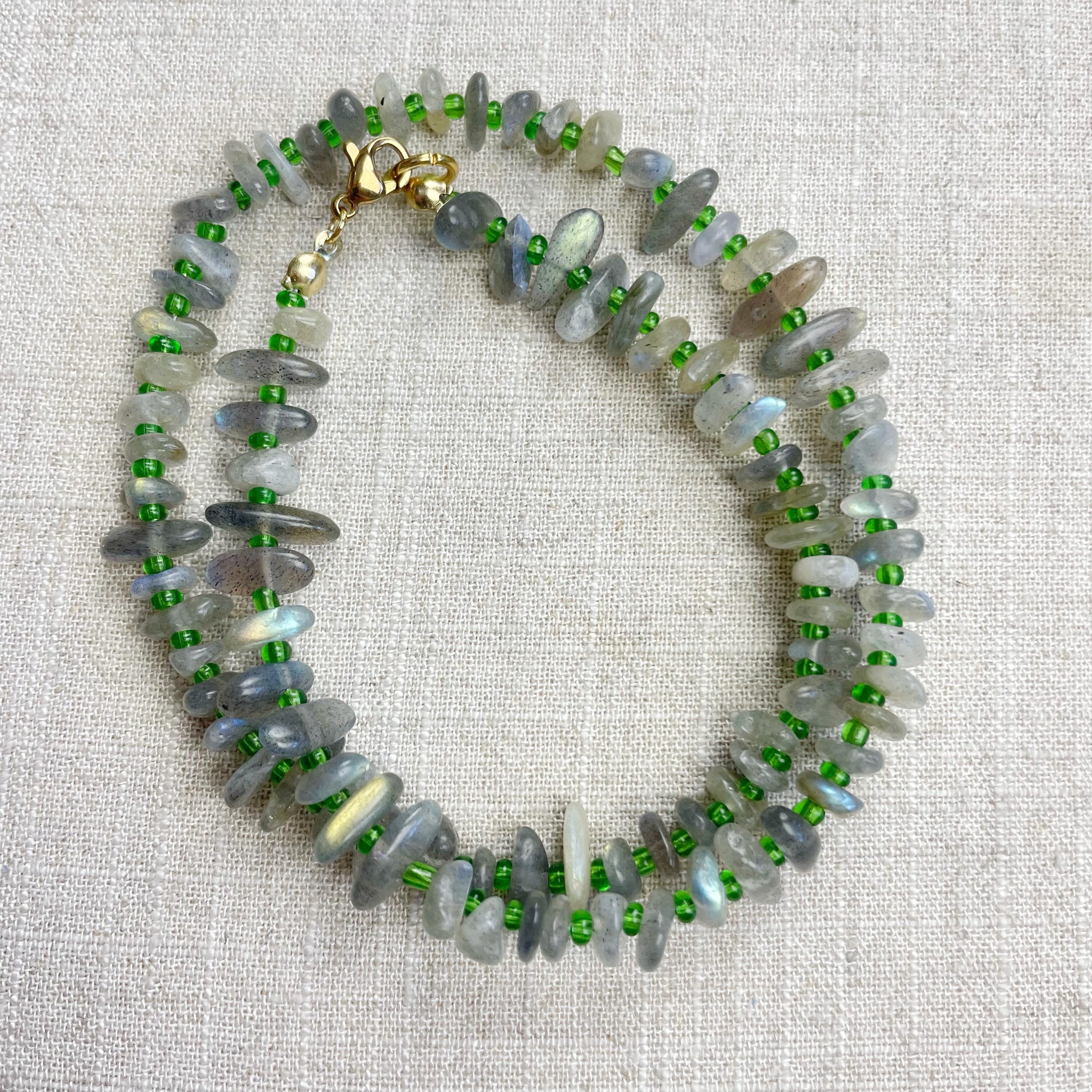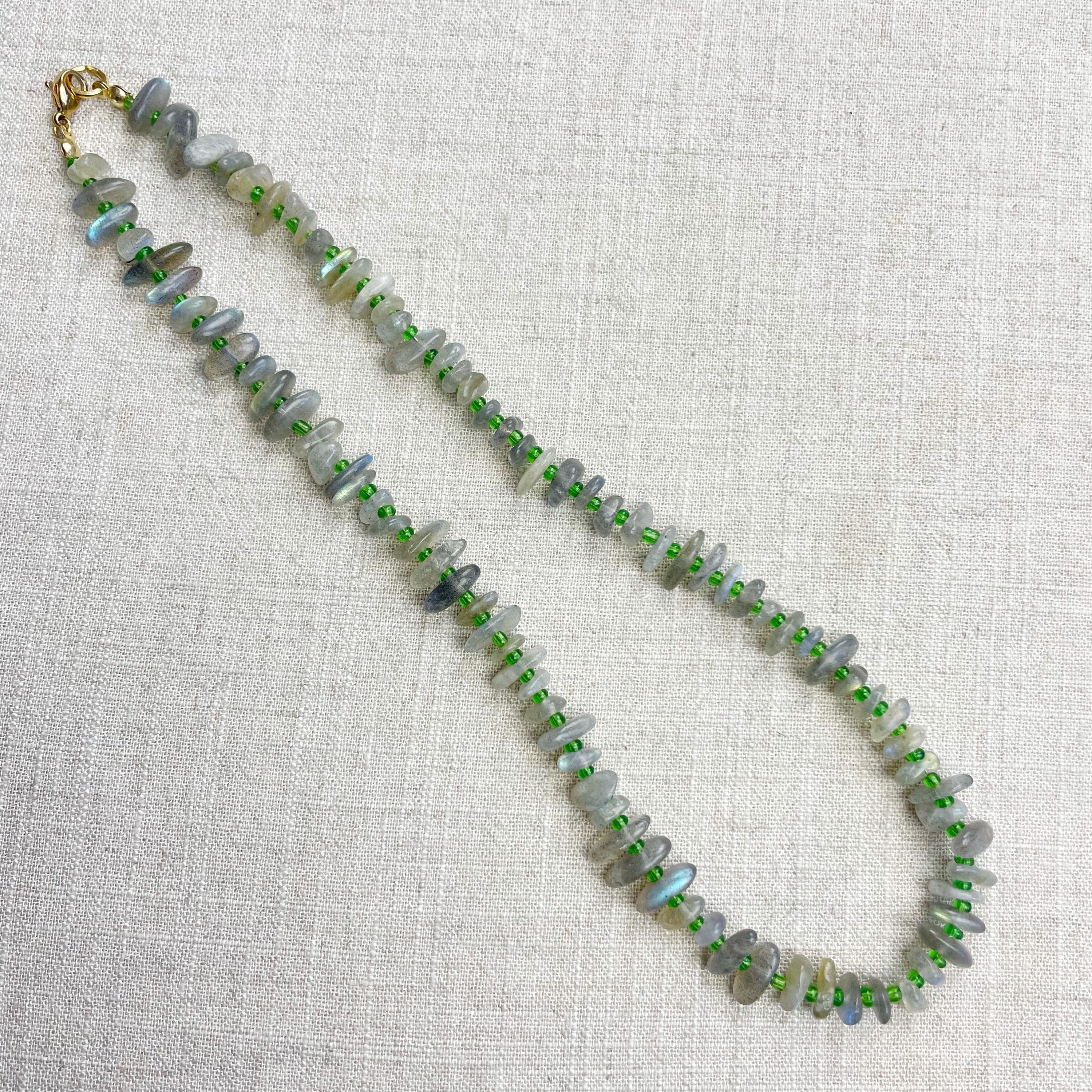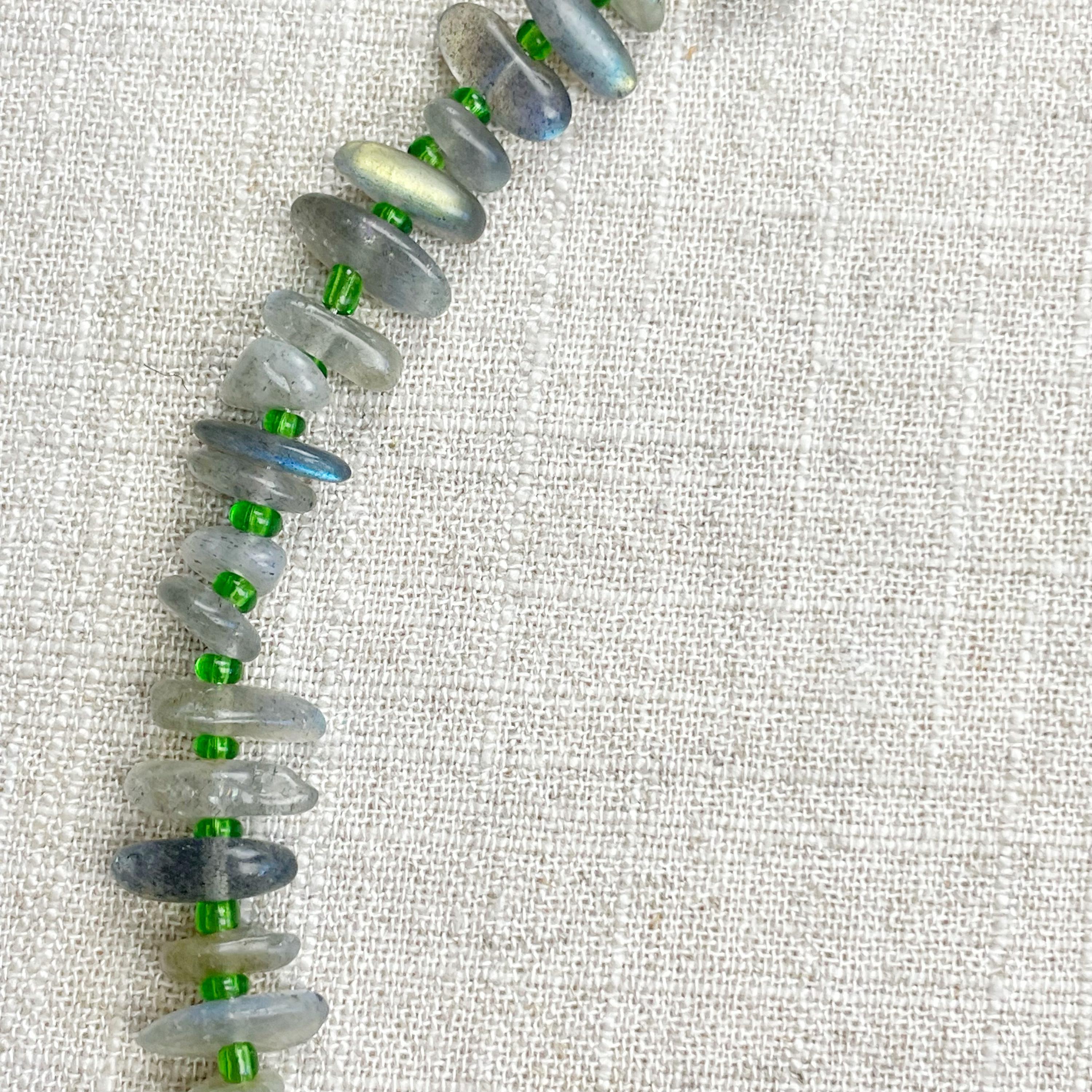 This necklace is made from beautiful chip beads. The chip beads are labradorite which have beautiful flash in different colors. Tiny glass seed beads are between each bead to give some color and spacer between the chip beads. Each necklace is strung on a stainless steel beading wire. The necklace is finished off with a gold plated stainless steel lobster clasp and a logo charm.