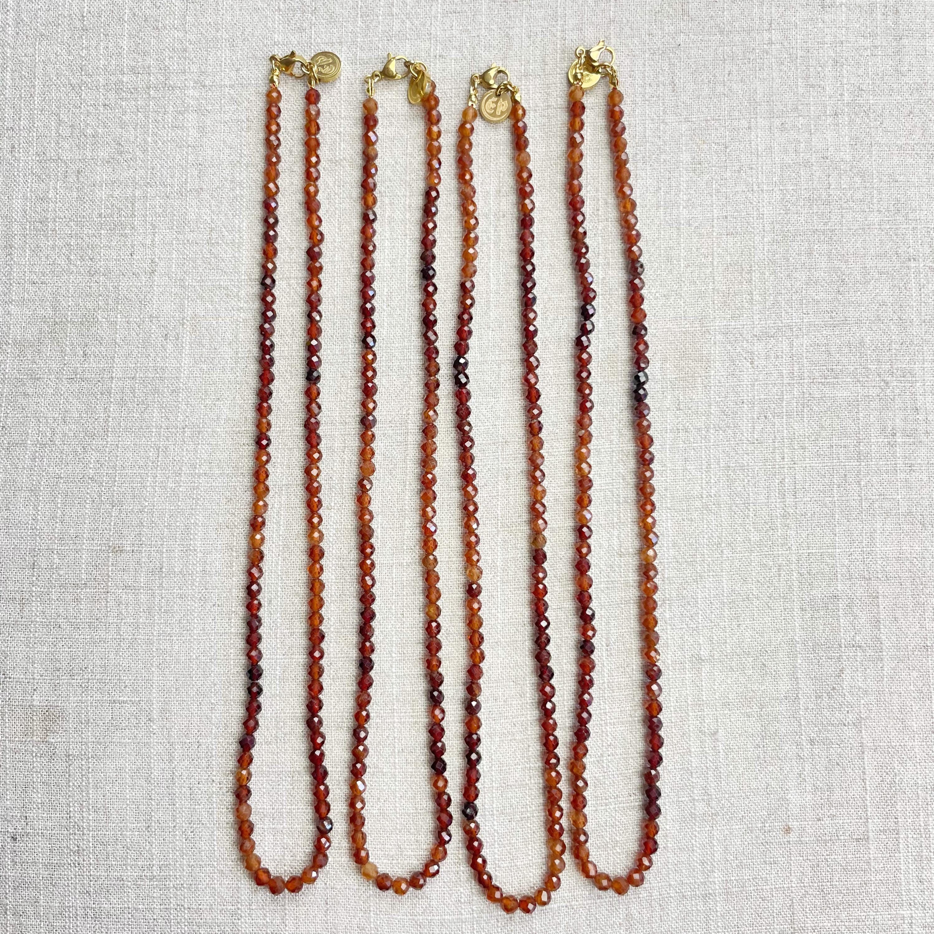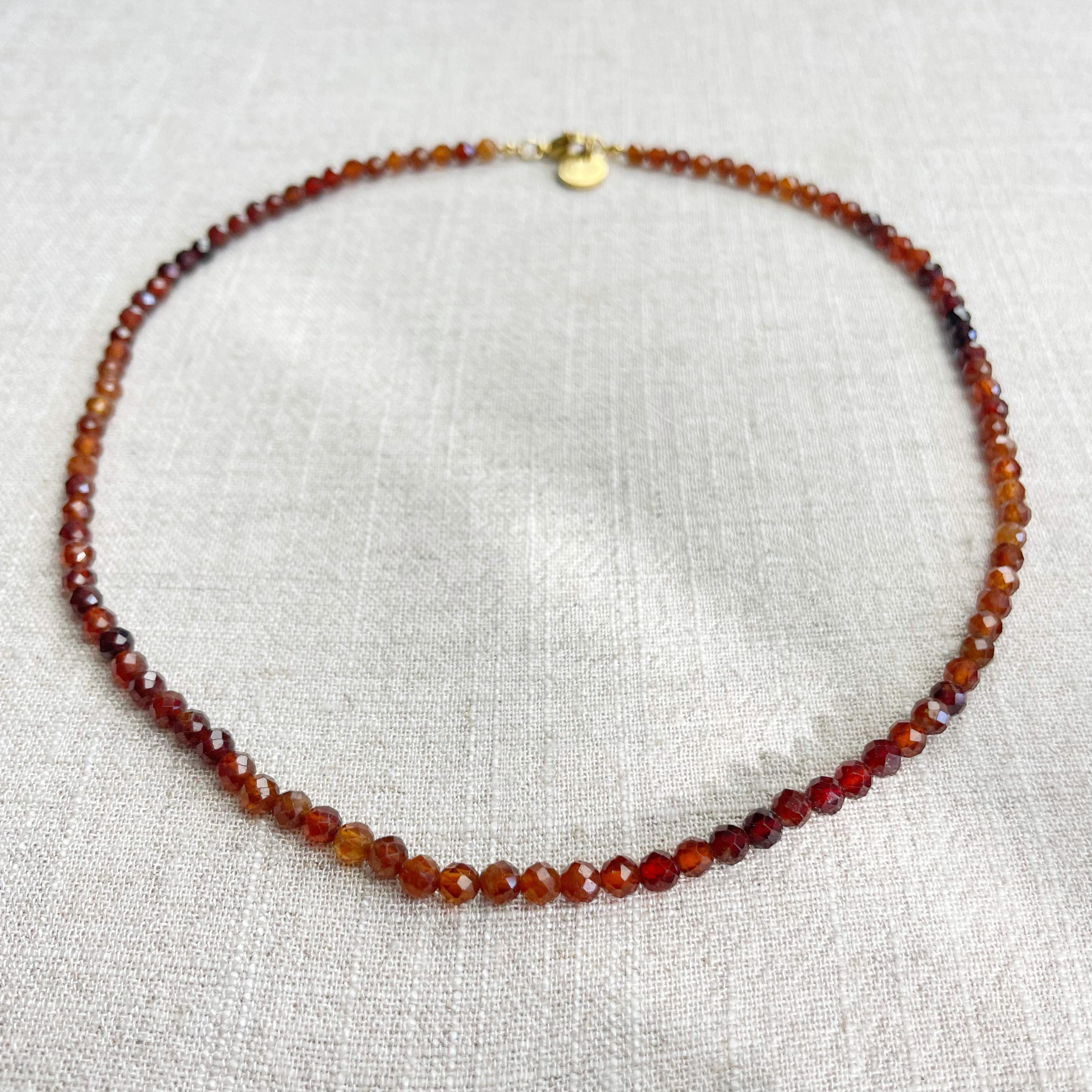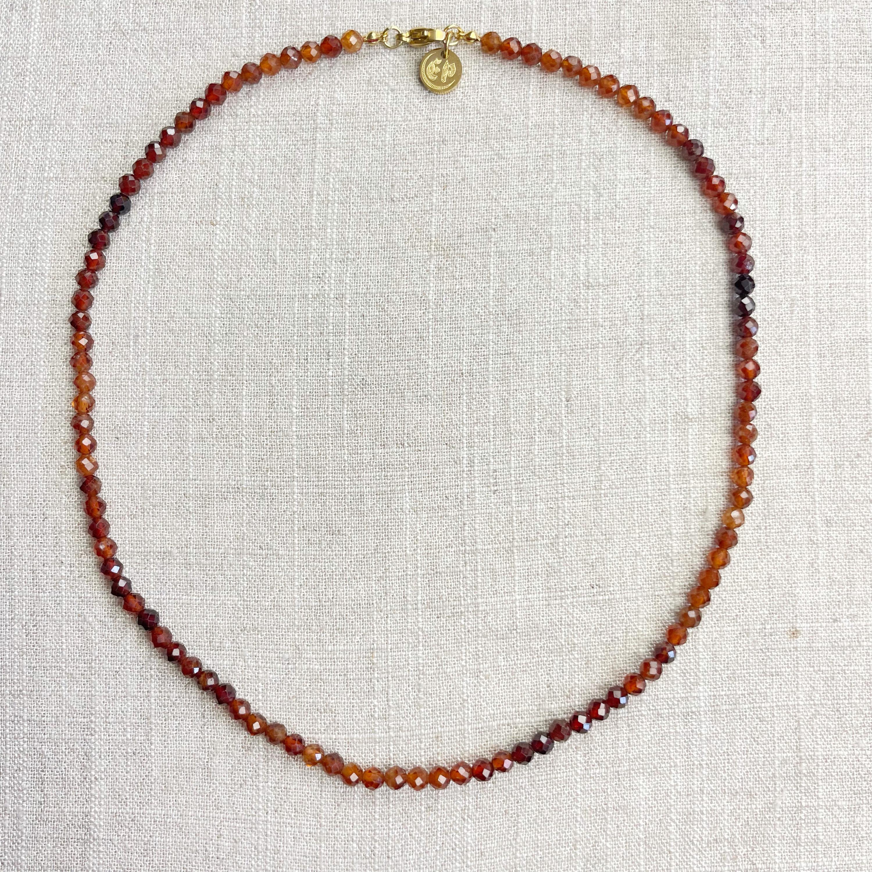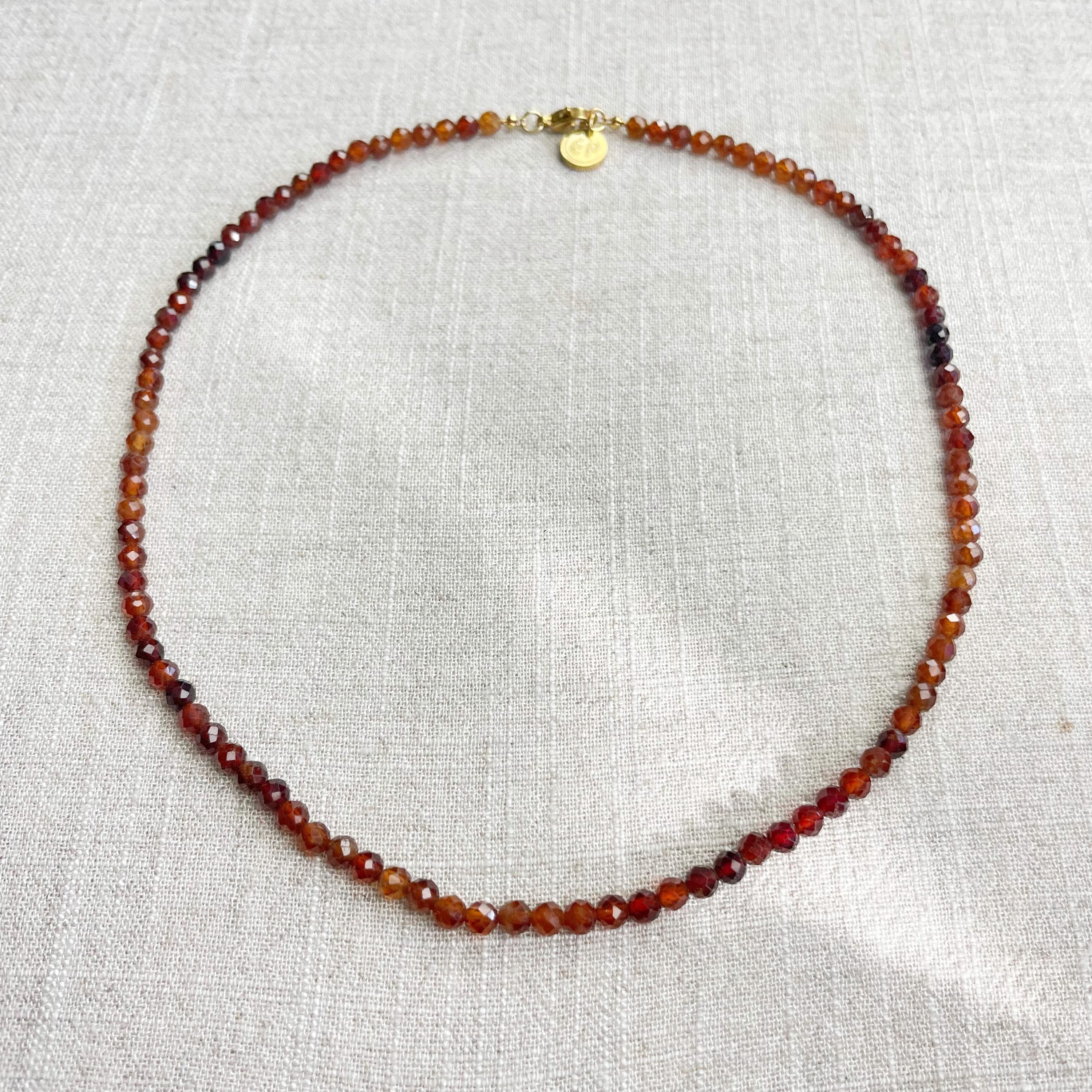 This necklace is made from beautiful garnet beads which are in different shades of brown and red. The beads are strung on a nylon cord. The necklace is finished off with a gold plated stainless steel lobster clasp and a logo charm.