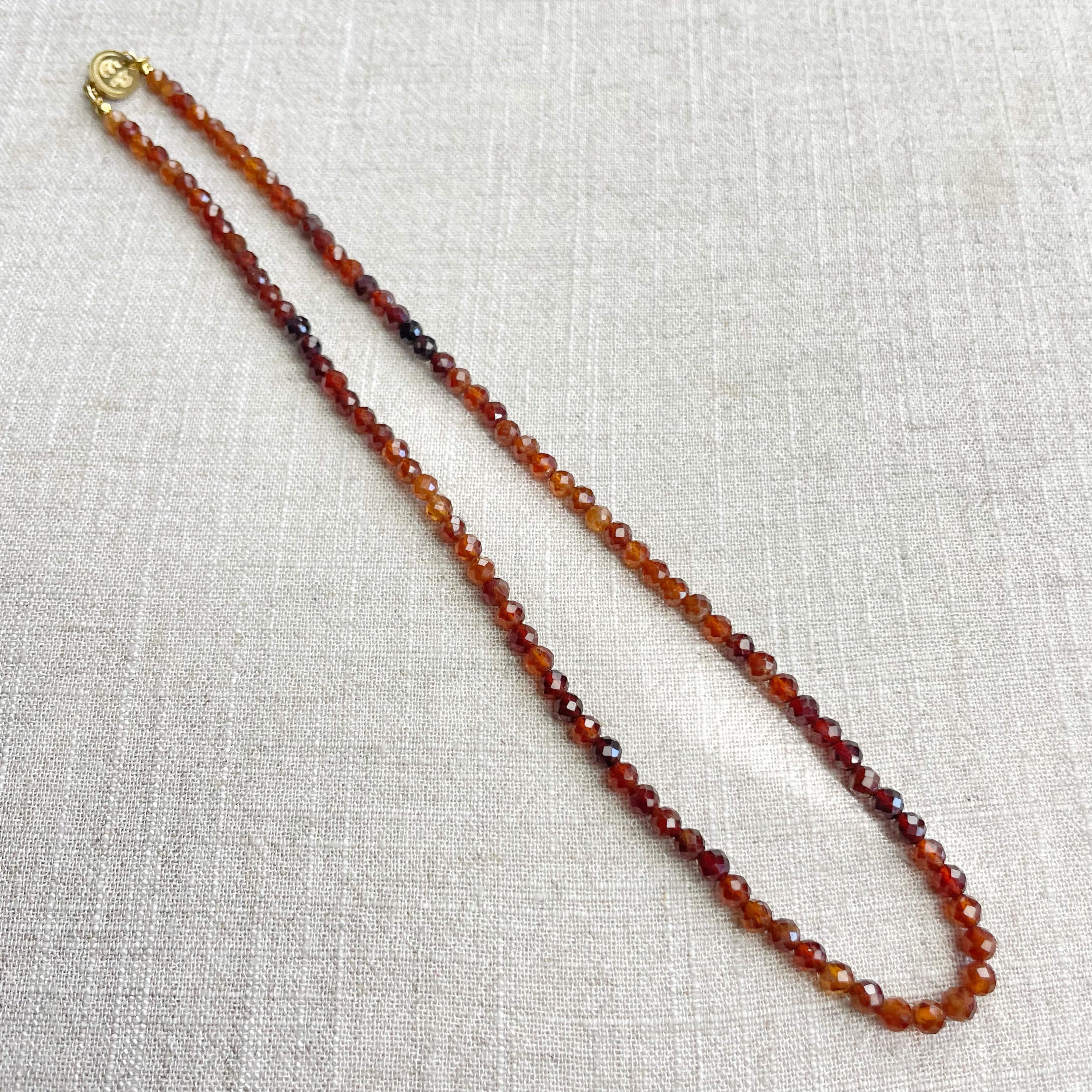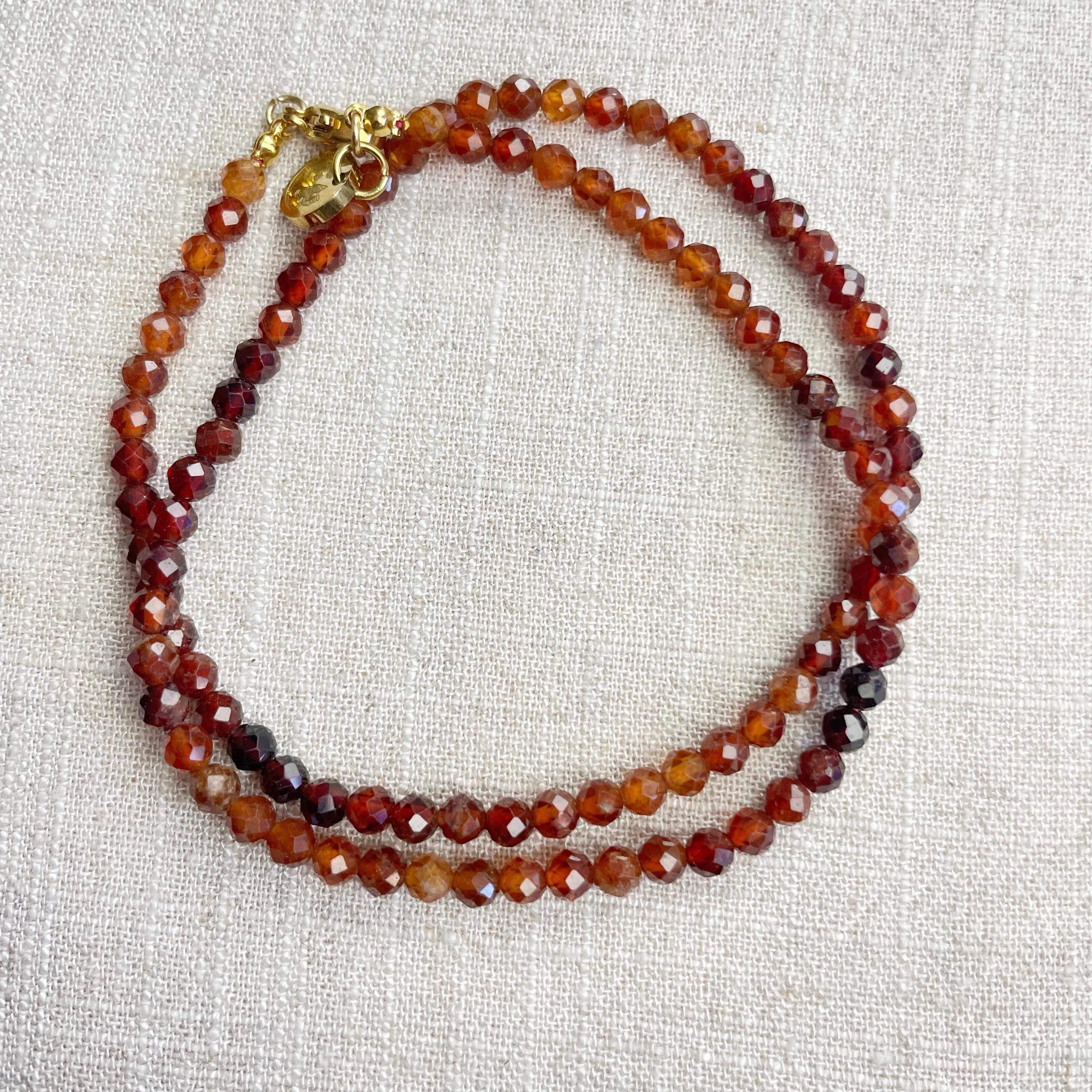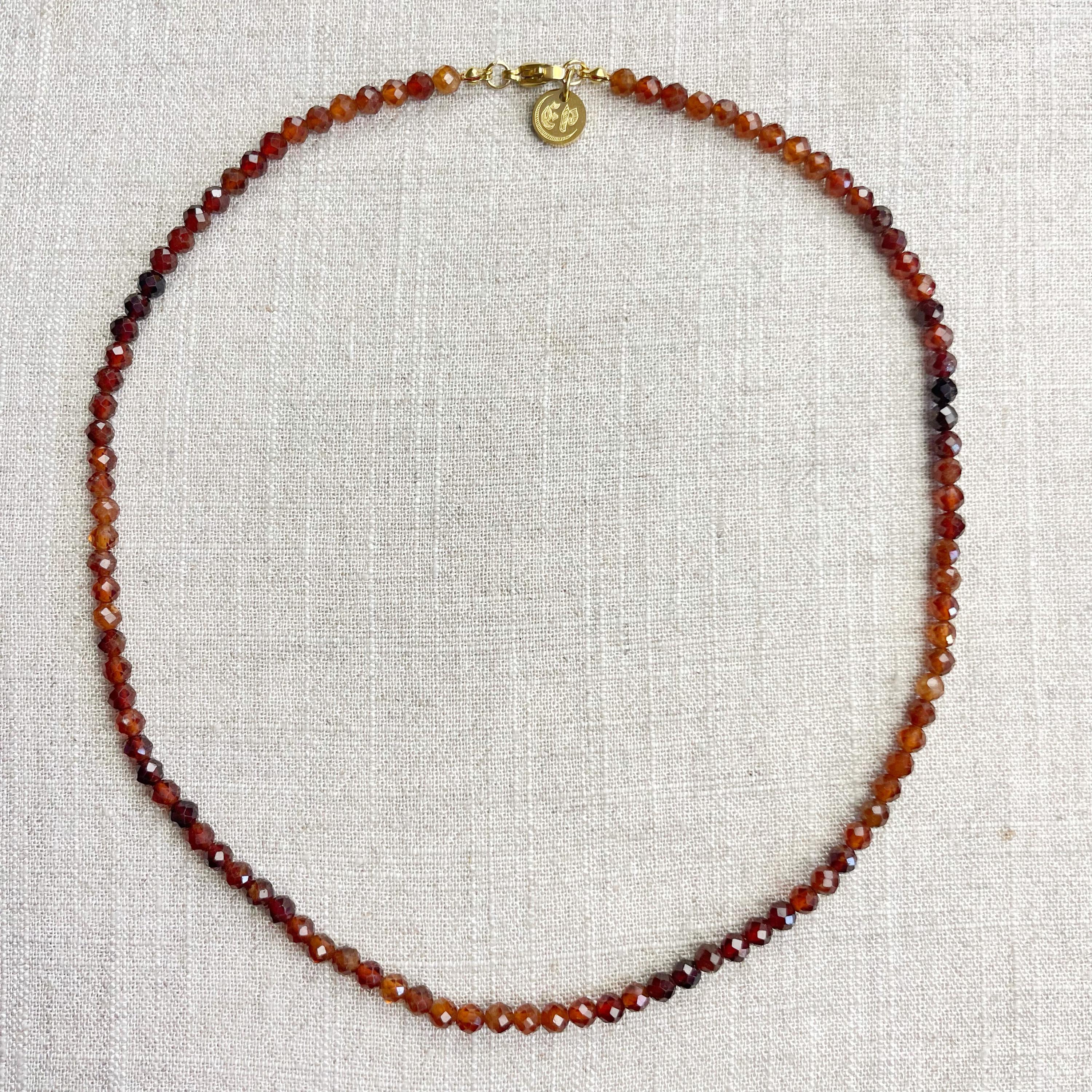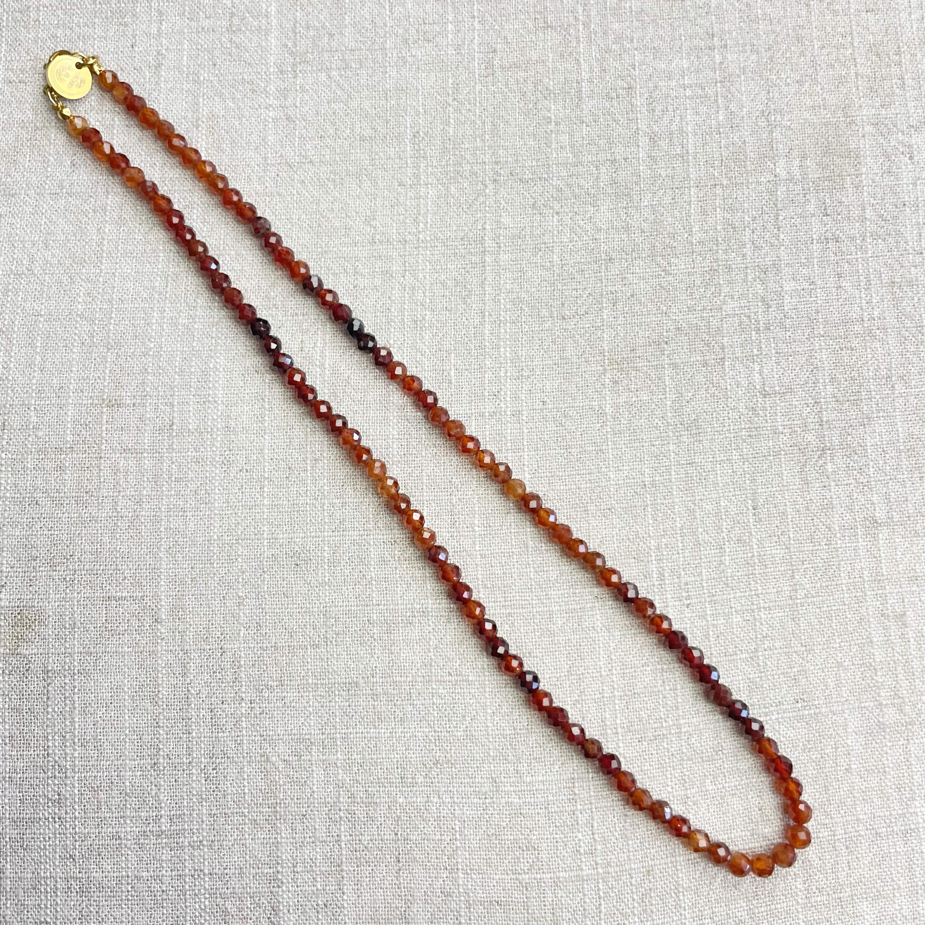 This necklace is made from beautiful garnet beads which are in different shades of brown and red. The beads are strung on a nylon cord. The necklace is finished off with a gold plated stainless steel lobster clasp and a logo charm.