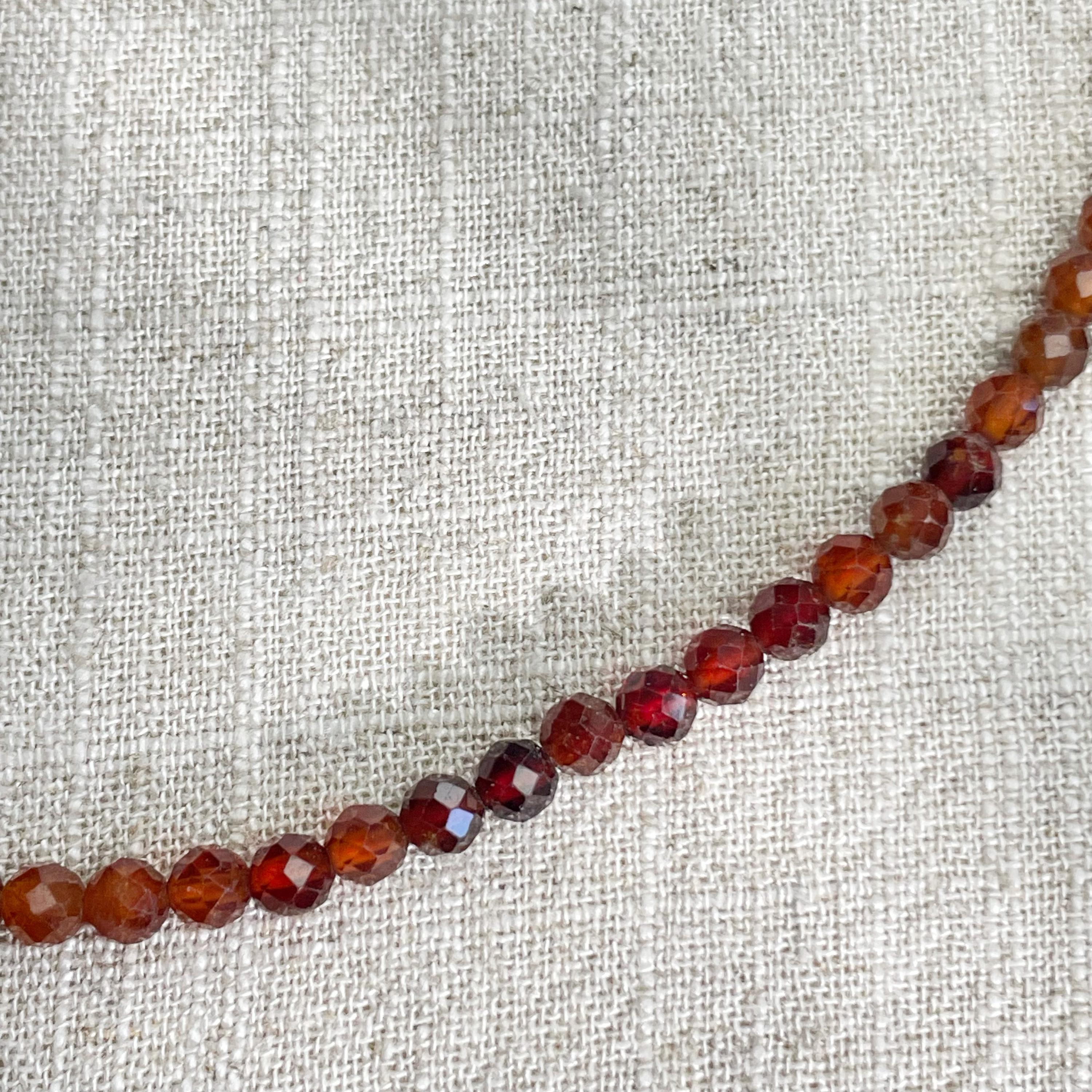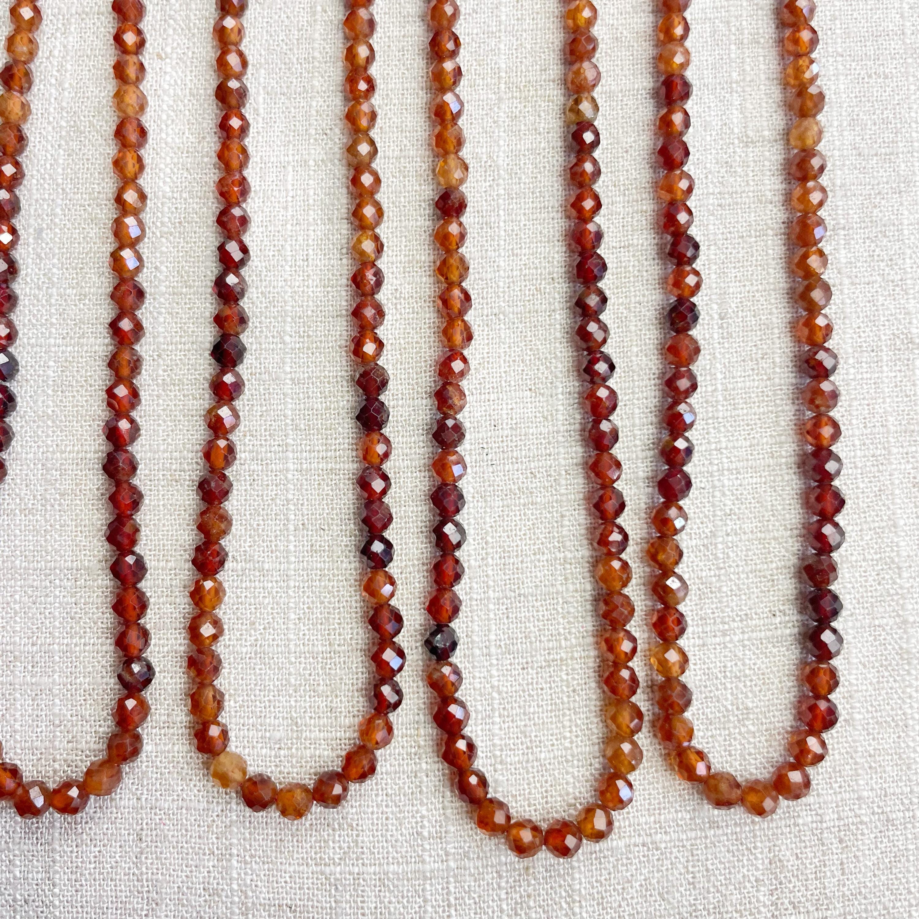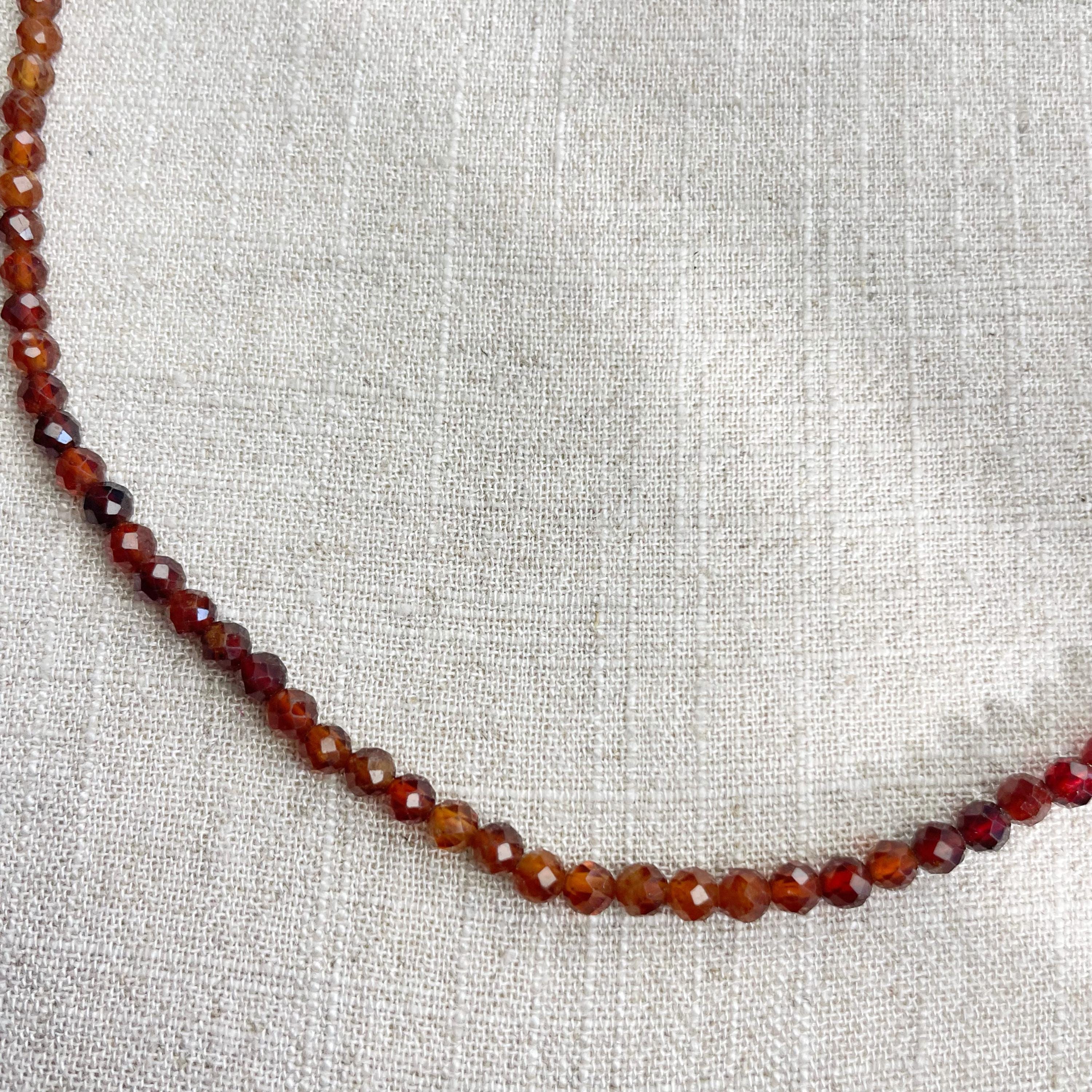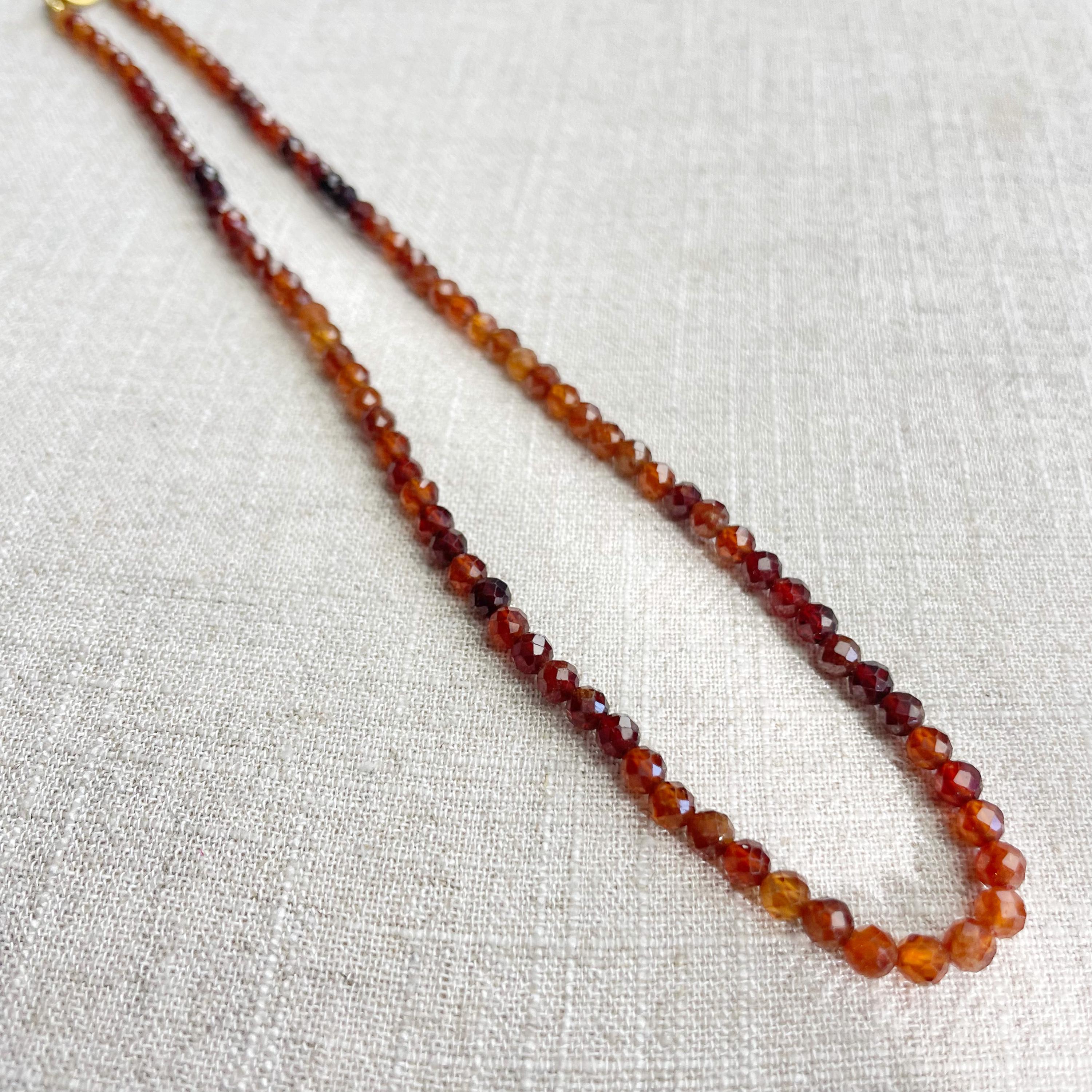 This necklace is made from beautiful garnet beads which are in different shades of brown and red. The beads are strung on a nylon cord. The necklace is finished off with a gold plated stainless steel lobster clasp and a logo charm.