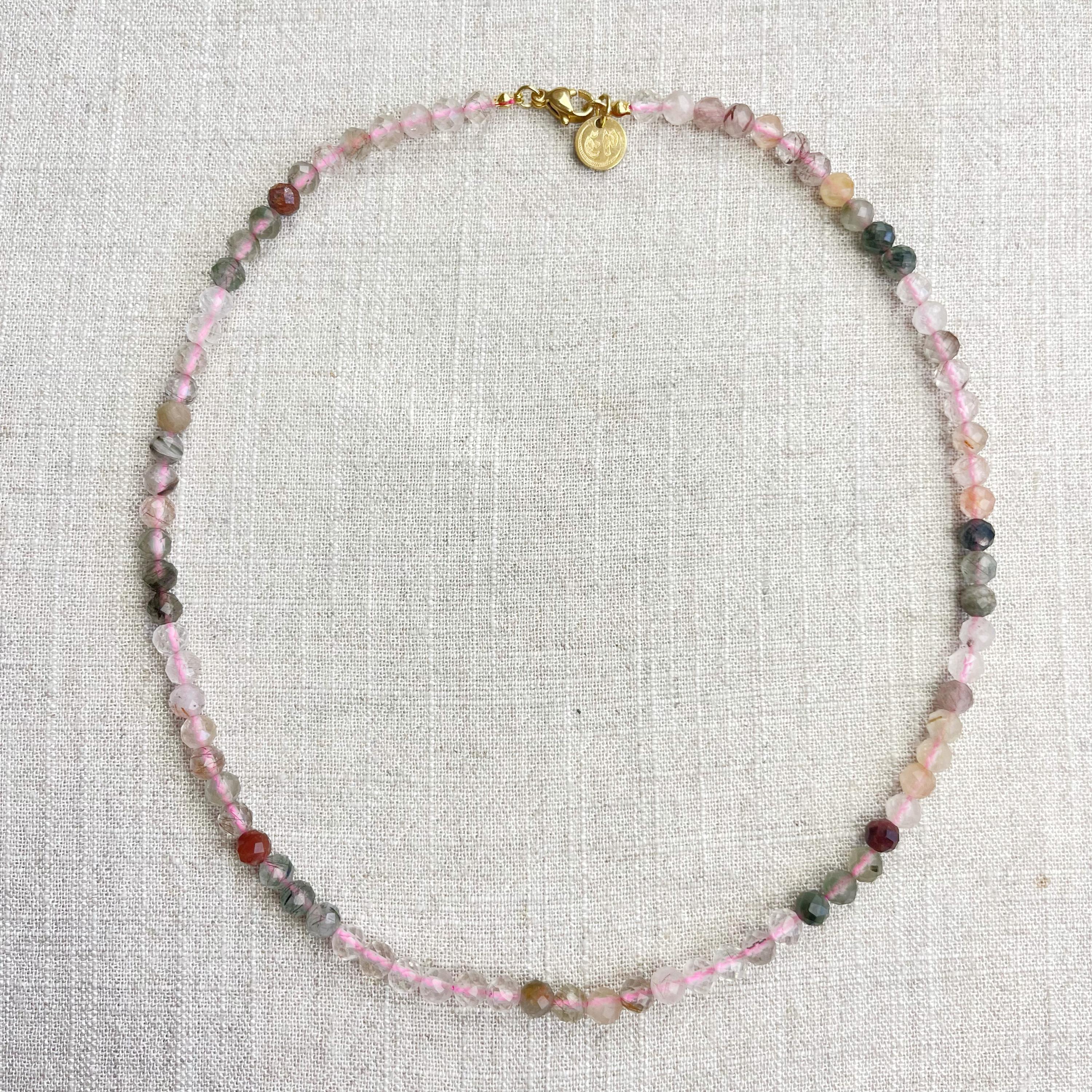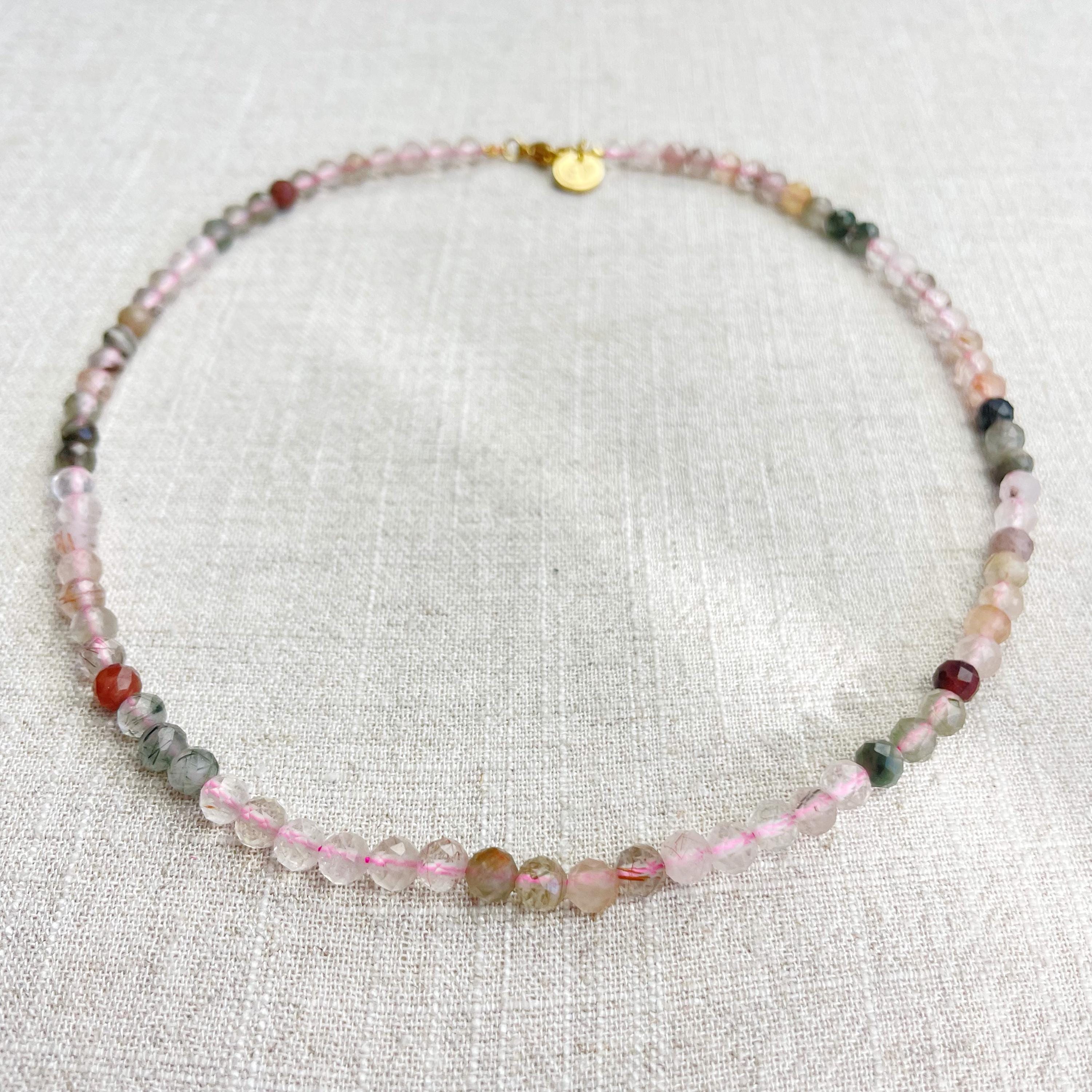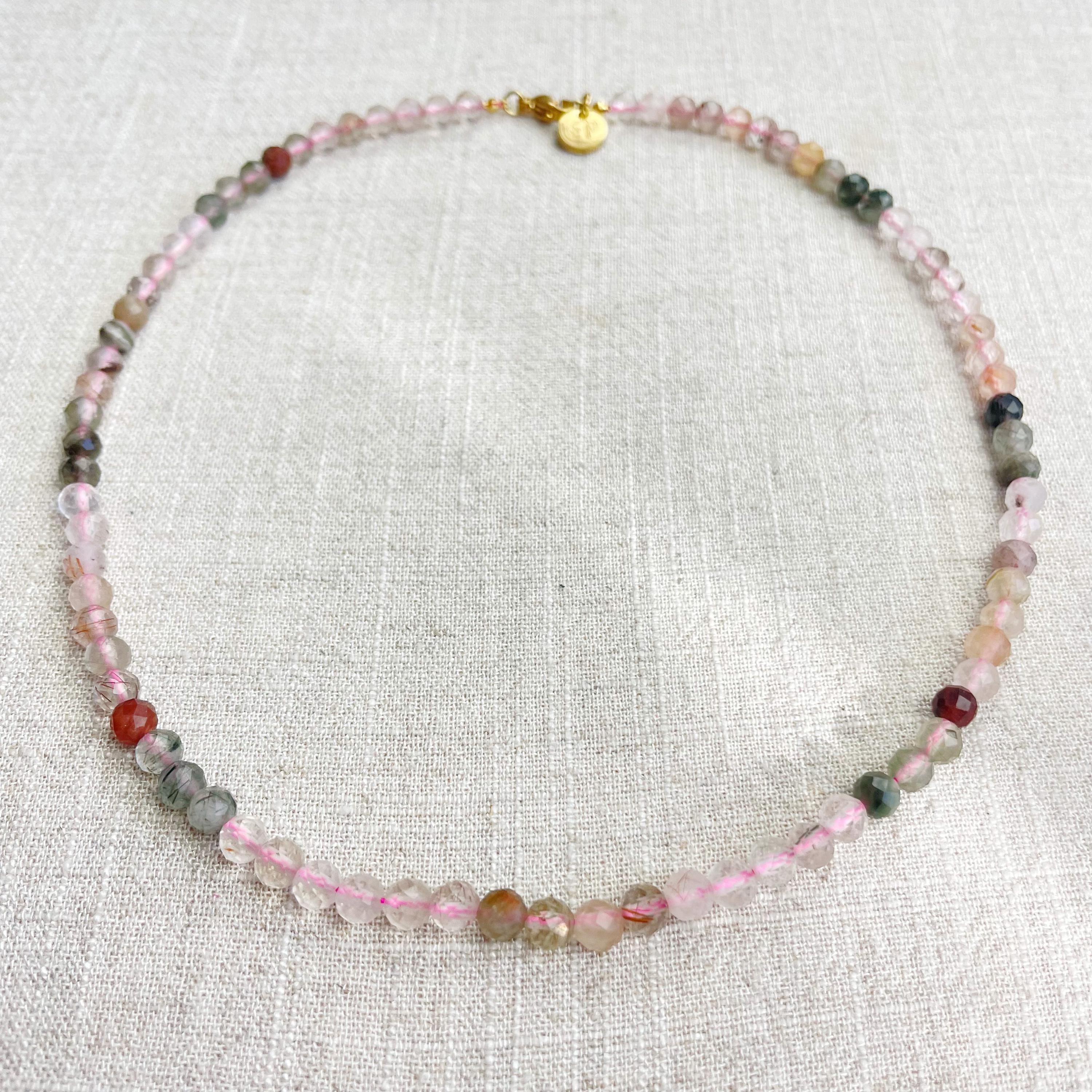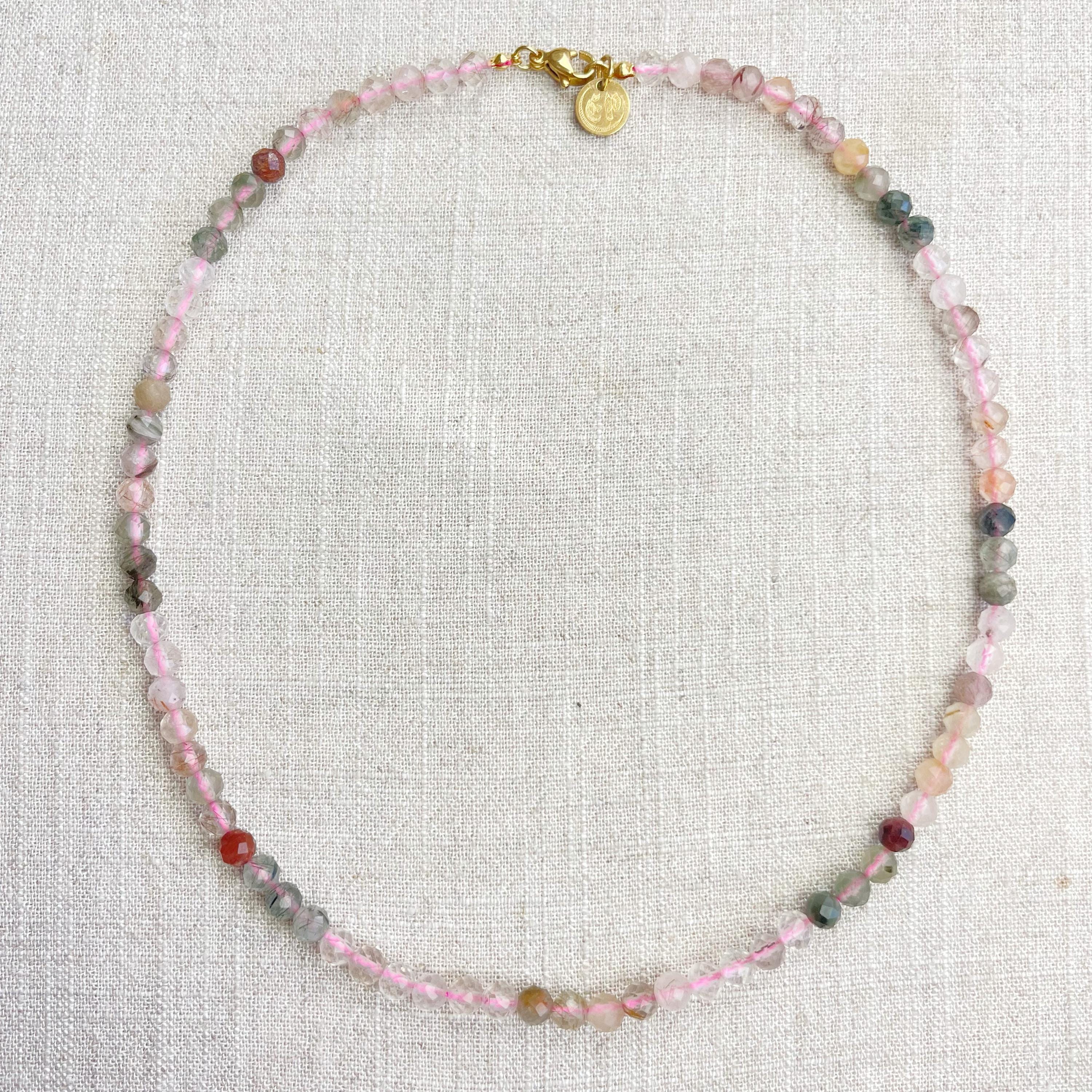 This necklace is made from beautiful rutilated quartz beads which are in different shades of colors. The beads are strung on a pink nylon cord. The necklace is finished off with a gold plated stainless steel lobster clasp and a logo charm.