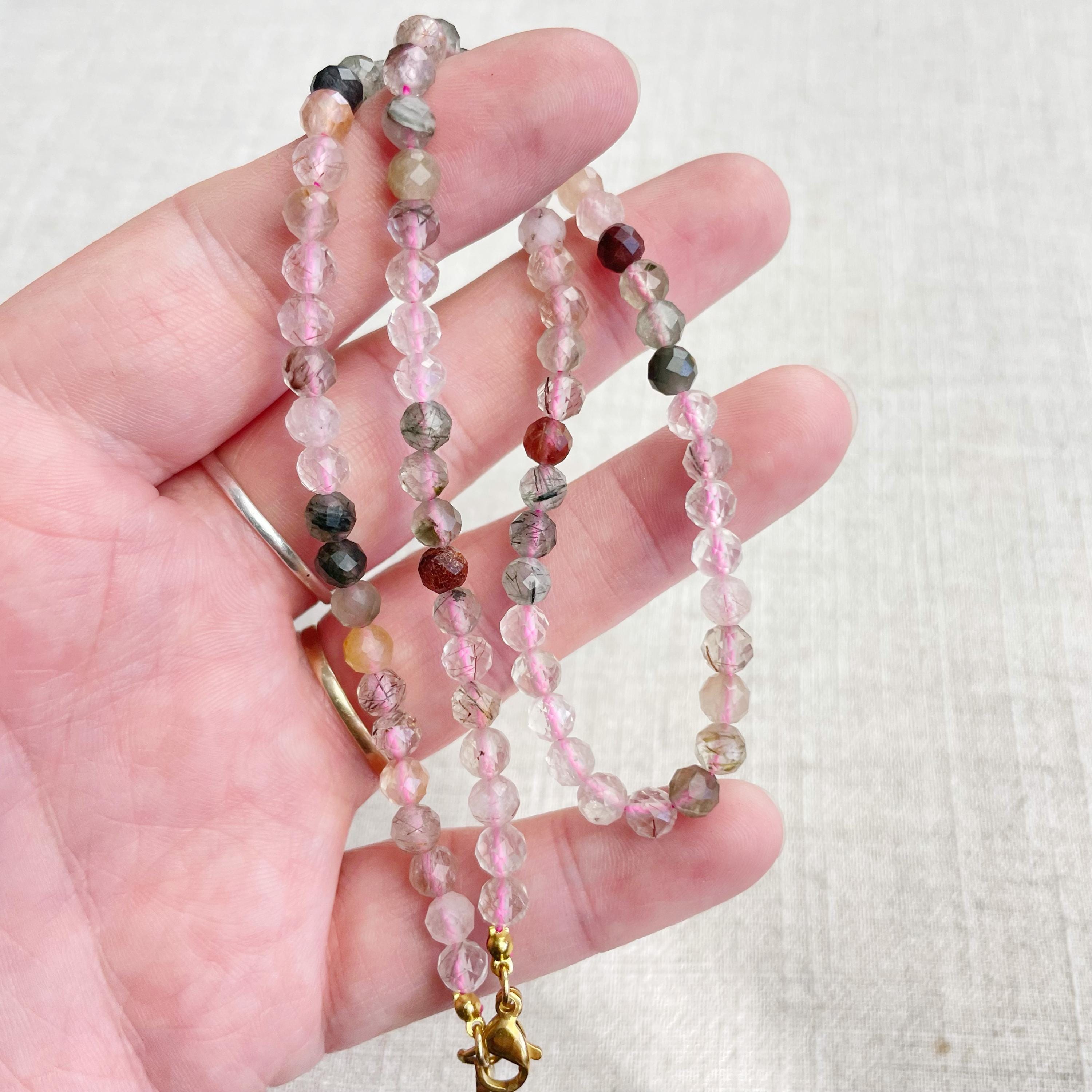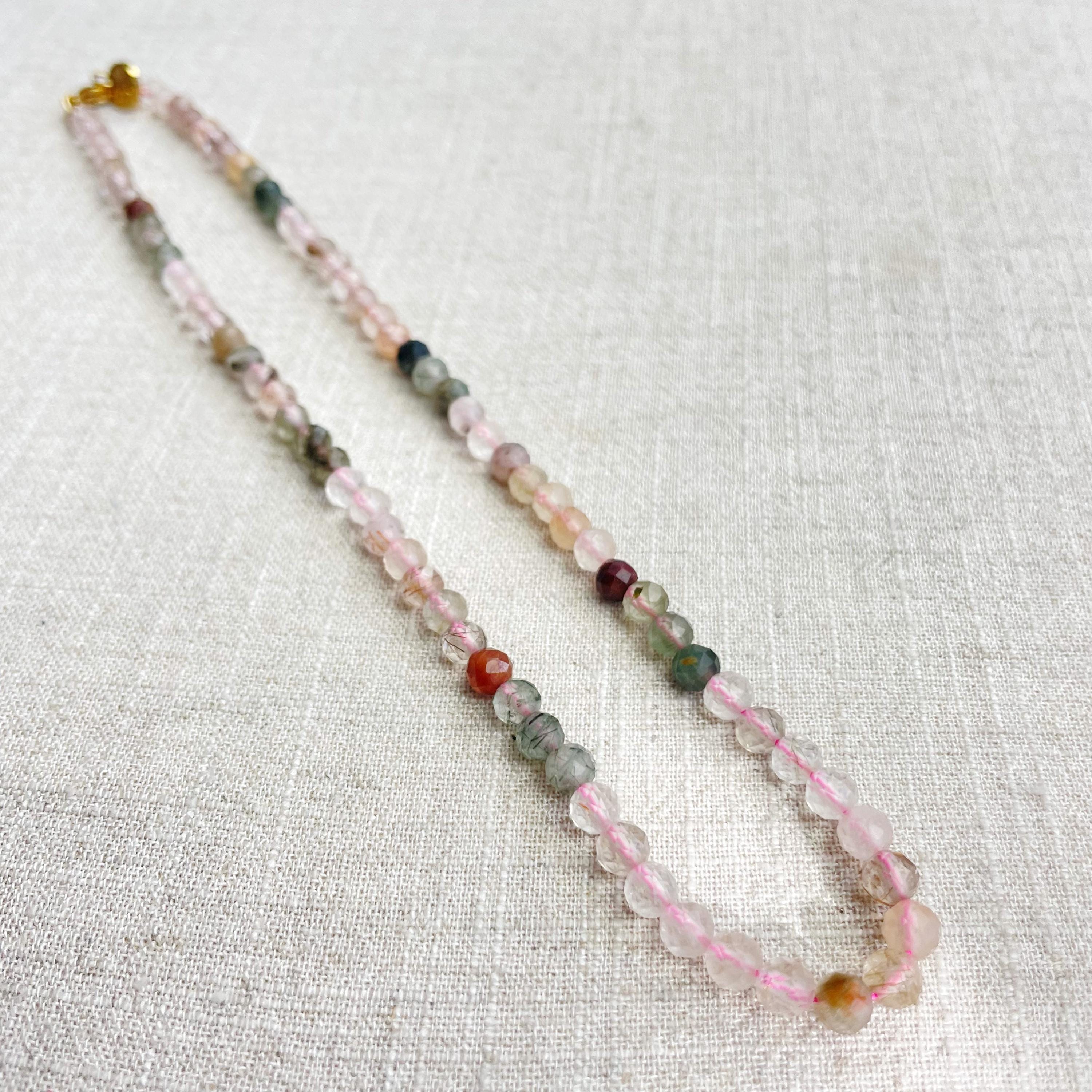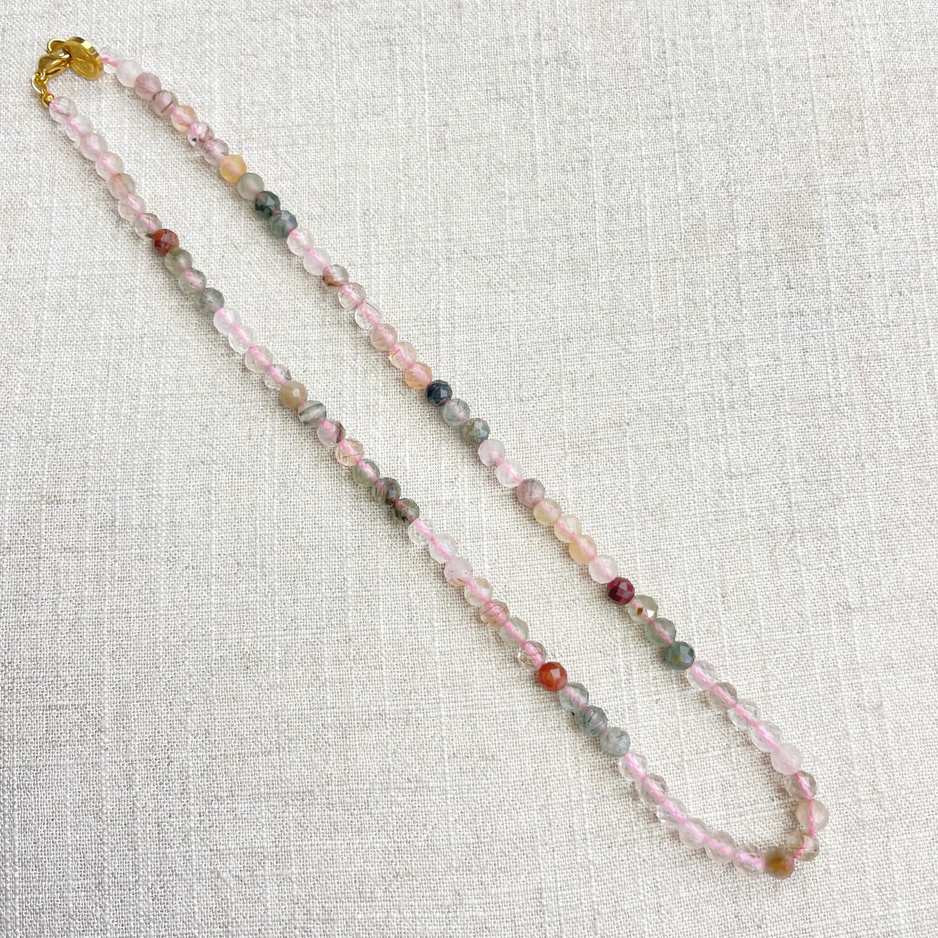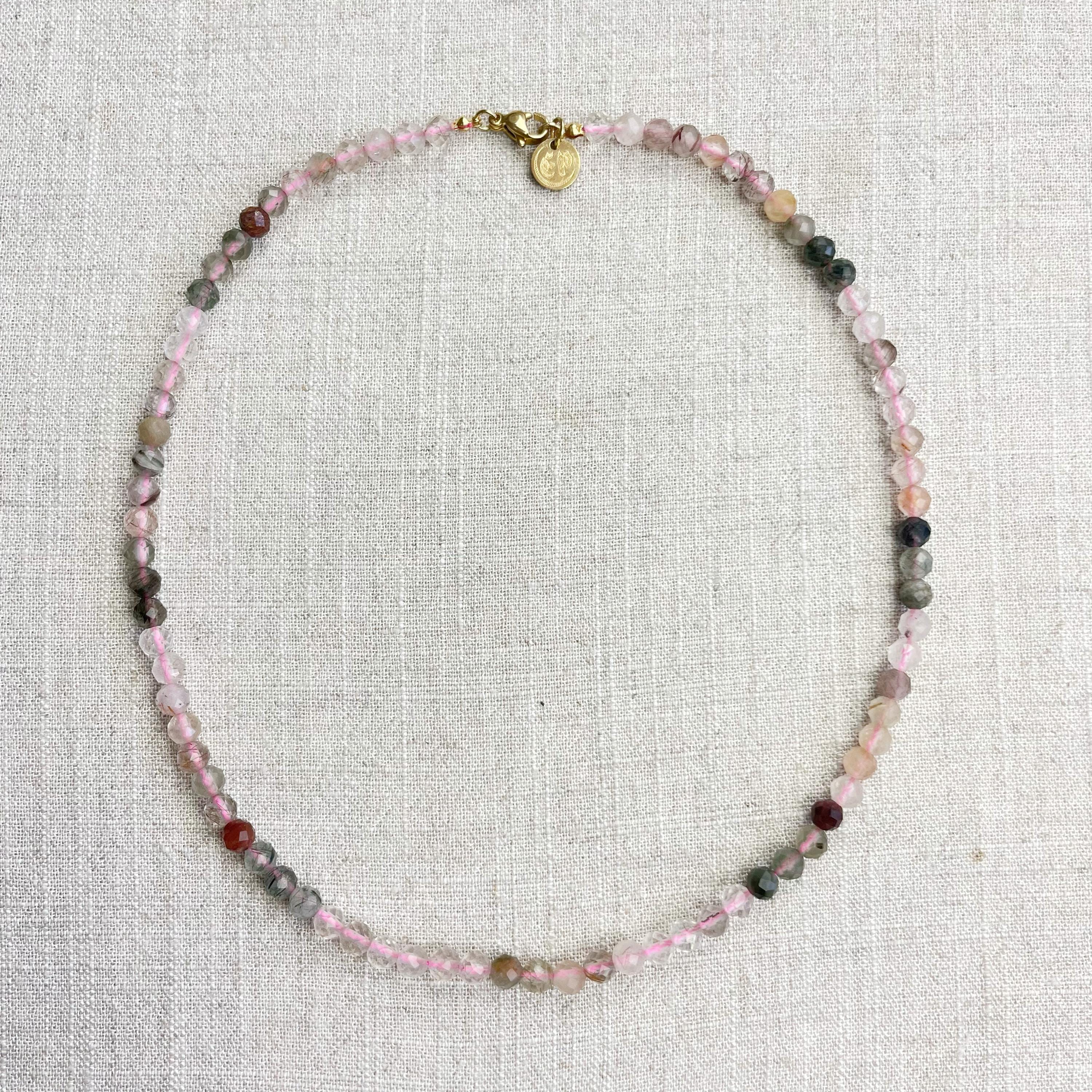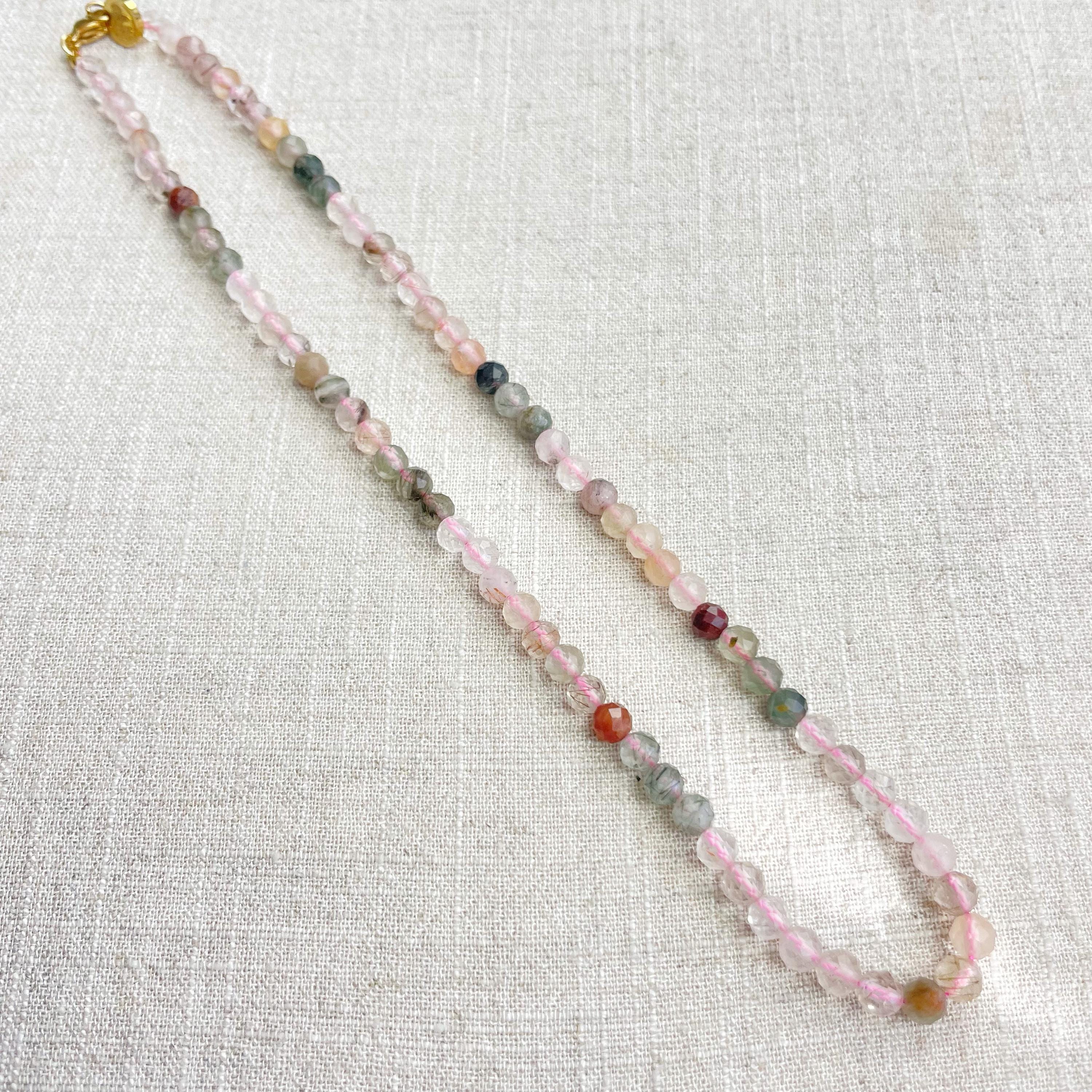 This necklace is made from beautiful rutilated quartz beads which are in different shades of colors. The beads are strung on a pink nylon cord. The necklace is finished off with a gold plated stainless steel lobster clasp and a logo charm.