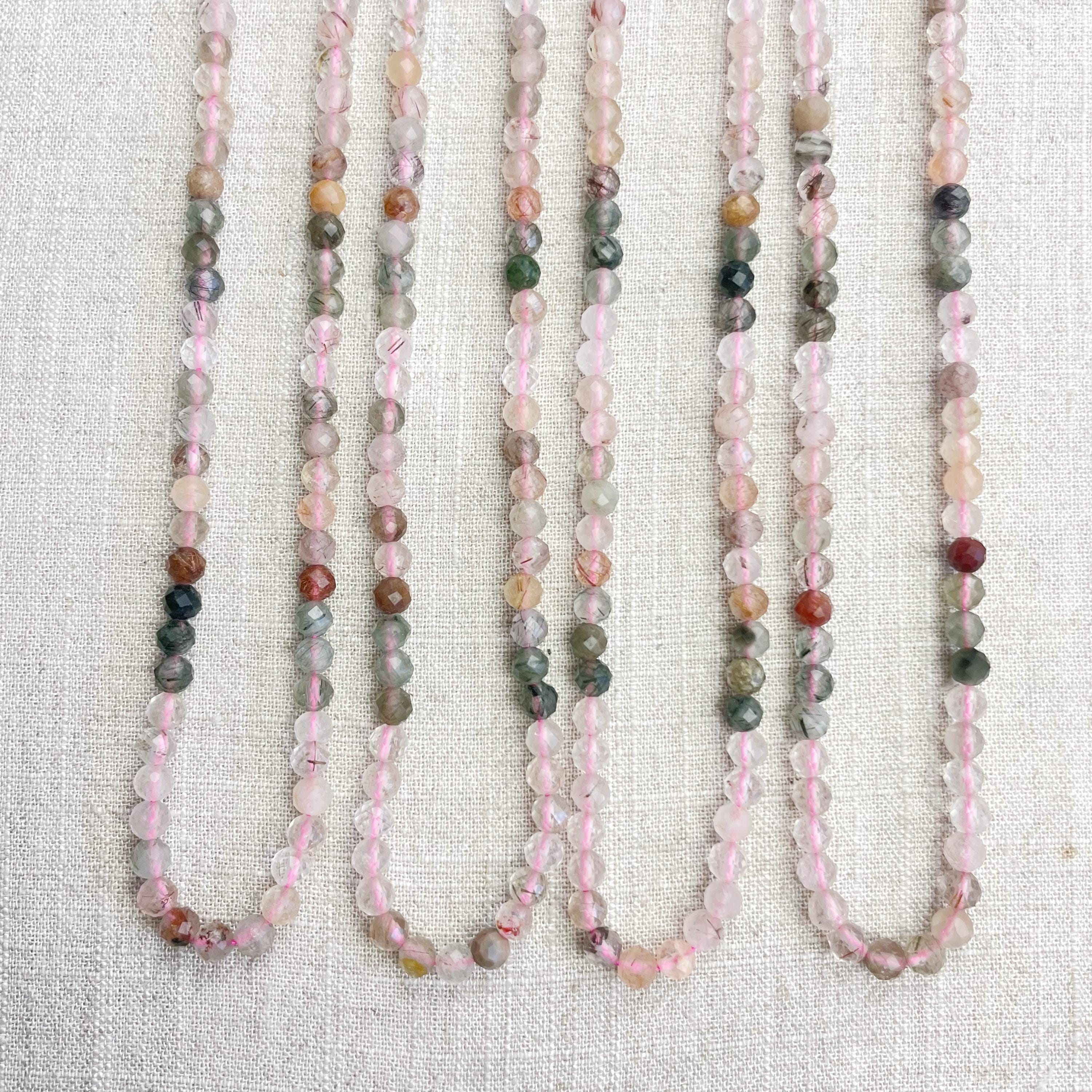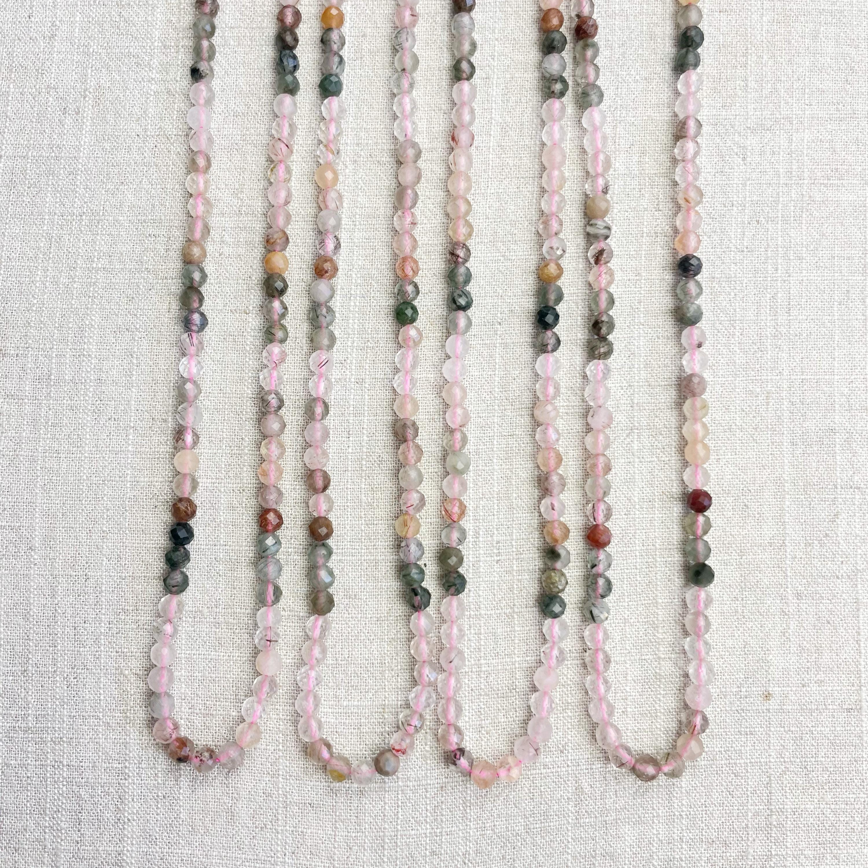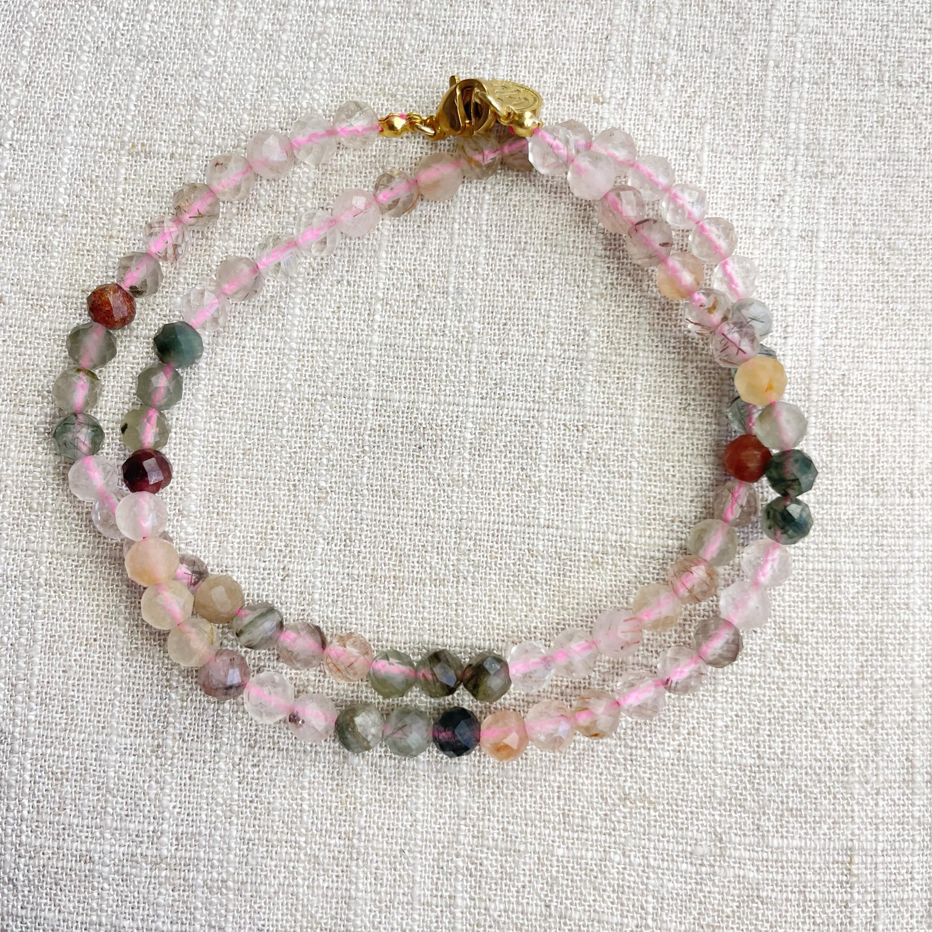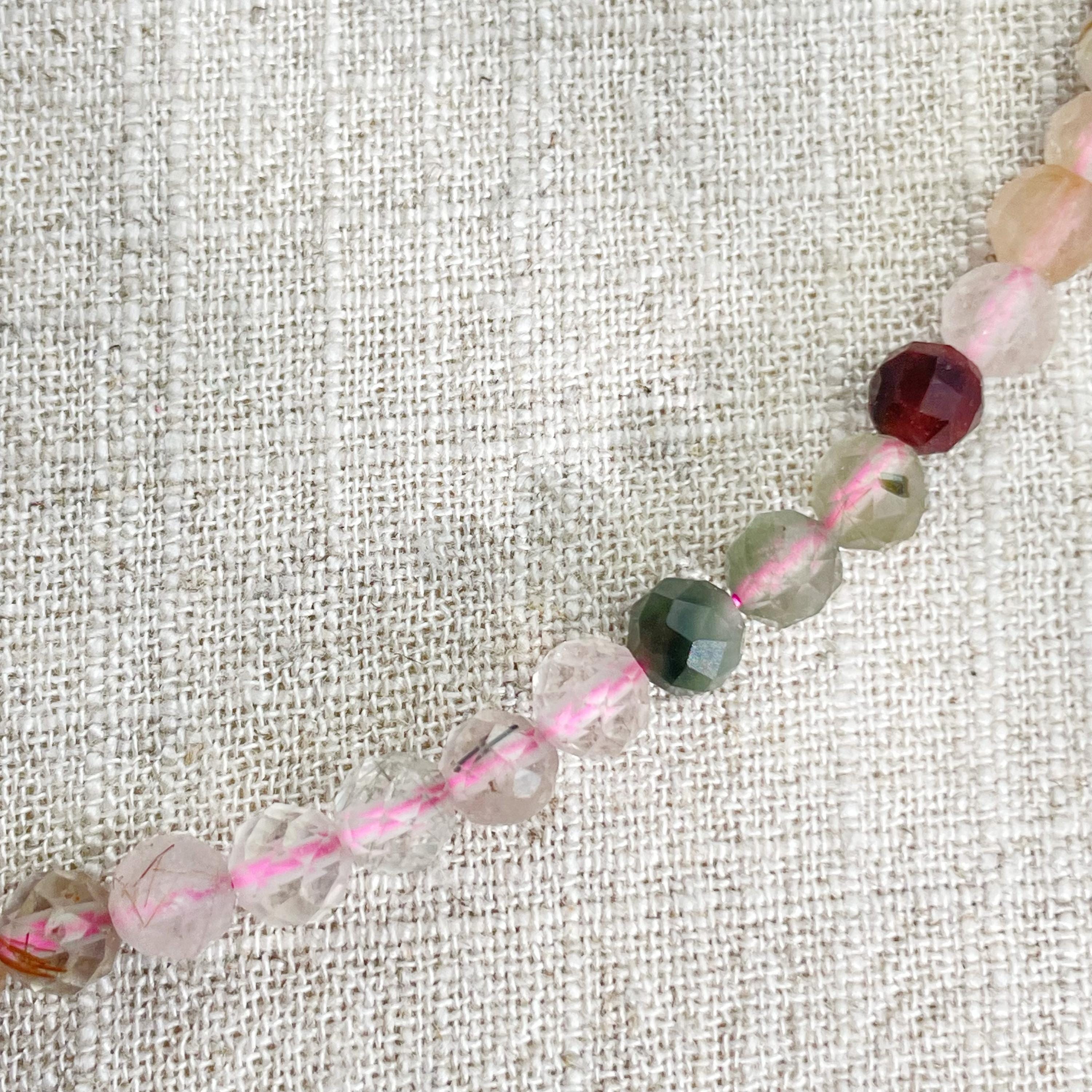 This necklace is made from beautiful rutilated quartz beads which are in different shades of colors. The beads are strung on a pink nylon cord. The necklace is finished off with a gold plated stainless steel lobster clasp and a logo charm.