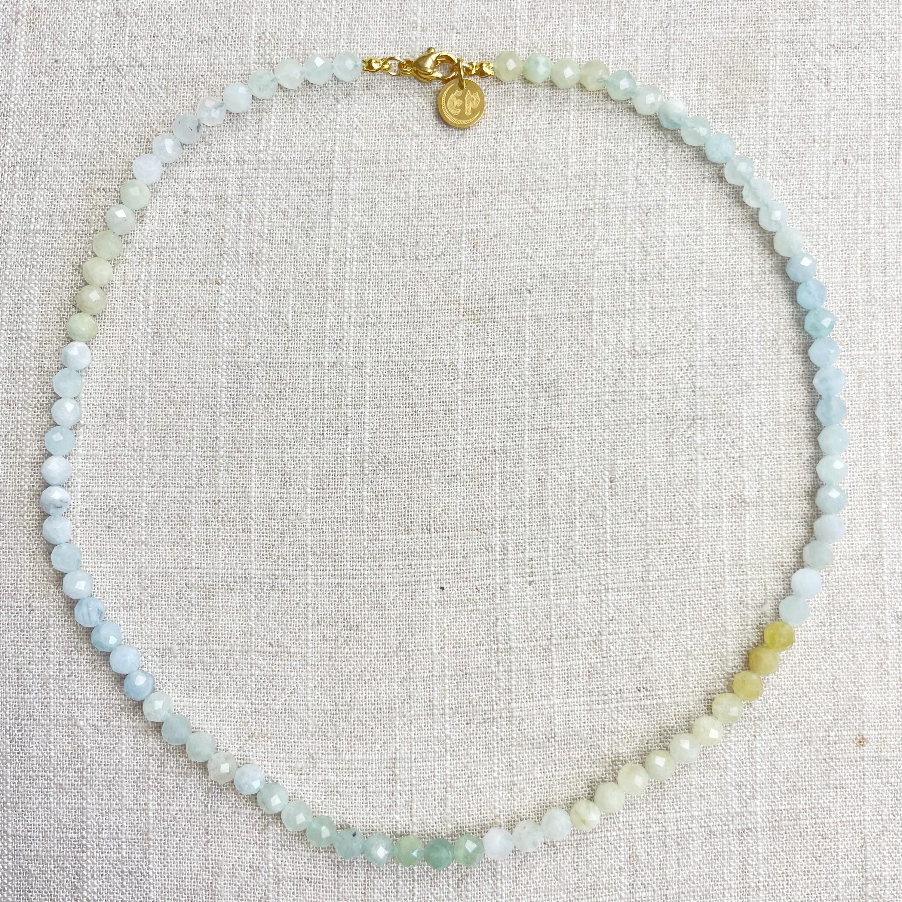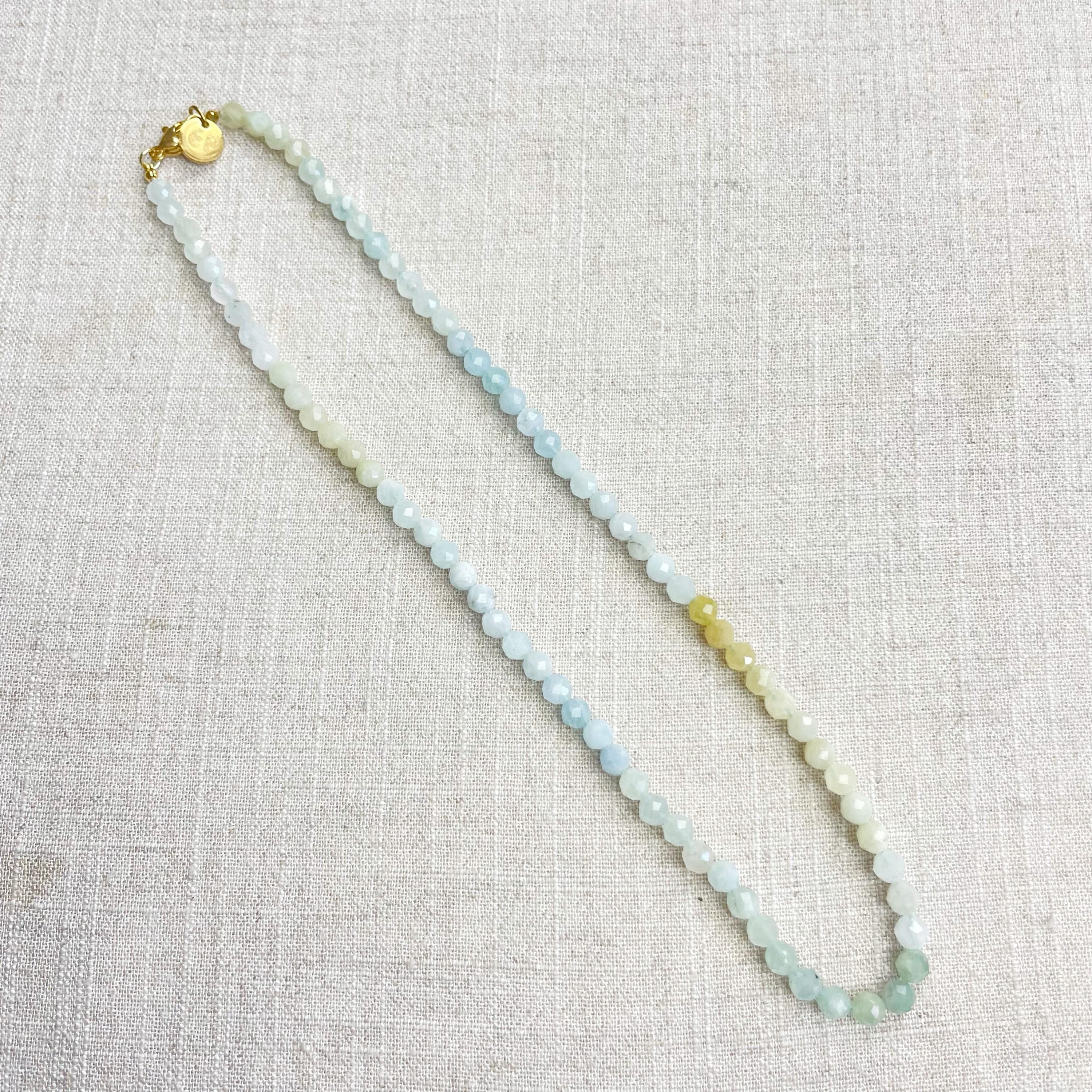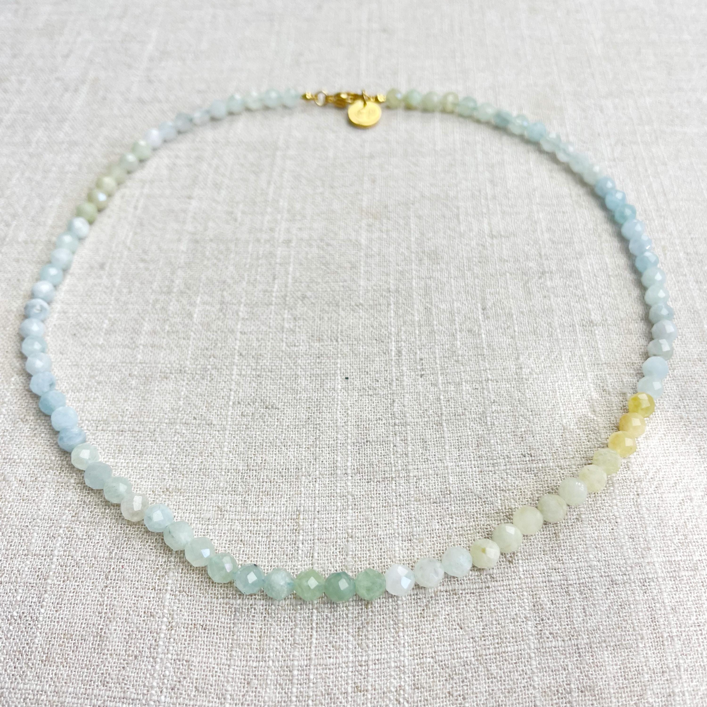 This necklace is made from beautiful aquamarine beads which are in different shades of blue, green and yellow. The beads are strung on a nylon cord. The necklace is finished off with a gold plated stainless steel lobster clasp and a logo charm.
