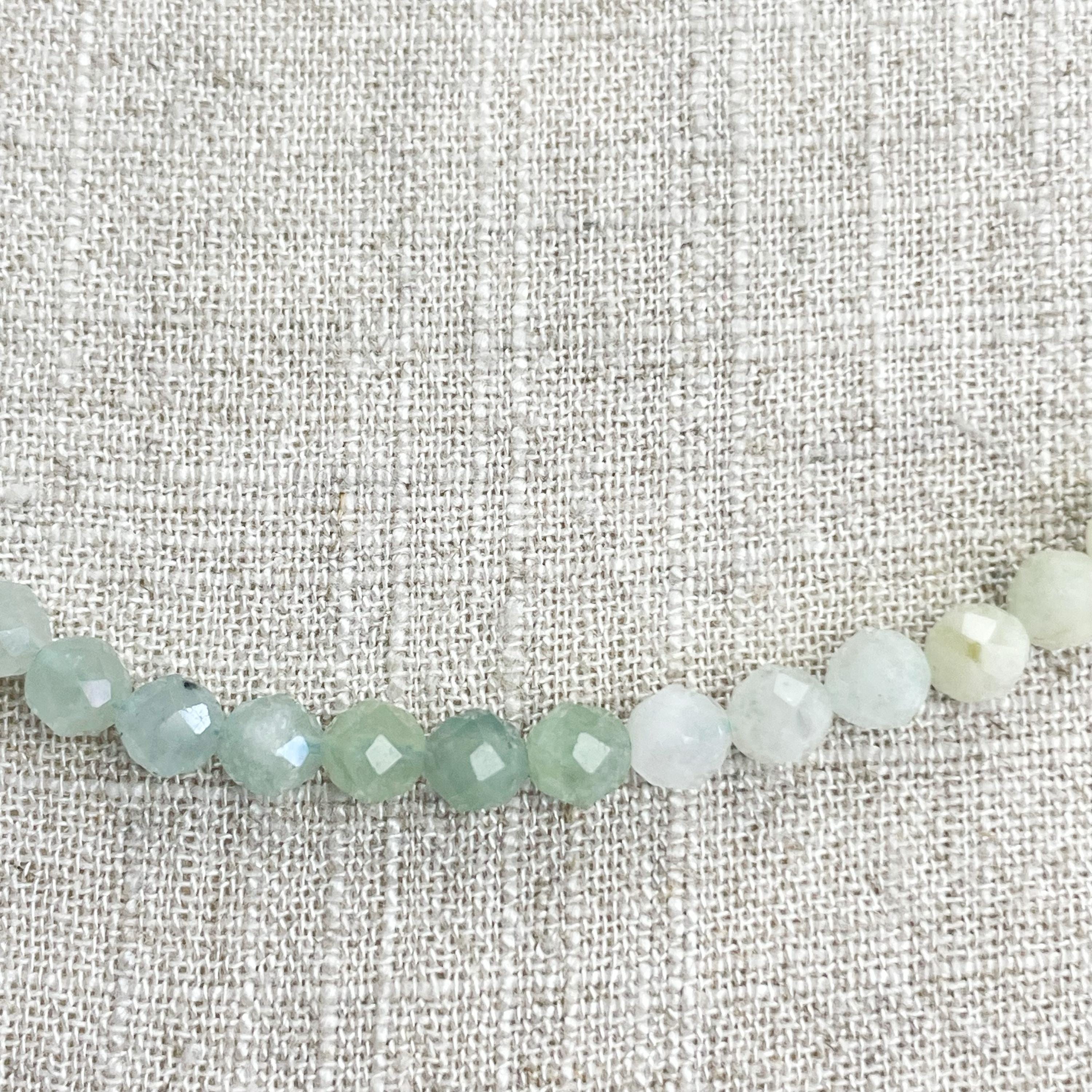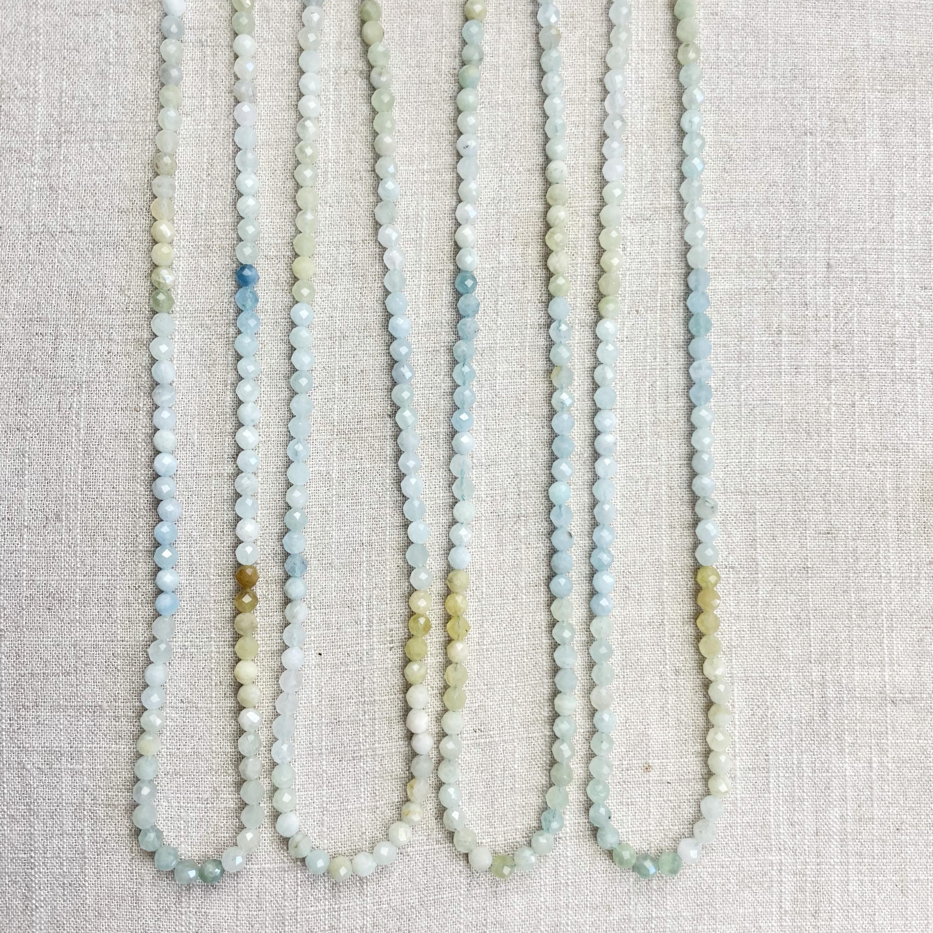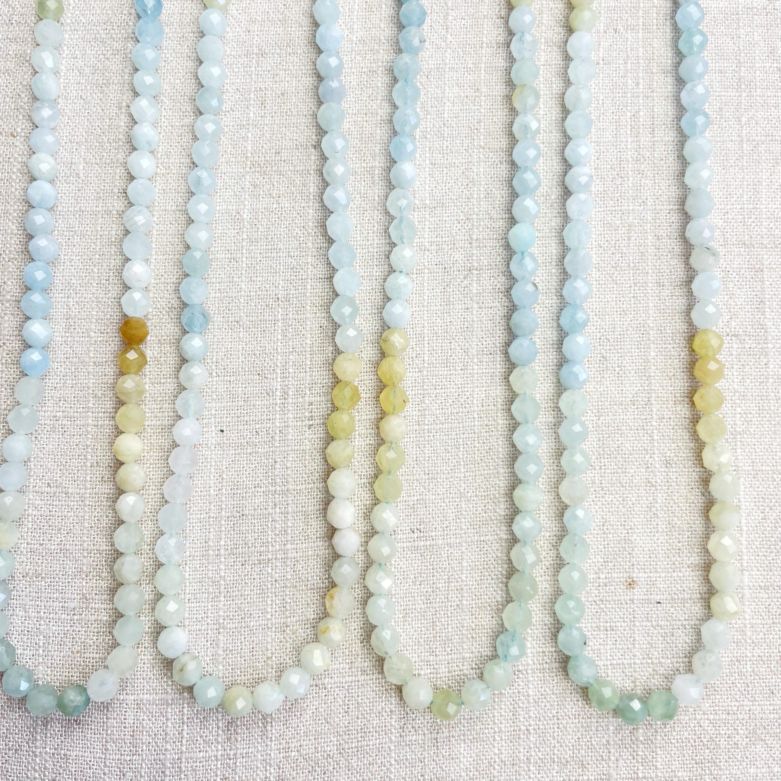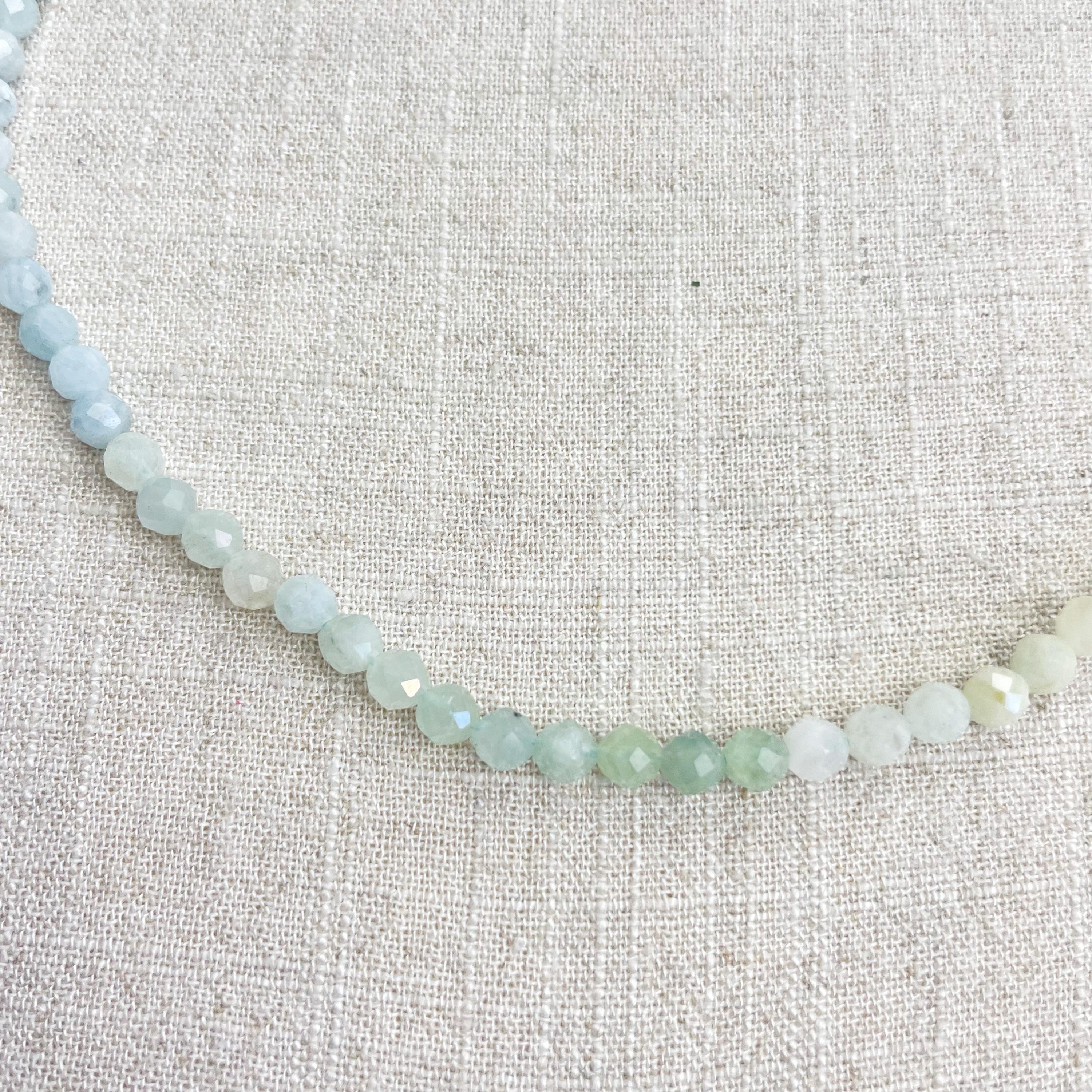 This necklace is made from beautiful aquamarine beads which are in different shades of blue, green and yellow. The beads are strung on a nylon cord. The necklace is finished off with a gold plated stainless steel lobster clasp and a logo charm.