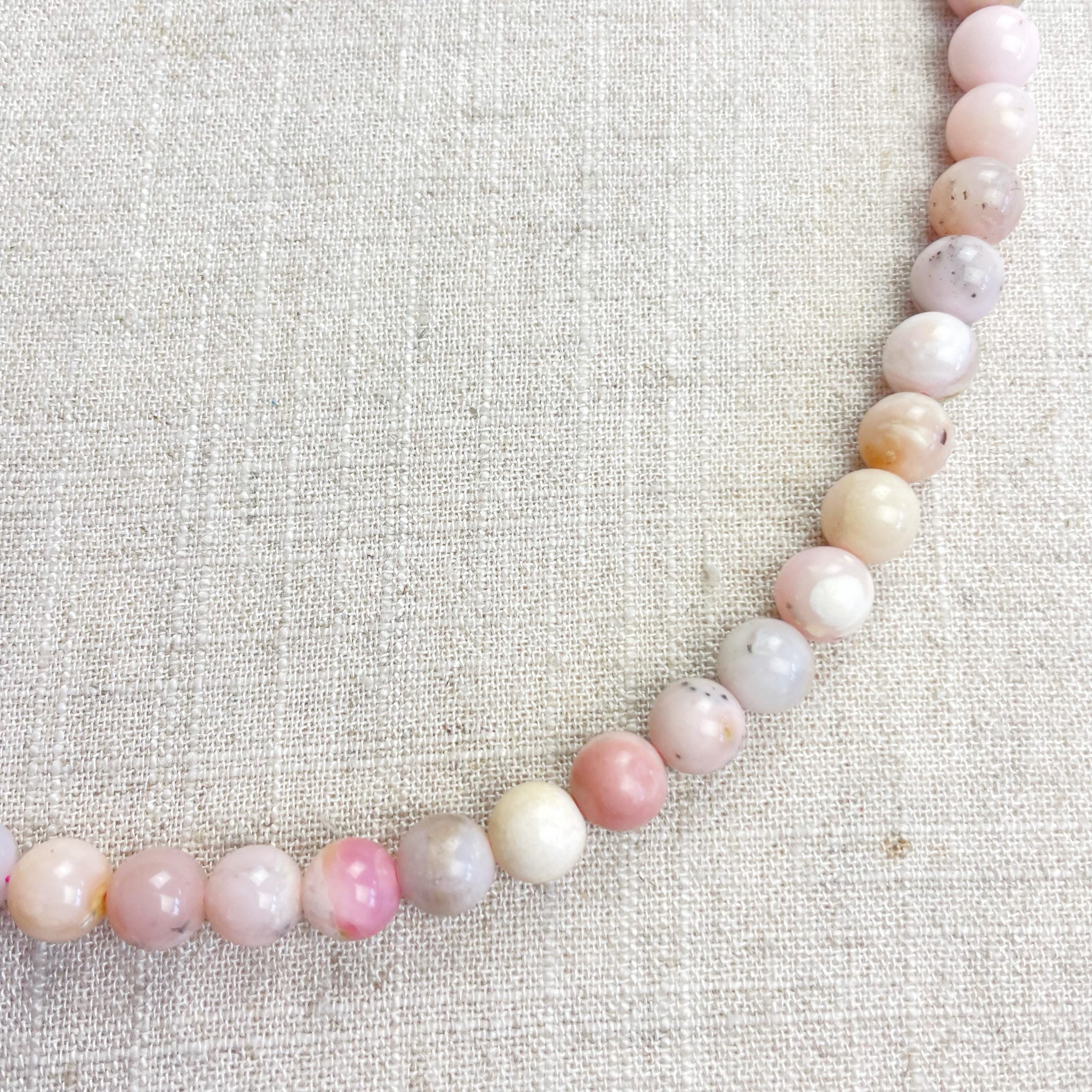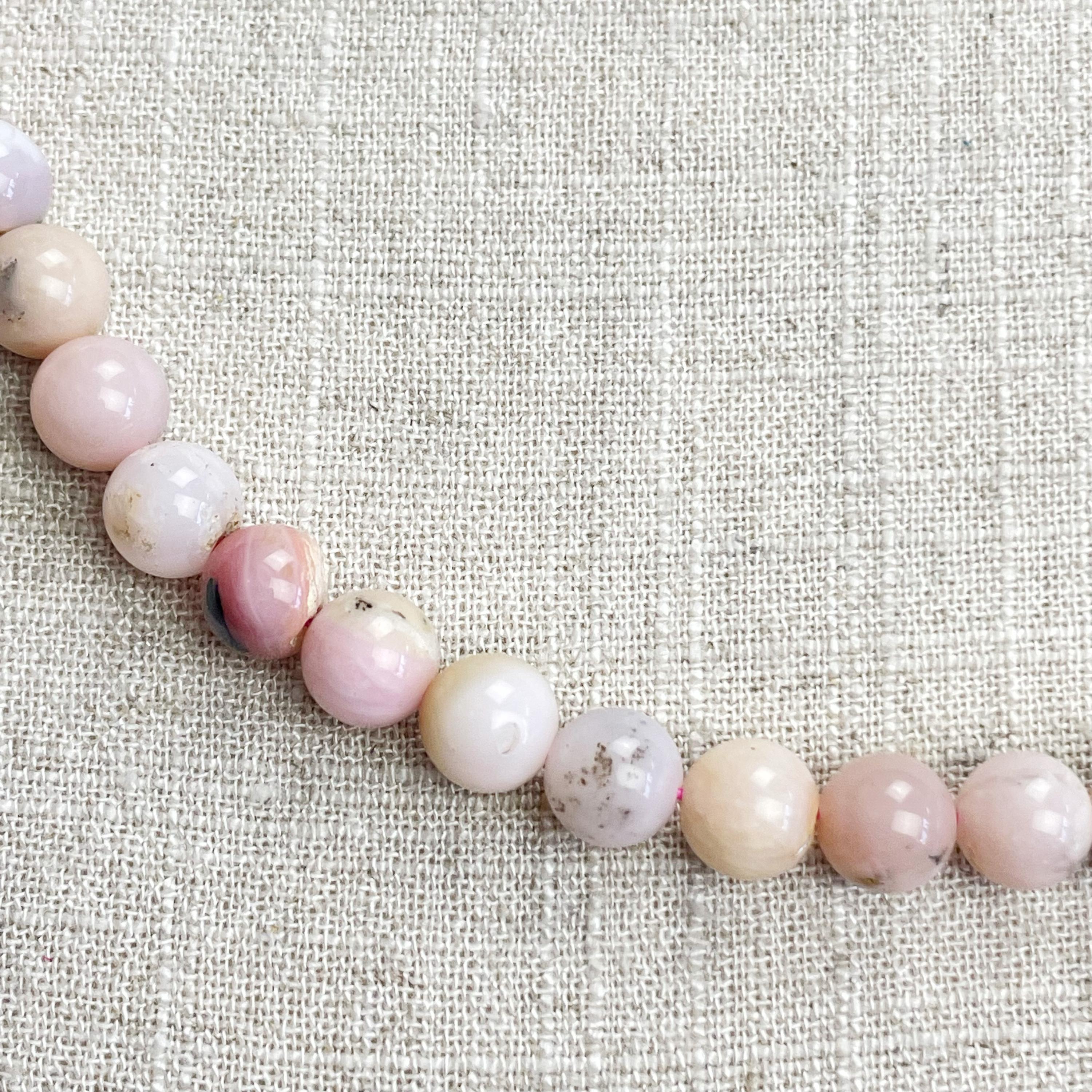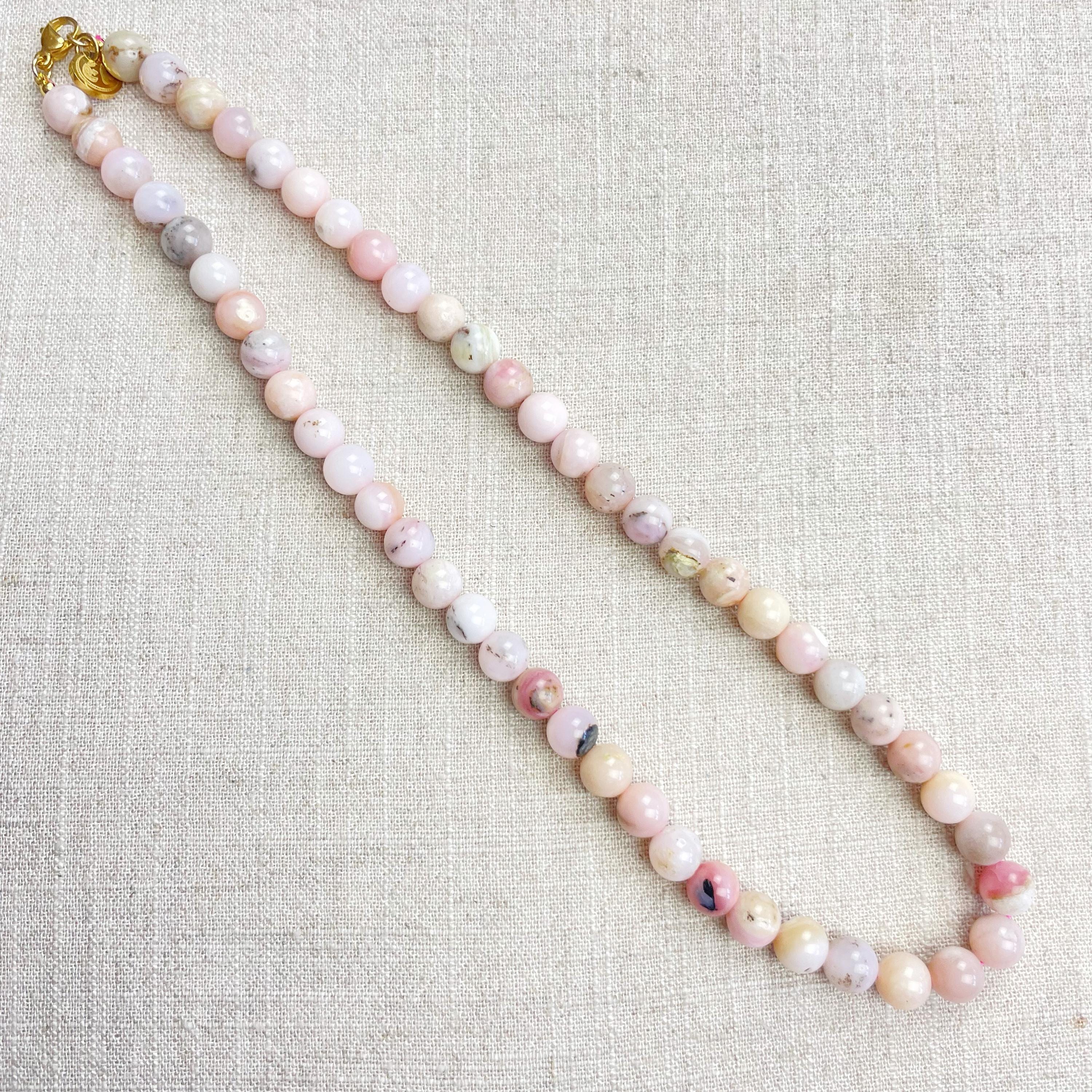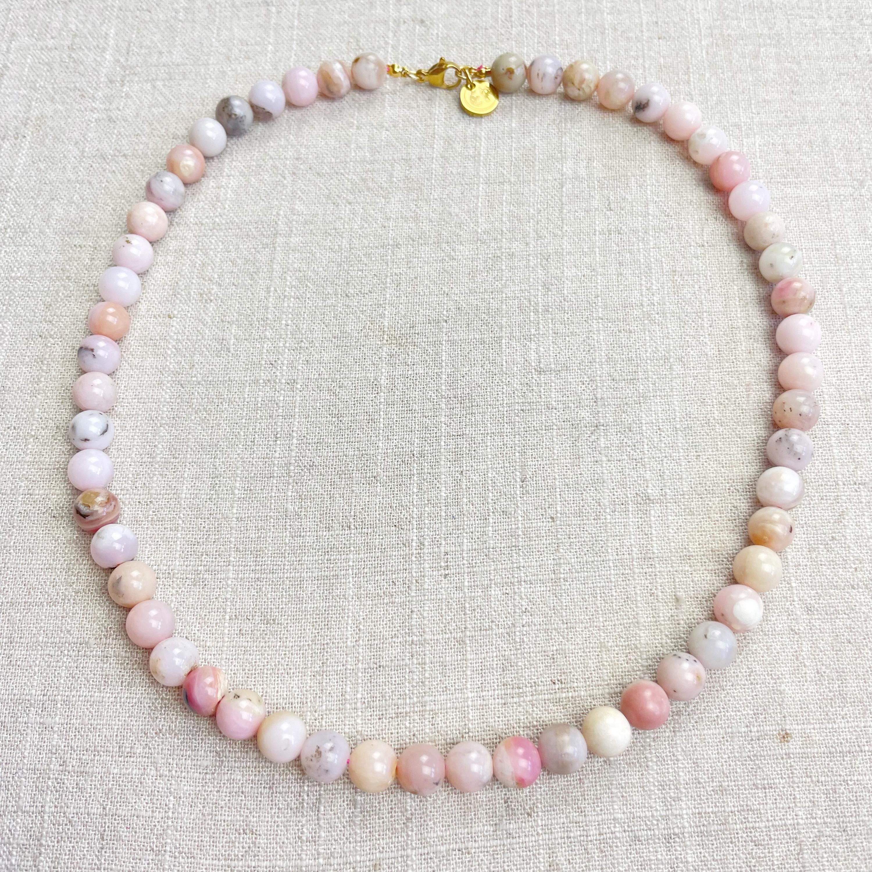 This necklace is made from beautiful pink opal beads. The beads are 8mm and have a variation in colors. The beads are strung on a nylon cord. The necklace is finished off with a gold plated stainless steel lobster clasp and a logo charm.