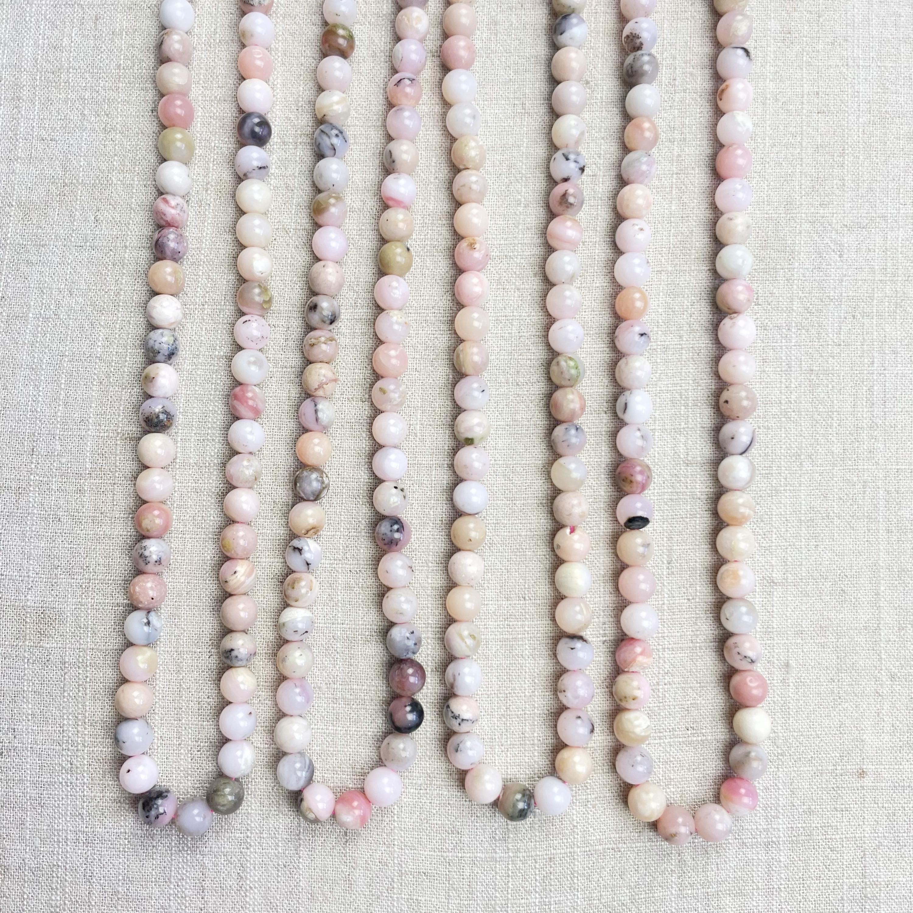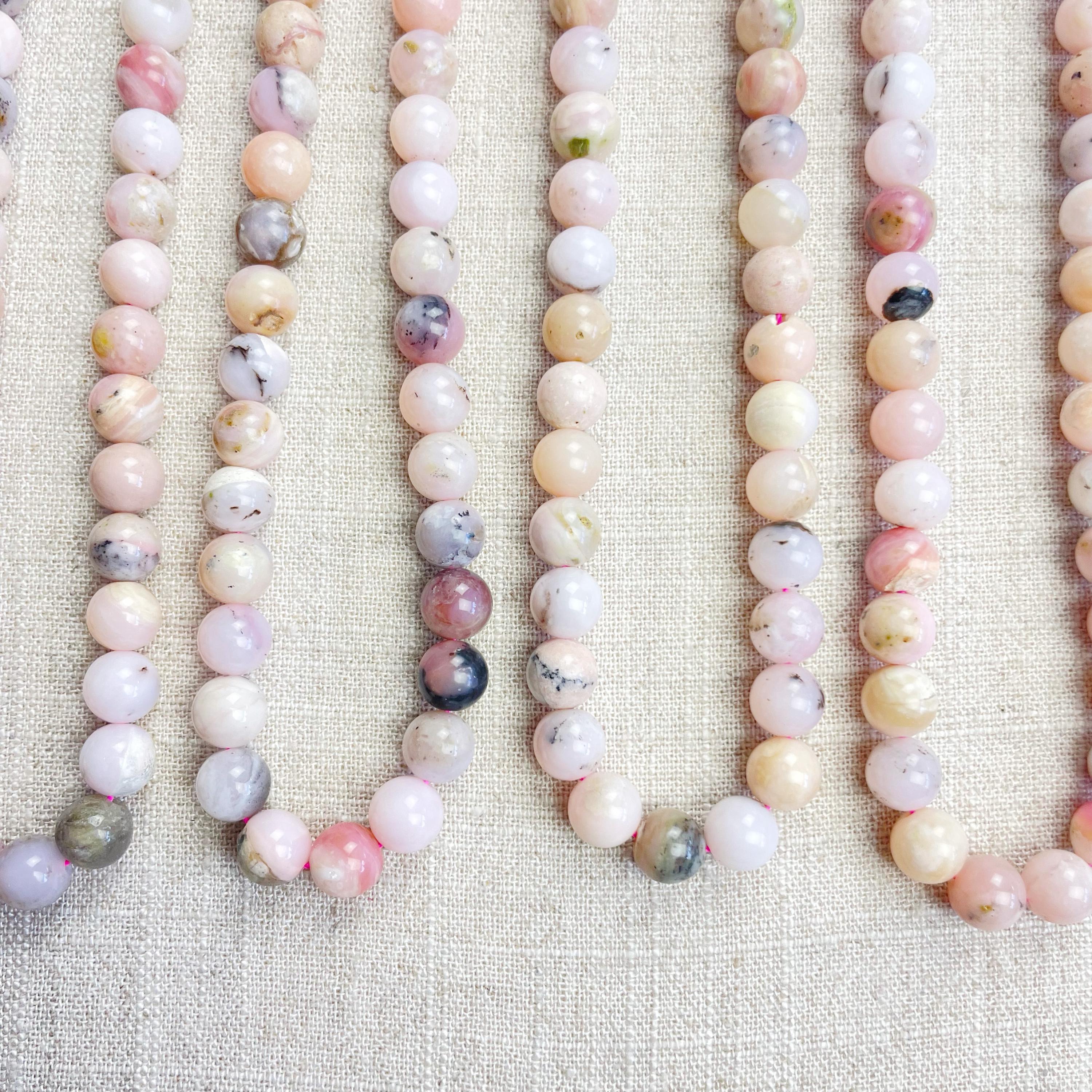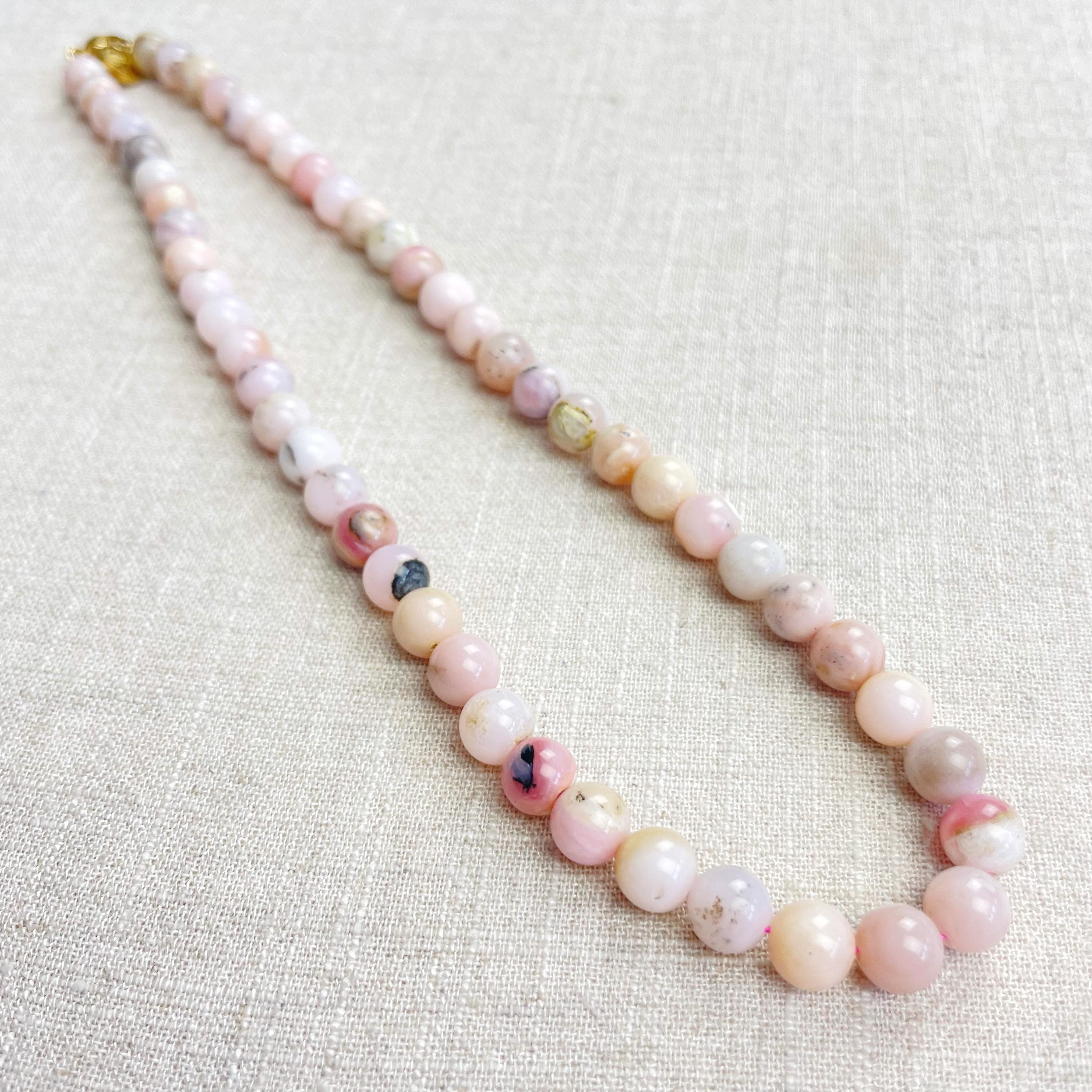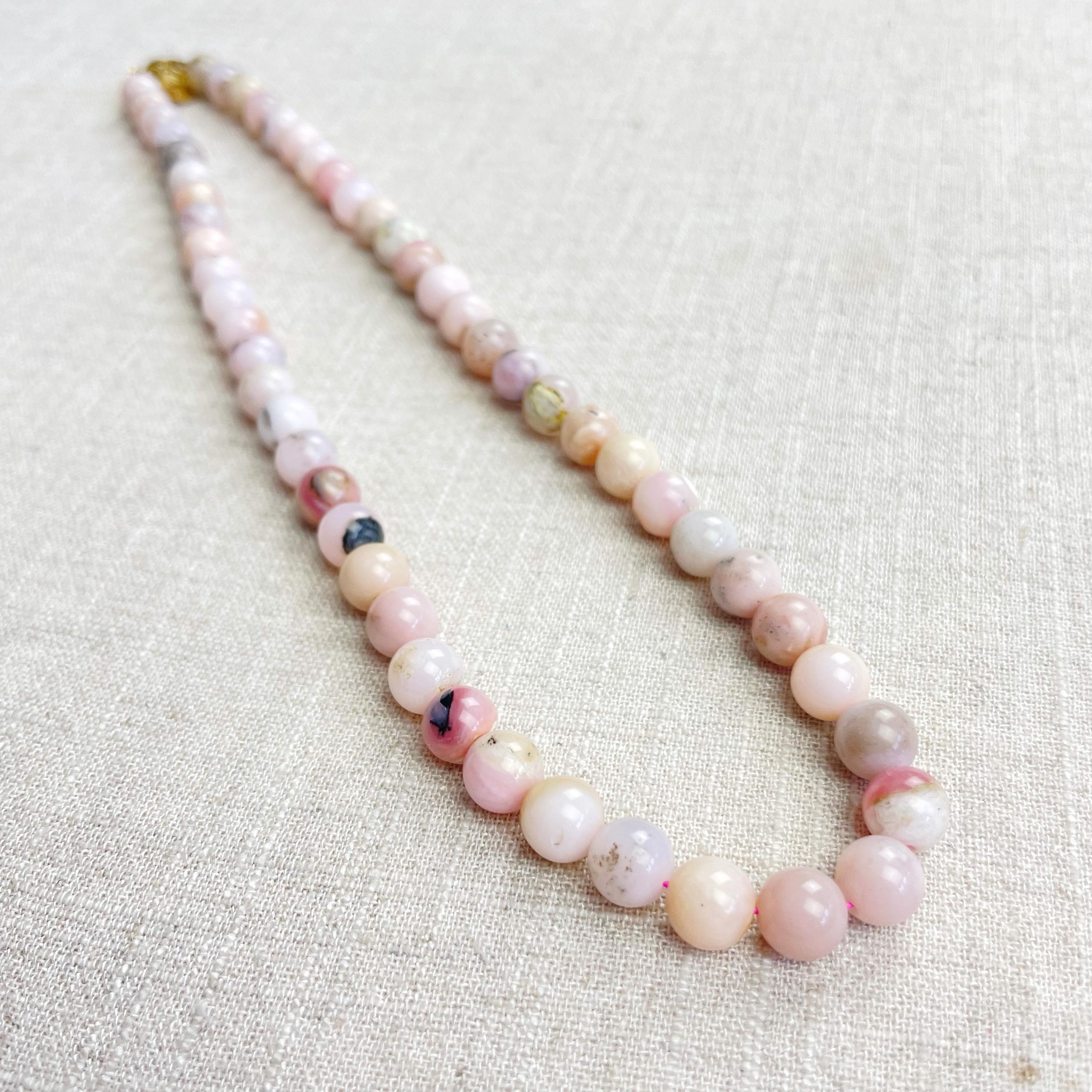 This necklace is made from beautiful pink opal beads. The beads are 8mm and have a variation in colors. The beads are strung on a nylon cord. The necklace is finished off with a gold plated stainless steel lobster clasp and a logo charm.