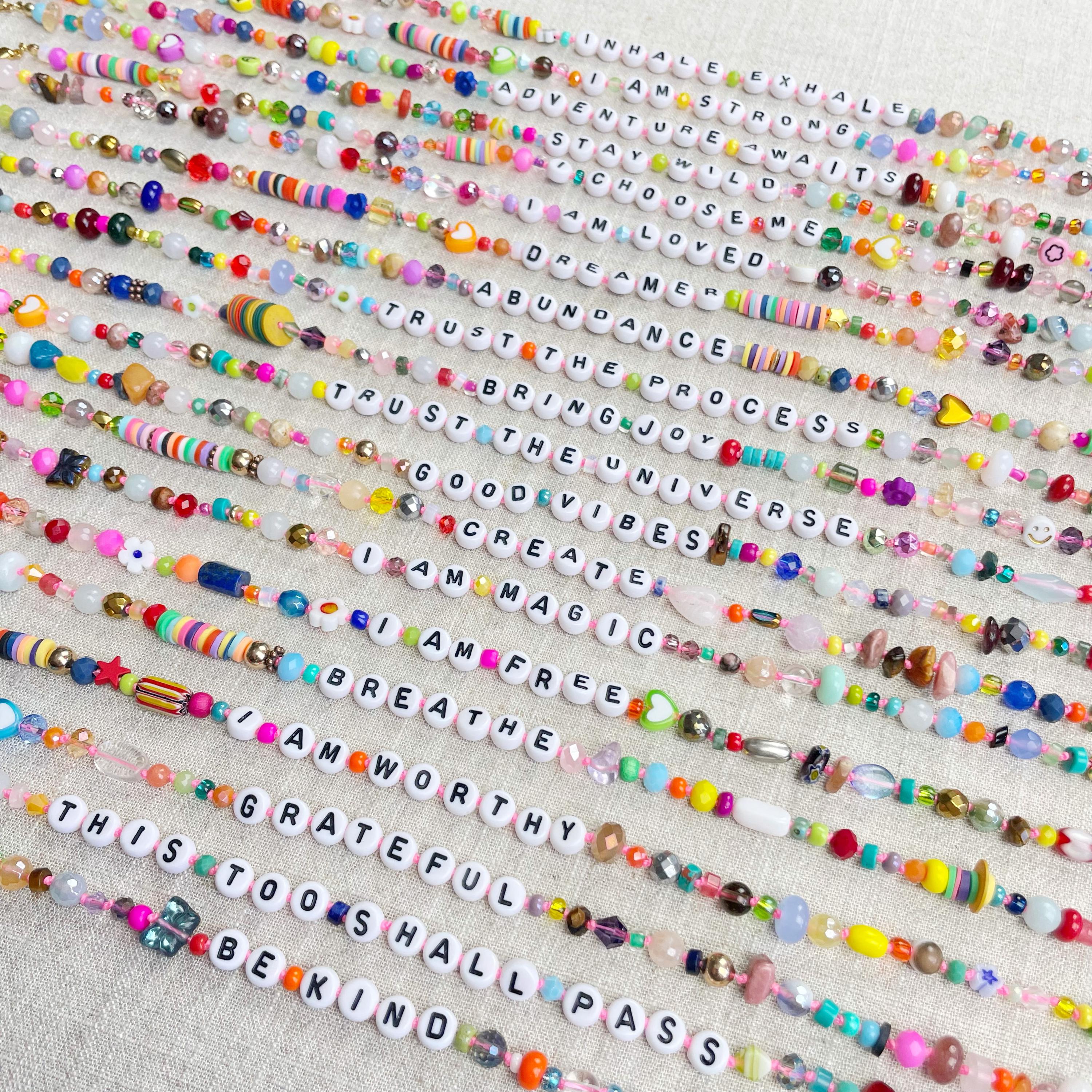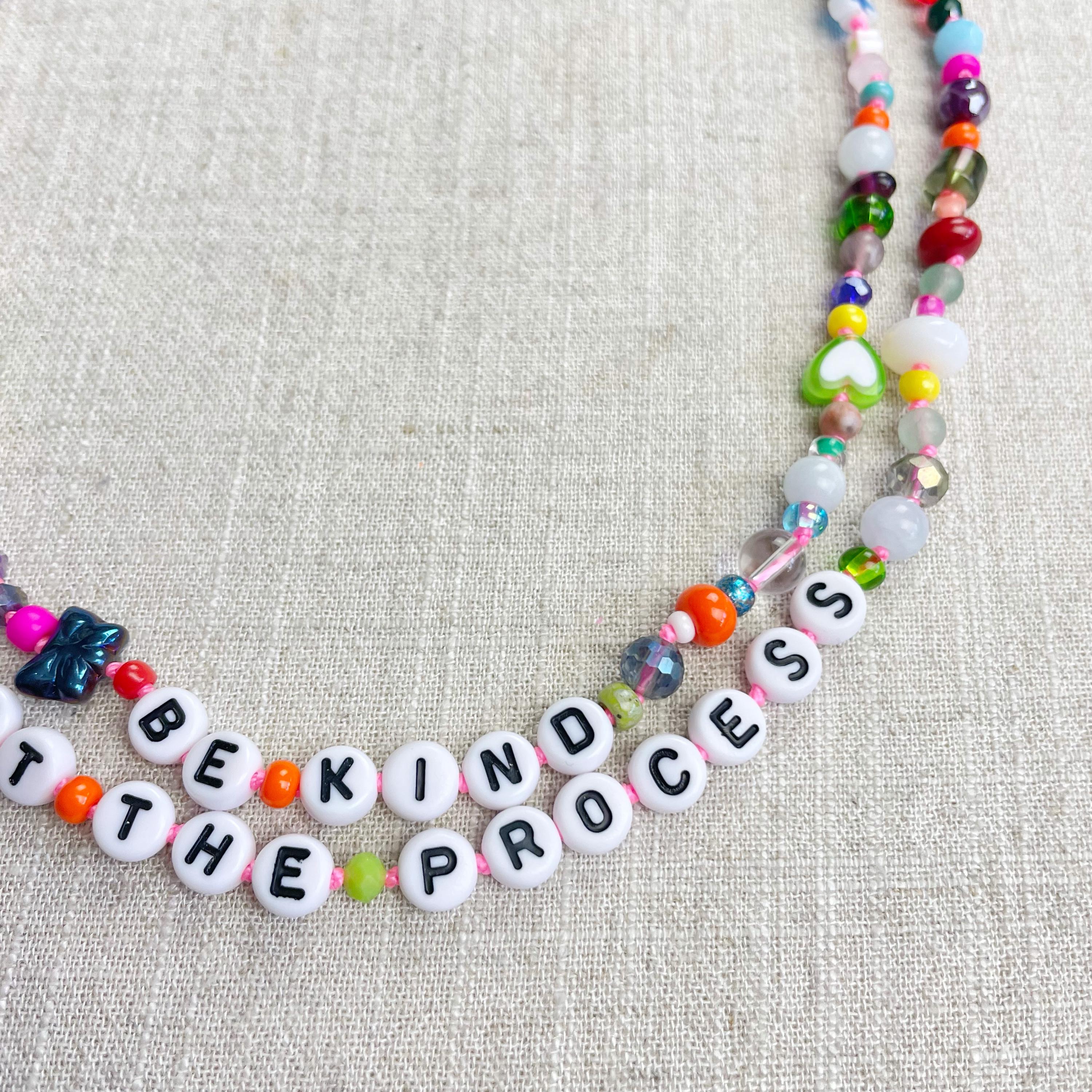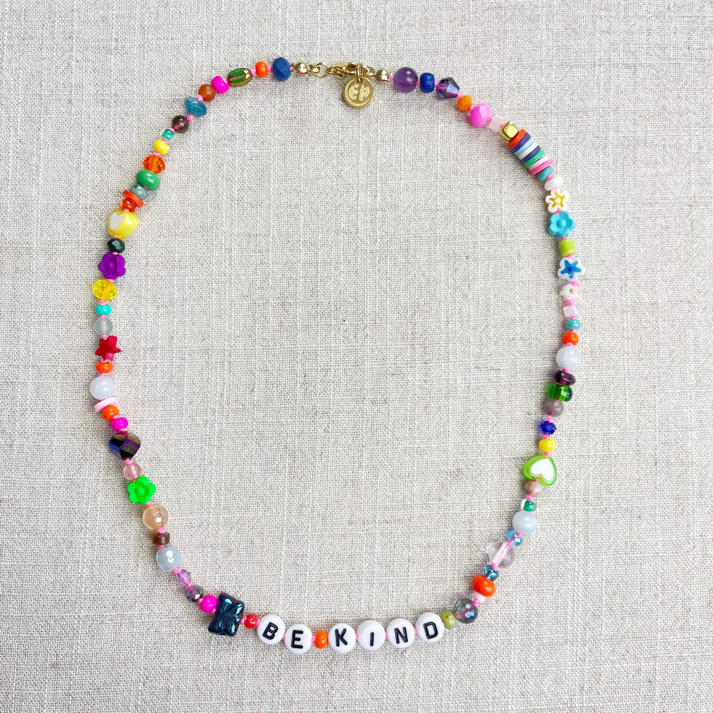 This necklace is made with a variety of beads of different sizes and shapes. The beads are a variety of gemstones, wood, glass, ceramic, plastic, resin, rubber, metal and others. The beads range from 3mm to 8mm in size. Plastic letter beads are in the center of the necklace with inspirational quotes and sayings. The necklace is hand-knotted in between each bead. The necklace is finished off with a gold plated stainless steel chain, clasp and logo charm.