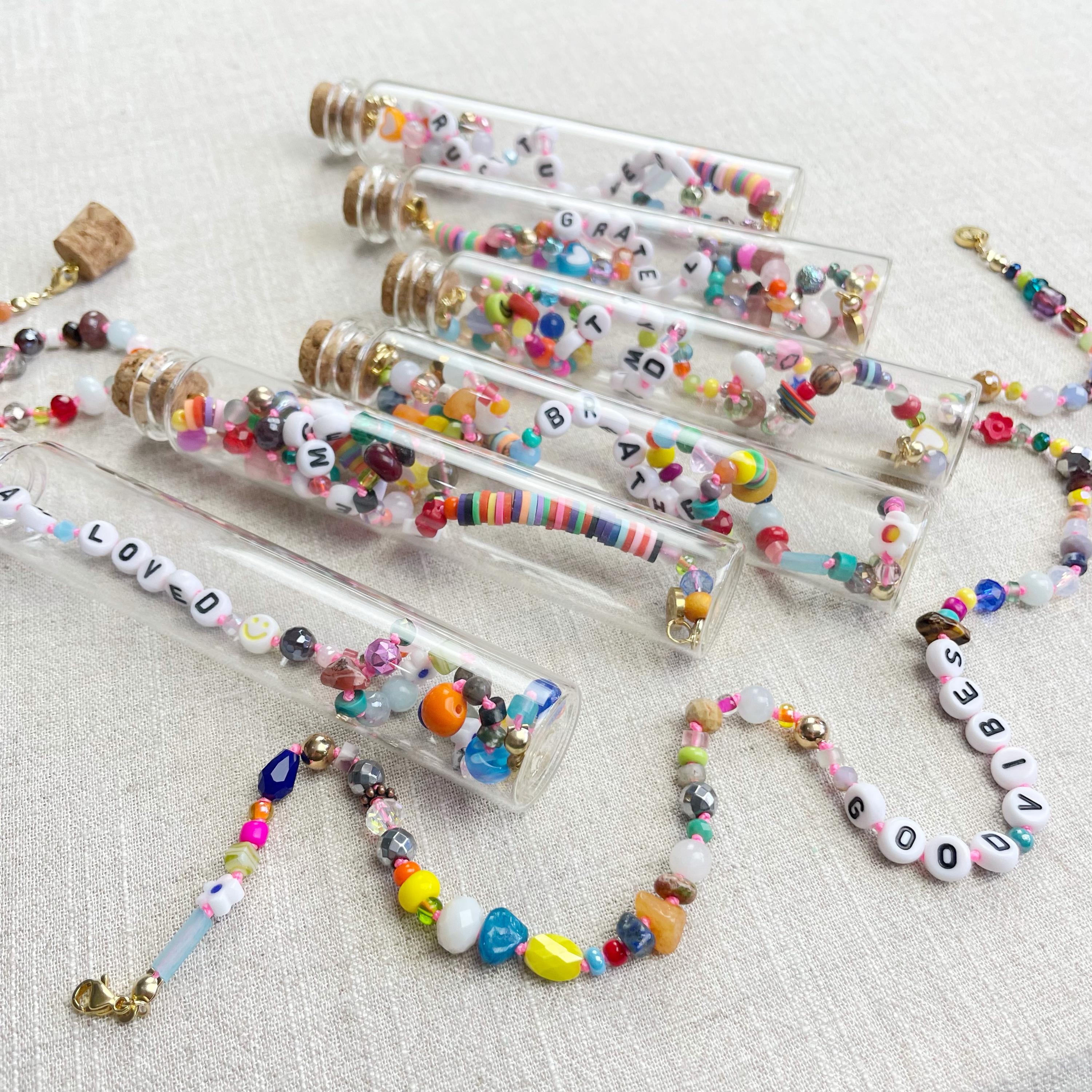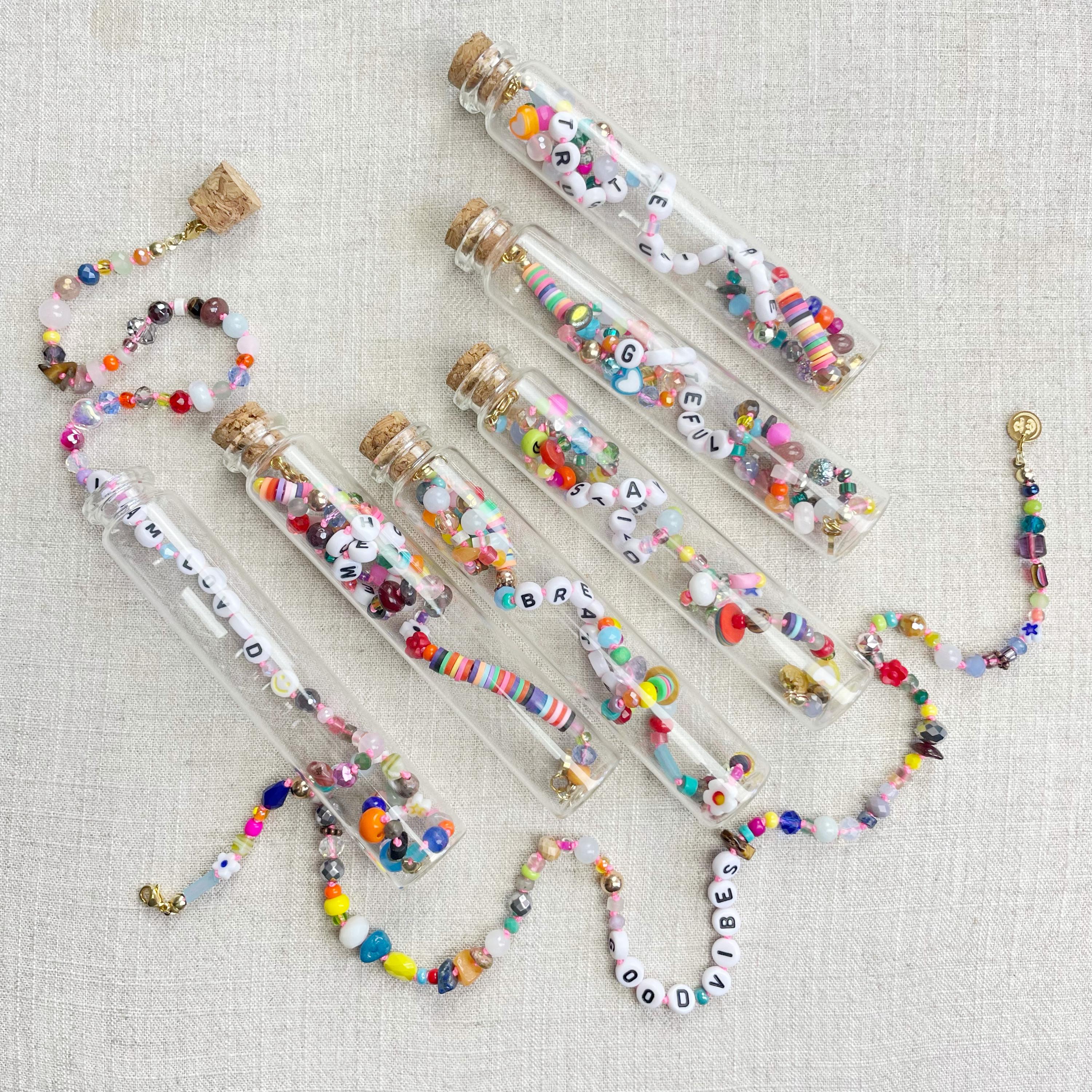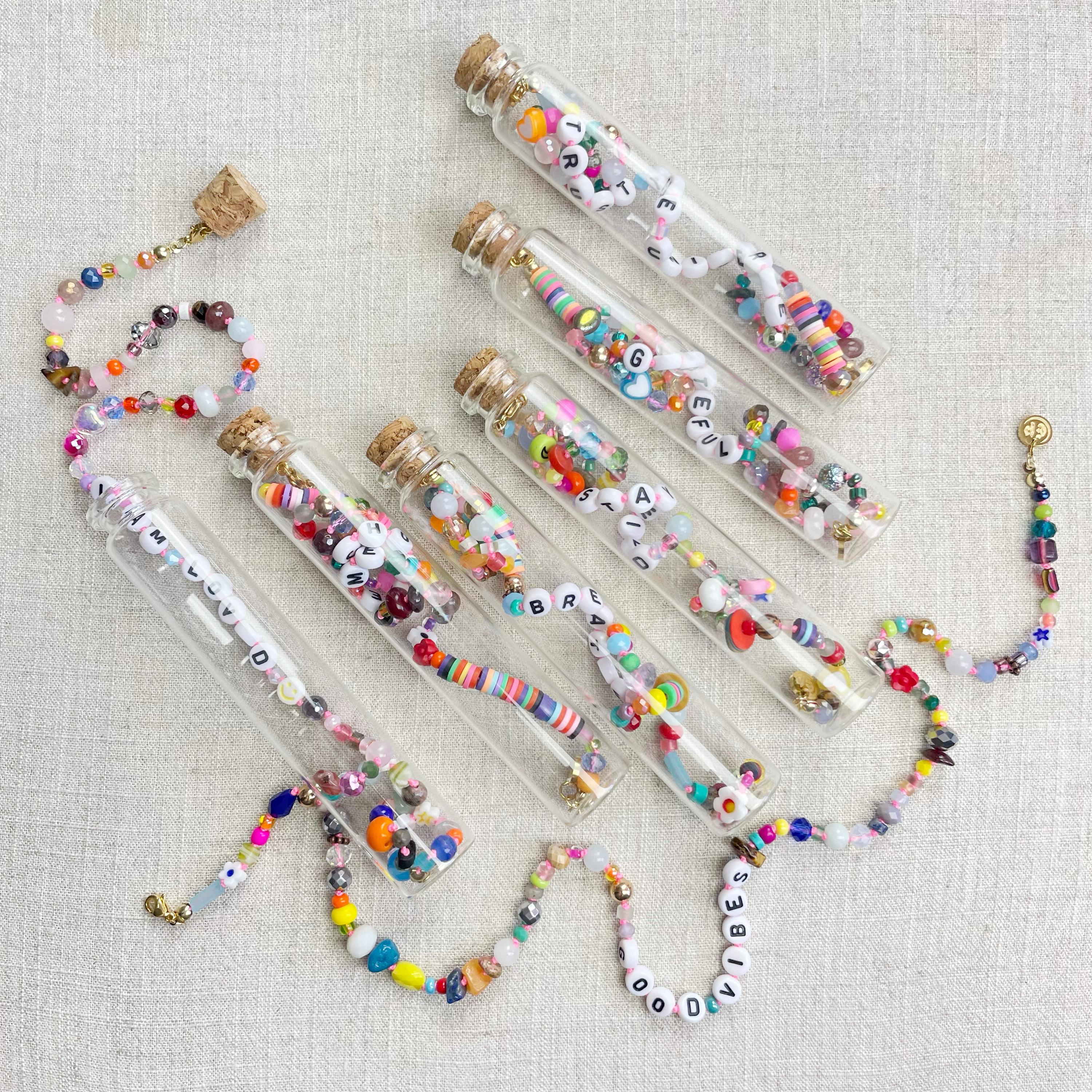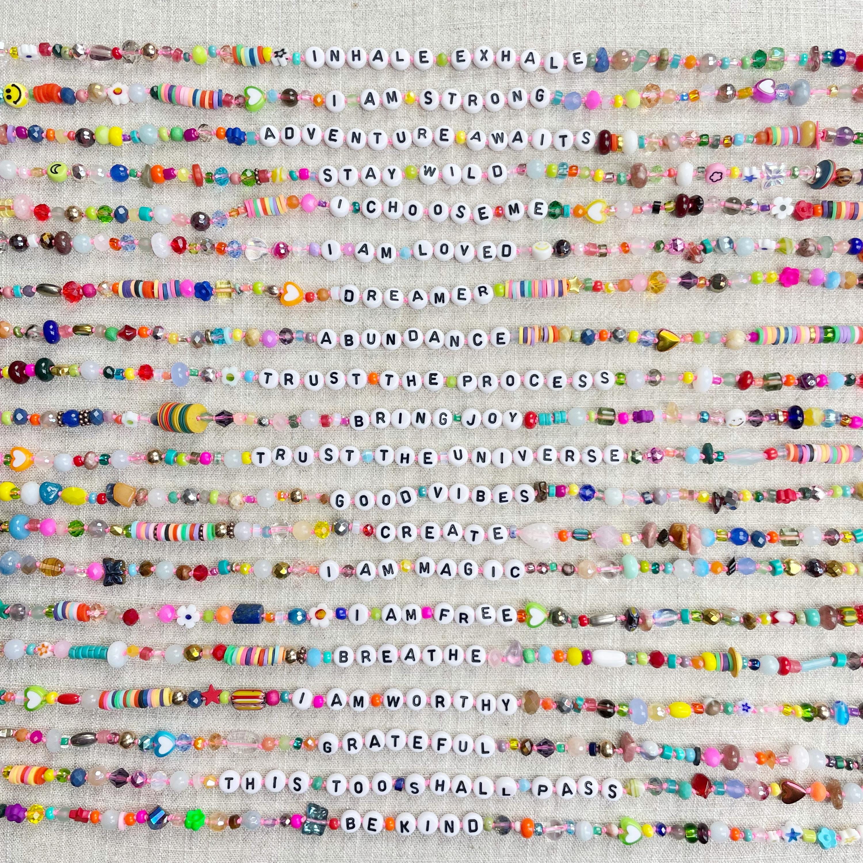 This necklace is made with a variety of beads of different sizes and shapes. The beads are a variety of gemstones, wood, glass, ceramic, plastic, resin, rubber, metal and others. The beads range from 3mm to 8mm in size. Plastic letter beads are in the center of the necklace with inspirational quotes and sayings. The necklace is hand-knotted in between each bead. The necklace is finished off with a gold plated stainless steel chain, clasp and logo charm.