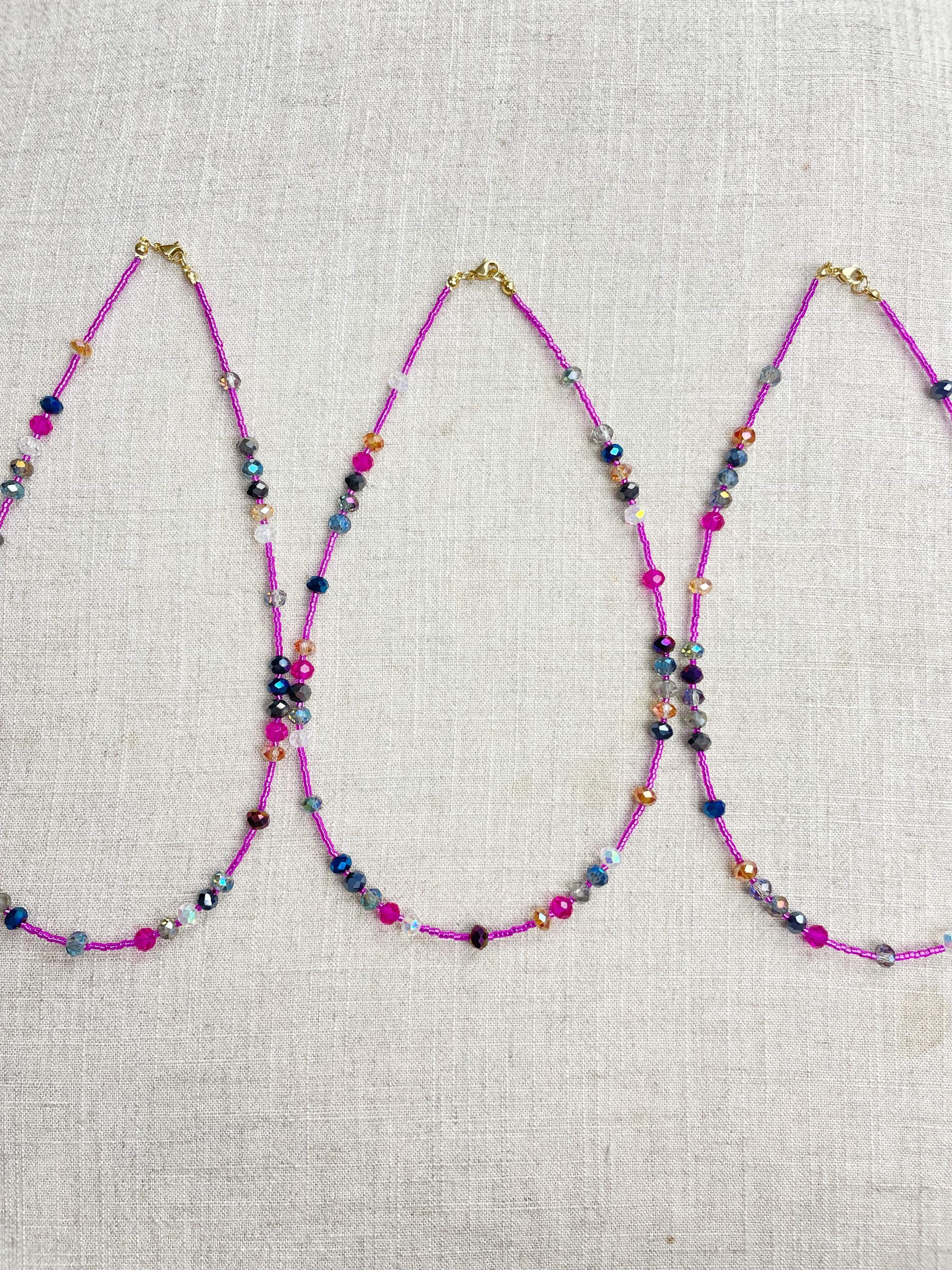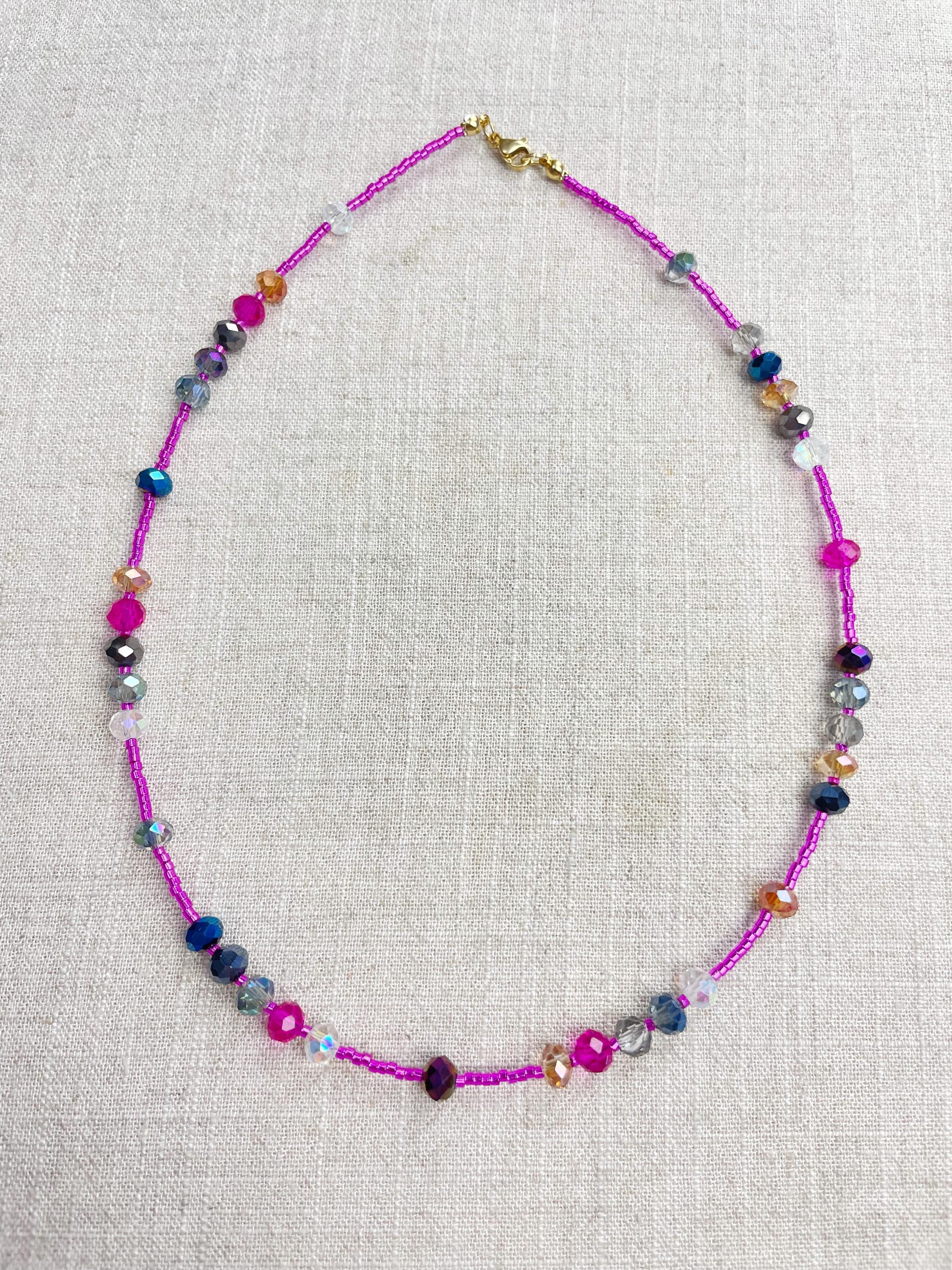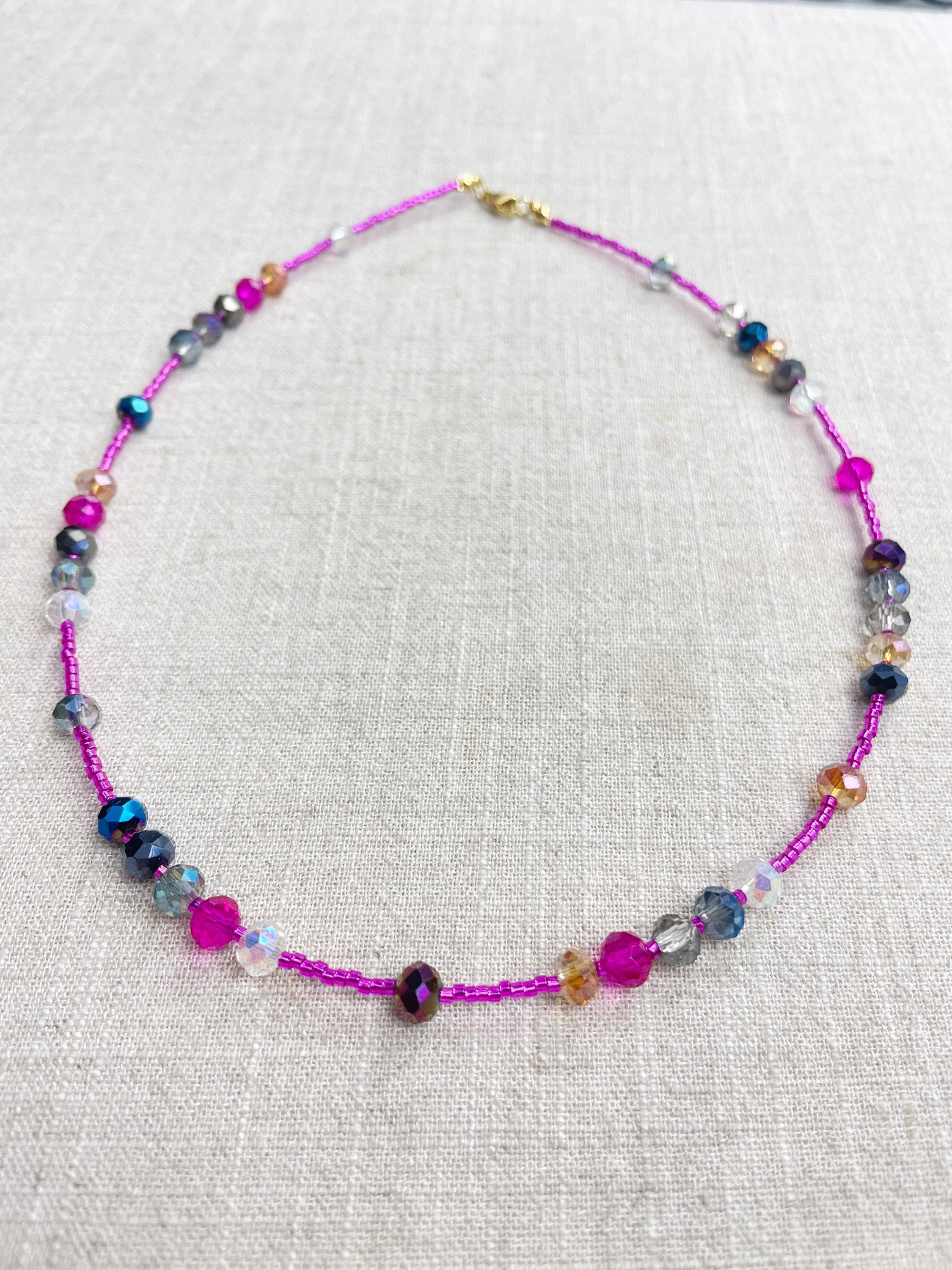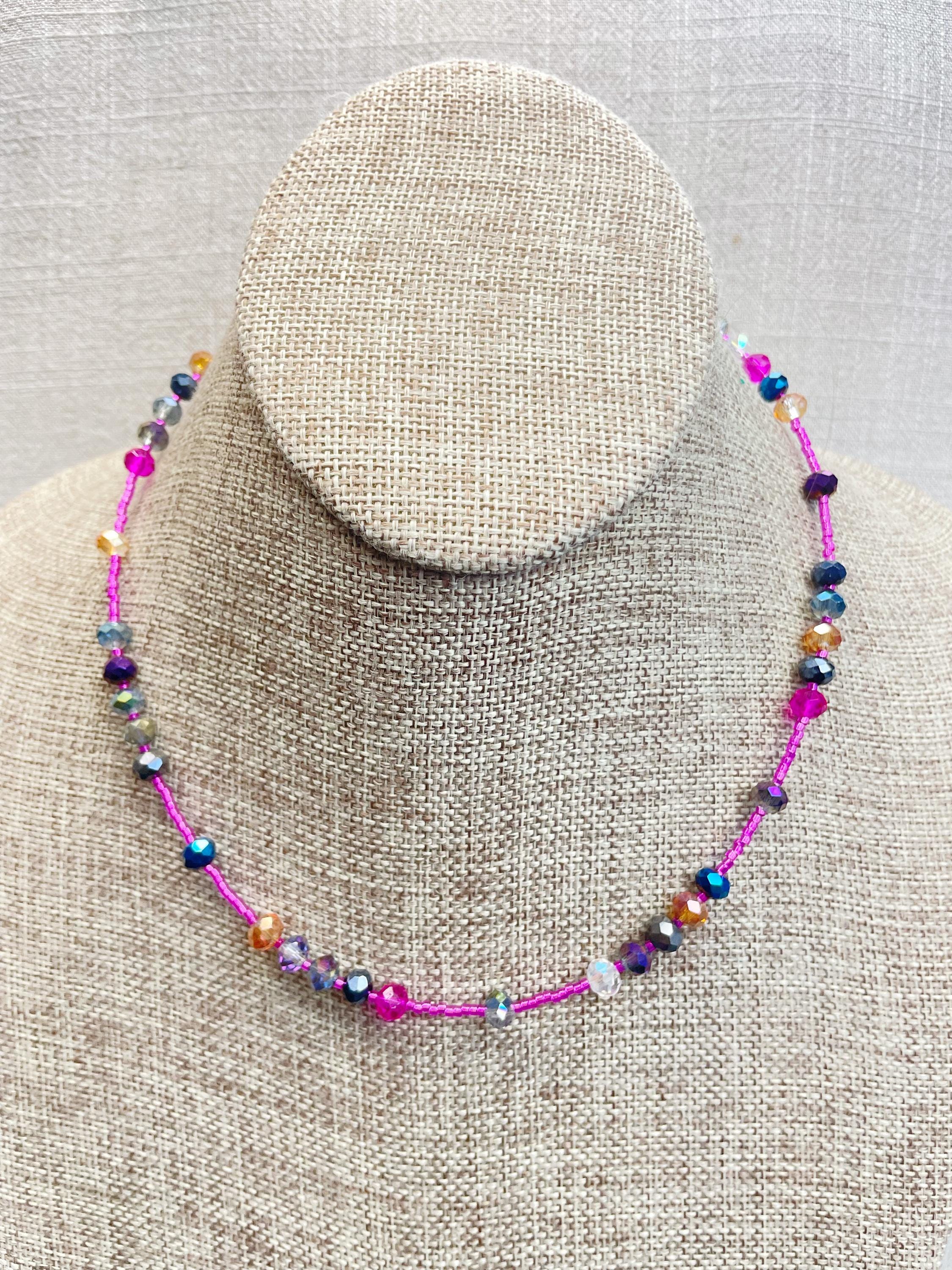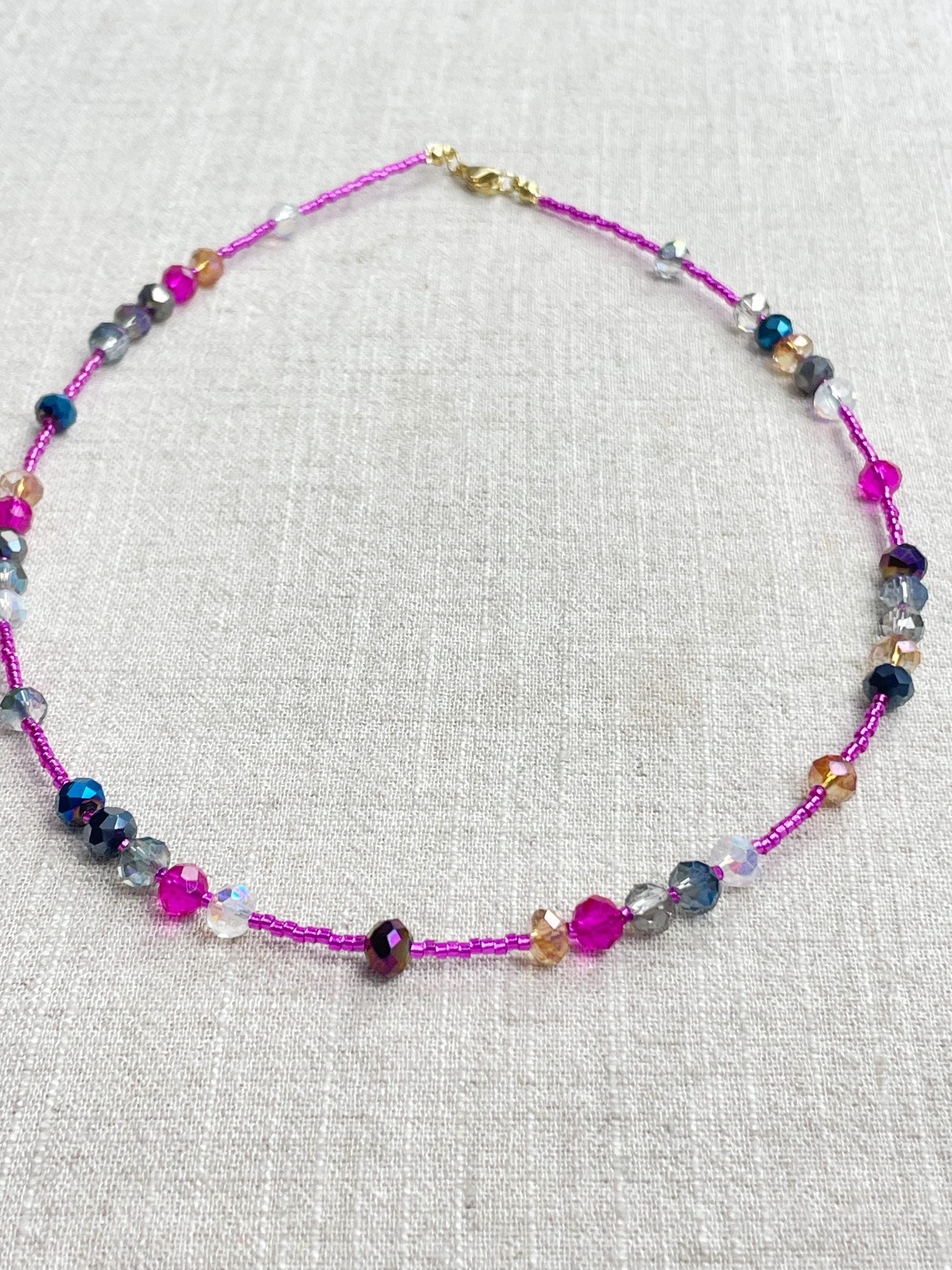 This necklace is made with pink silver lined 11/0 Miyuki glass seed beads. The seed beads are paired with iridescent crystal glass faceted rondelle beads in different colors. The beads are arranged in a pattern which enhances the sparkle in the necklace. Each necklace is strung on a stainless steel beading wire. The necklace is finished off with a gold plated stainless steel lobster clasp and a logo charm.