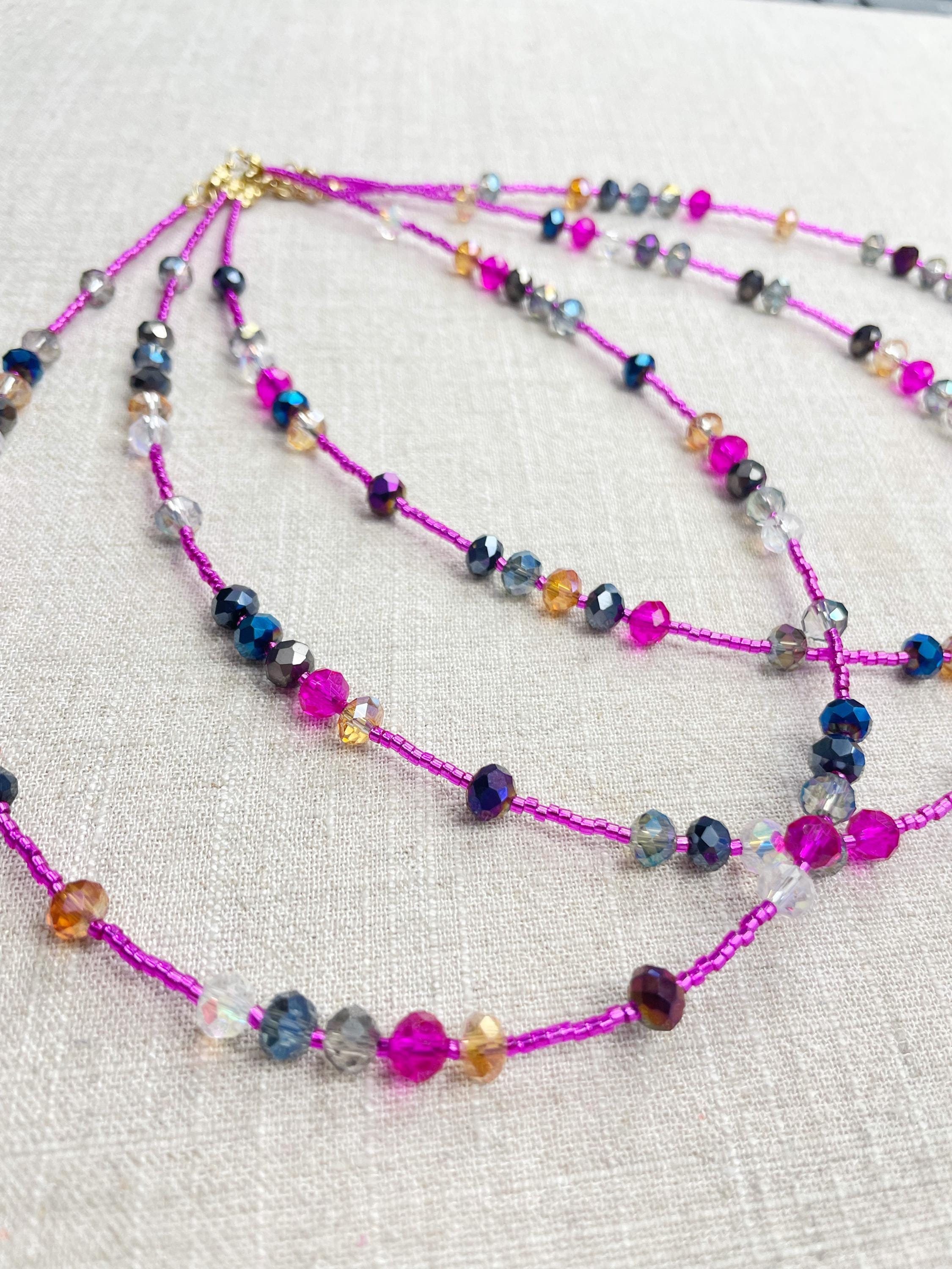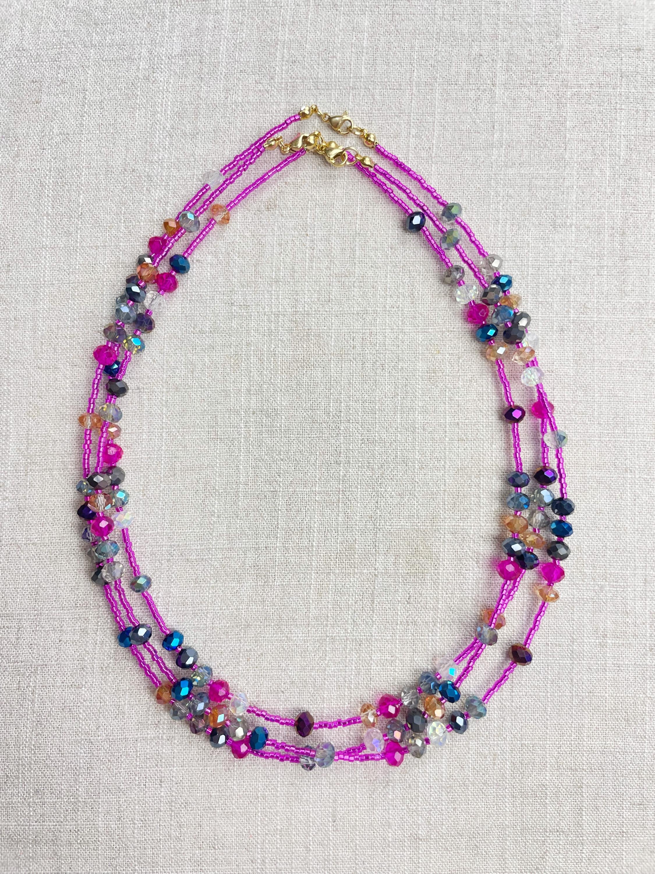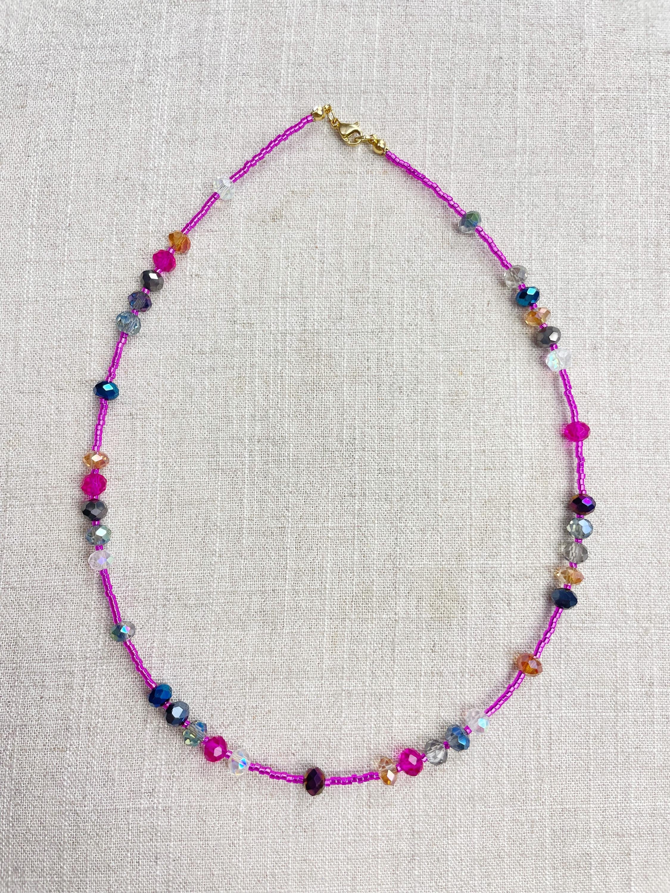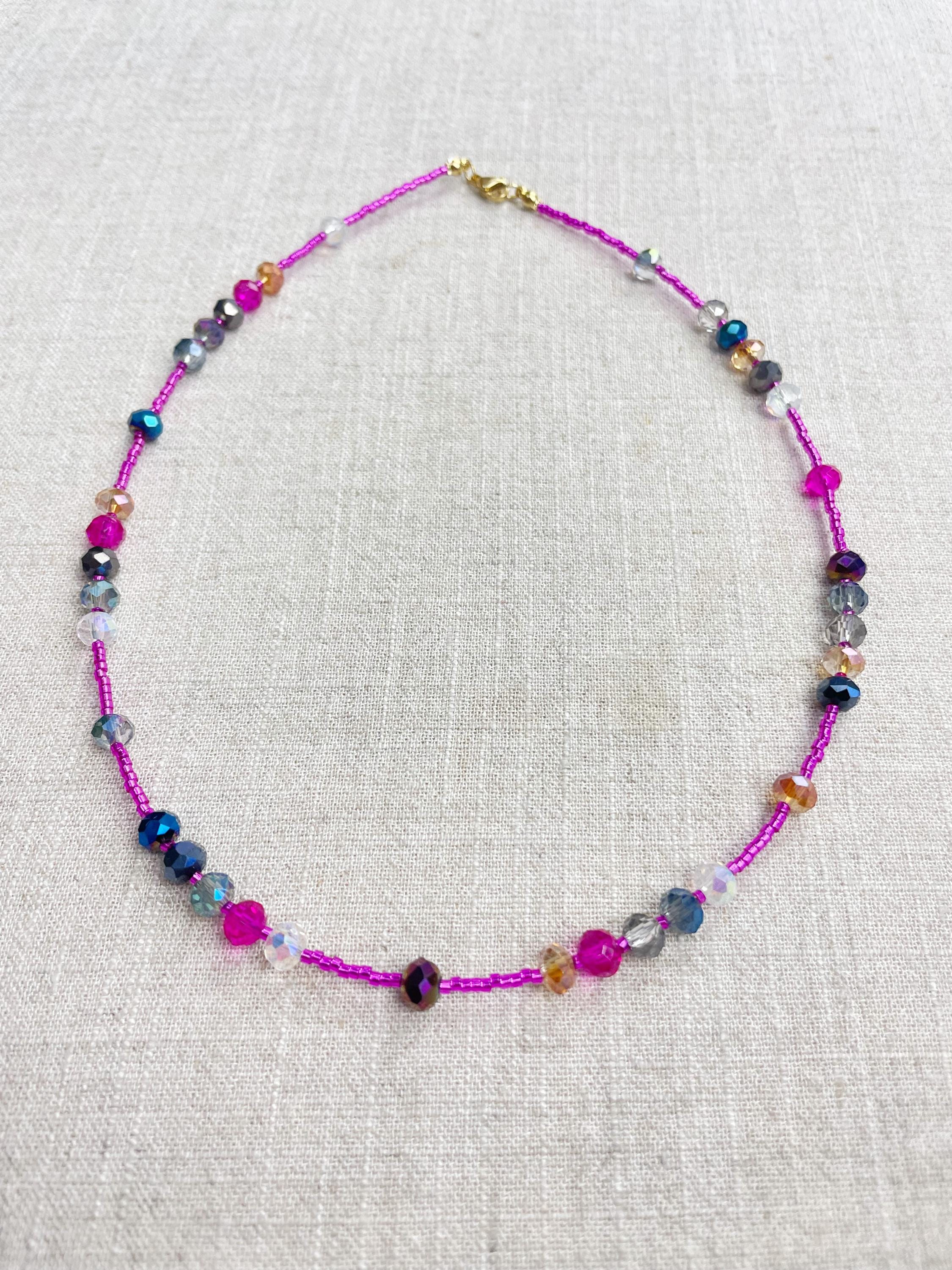 This necklace is made with pink silver lined 11/0 Miyuki glass seed beads. The seed beads are paired with iridescent crystal glass faceted rondelle beads in different colors. The beads are arranged in a pattern which enhances the sparkle in the necklace. Each necklace is strung on a stainless steel beading wire. The necklace is finished off with a gold plated stainless steel lobster clasp and a logo charm.