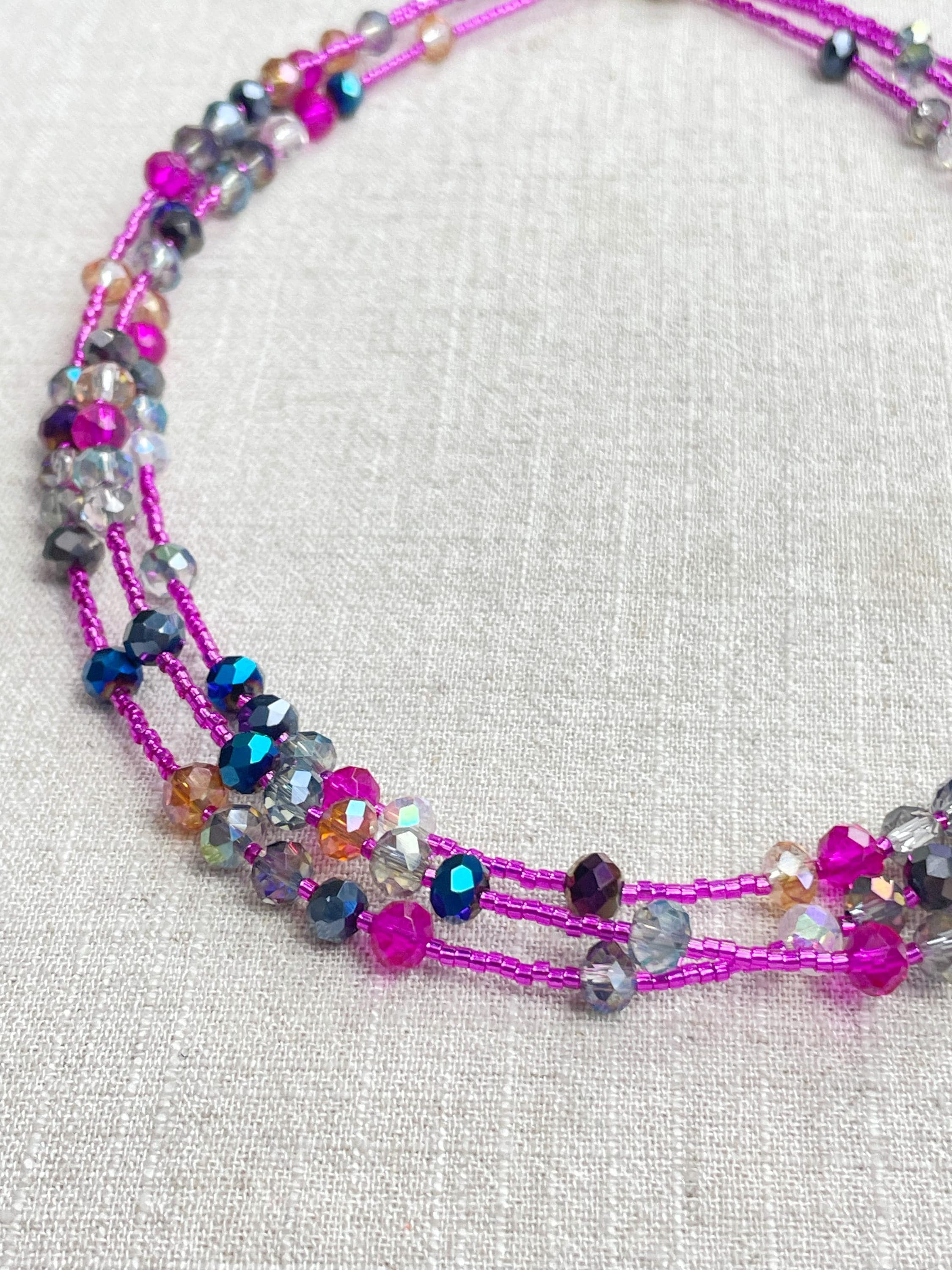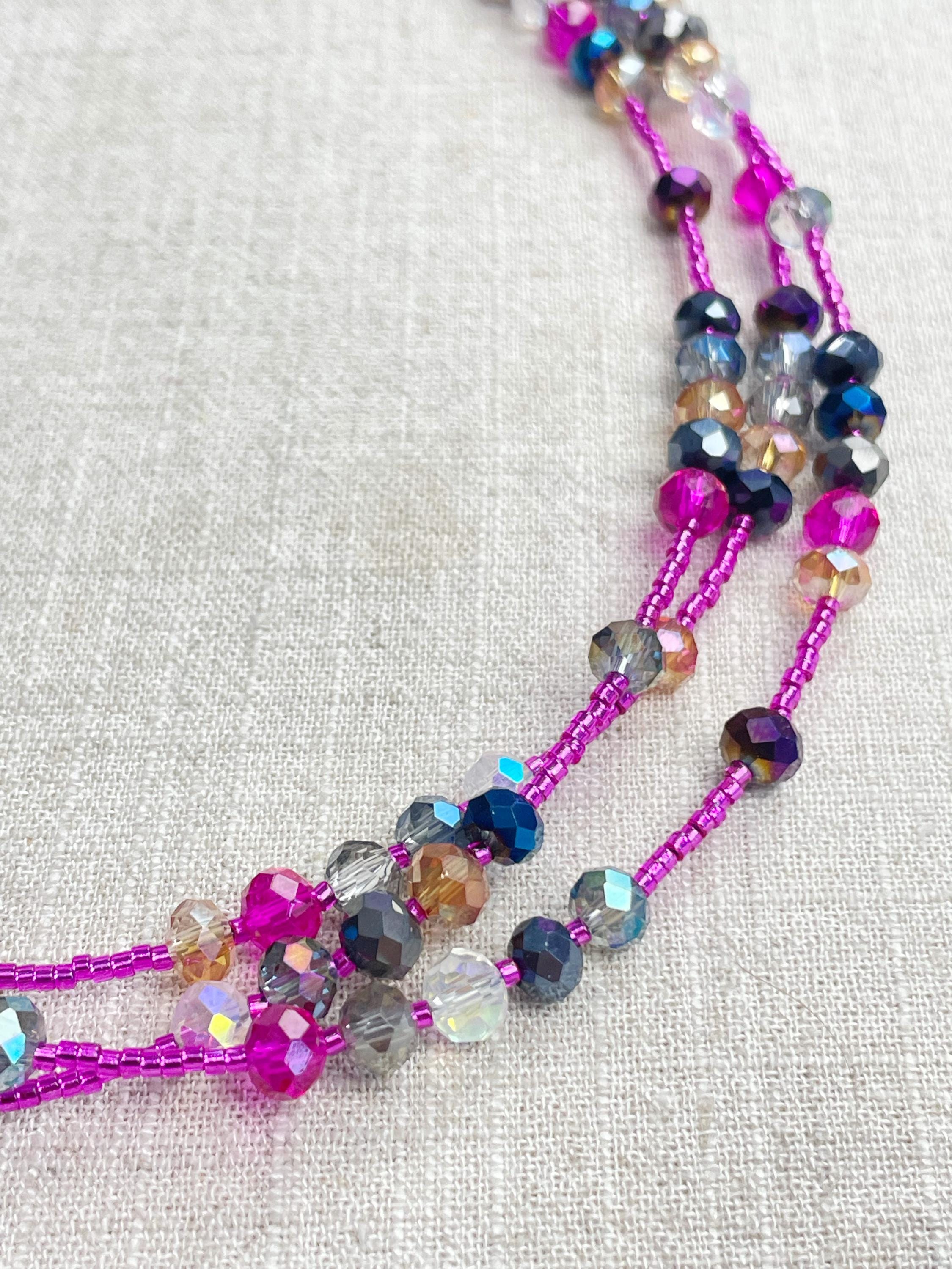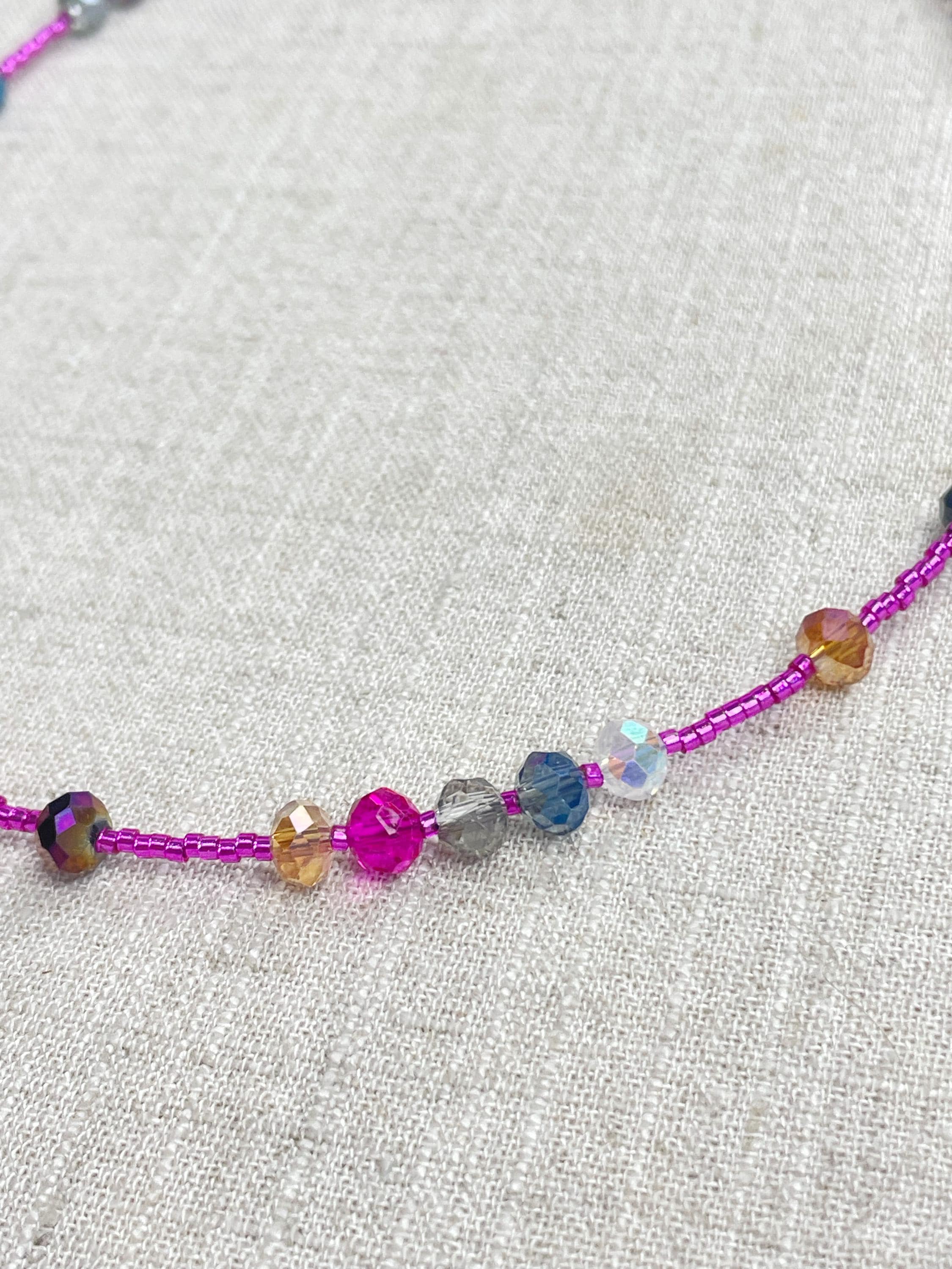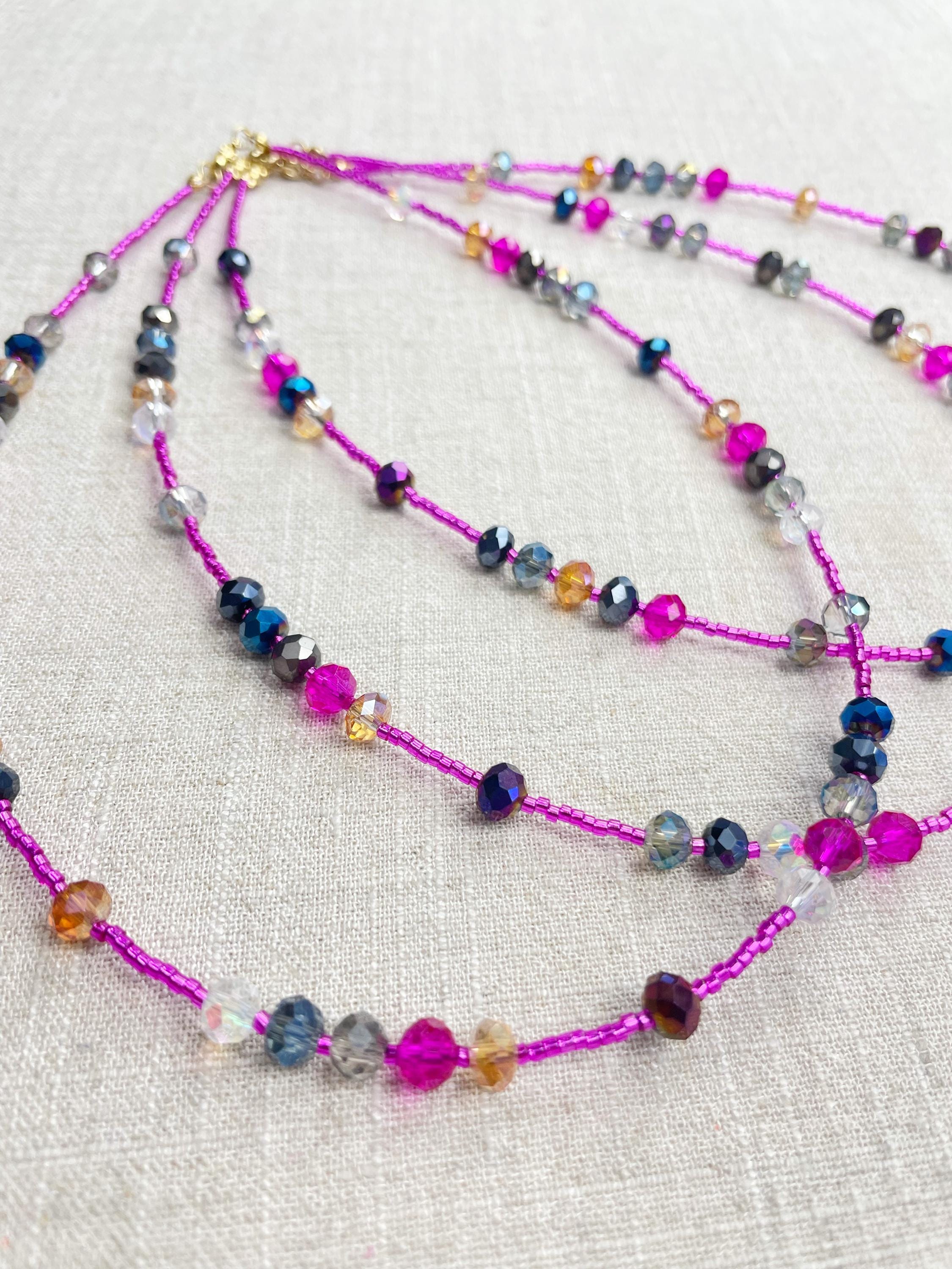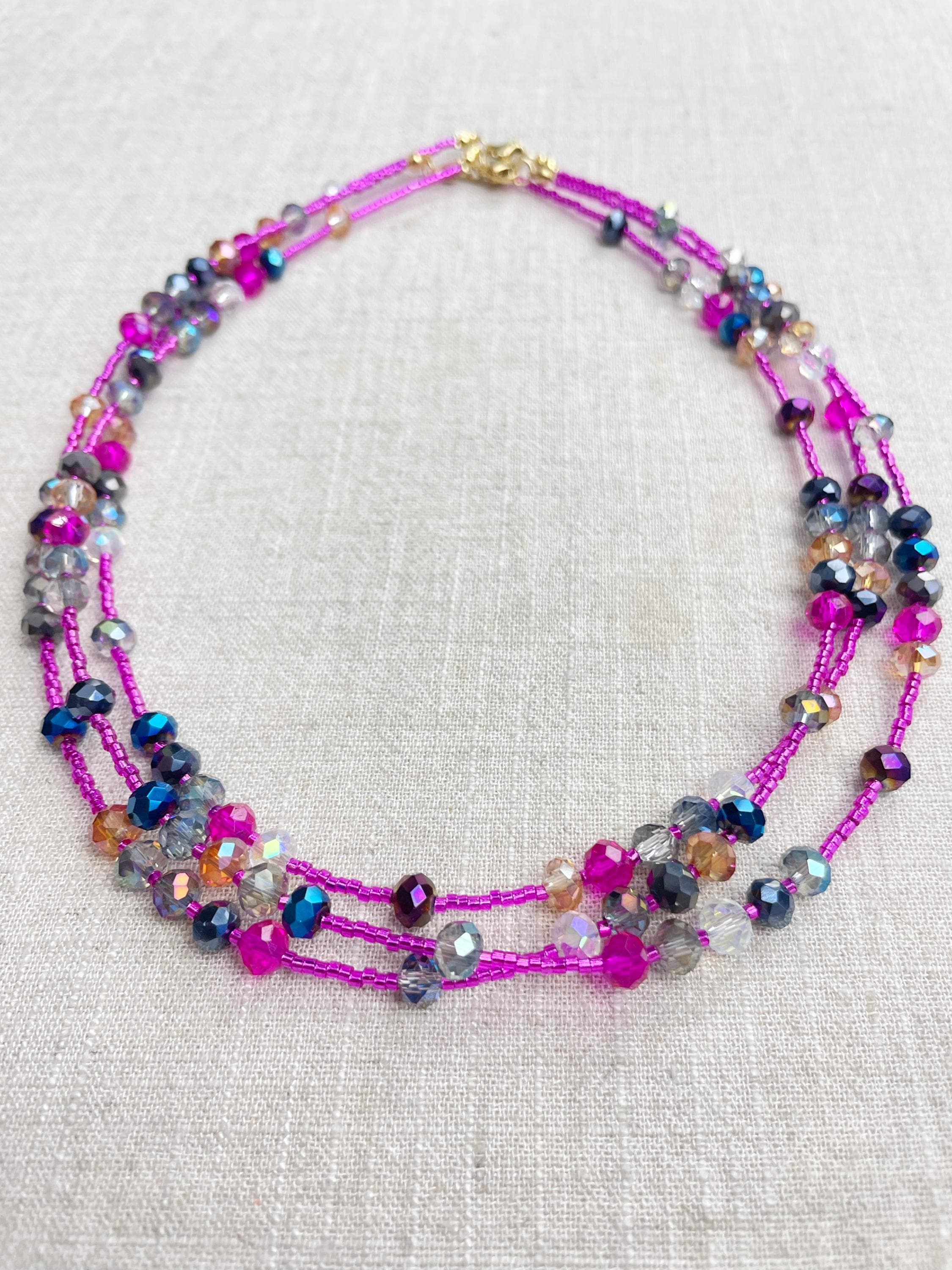 This necklace is made with pink silver lined 11/0 Miyuki glass seed beads. The seed beads are paired with iridescent crystal glass faceted rondelle beads in different colors. The beads are arranged in a pattern which enhances the sparkle in the necklace. Each necklace is strung on a stainless steel beading wire. The necklace is finished off with a gold plated stainless steel lobster clasp and a logo charm.